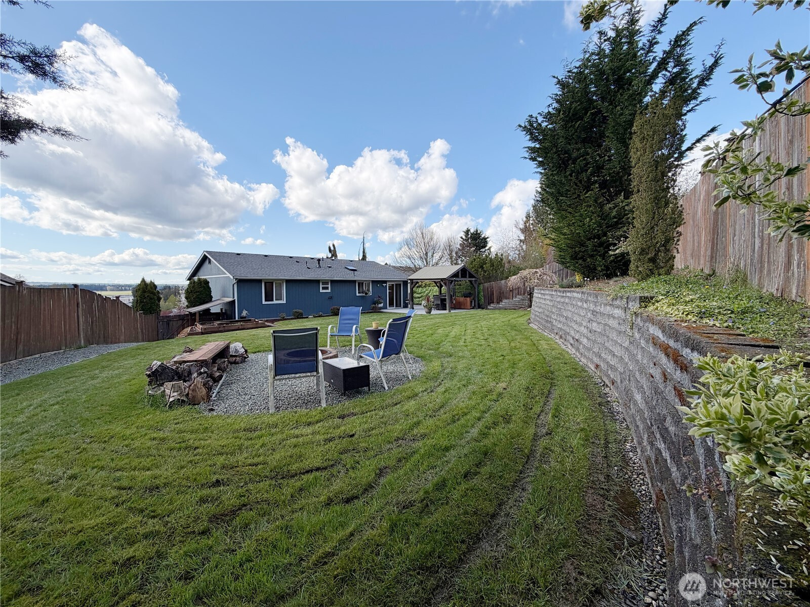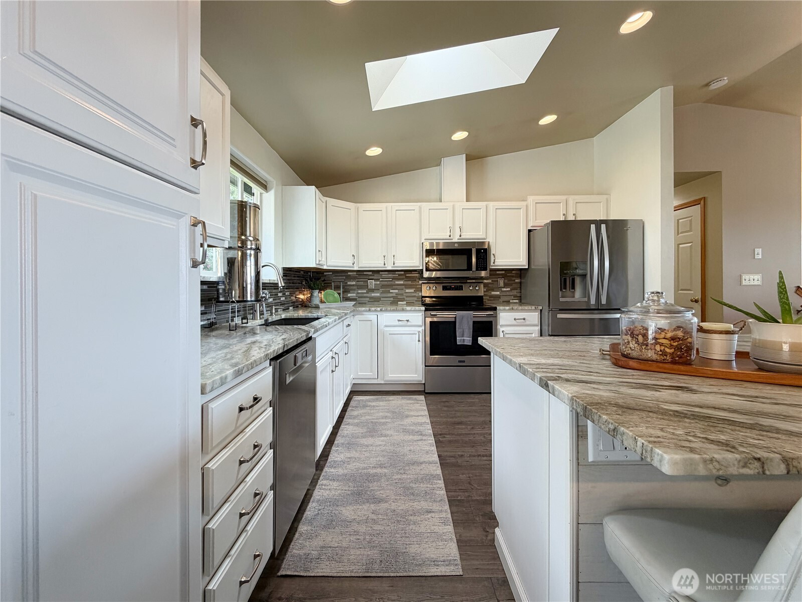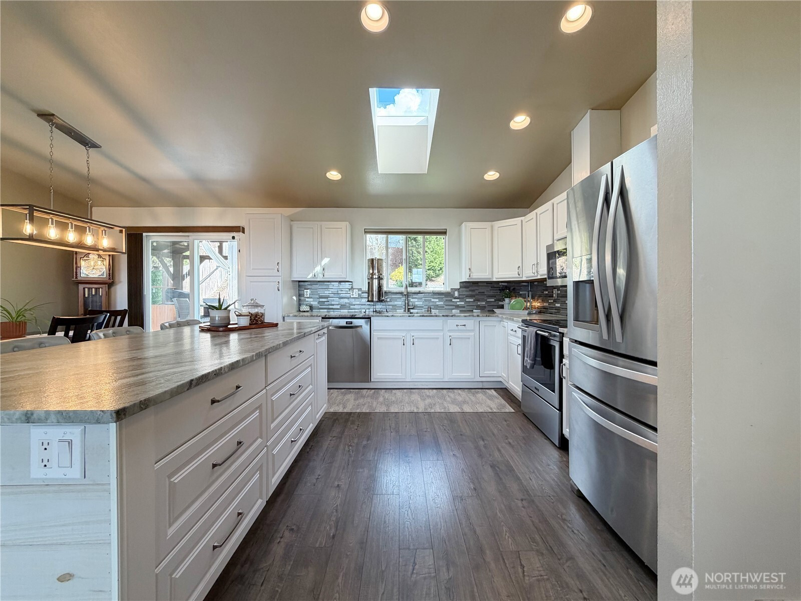 Gorgeous view-home with beautifully landscaped grounds, a fully-fenced yard, and a warm, welcoming feel throughout. This 4-bedroom, 3-bath home offers a brand new roof with warranty, vaulted ceilings, skylights, a cozy fireplace, and natural gas utilities for added comfort and efficiency. Your stunning kitchen offers SS cabinets, a massive island with bar seating, hands-free faucet, custom lighting and leathered-finish granite countertops. Step out to the resort-style backyard with no stairs, lush landscaping, a covered outdoor entertaining area, 2 fruit-bearing apple trees and a cherry tree, and a garden area making outdoor living easy, beautiful, and accessible. Ample storage can be found throughout the home, including built-in shelving in the garage that conveys. Ideally located near shopping, schools, freeway access, and all the amenities you need!