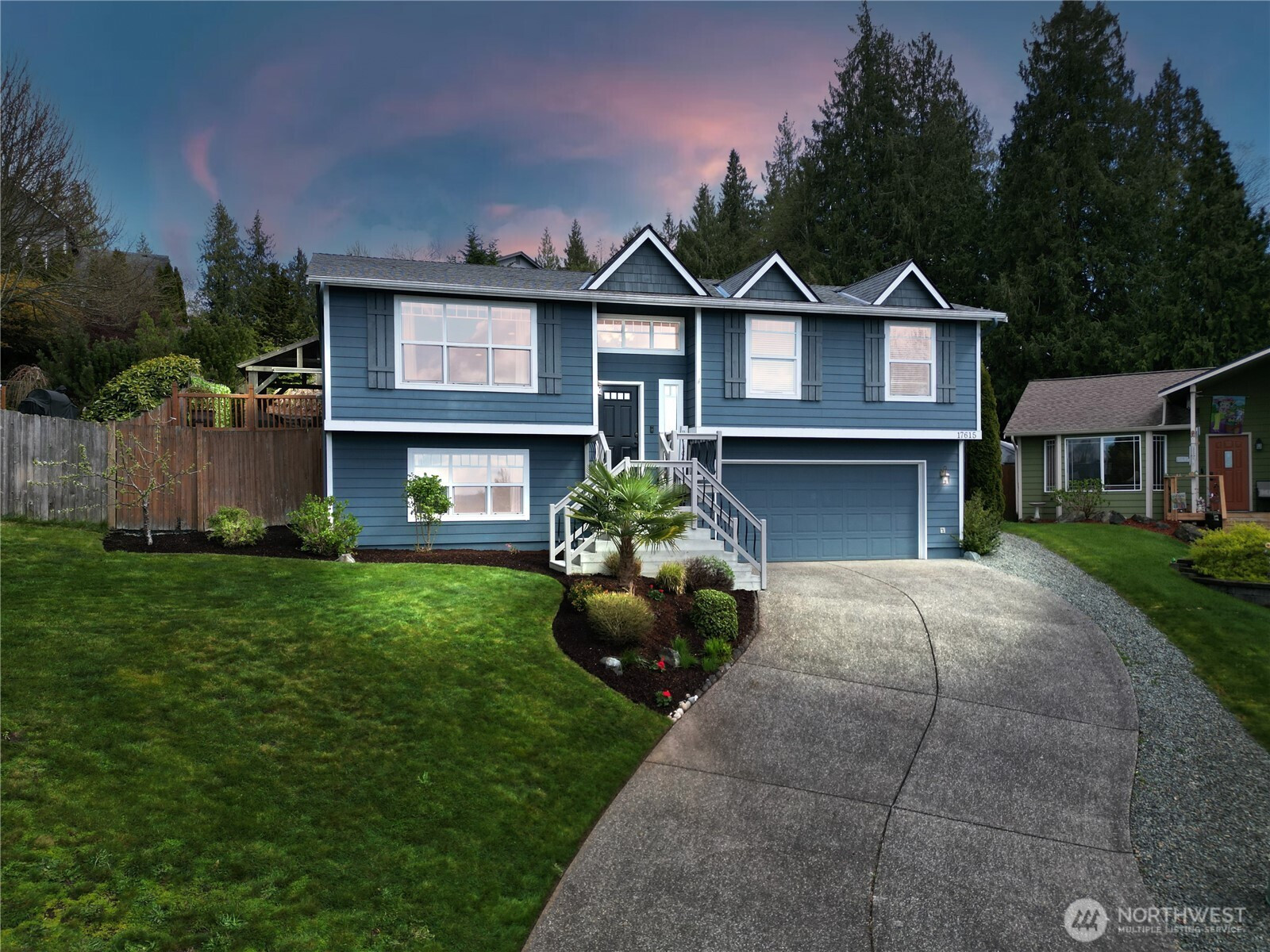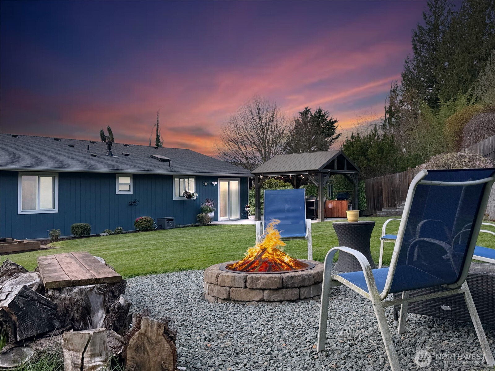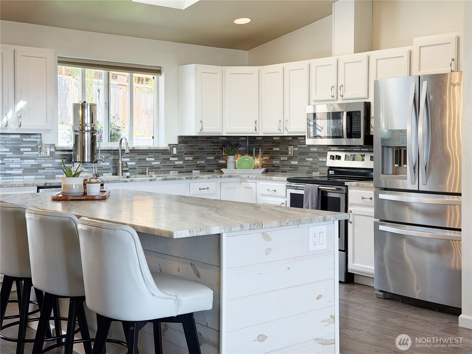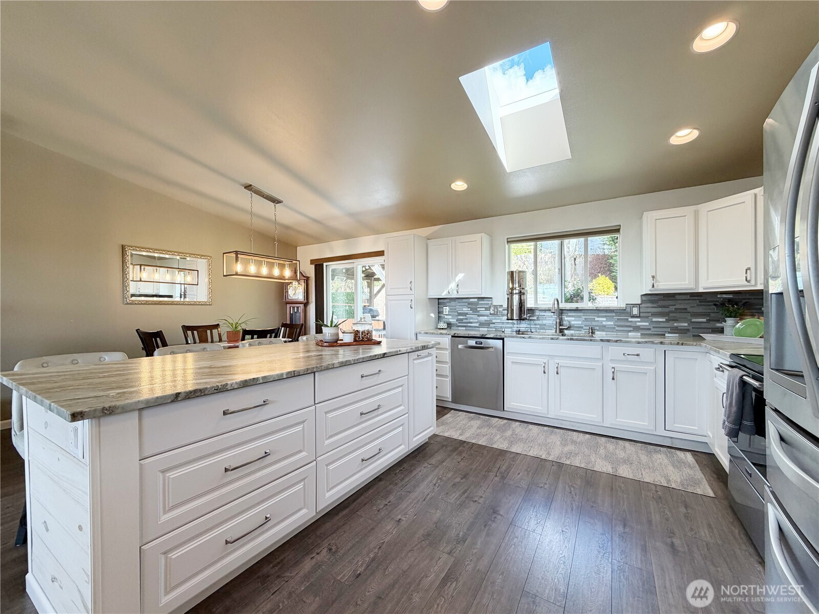 Gorgeous view-home with beautifully landscaped grounds, a fully-fenced yard, and a warm, welcoming feel throughout. This 4-bedroom, 3-bath home offers a brand new roof with warranty, vaulted ceilings, skylights, a cozy fireplace, and natural gas utilities for added comfort and efficiency. Your stunning kitchen offers SS cabinets, a massive island with bar seating, hands-free faucet, custom lighting and leathered-finish granite countertops. Step out to the resort-style backyard with no stairs, lush landscaping, a covered outdoor entertaining area, 2 fruit-bearing apple trees and a cherry tree, and a garden area making outdoor living easy, beautiful, and accessible. Ample storage can be found throughout the home, including built-in shelving in the garage that conveys. Ideally located near shopping, schools, freeway access, and all the amenities you need!