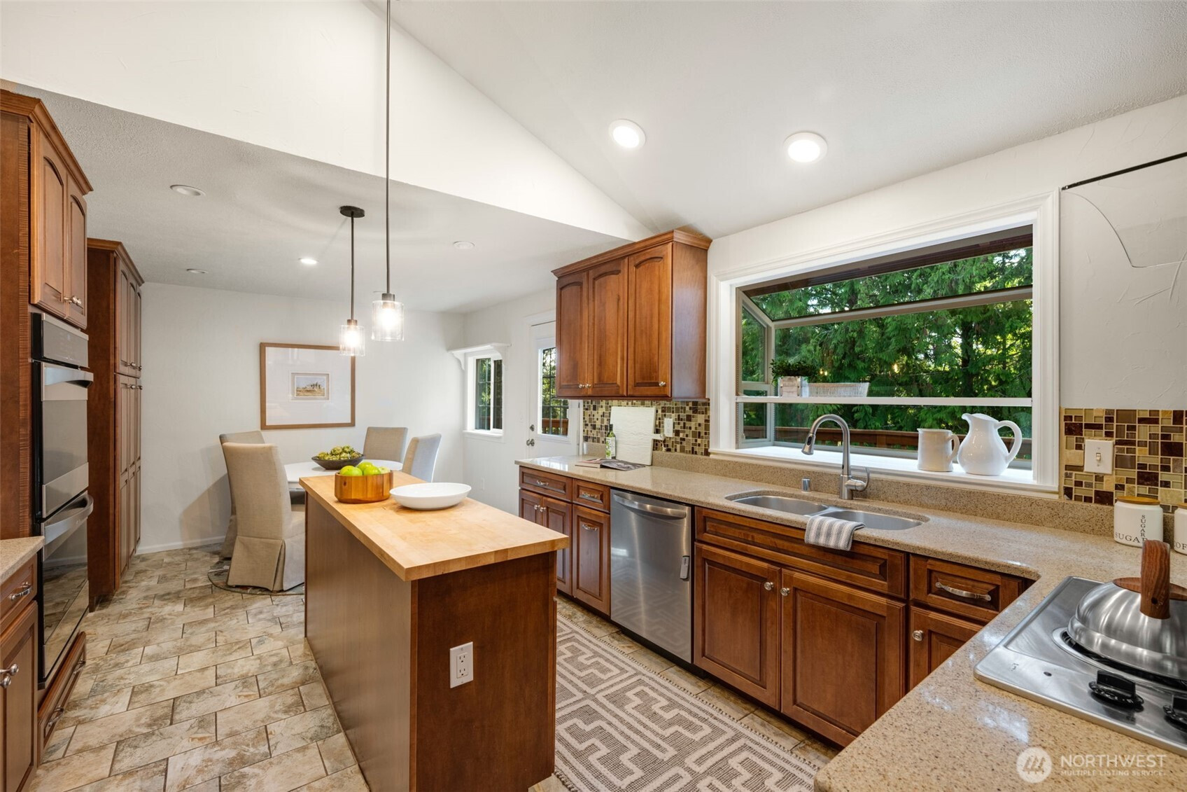 Tucked at the end of a quiet cul-de-sac, this spacious tri-level home offers room to spread out combined with a thoughtful separation of living spaces. A tiled entry welcomes you into an airy living and dining area anchored by a cozy fireplace and beautifully refinished hardwood floors. The generous kitchen, featuring abundant cabinetry and storage, a sunny eat-in nook, and seamless access to the expansive deck — is perfect for morning coffee or outdoor gatherings. The upper level includes two bedrooms and a full bath, while the main level features a private primary suite — offering a flexible layout for a variety of living arrangements. Downstairs, a finished lower level daylight apartment adds exceptional versatility with its own kitchen, living area, two bedrooms, and a spacious bathroom. A separate entrance makes it ideal for multi-generational living, guests, or rental income. Plenty of room to relax in the fully fenced backyard — a private retreat with space to BBQ, garden, play, or unwind. An attached two-car garage provides ample space for projects, plus additional storage. Easy access to Lynnwood’s parks and everyday amenities, with neighborhood green space and larger parks just minutes away. Shopping, dining, and other amenities are also close by, and commuters will appreciate the convenient access to I-5 and I-405. Lynnwood Light Rail offers quick access options for travel to Seattle and beyond, making this location as practical as it is peaceful.