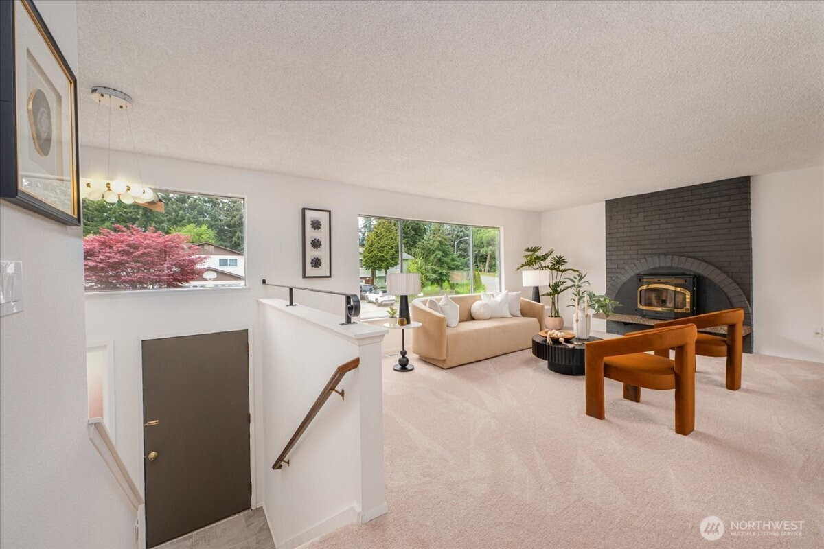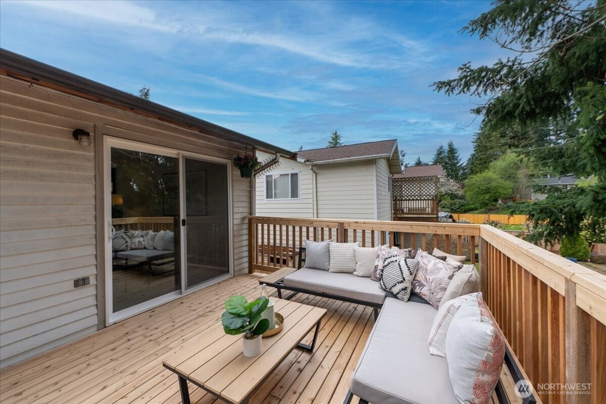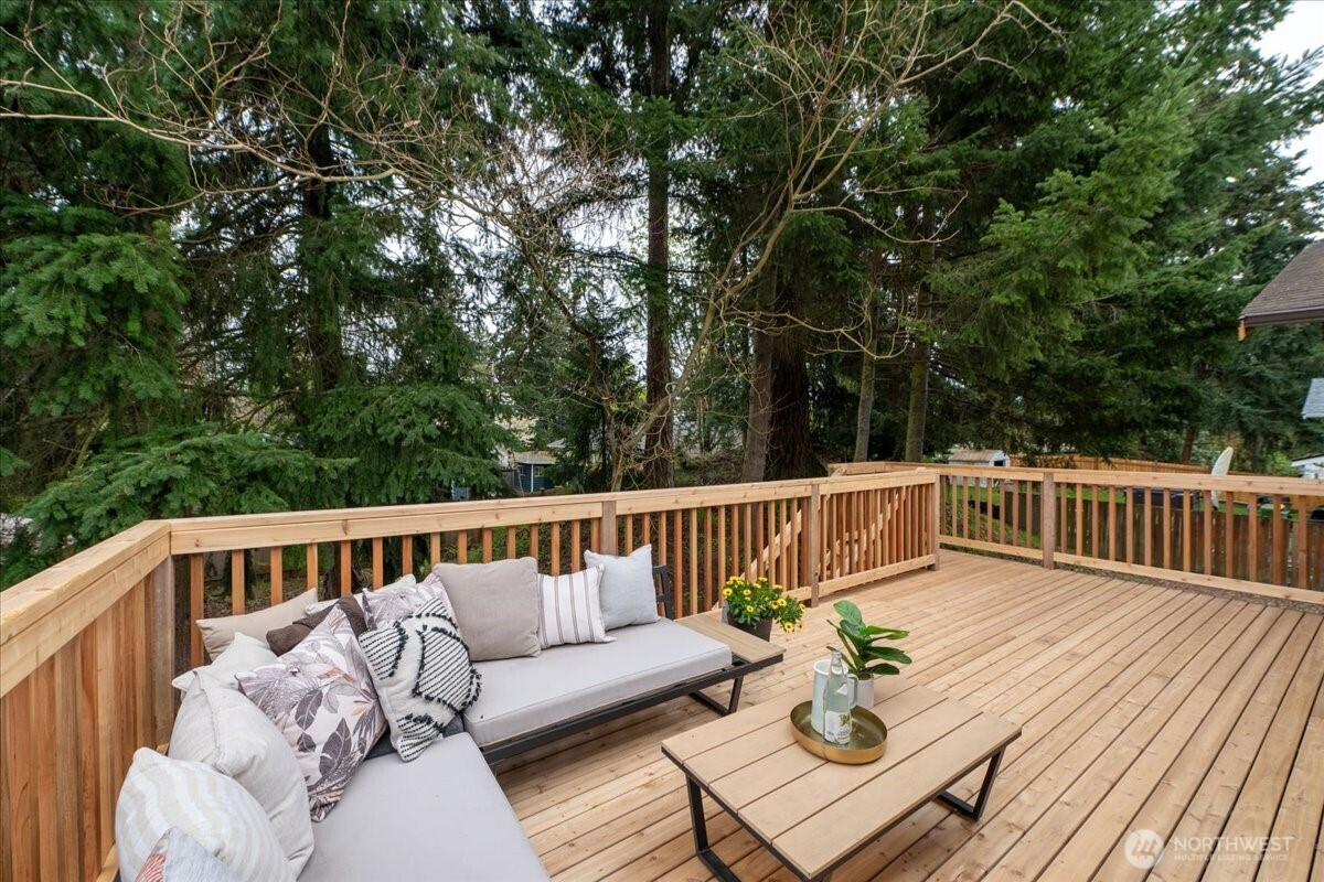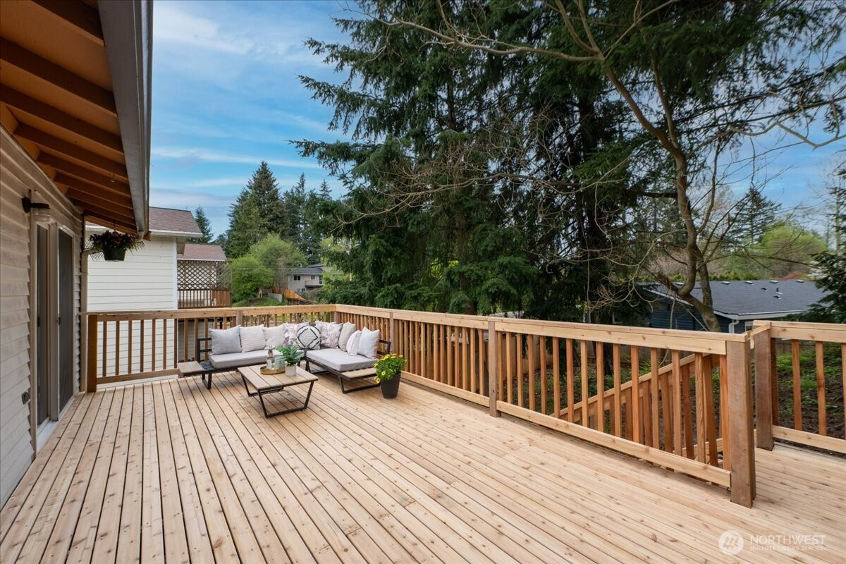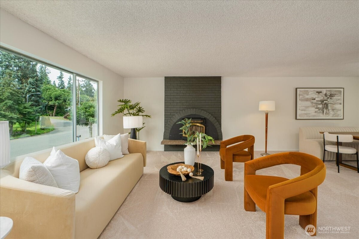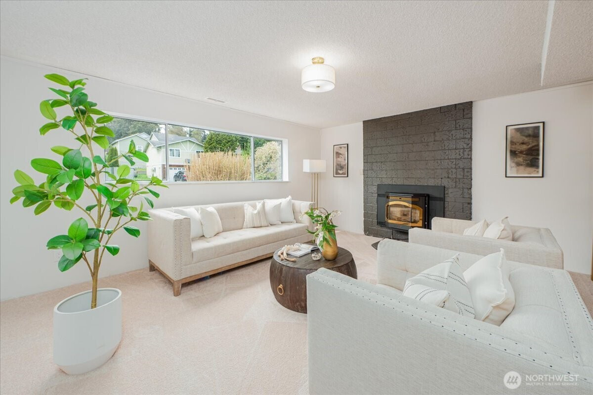 Welcome to Admiralty Woods! This charming home offers a light-filled living room with brick fireplace and pellet stove. The updated kitchen features quartz counters, tile backsplash, stainless appliances, and ceramic floors. Dining room opens to a cedar deck overlooking lush, wooded grounds. Four bedrooms on one level, including a primary suite with double closets and private bath. Updated hall bath with tile accents. Lower level includes a spacious family room with second fireplace, flex space, and unfinished bath/laundry. Two-car garage with shop space. Beautiful mix of lawn and trees in a prime Lynnwood location near shopping, transit, and Edmonds schools.