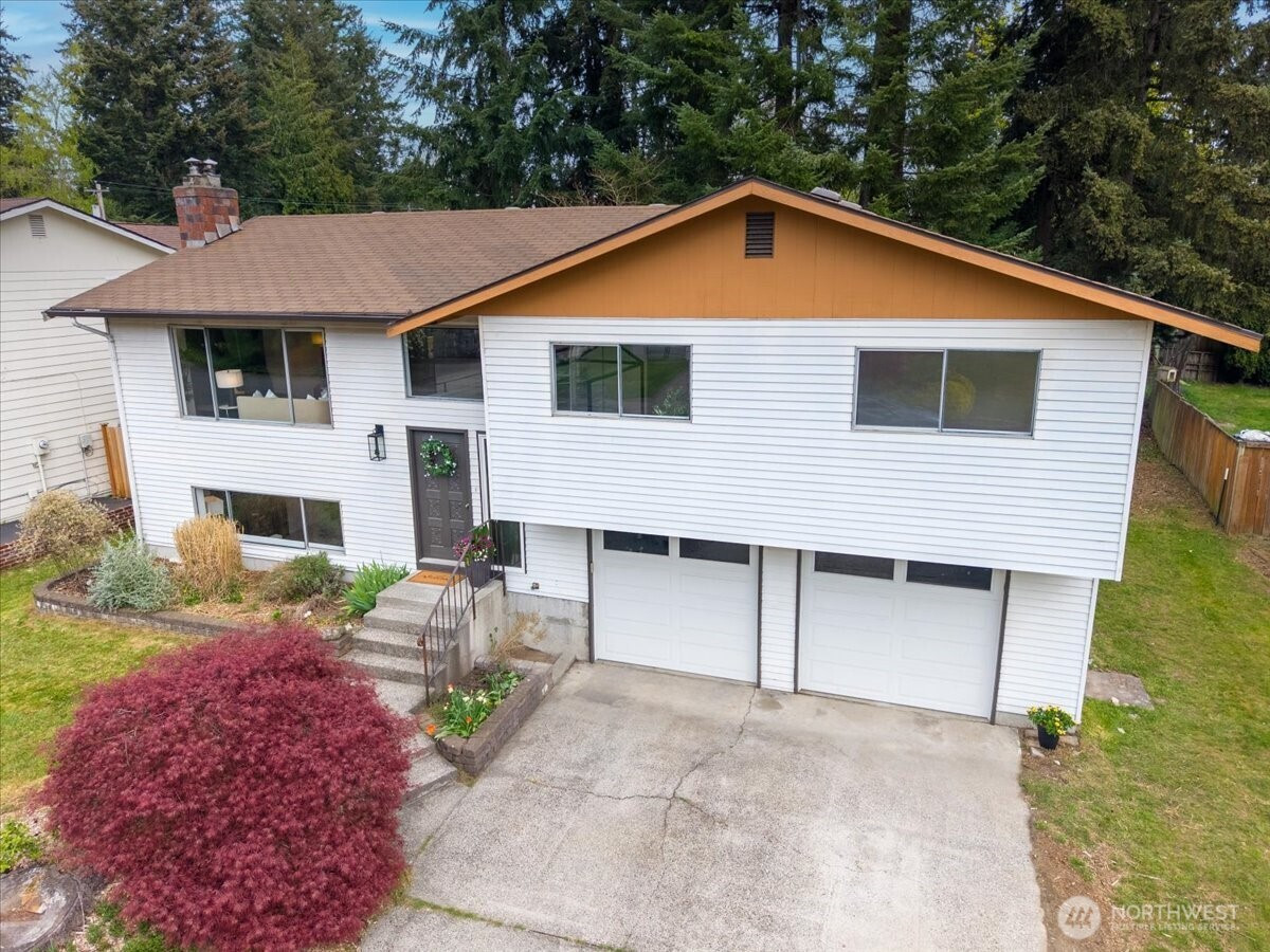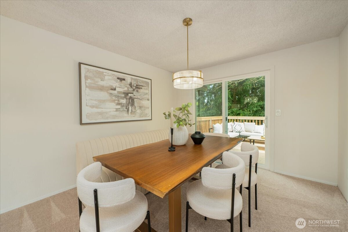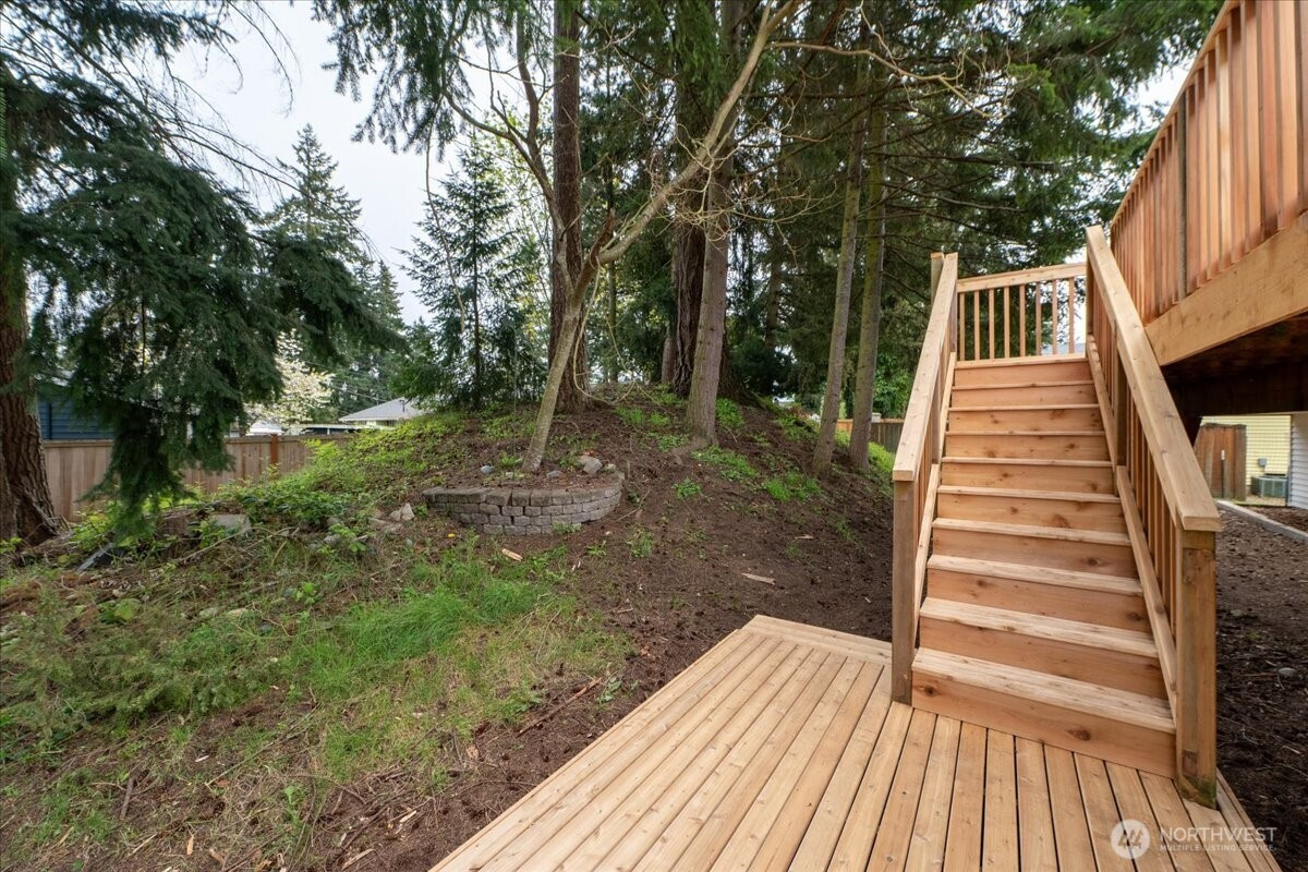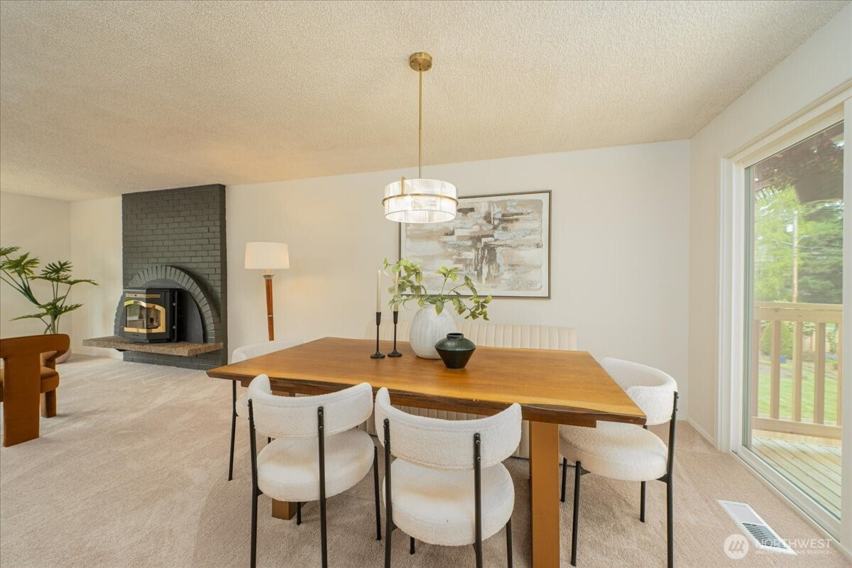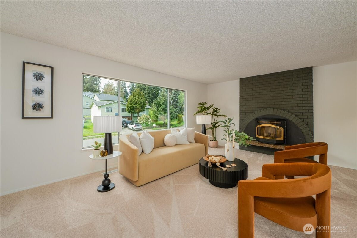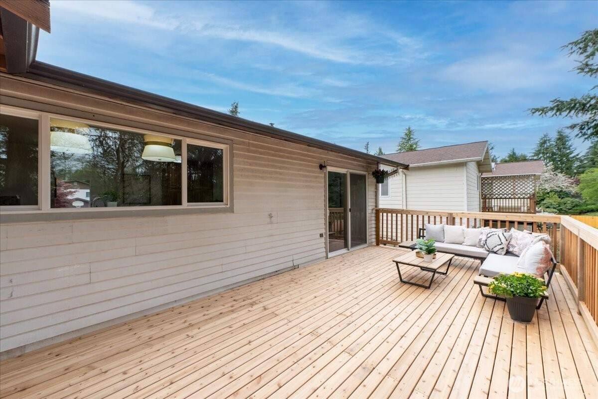 Welcome to Admiralty Woods! This charming home offers a light-filled living room with brick fireplace and pellet stove. The updated kitchen features quartz counters, tile backsplash, stainless appliances, and ceramic floors. Dining room opens to a cedar deck overlooking lush, wooded grounds. Four bedrooms on one level, including a primary suite with double closets and private bath. Updated hall bath with tile accents. Lower level includes a spacious family room with second fireplace, flex space, and unfinished bath/laundry. Two-car garage with shop space. Beautiful mix of lawn and trees in a prime Lynnwood location near shopping, transit, and Edmonds schools.