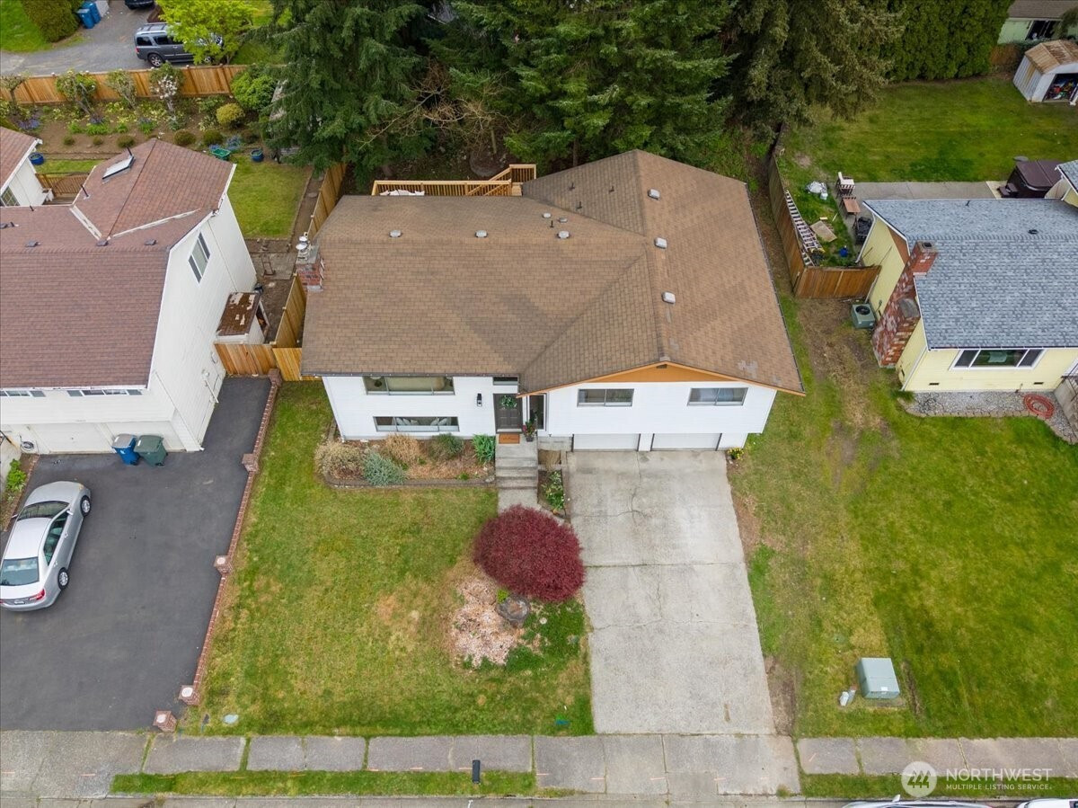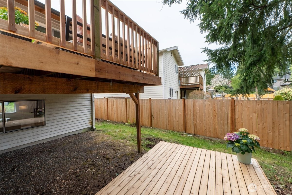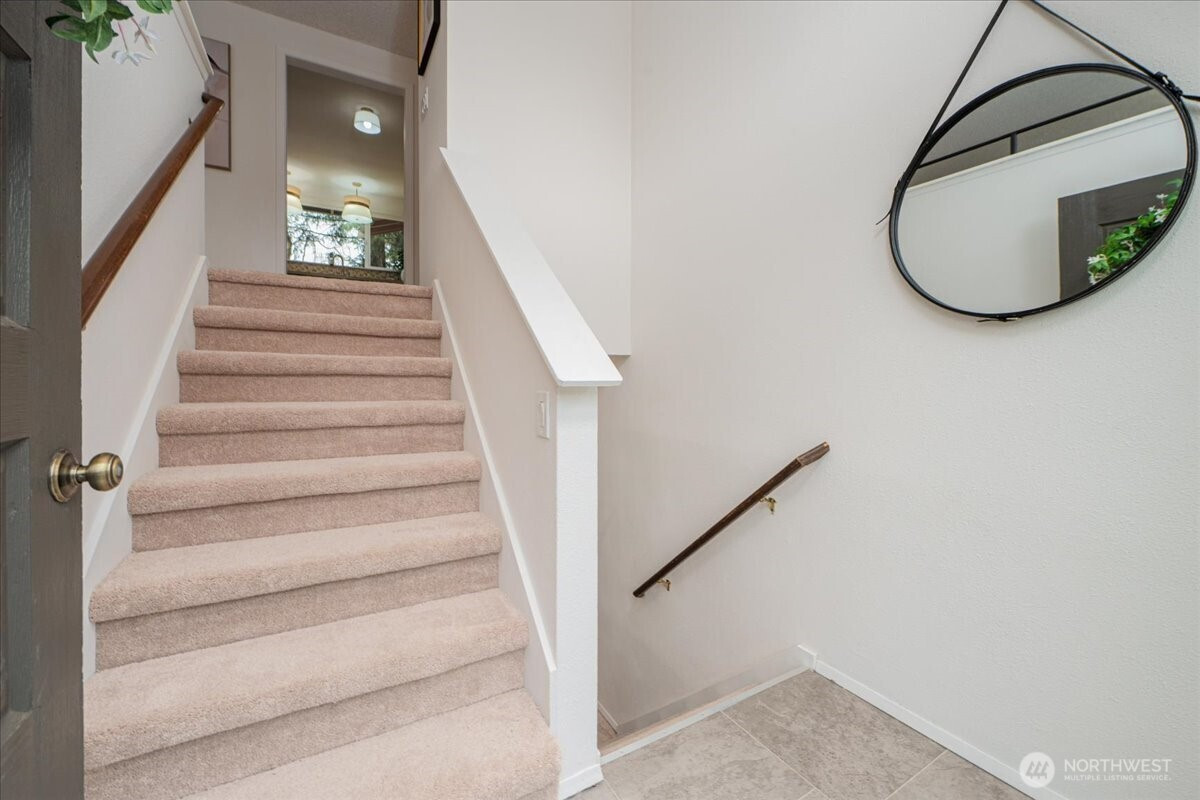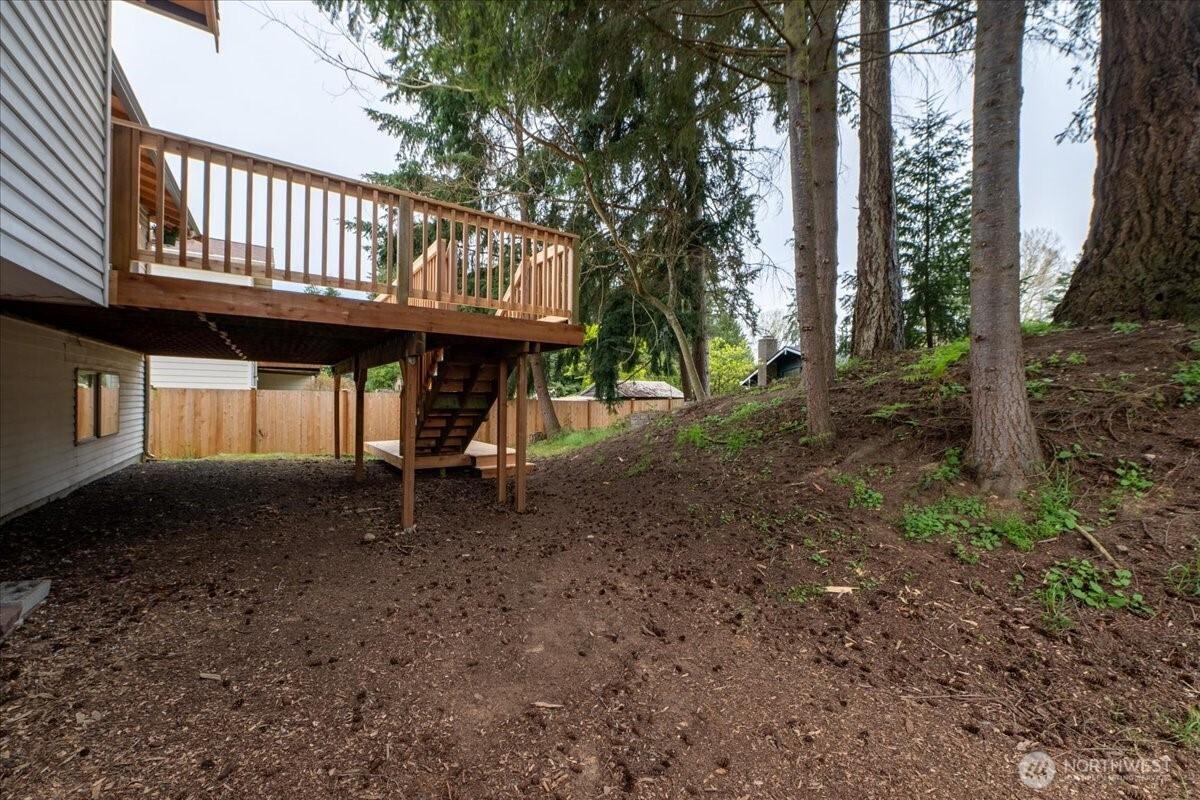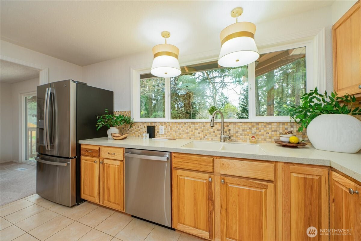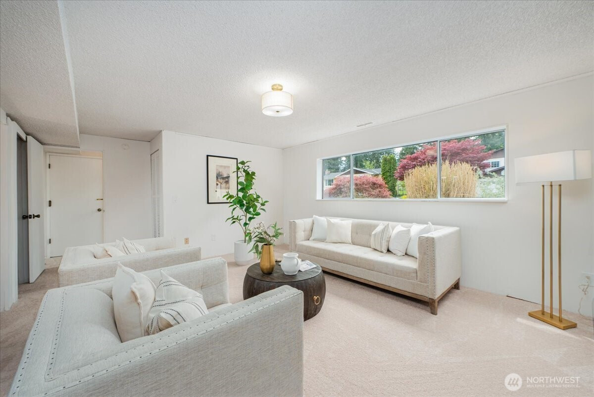 Welcome to Admiralty Woods! This charming home offers a light-filled living room with brick fireplace and pellet stove. The updated kitchen features quartz counters, tile backsplash, stainless appliances, and ceramic floors. Dining room opens to a cedar deck overlooking lush, wooded grounds. Four bedrooms on one level, including a primary suite with double closets and private bath. Updated hall bath with tile accents. Lower level includes a spacious family room with second fireplace, flex space, and unfinished bath/laundry. Two-car garage with shop space. Beautiful mix of lawn and trees in a prime Lynnwood location near shopping, transit, and Edmonds schools.