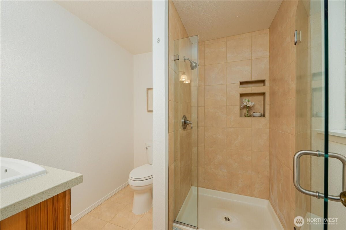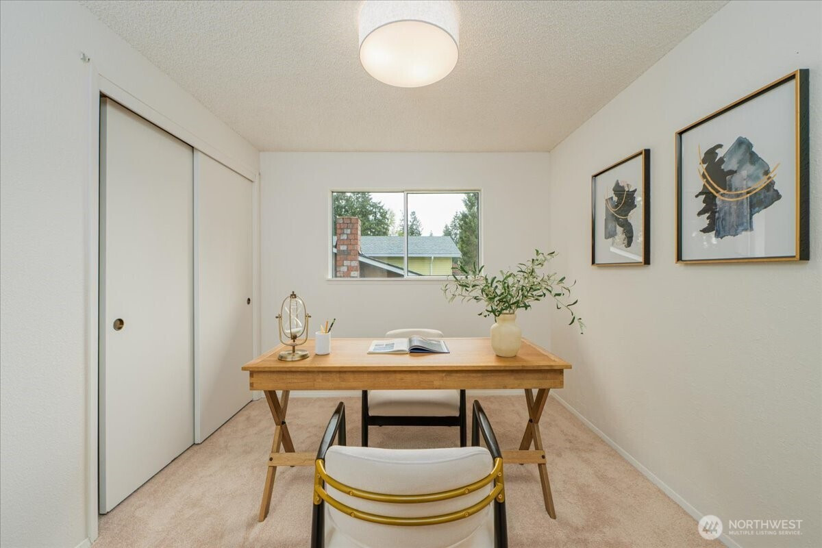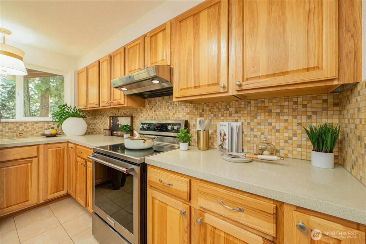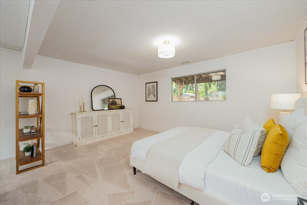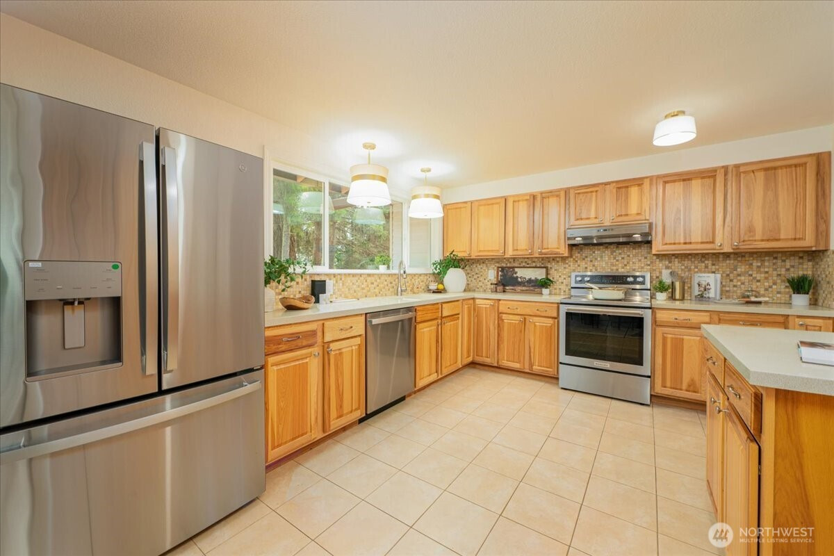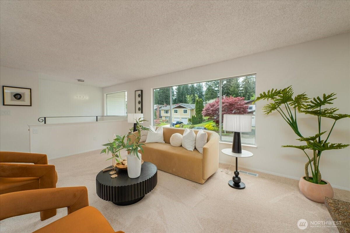 Welcome to Admiralty Woods! This charming home offers a light-filled living room with brick fireplace and pellet stove. The updated kitchen features quartz counters, tile backsplash, stainless appliances, and ceramic floors. Dining room opens to a cedar deck overlooking lush, wooded grounds. Four bedrooms on one level, including a primary suite with double closets and private bath. Updated hall bath with tile accents. Lower level includes a spacious family room with second fireplace, flex space, and unfinished bath/laundry. Two-car garage with shop space. Beautiful mix of lawn and trees in a prime Lynnwood location near shopping, transit, and Edmonds schools.