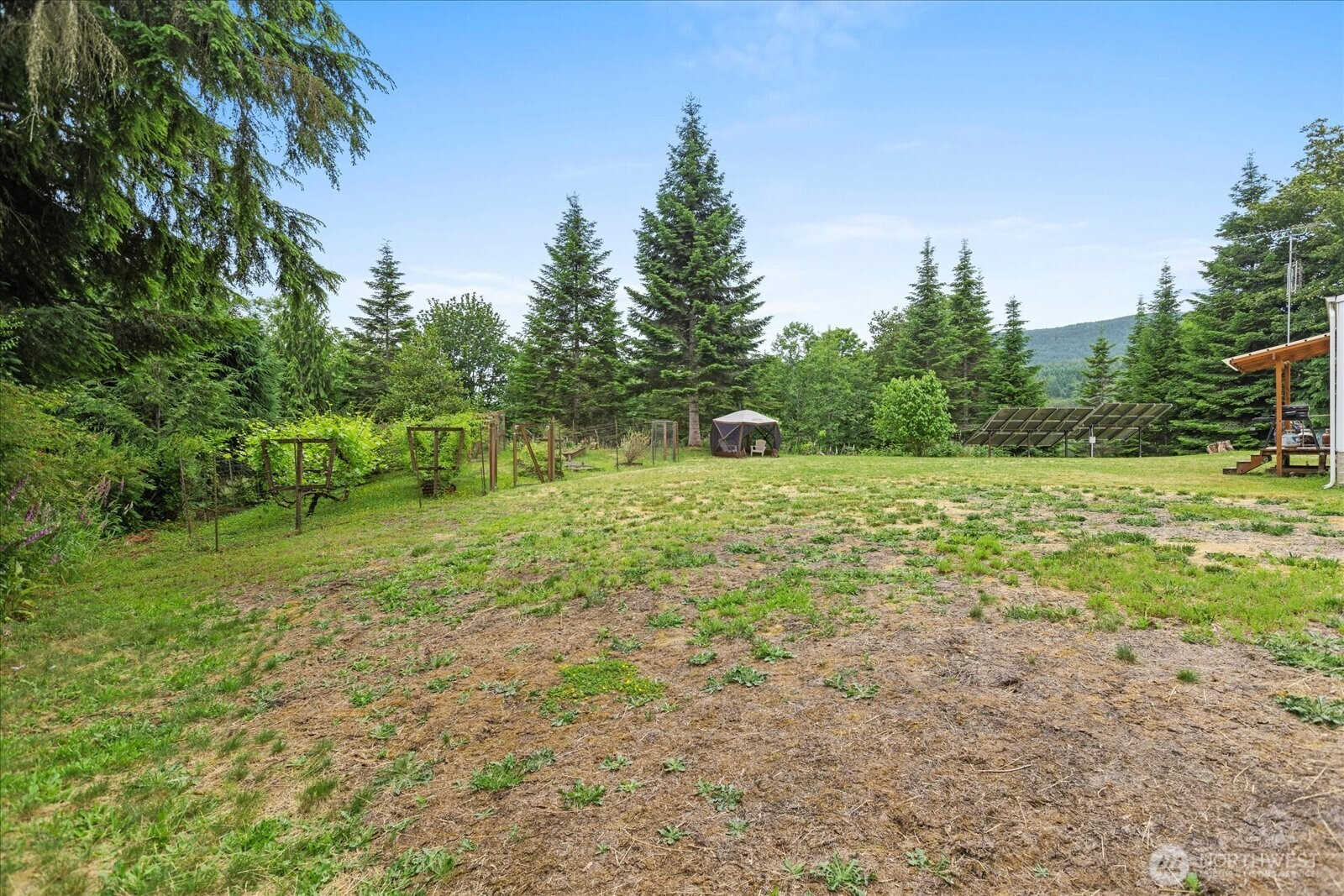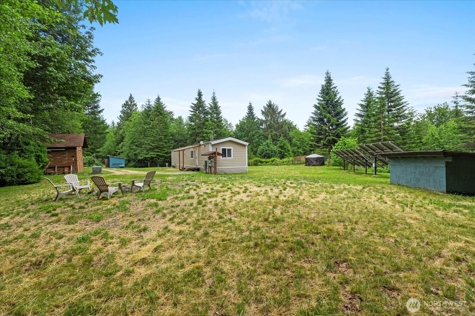 Discover peace and tranquility on over 20 acres of private, scenic land. Surrounded by nature, this well-maintained 2 bed / 1.75 bath manufactured home sits atop a secluded hilltop, offering sweeping territorial views of the Sky Valley and surrounding foothills. The property is thoughtfully equipped for both comfortable living and future potential, featuring multiple outbuildings including storage sheds, a chicken coop, and a dedicated beekeeping shed. Enjoy a fully fenced garden area with established plantings, including kiwi, grapevines, PawPaw trees, and mature apple trees—ideal for those seeking a sustainable lifestyle. Solar panels provide energy efficiency with annual rebates, while a strong-producing 80’ well delivers approximately 10 gallons per minute. The home is secured with over-engineered tie-downs (Big Foot Block system), and the driveway is reinforced with an ECORASTER erosion control system for long-term durability. With a 4-bedroom septic system already in place, this property offers excellent flexibility—live comfortably in the existing home or build your custom dream home. Multiple potential building sites and ample power availability make future development easy. A rare opportunity to own a private retreat with unmatched natural beauty, usable land, and endless possibilities.