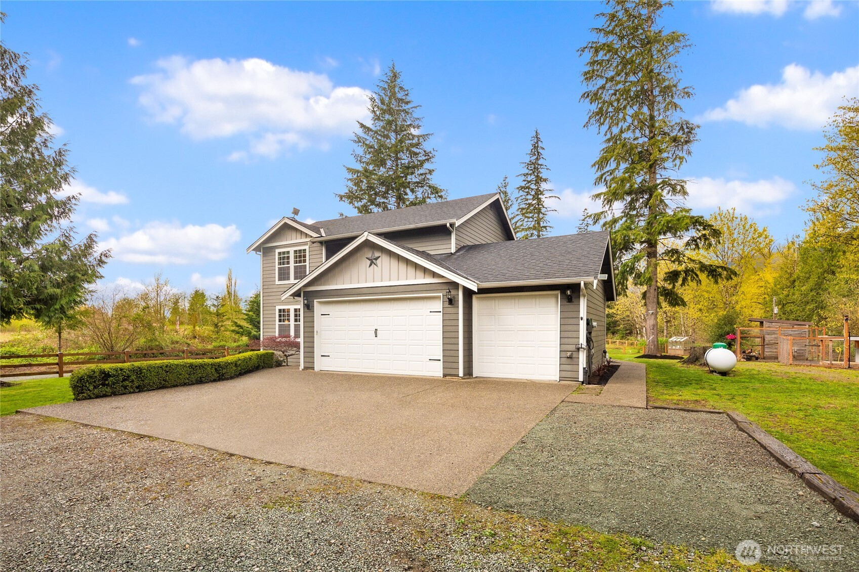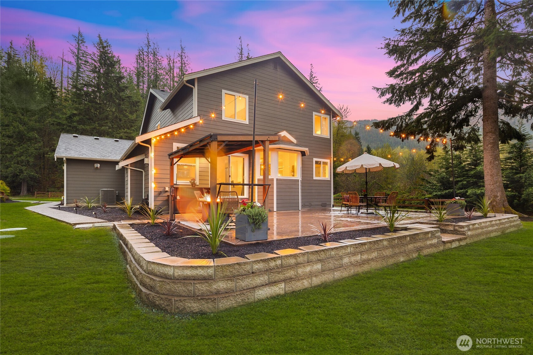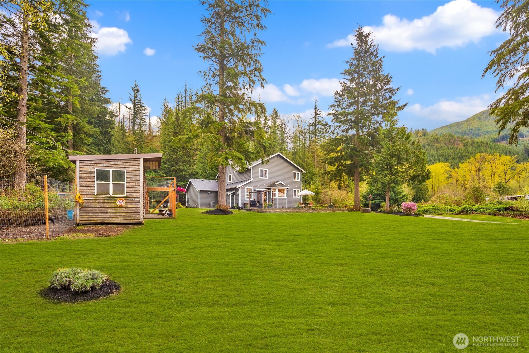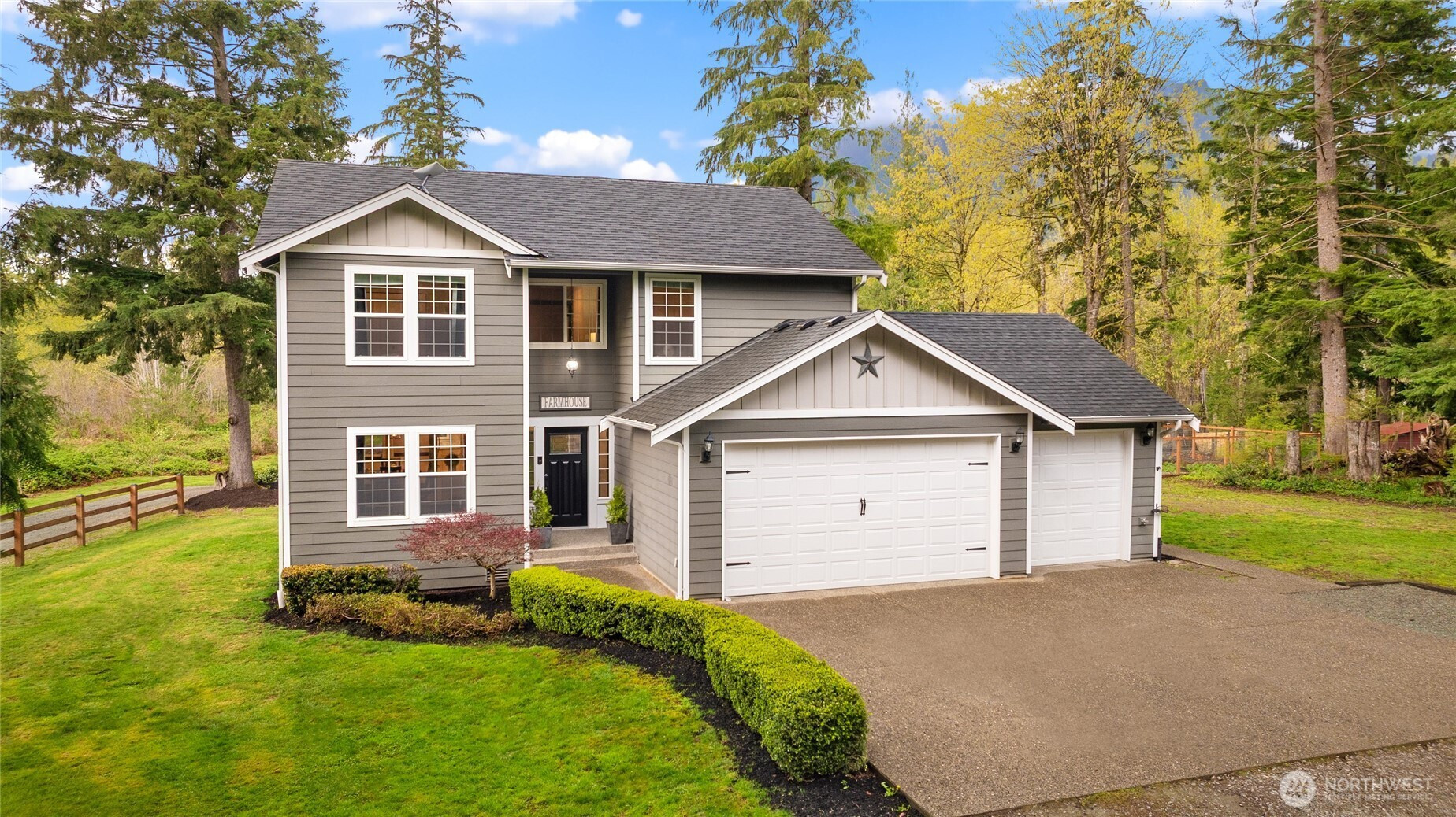 Surrounded by breathtaking mountain views and set on 4.7 impeccably landscaped acres in Gold Bar, this exceptional 4-bedroom, 3-bath home offers refined Northwest living with a versatile main floor office featuring a closet for possible guest space or 5th bedroom. The beautifully appointed open-concept kitchen flows into the main living area and features dual ovens, including one built into the oversized island, making it ideal for everyday living and entertaining. A propane fireplace adds warmth and ambiance. The spacious primary suite is a true escape with French doors, vaulted ceilings, and a spa-inspired bath with a jetted soaking tub and tiled shower. Outdoors, enjoy a stamped concrete patio surrounded by lush landscaping, a fully fenced garden with greenhouse and plumbed water, private creekside access, and a fire pit perfect for summer nights. Additional features include a custom chicken coop, a powered dog run with a heated doghouse, a 3-car garage with EV charger, an RV pad with 50-amp power, water, and a separate meter for future shop or guest quarters, a tankless water heater, new A/C heat pump installed in 2022, and a generator capable of powering the entire home. Pre-inspected with all items addressed. Minutes to skiing, hiking, fishing, rafting, and more.