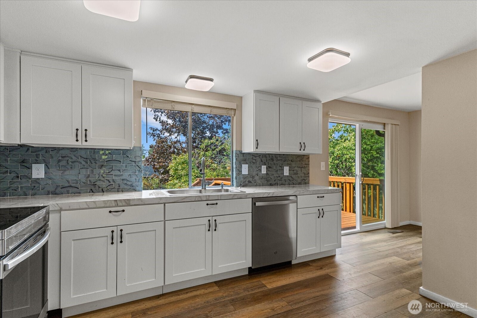 Very Nice 1760 SF 3 Bedroom 2.5 Bath And 480 Sf 2 Car Garage. This Beautiful Home Stands Proud on a Large 8,276 Sf Lot located On a Quiet CUL- DE- SAC in the Heart of Lynnwood & AWARD WINNING EDMONDS SCHOOL DISTRICT. VINYL PLANK (like) Floors on Main Level. Upper Level has Formal Living Room w/ Gas Fireplace, Formal Dinning Room and Large Updated Kitchen w/ STAINLESS STEEL APPLIANCES, QUARTZ COUNTERS, Nice White Kitchen Cabinets & Tile Backsplash & Chrome Hardware. Outdoor Upper Sliding Door To Enjoy the NEW CEDAR SUNDECK. Large Downstairs Recreation Room with Hardwood (like) Floors And Another Gas Fireplace & Wet Bar. Laundry Rm and 3/4 Bath Large 2 Car Garage w/ Room For Bonus Area. Space For RV Parking.