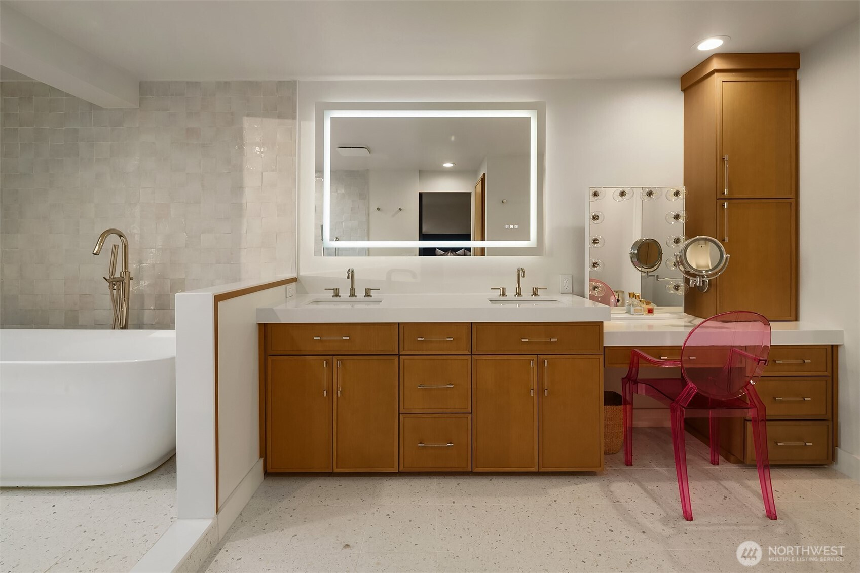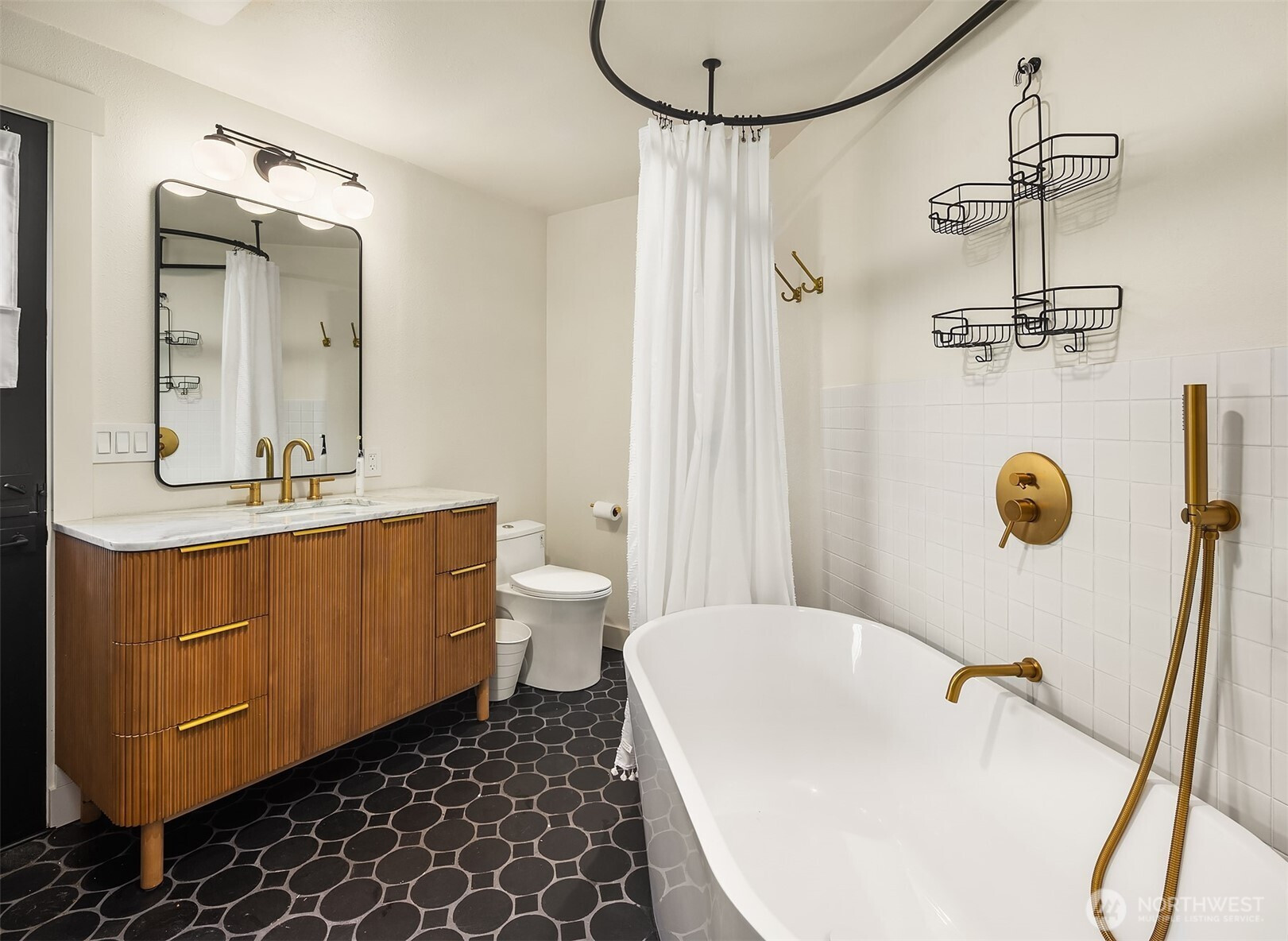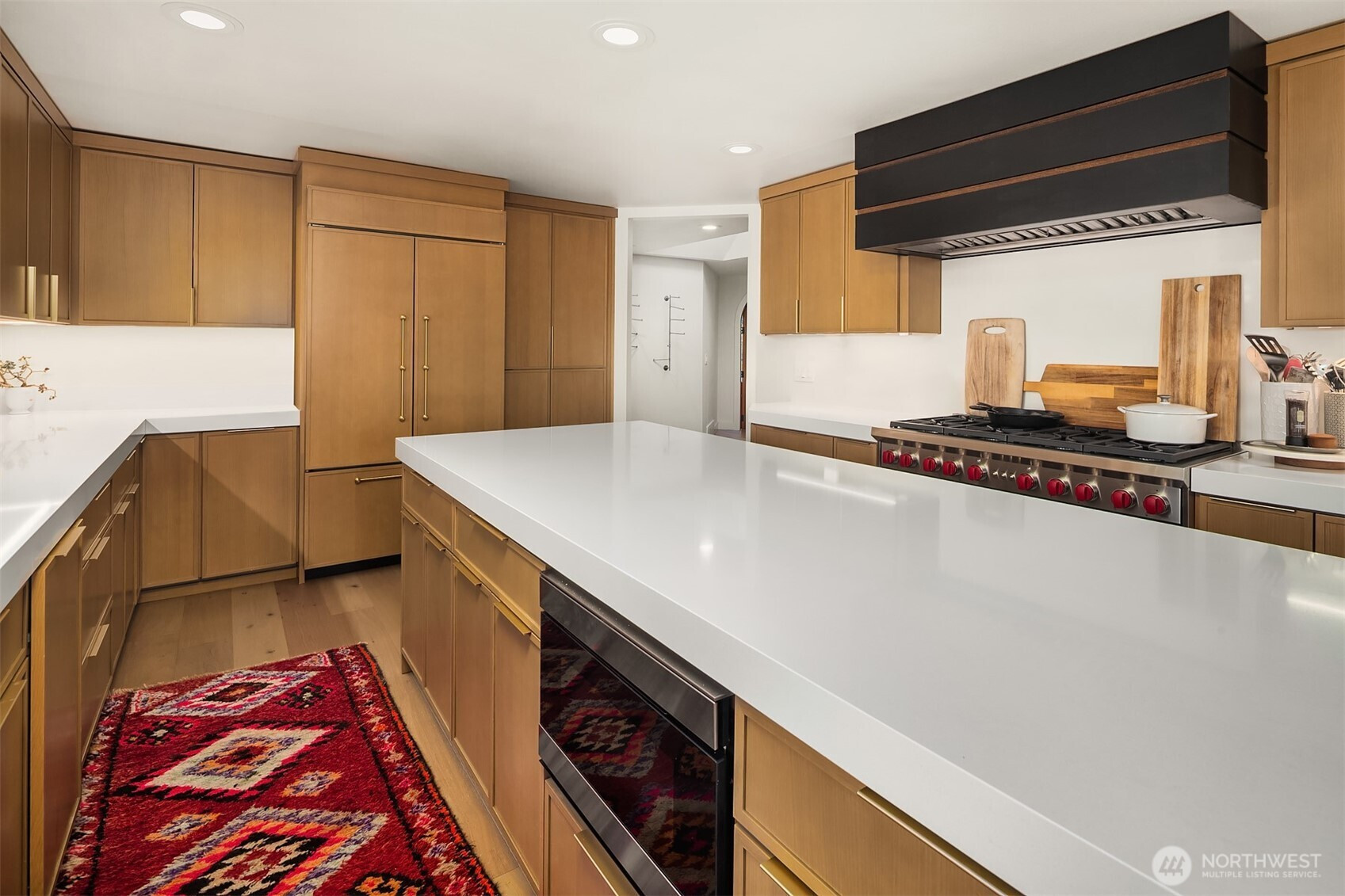 West-facing Sound & Olympic sweeping views from this fully-remodelled 4-bed Edmonds home. Double doors open to a grand entry w/ skylight & wood slat detailing. Open plan great room w/ expansive indoor–outdoor flow to the oversized view deck & gas fireplace. Enjoy the views & entertain. Sleek flat-panelled custom gourmet kitchen w/ 10-ft+ island. Miele, Wolf, & Subzero; All the best. Dramatic den w/ arched double doors & gas fireplace. Primary Suite offers floor-to-ceiling walls of glass & views, relax to sunsets or step out to the view deck. Spa en-suite w/ curbless walk-in wet room shower, solarium-style windows w/ views, & soaking tub. Dual sinks & built-in vanity station. Lower-level rec-room. 2nd Primary. New millwork. Wide-plank oak hardwoods throughout. Modern updates New driveway & landscaping. 5-car garages + tons o driveway parking, new driveway & landscaping including low-maintenance turf.