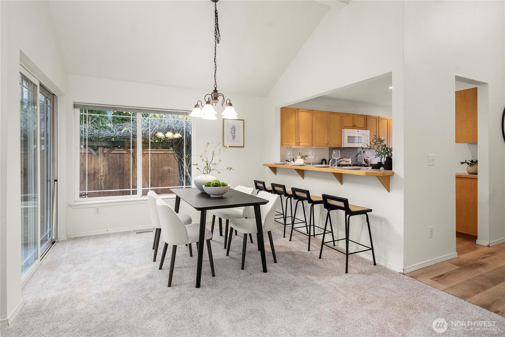 This beautifully refreshed Timbers at North Creek home offers a bright welcoming layout. You'll be captivated by its soaring ceilings and expansive windows filling every corner with natural light. Fresh paint and brand-new flooring lend a graceful glow to the bright, open-concept design, where living, dining, and rest blend effortlessly. The main-floor primary suite feels like a retreat, with ensuite and walk-in creating a space made to relax. Upstairs, two additional bedrooms provide space to dream, work, or unwind. Step into the private backyard and find yourself embraced by lush greenery, quiet and calming. 2 car garage and an ideal Thrashers Corner location surrounded by parks, shops, and easy commuter access, makes this home a dream.