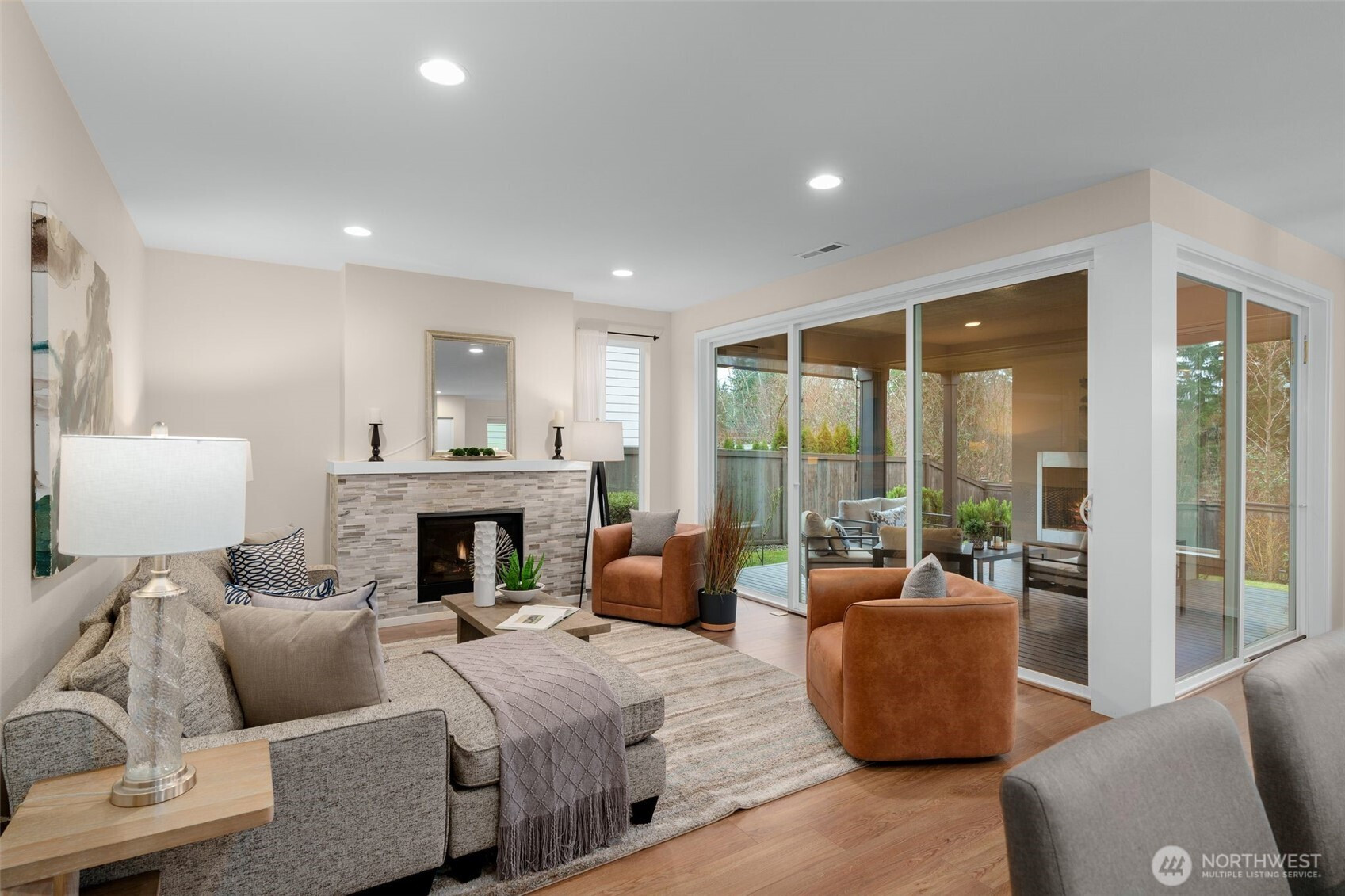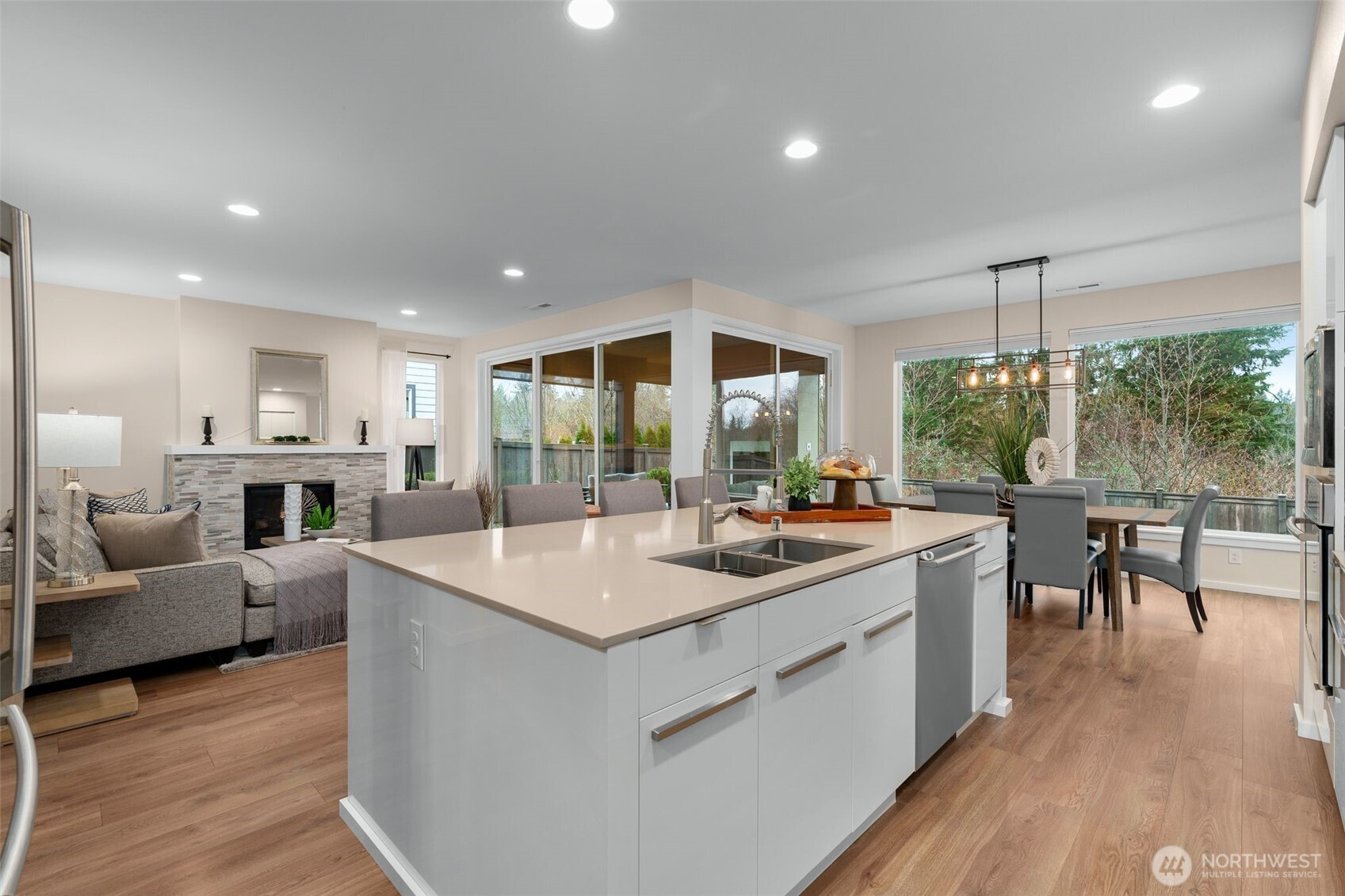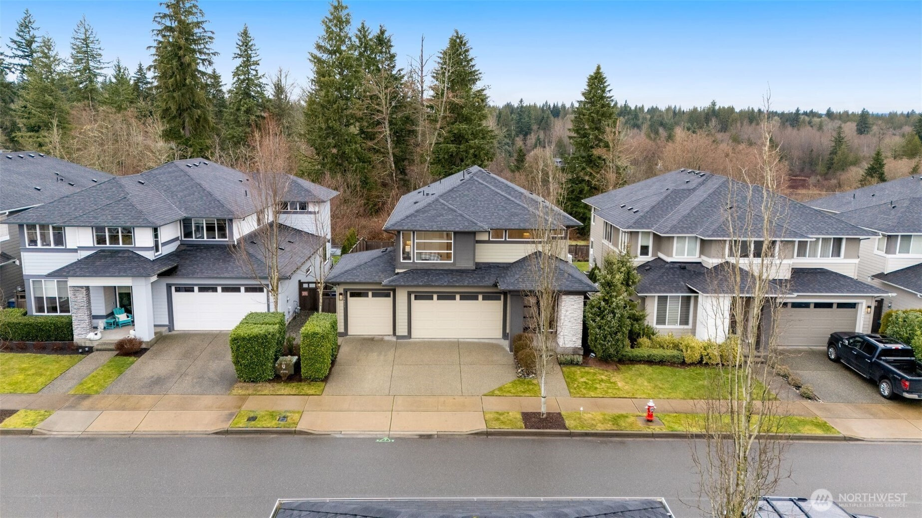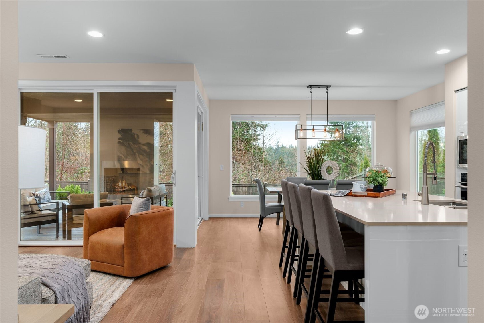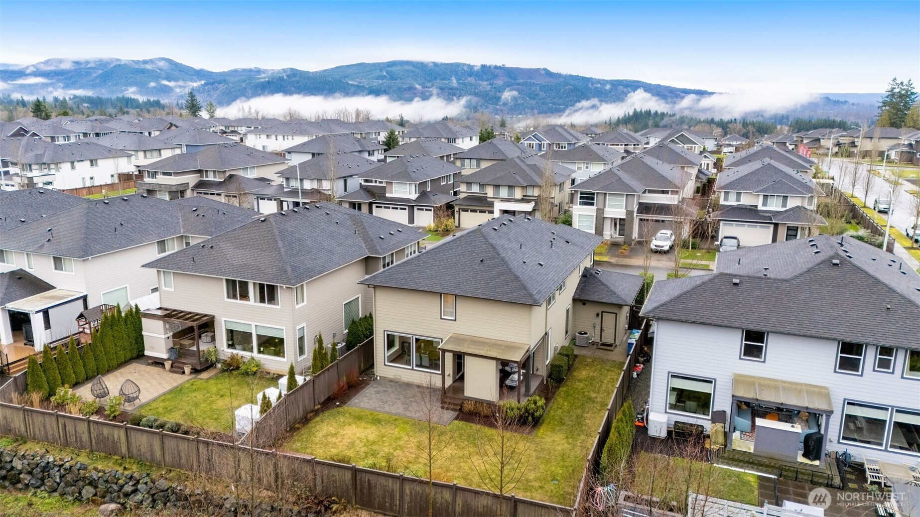Meticulously maintained MainVue home that faces rare private green space. Light and bright open floor plan with A/C, engineered hardwood floors, and spacious 3-car garage with EV charger and slat storage system. Chef's kitchen includes high-end cabinetry, center island with quartz countertops, and premium appliances. Main floor office with custom California Closets could be 5th bedroom or perfect WFH set-up! Rare covered pergola outdoor patio deck with gas fireplace plus gas BBQ stub makes year round outdoor entertaining a breeze. Spacious primary suite with luxurious five piece bath and TWO walk-in closets. Upper bonus room provides versatile flex space. New interior paint and new carpeting upstairs. Govee permanent holiday lighting system provides app-controlled exterior lighting. Prime location minutes to stores, amenities, walking trails and restaurants with gorgeous valley views.
