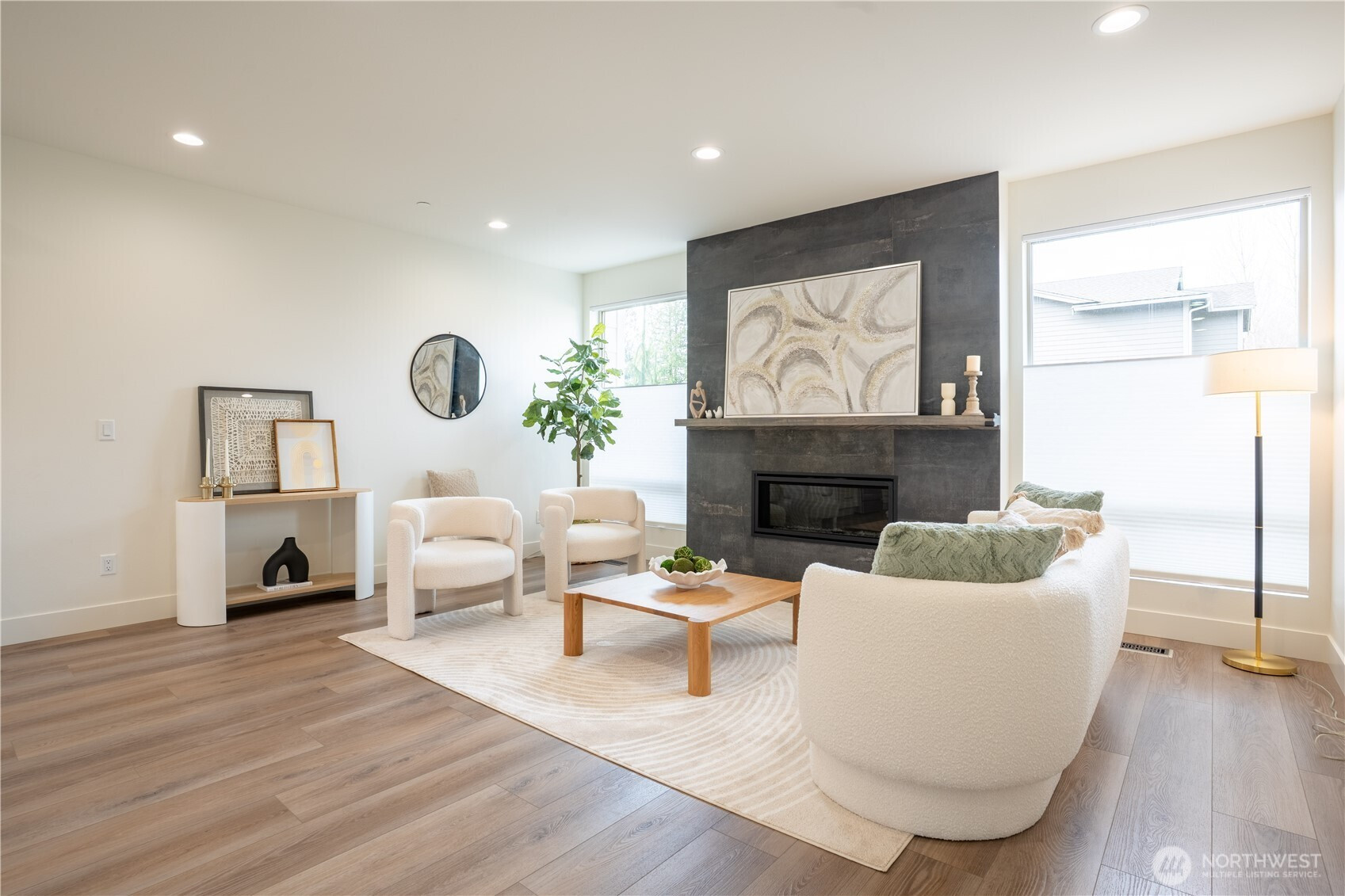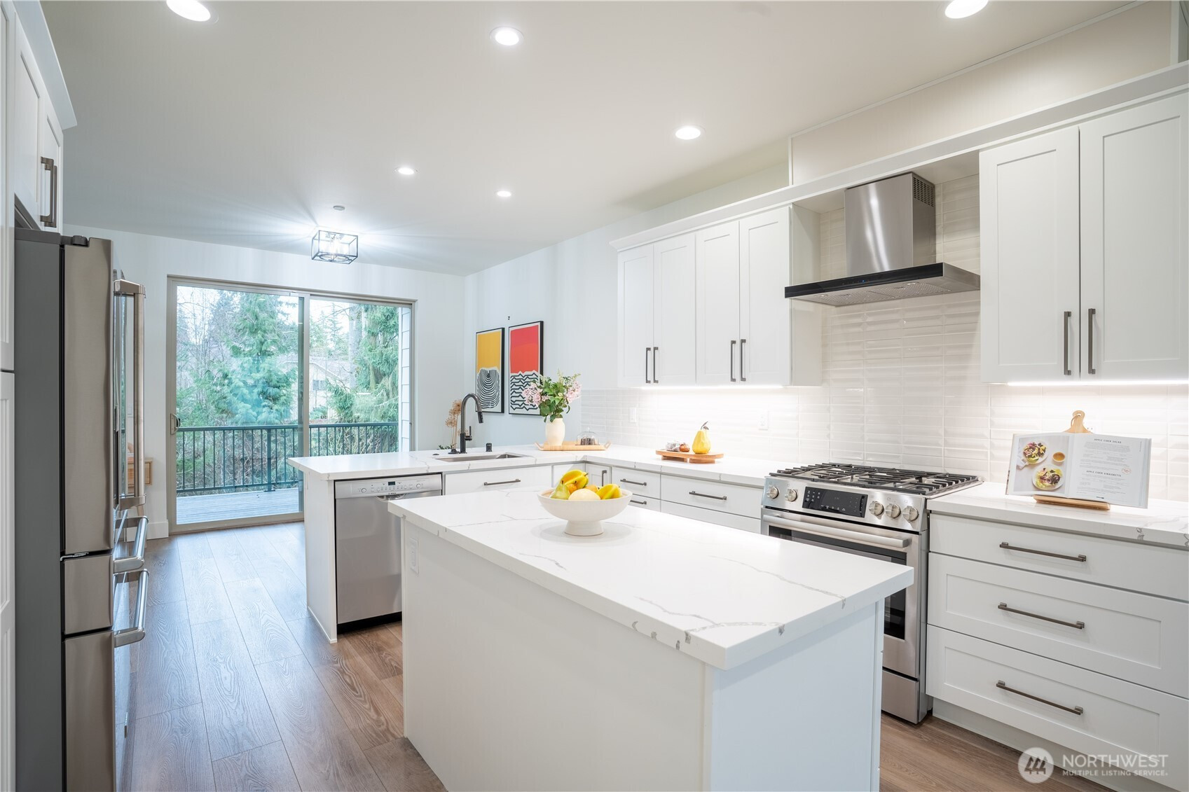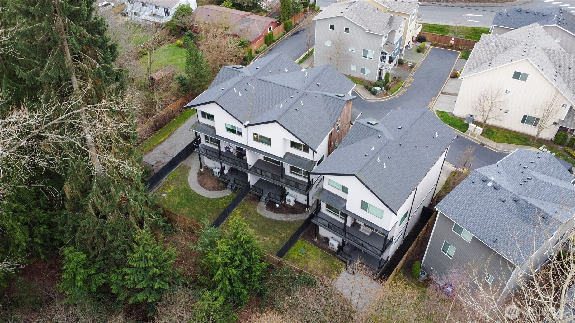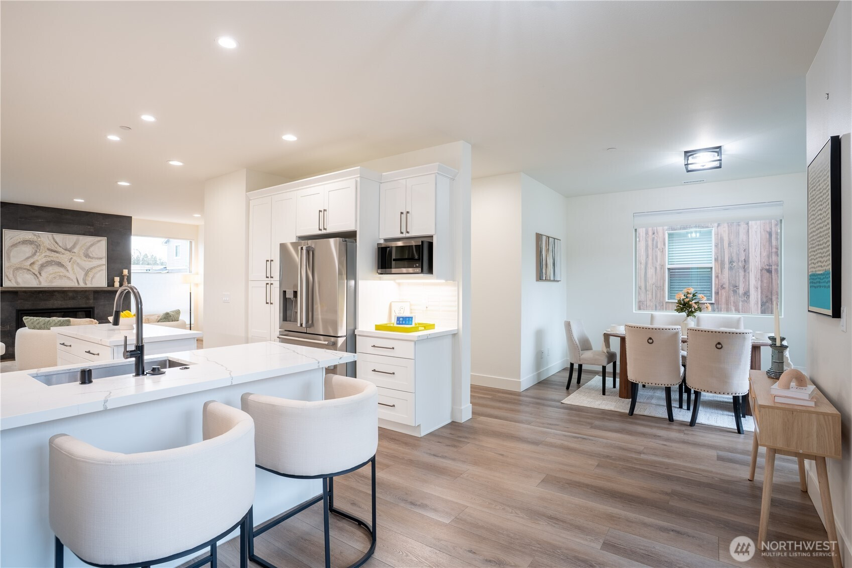 Stylish and spacious home in the desirable Arbor Mist Village community, offering modern finishes and greenbelt privacy with convenient access to Whole Foods, light rail, and Alderwood Mall. This well-designed home features 4 bedrooms plus a bonus/rec room, 3.5 baths, and a 2-car garage. The bright island kitchen includes white shaker cabinets, quartz countertops, stainless steel appliances, and an open layout ideal for everyday living and entertaining. Primary suite offers a designer tiled walk-in double shower with glass doors and a spacious walk-in closet. Enjoy covered decks, a fully-fenced backyard backing to a peaceful greenbelt, and a welcoming front porch. Additional features include 9-foot ceilings, 7-foot doors, a heat pump with A/C, on-demand gas water heater, LVP flooring, fully tiled bathrooms, and window coverings. Convenient commuter location with nearby light rail and easy access to I-5 and I-405. Whole Foods is just across the street, with Alderwood Mall, dining, and everyday conveniences minutes away, while the home remains tucked inside a quiet residential community.