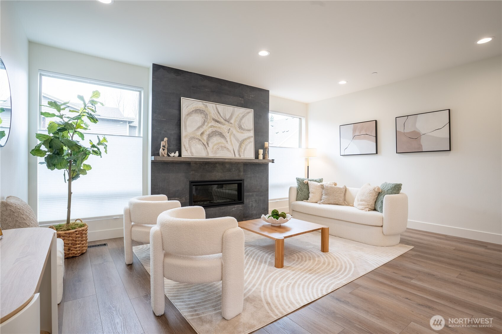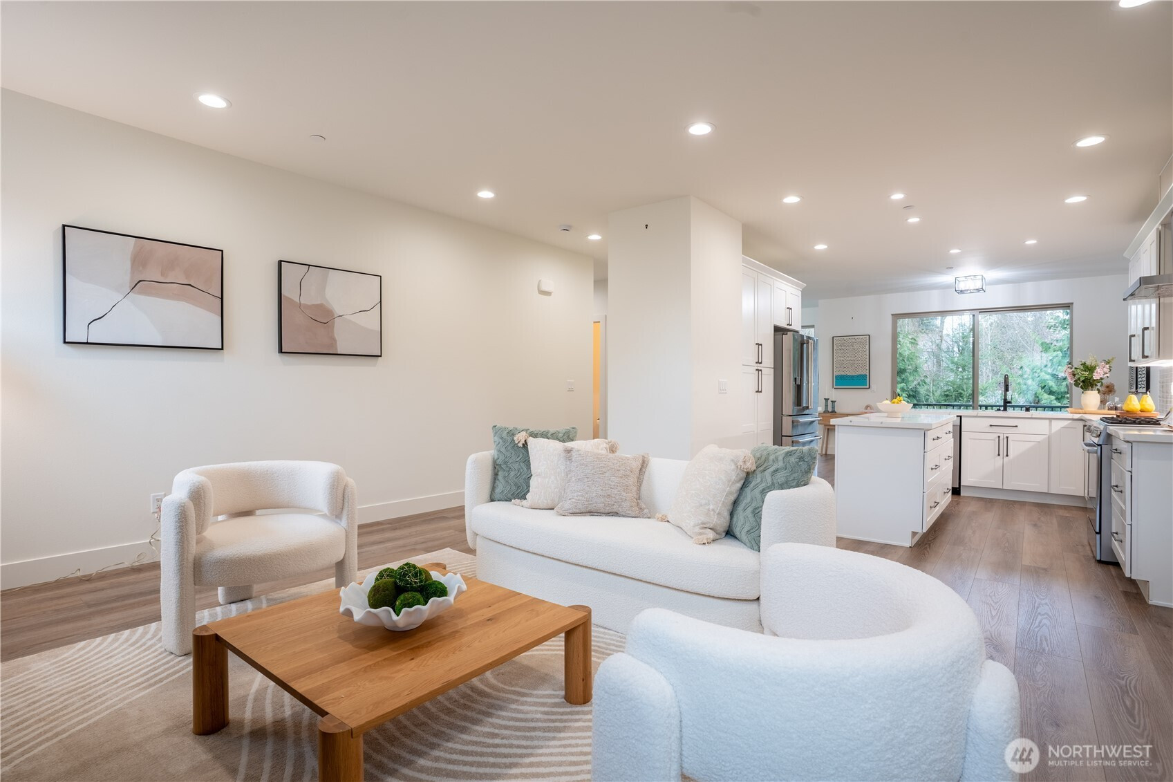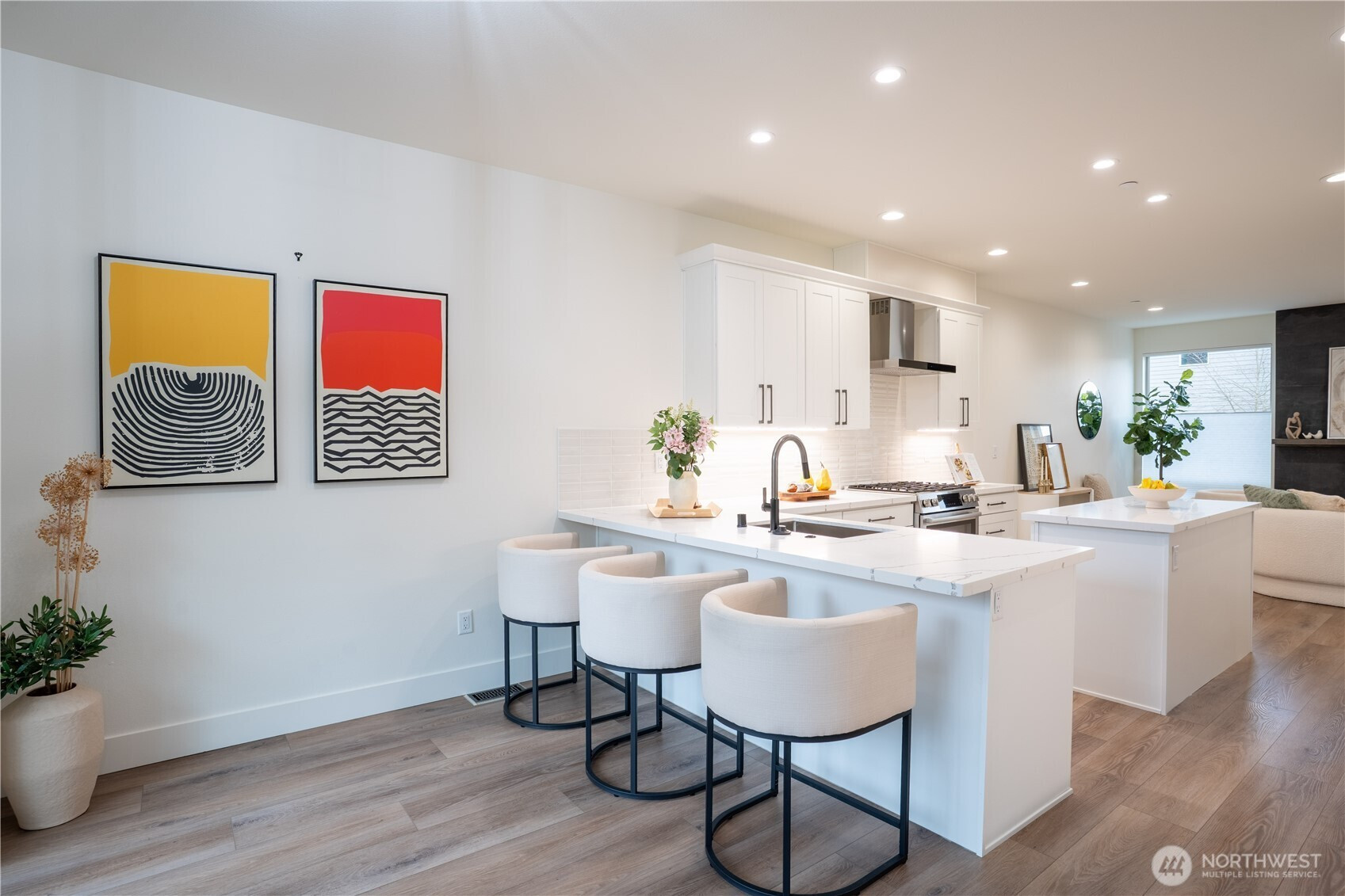 Stylish and spacious home in the desirable Arbor Mist Village community, offering modern finishes and greenbelt privacy with convenient access to Whole Foods, light rail, and Alderwood Mall. This well-designed home features 4 bedrooms plus a bonus/rec room, 3.5 baths, and a 2-car garage. The bright island kitchen includes white shaker cabinets, quartz countertops, stainless steel appliances, and an open layout ideal for everyday living and entertaining. Primary suite offers a designer tiled walk-in double shower with glass doors and a spacious walk-in closet. Enjoy covered decks, a fully-fenced backyard backing to a peaceful greenbelt, and a welcoming front porch. Additional features include 9-foot ceilings, 7-foot doors, a heat pump with A/C, on-demand gas water heater, LVP flooring, fully tiled bathrooms, and window coverings. Convenient commuter location with nearby light rail and easy access to I-5 and I-405. Whole Foods is just across the street, with Alderwood Mall, dining, and everyday conveniences minutes away, while the home remains tucked inside a quiet residential community.