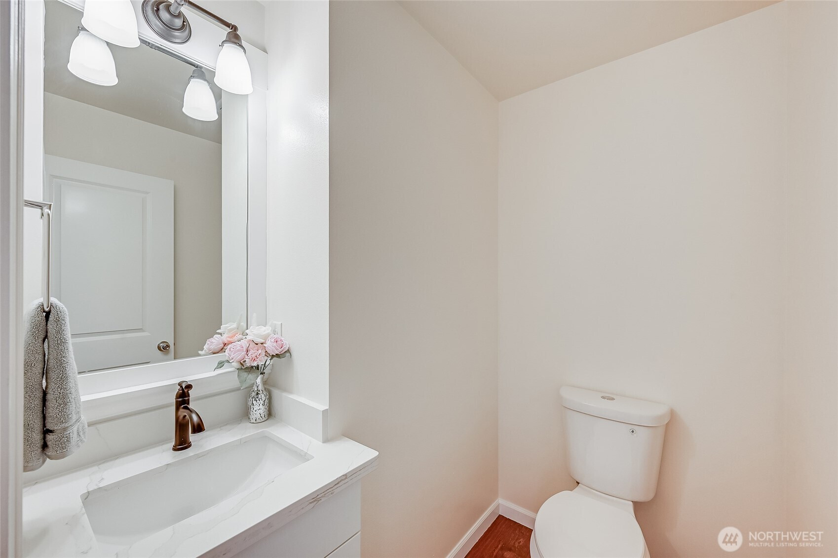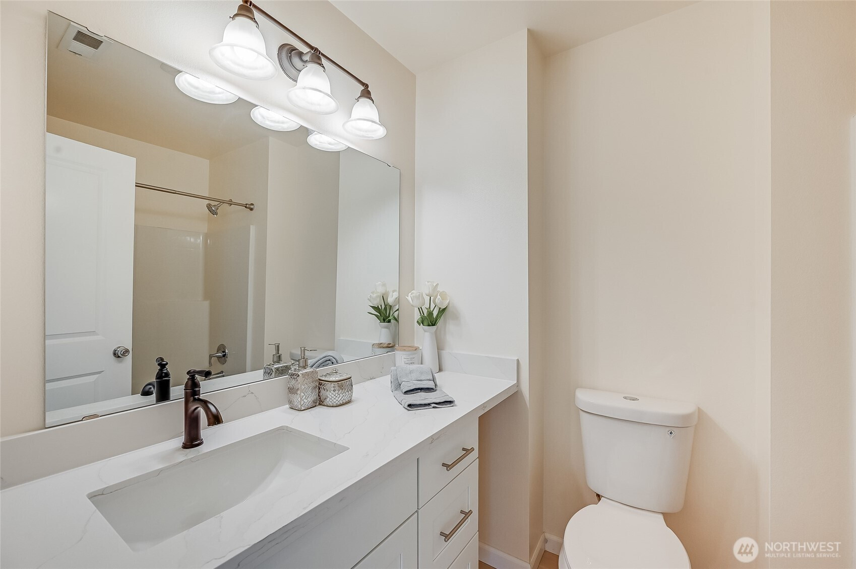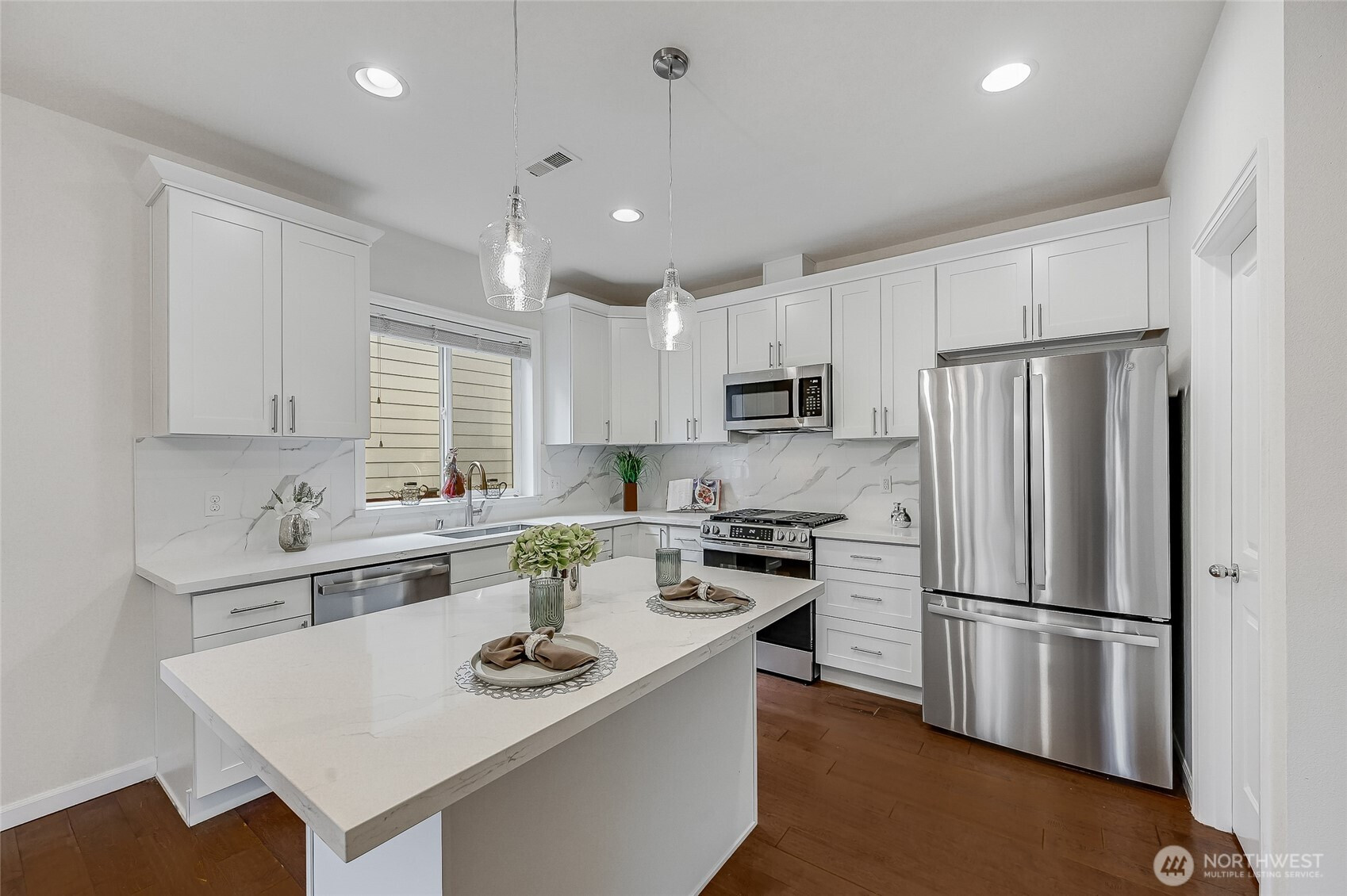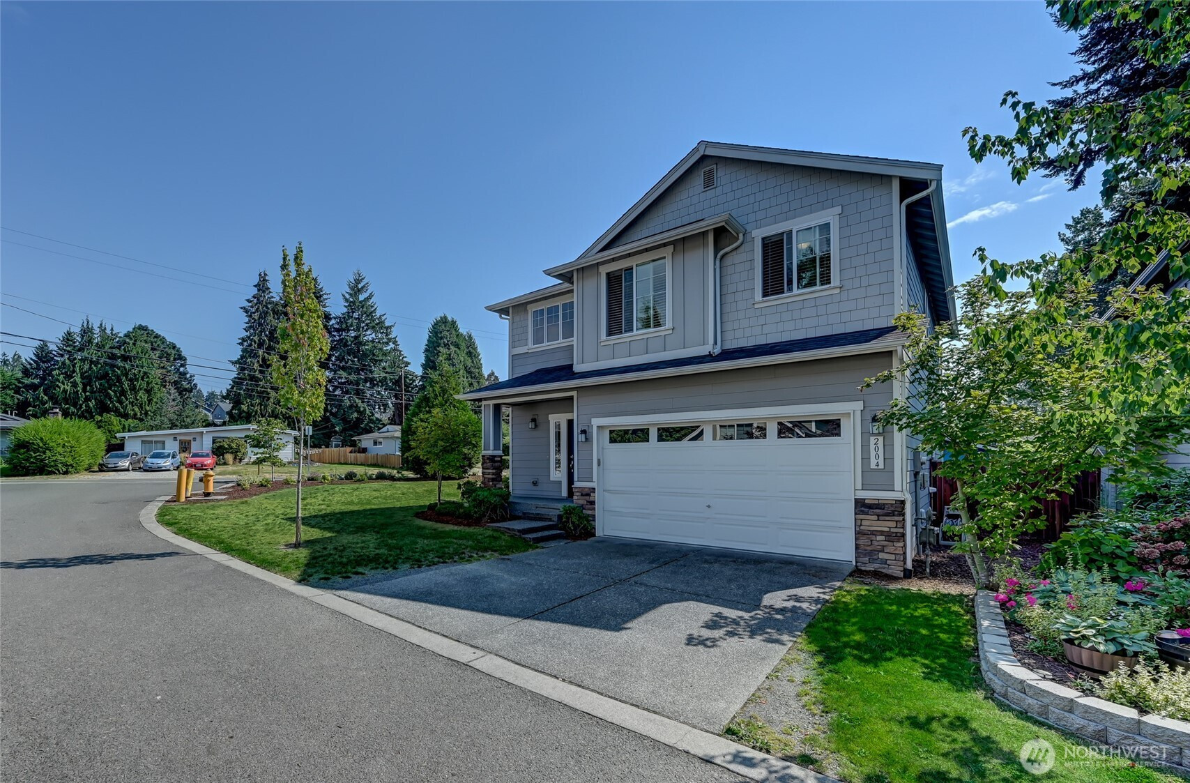 Welcome to Danbury! MOVE IN READY!!!! This detached corner home boasts high ceiling entryway, open floor plan with a fully remodeled kitchen and tile backsplash, brand new kitchen appliances, and bathroom cabinets and quartz counter top. New carpet upstairs and fresh new paint. Painted millwork, light fixtures throughout, wrought iron ballasts. Master suite w/elegant vaulted ceiling. Plenty of natural sunlight with trees in backyard for added privacy. Lake and parks near by. Close to I-5 and Hwy 99. Low HOA Dues !!