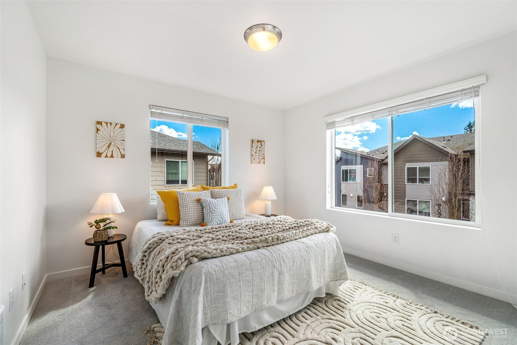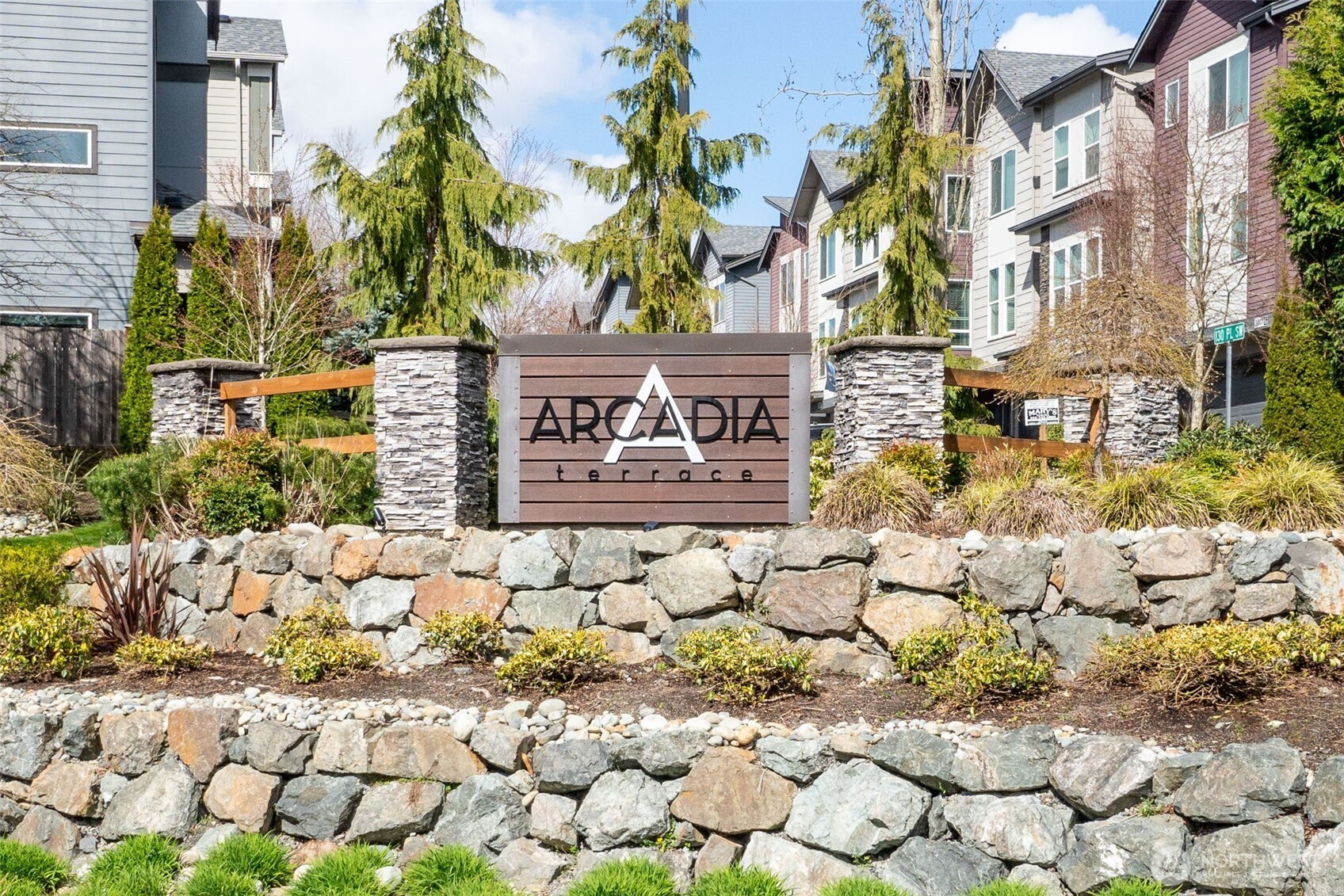 Welcome to Arcadia Terrace, where contemporary design and refined comfort come together. This light filled end unit townhome offers exceptional privacy and a beautifully maintained setting, surrounded by quiet cul de sacs and thoughtfully planned green spaces. The tiled entryway welcomes you inside, offering convenient access to the spacious 2 car garage. The ground floor features a versatile bedroom/office with a full bath, ideal for guests, multigenerational living, or a dedicated work from home retreat. Upstairs, the open concept main level features hardwood laminate flooring, and wall-to-wall entertaining options with the living room, dining area, and gorgeous kitchen. Fresh interior paint and brand new carpet throughout elevate the home with a crisp, modern aesthetic. At the heart of the home, the expansive kitchen impresses with quartz countertops, a mosaic tile backsplash, pantry, stainless steel appliances, an efficient island with bar seating, and a gas range. The freshly repainted private deck extends the living space outdoors. The upper level offers three well appointed bedrooms on one floor, including a serene primary suite. Residents of Arcadia Terrace enjoy access to playgrounds, a basketball court, picnic areas, and open green space. With no rental cap and a prime location near shopping, dining, parks, and quick access to I-5, 405, and Alderwood, this home is beautifully cared for and truly move in ready.