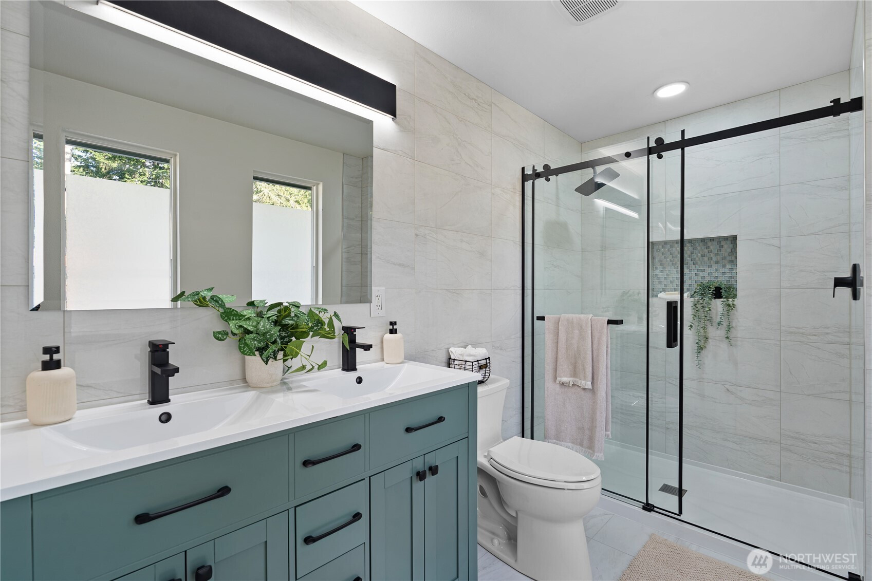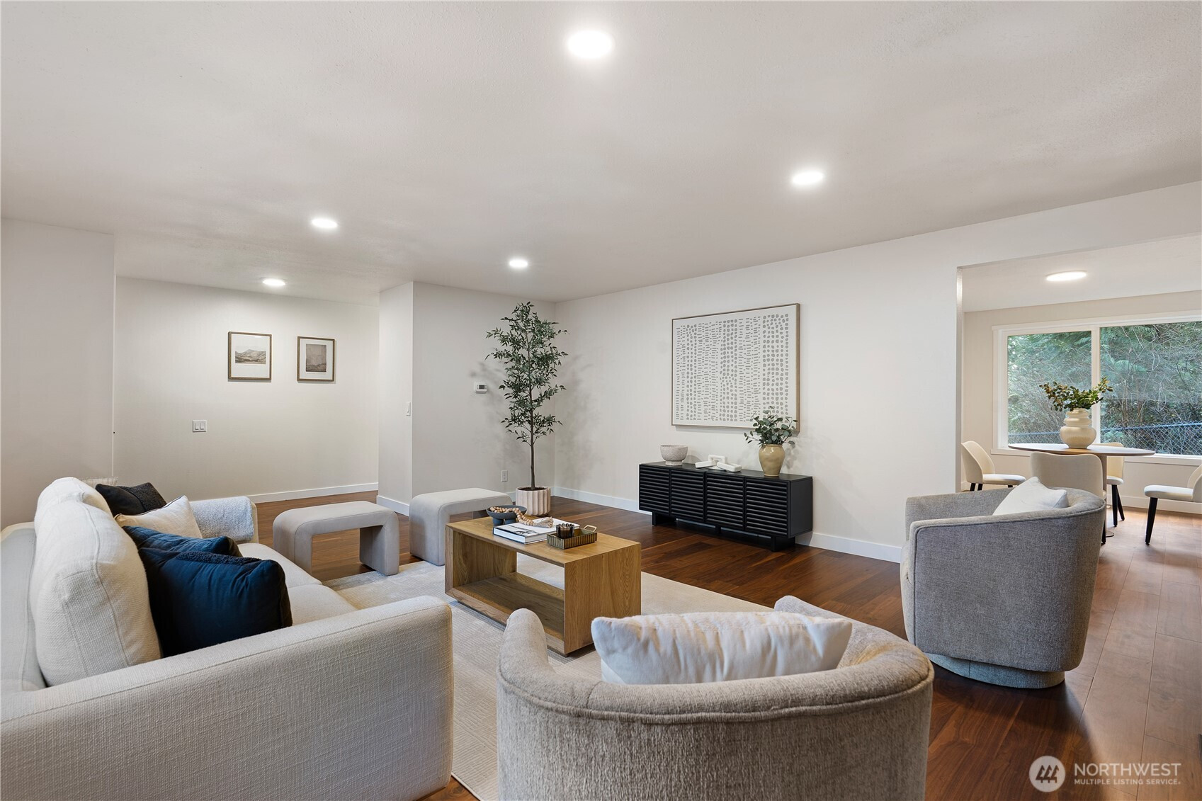 Tucked at the end of a quiet cul-de-sac in the Northshore School District, this thoughtfully remodeled Northwest Contemporary sits in a no HOA community offering a rare sense of space and calm in Bothell. Surrounded by mature evergreens, the setting feels private and peaceful, where mornings are filled with natural light and evenings are quiet. Inside, engineered hardwood floors and a beautifully updated kitchen with quartz countertops and stainless appliances create a clean, modern backdrop for everyday living and gathering. Newly installed Pella windows and sliding doors enhance both comfort and efficiency, offering Northwest Energy Star certification while framing views of the wooded surroundings. Updated baths with dual vanities, new carpet, fresh exterior paint, cedar siding, updated decking, new garage doors and openers, updated electrical panel, and a new Coleman electric furnace provide confidence in the home’s systems. The versatile tri-level layout offers multiple living spaces ideal for hosting, relaxing by the fireplace, or creating a dedicated work-from-home retreat, supported by high-speed internet availability. Outside, expansive yard space, patio, and open areas offer room to entertain, garden, or simply enjoy the privacy of your own wooded setting. Move-in ready and thoughtfully updated, this home blends modern comfort with natural Northwest charm.
