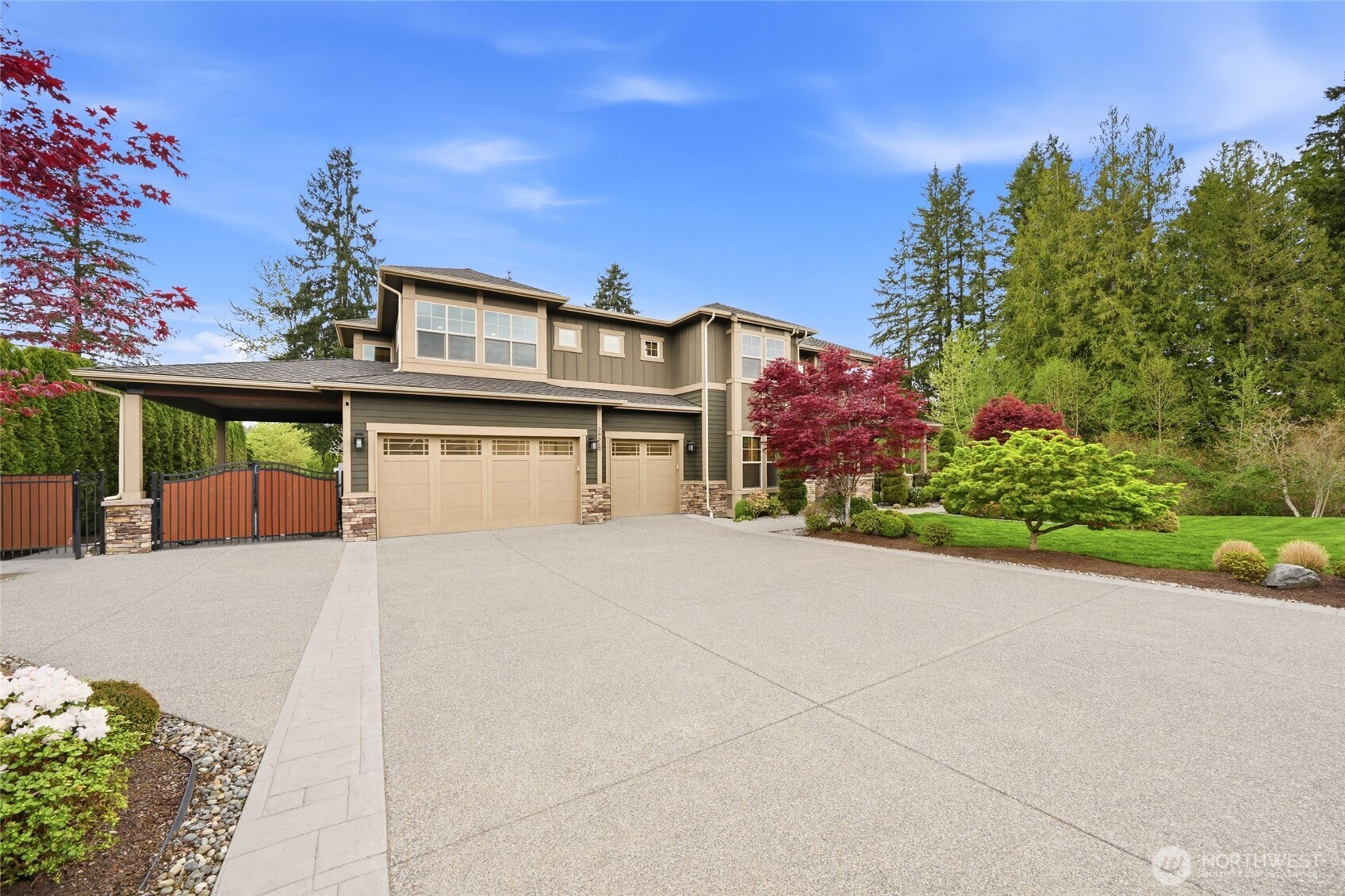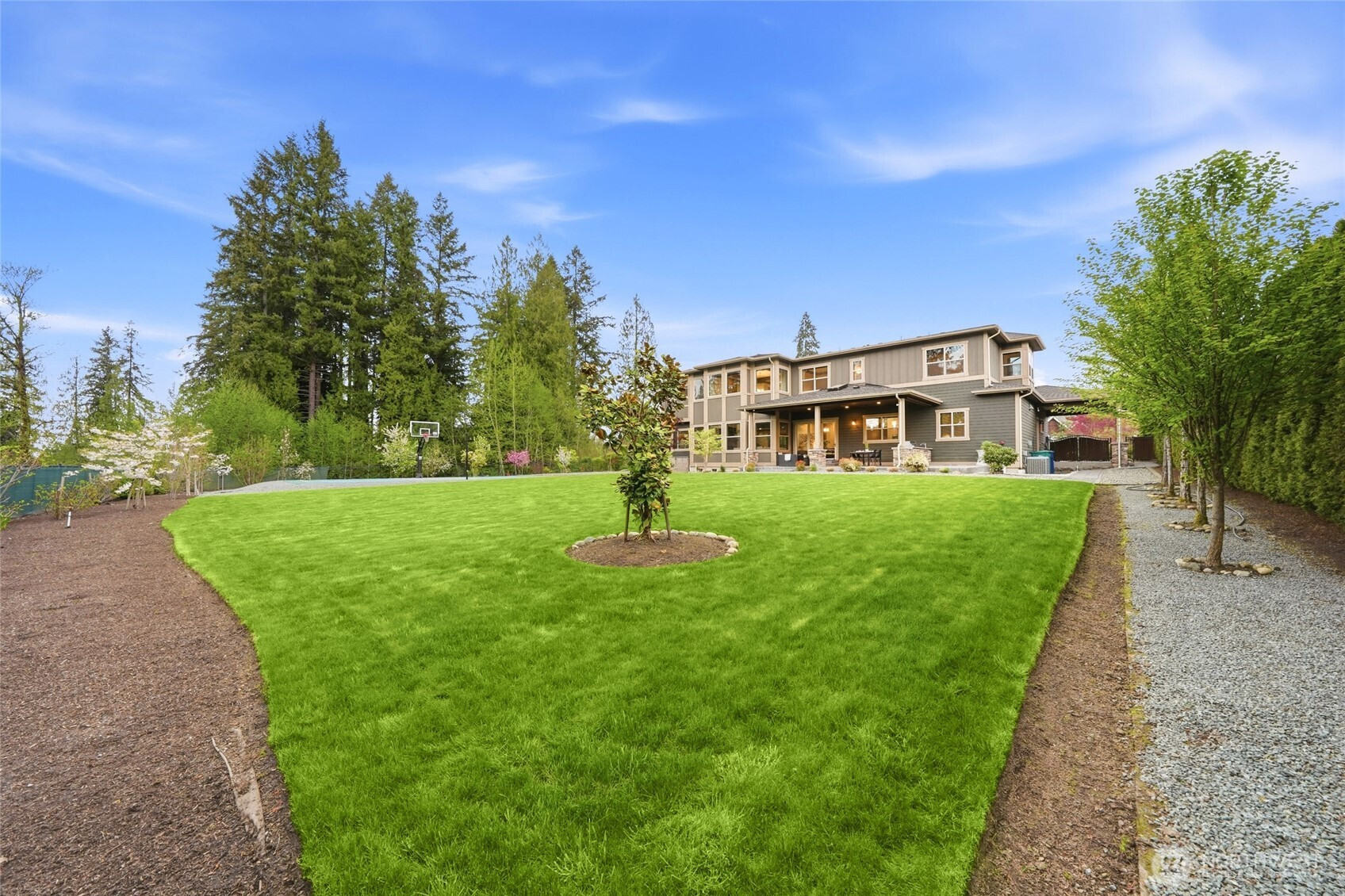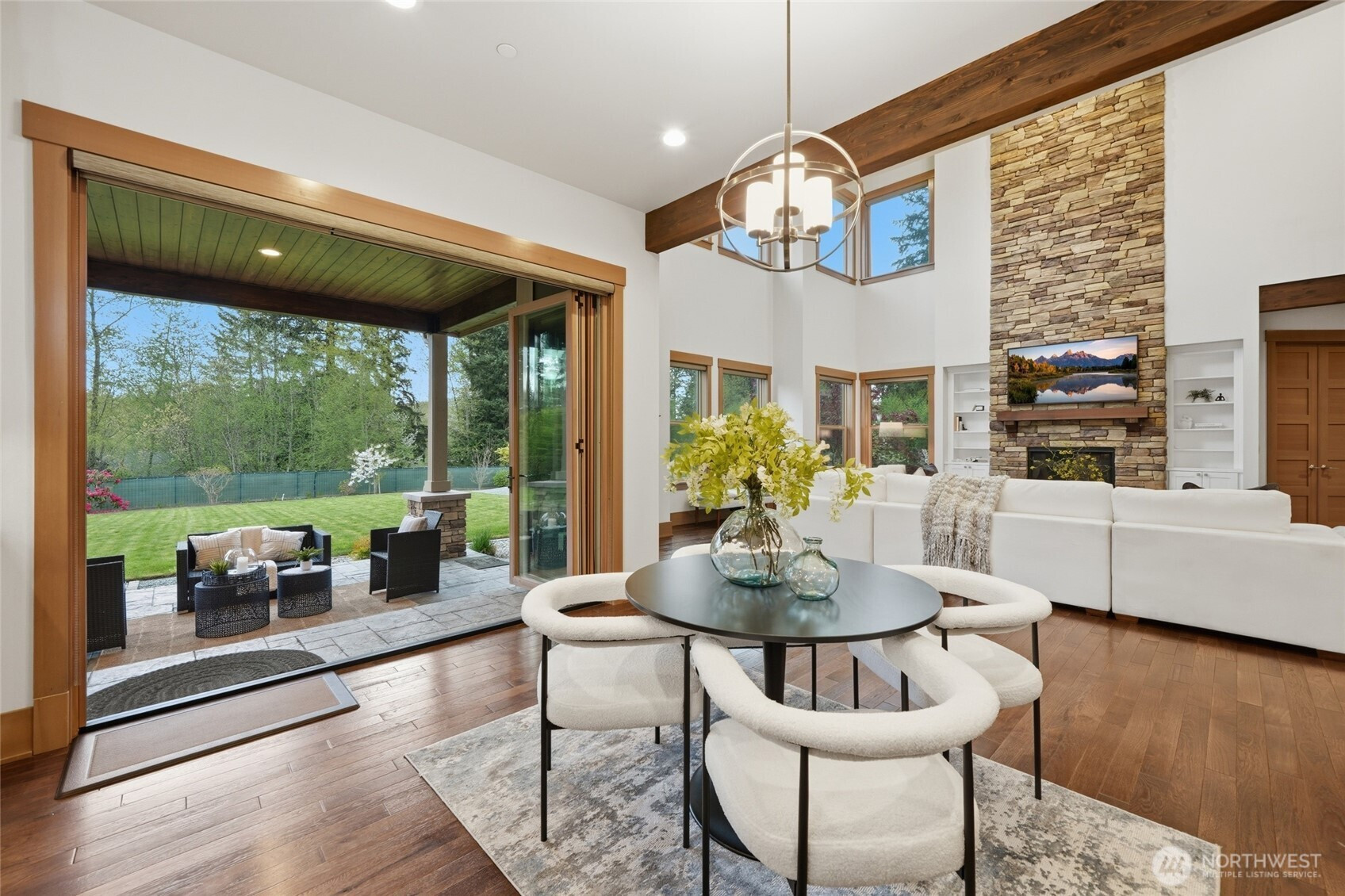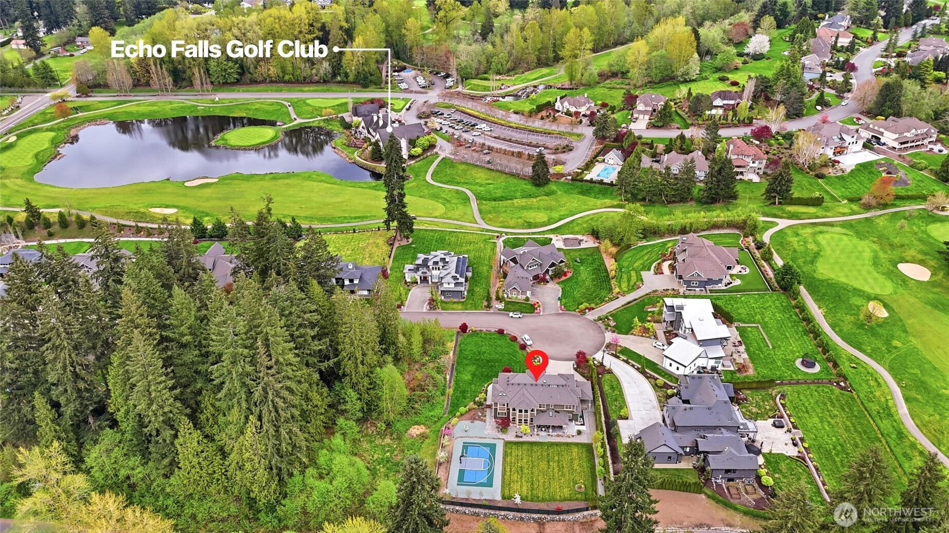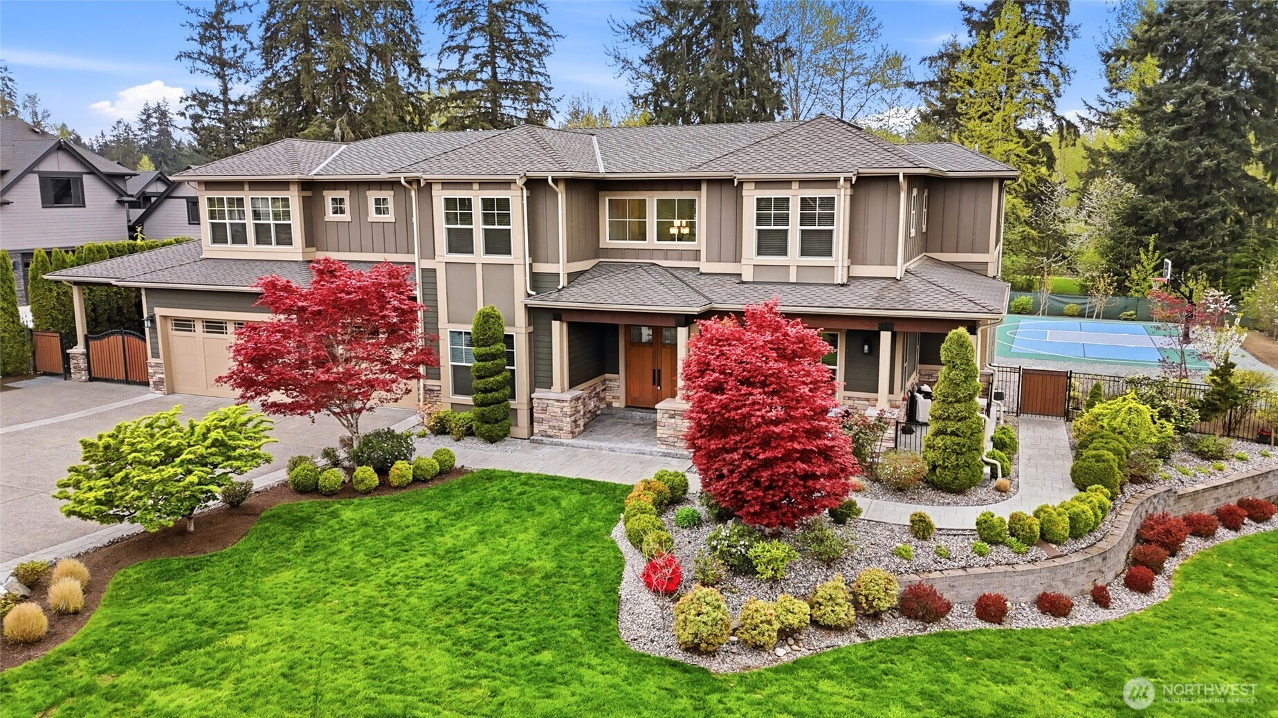 Refined luxury living in the gated community of The Arbors at Echo Falls. This custom home blends elevated design with relaxed livable elegance on a cul-de-sac. A covered front porch opens to a dramatic cathedral entry, where rich hickory hardwood floors set the tone. Main level features a formal sitting area, an elegant dining room, flowing into the great room with two-story ceilings, walls of windows, and a floor-to-ceiling stone fireplace. Main-floor office/guest suite and full bath adds flexibility. The chef’s kitchen is appointed with a Calacatta quartz island/countertops, white shaker cabinetry, and professional grade appliances including Sub-Zero(Style)fridge, an 8-burner range, prep sink, and generous pantry. Casual dining area opens through NanaWall doors to outdoor living spaces, creating seamless indoor-outdoor flow. A secondary office or fitness space off the kitchen provides versatility. Upstairs, the primary suite offers a spa-inspired bath with soaking tub, walk-in shower, and dual walk-in closets. Three additional bedrooms, two en-suites, a spacious bonus/media room with wet bar/mini kitchen perfect for home theater, plus an oversized laundry room. Designed for entertaining, the outdoor living area is a standout with a covered patio, built-in BBQ kitchen, stamped concrete, and landscaped backyard with a 30x50 multi-sport court for basketball, pickleball, and more. Walking distance to Echo Falls Golf Course and minutes to wineries, dining, and the Eastside.