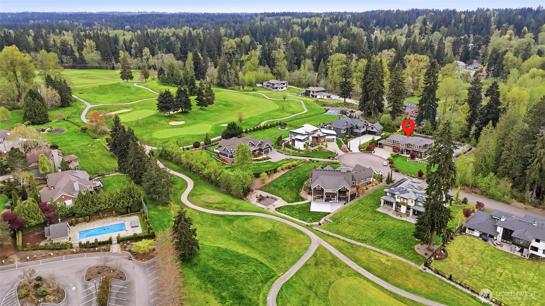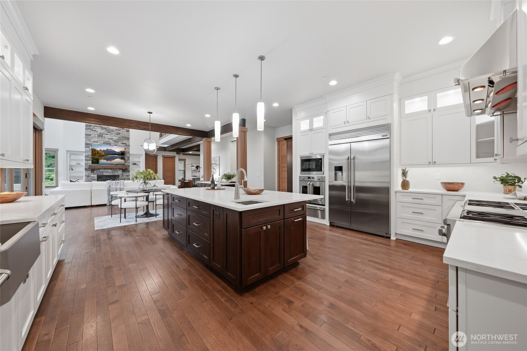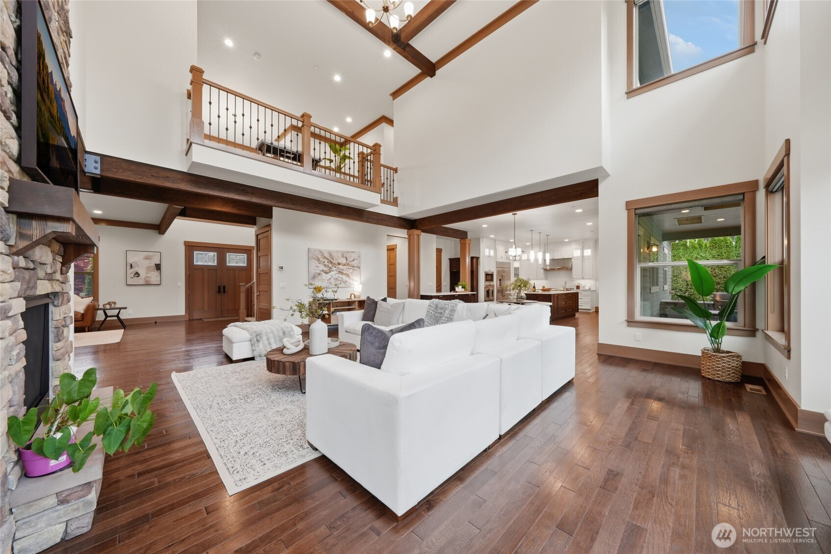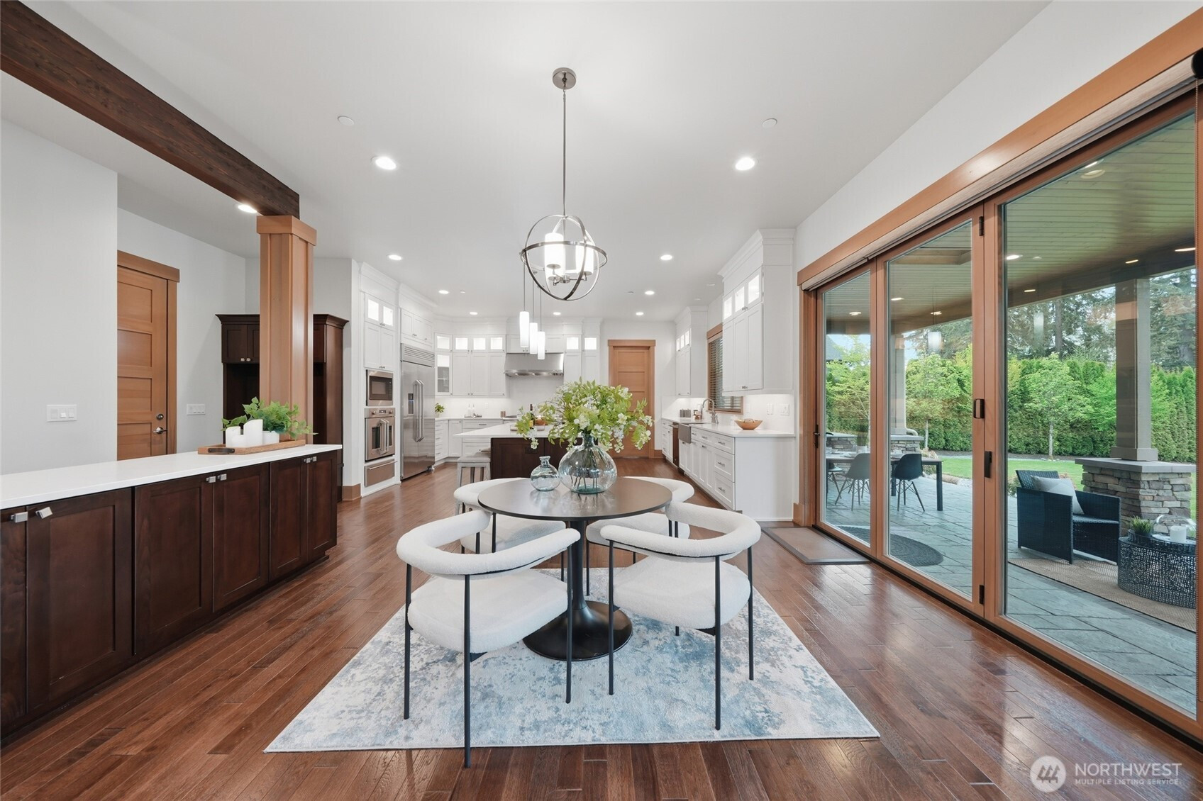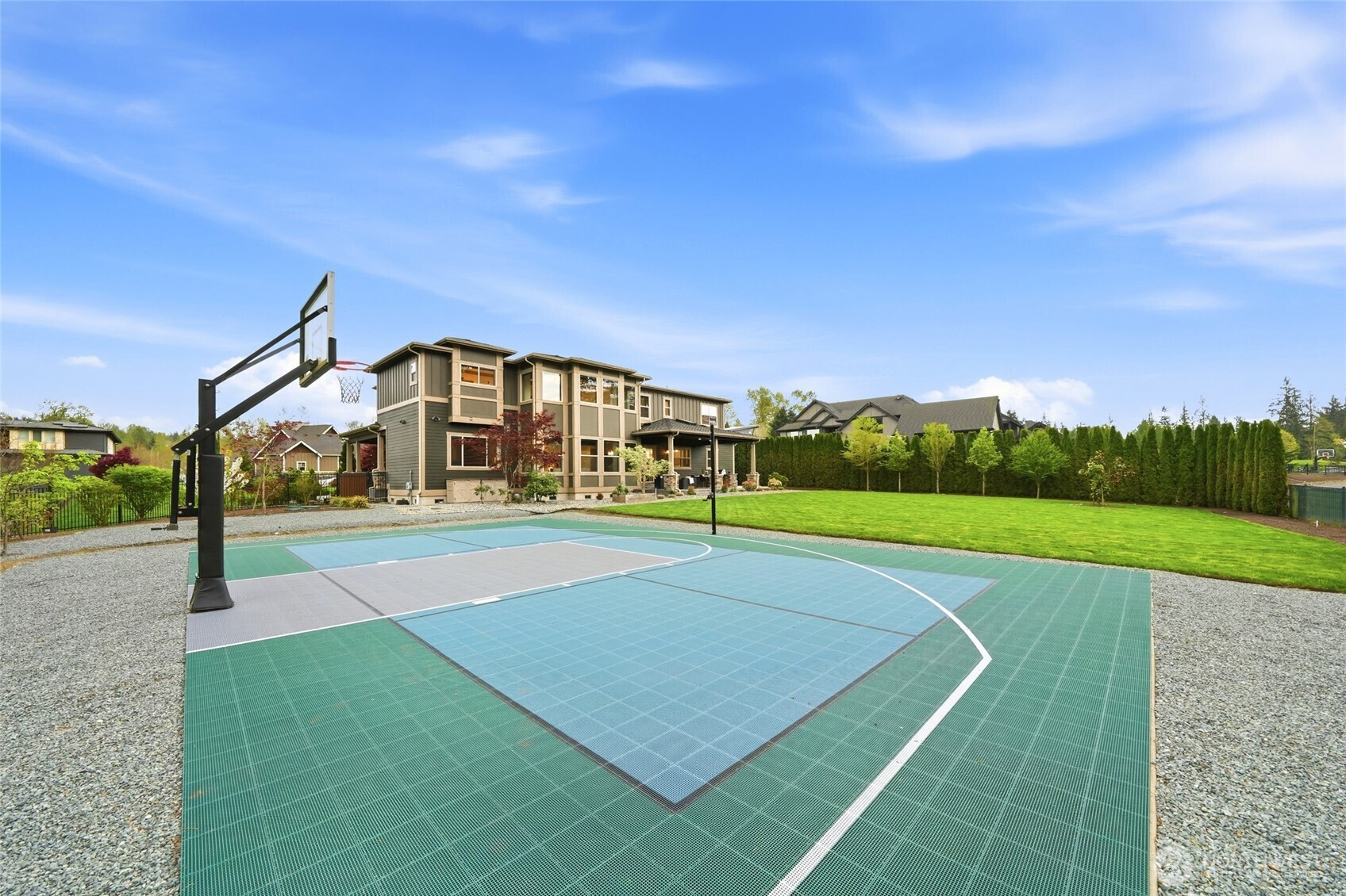 Refined luxury living in the gated community of The Arbors at Echo Falls. This custom home blends elevated design with relaxed livable elegance on a cul-de-sac. A covered front porch opens to a dramatic cathedral entry, where rich hickory hardwood floors set the tone. Main level features a formal sitting area, an elegant dining room, flowing into the great room with two-story ceilings, walls of windows, and a floor-to-ceiling stone fireplace. Main-floor office/guest suite and full bath adds flexibility. The chef’s kitchen is appointed with a Calacatta quartz island/countertops, white shaker cabinetry, and professional grade appliances including Sub-Zero(Style)fridge, an 8-burner range, prep sink, and generous pantry. Casual dining area opens through NanaWall doors to outdoor living spaces, creating seamless indoor-outdoor flow. A secondary office or fitness space off the kitchen provides versatility. Upstairs, the primary suite offers a spa-inspired bath with soaking tub, walk-in shower, and dual walk-in closets. Three additional bedrooms, two en-suites, a spacious bonus/media room with wet bar/mini kitchen perfect for home theater, plus an oversized laundry room. Designed for entertaining, the outdoor living area is a standout with a covered patio, built-in BBQ kitchen, stamped concrete, and landscaped backyard with a 30x50 multi-sport court for basketball, pickleball, and more. Walking distance to Echo Falls Golf Course and minutes to wineries, dining, and the Eastside.