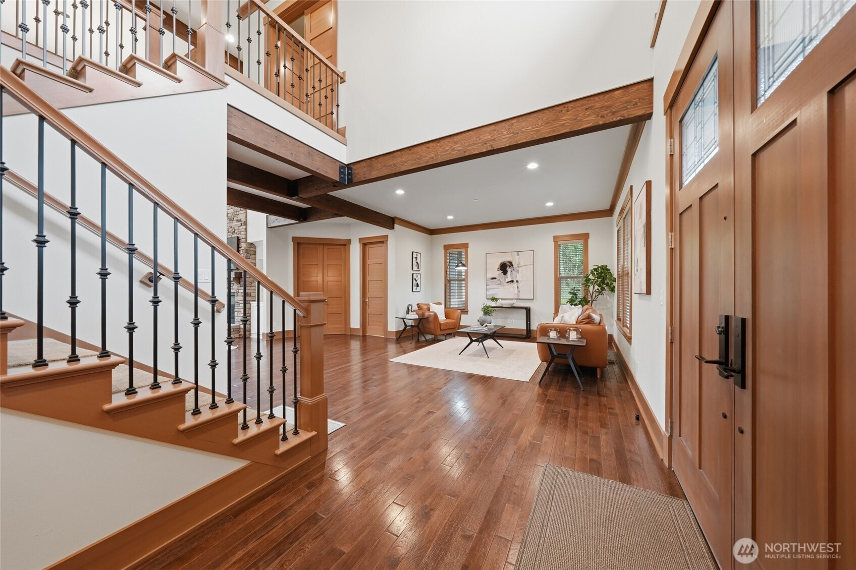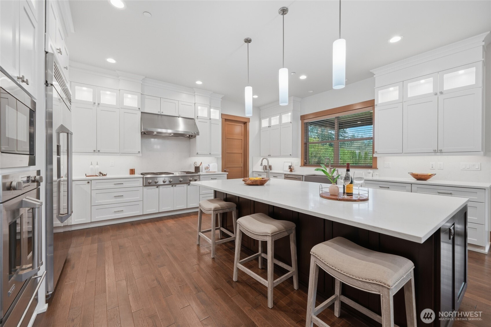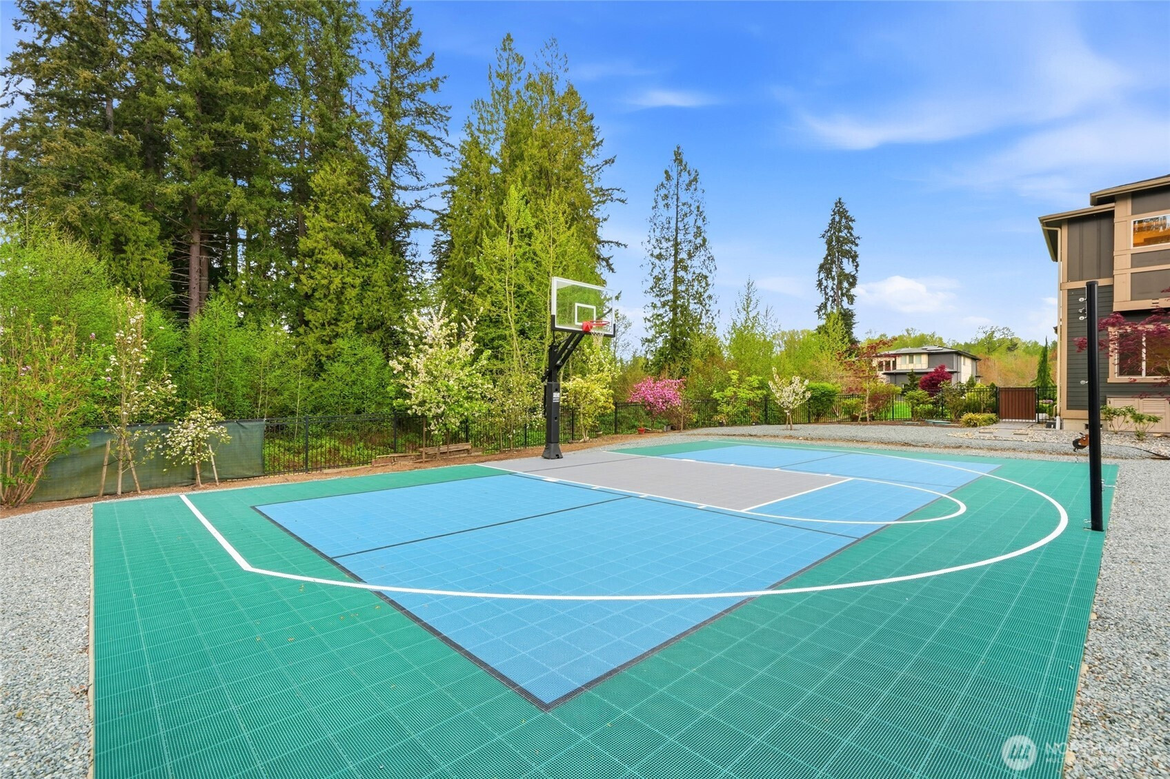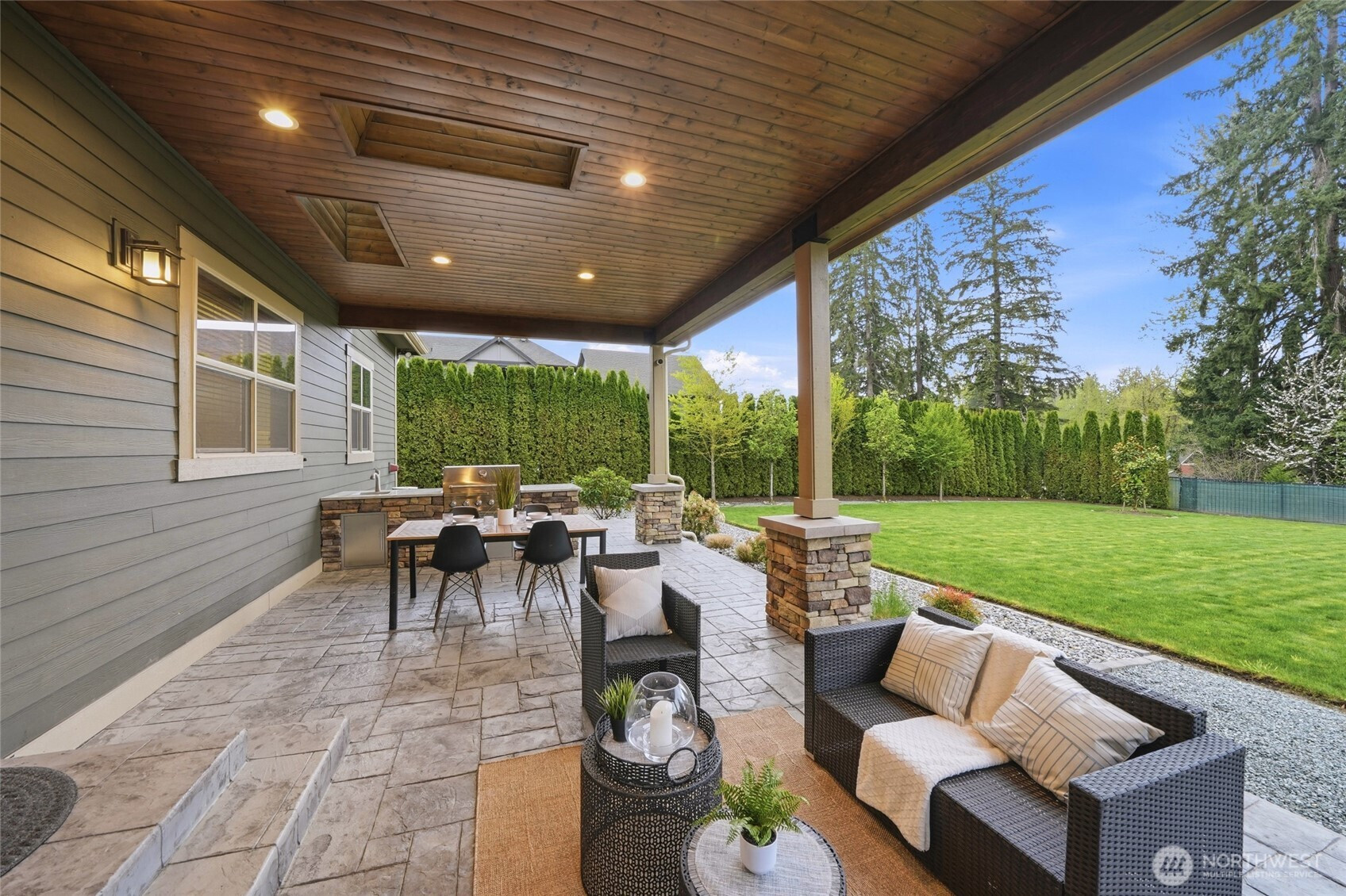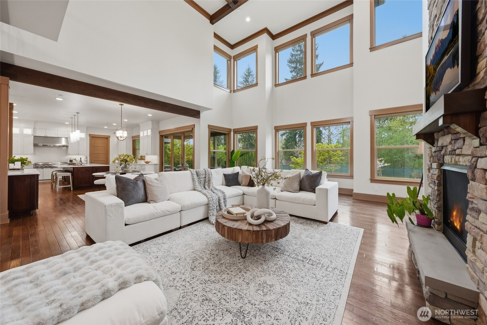 Refined luxury living in the gated community of The Arbors at Echo Falls. This custom home blends elevated design with relaxed livable elegance on a cul-de-sac. A covered front porch opens to a dramatic cathedral entry, where rich hickory hardwood floors set the tone. Main level features a formal sitting area, an elegant dining room, flowing into the great room with two-story ceilings, walls of windows, and a floor-to-ceiling stone fireplace. Main-floor office/guest suite and full bath adds flexibility. The chef’s kitchen is appointed with a Calacatta quartz island/countertops, white shaker cabinetry, and professional grade appliances including Sub-Zero(Style)fridge, an 8-burner range, prep sink, and generous pantry. Casual dining area opens through NanaWall doors to outdoor living spaces, creating seamless indoor-outdoor flow. A secondary office or fitness space off the kitchen provides versatility. Upstairs, the primary suite offers a spa-inspired bath with soaking tub, walk-in shower, and dual walk-in closets. Three additional bedrooms, two en-suites, a spacious bonus/media room with wet bar/mini kitchen perfect for home theater, plus an oversized laundry room. Designed for entertaining, the outdoor living area is a standout with a covered patio, built-in BBQ kitchen, stamped concrete, and landscaped backyard with a 30x50 multi-sport court for basketball, pickleball, and more. Walking distance to Echo Falls Golf Course and minutes to wineries, dining, and the Eastside.