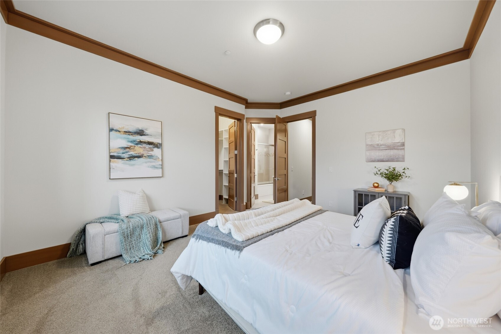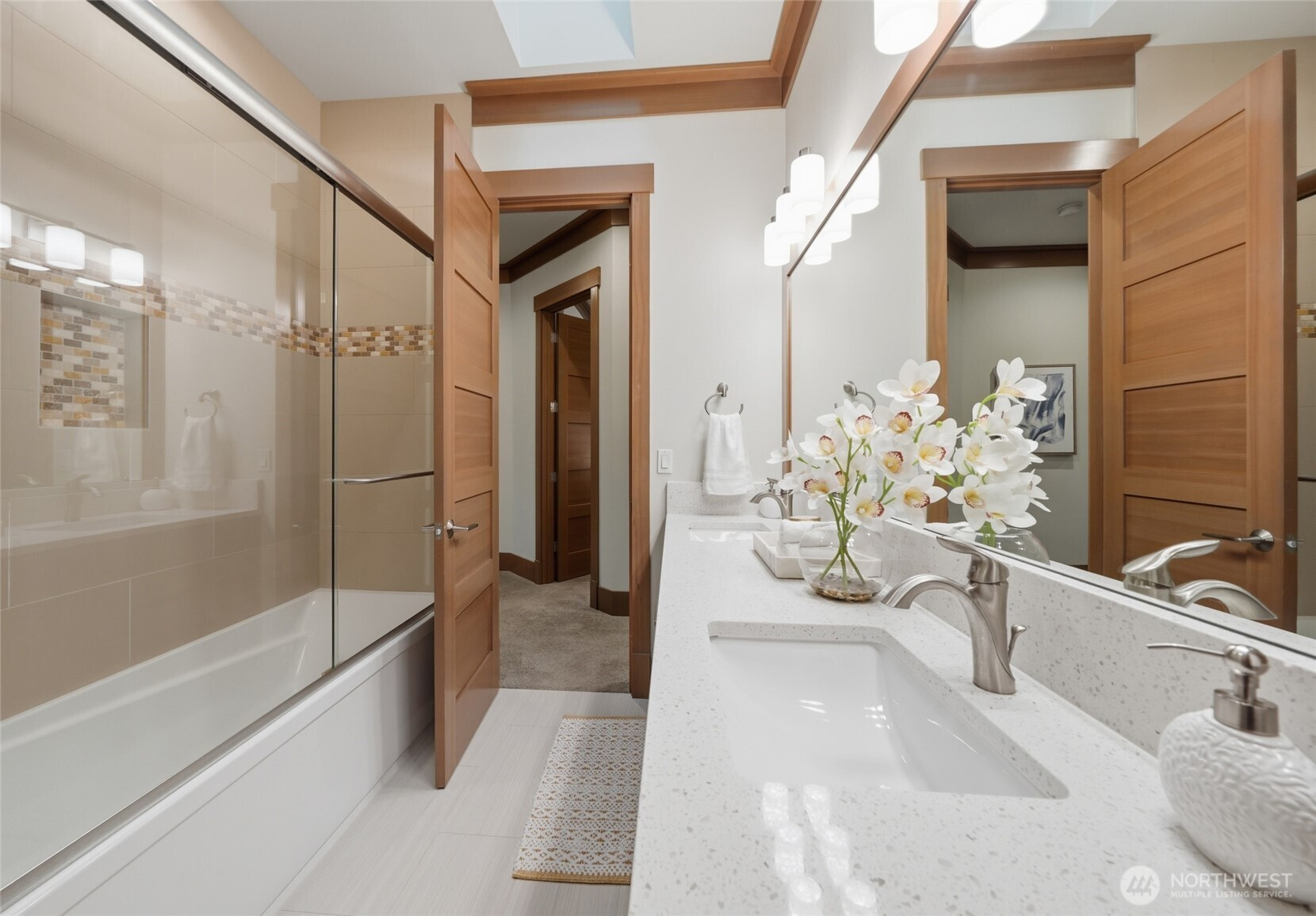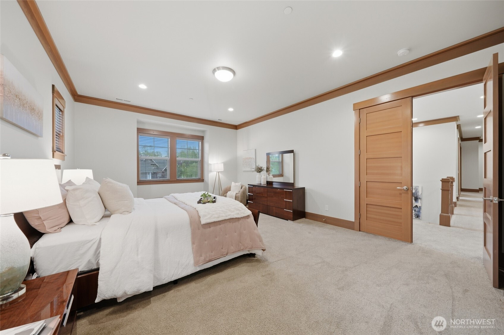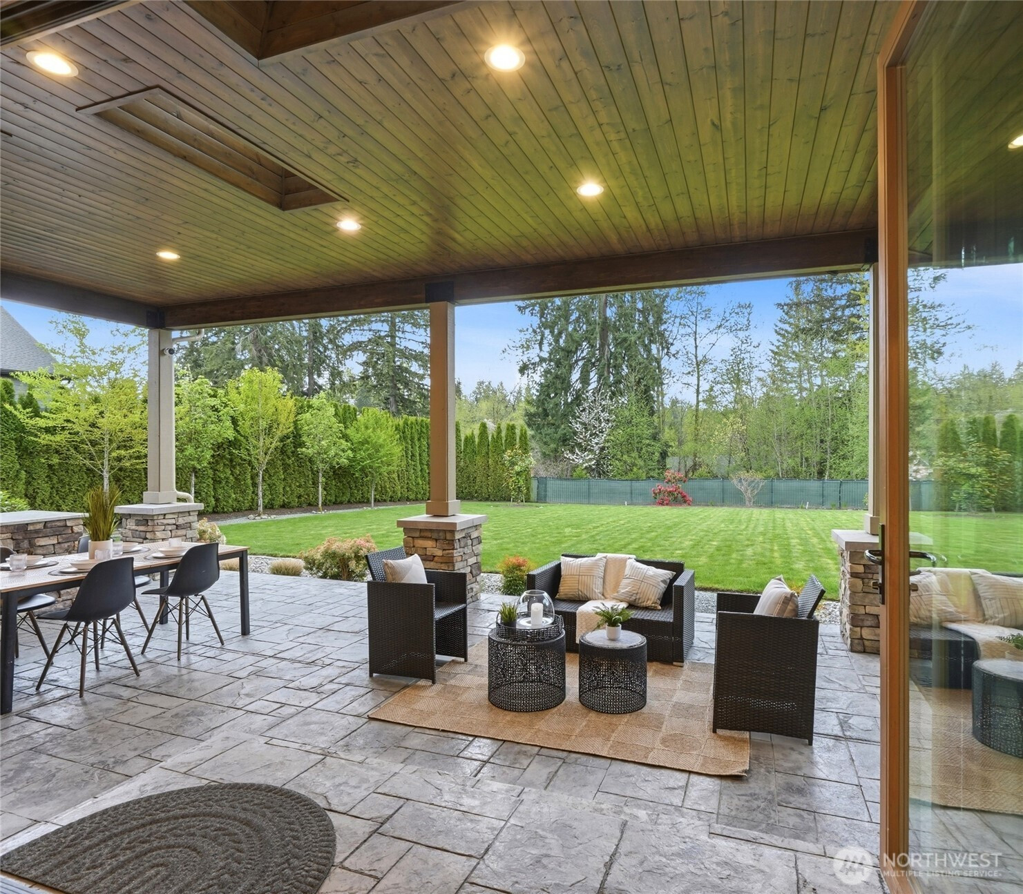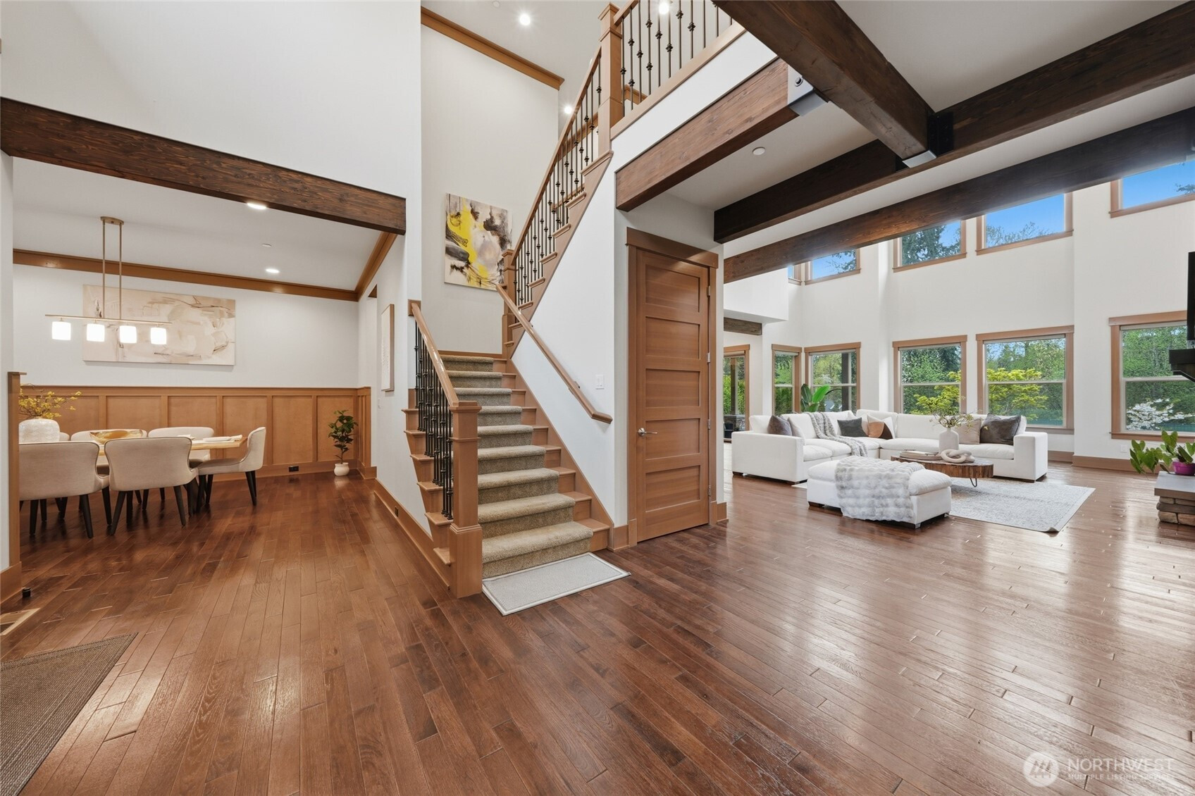 Refined luxury living in the gated community of The Arbors at Echo Falls. This custom home blends elevated design with relaxed livable elegance on a cul-de-sac. A covered front porch opens to a dramatic cathedral entry, where rich hickory hardwood floors set the tone. Main level features a formal sitting area, an elegant dining room, flowing into the great room with two-story ceilings, walls of windows, and a floor-to-ceiling stone fireplace. Main-floor office/guest suite and full bath adds flexibility. The chef’s kitchen is appointed with a Calacatta quartz island/countertops, white shaker cabinetry, and professional grade appliances including Sub-Zero(Style)fridge, an 8-burner range, prep sink, and generous pantry. Casual dining area opens through NanaWall doors to outdoor living spaces, creating seamless indoor-outdoor flow. A secondary office or fitness space off the kitchen provides versatility. Upstairs, the primary suite offers a spa-inspired bath with soaking tub, walk-in shower, and dual walk-in closets. Three additional bedrooms, two en-suites, a spacious bonus/media room with wet bar/mini kitchen perfect for home theater, plus an oversized laundry room. Designed for entertaining, the outdoor living area is a standout with a covered patio, built-in BBQ kitchen, stamped concrete, and landscaped backyard with a 30x50 multi-sport court for basketball, pickleball, and more. Walking distance to Echo Falls Golf Course and minutes to wineries, dining, and the Eastside.