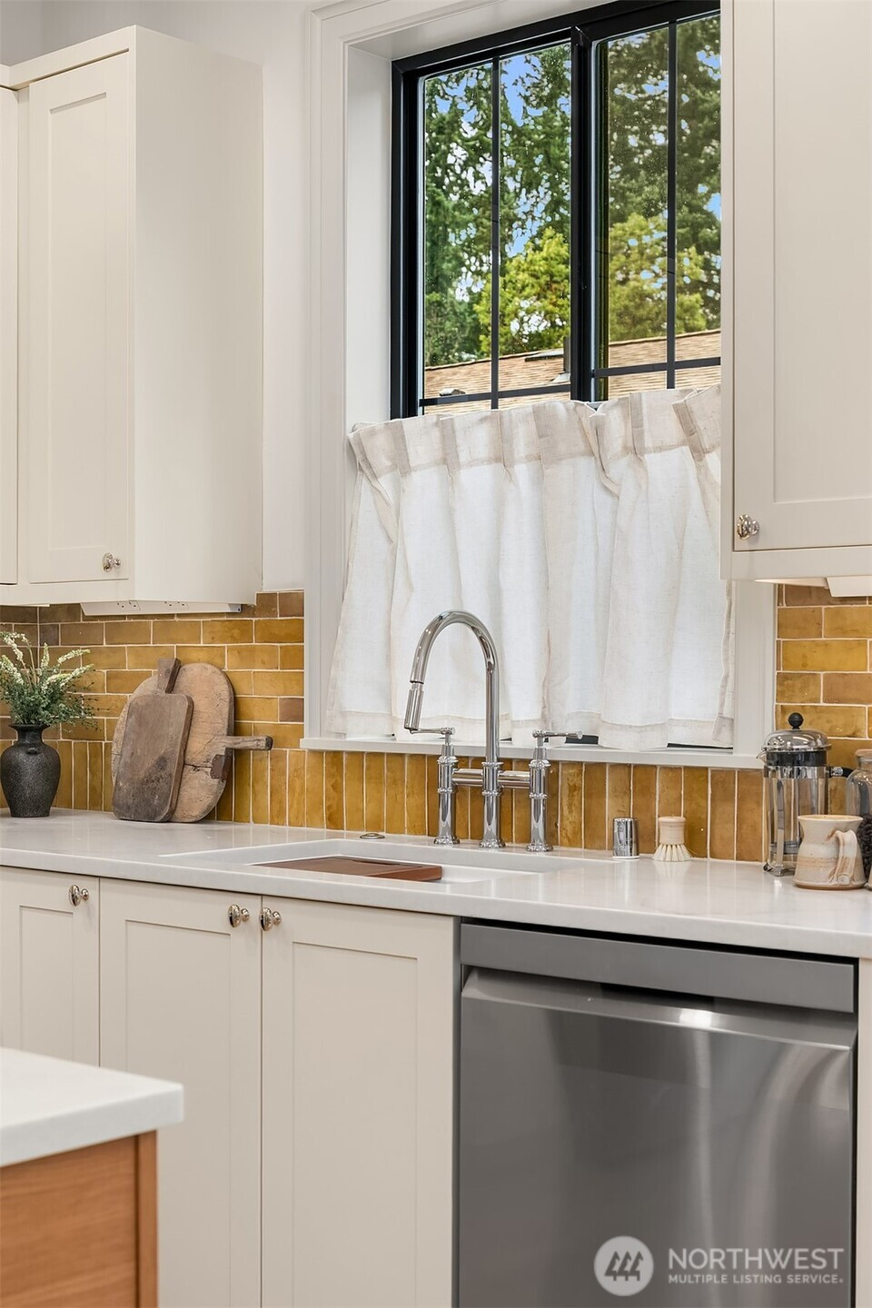 Artisan luxury defines this 2-bed + den Edmonds new-construction built by local Westerly. Old-world charm woven throughout. Open floor plan with arch that gently defines living area from kitchen and dining. Statement kitchen with ochre Zellige tile backsplash, prep island, stainless-steel appliances, quality Bellmont cabinetry, and huge walk-in pantry. Designer touches from living hardware that develops patina over time to upscale lighting. Inviting dining space with custom built-in banquette: furniture-style details and French ticking cushions. Upstairs the primary suite and 2nd bed feature vaulted ceilings. Primary bath and hallway bath blends vintage details with new. Roomy den/office could double as nursery. Built-in bookcase with hidden water heater. Oversized windows and wide-plank oak hardwoods. Golden Age design meets modern livability with too many features to list: mini-split heat pumps, mudroom nook, iron-detailed staircase, fully-fenced turf backyard with Trex deck, heated 1-car garage with space for gym and storage