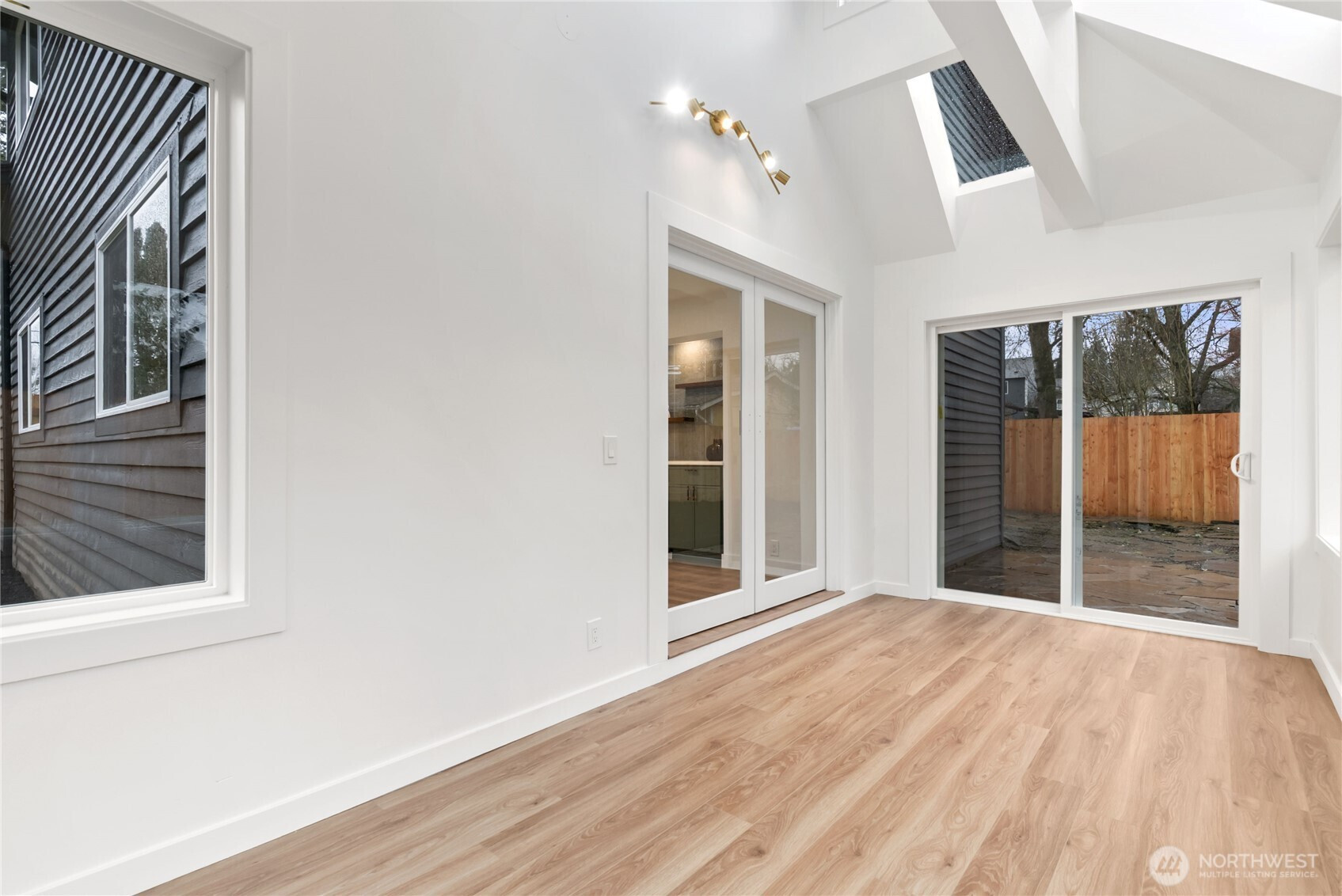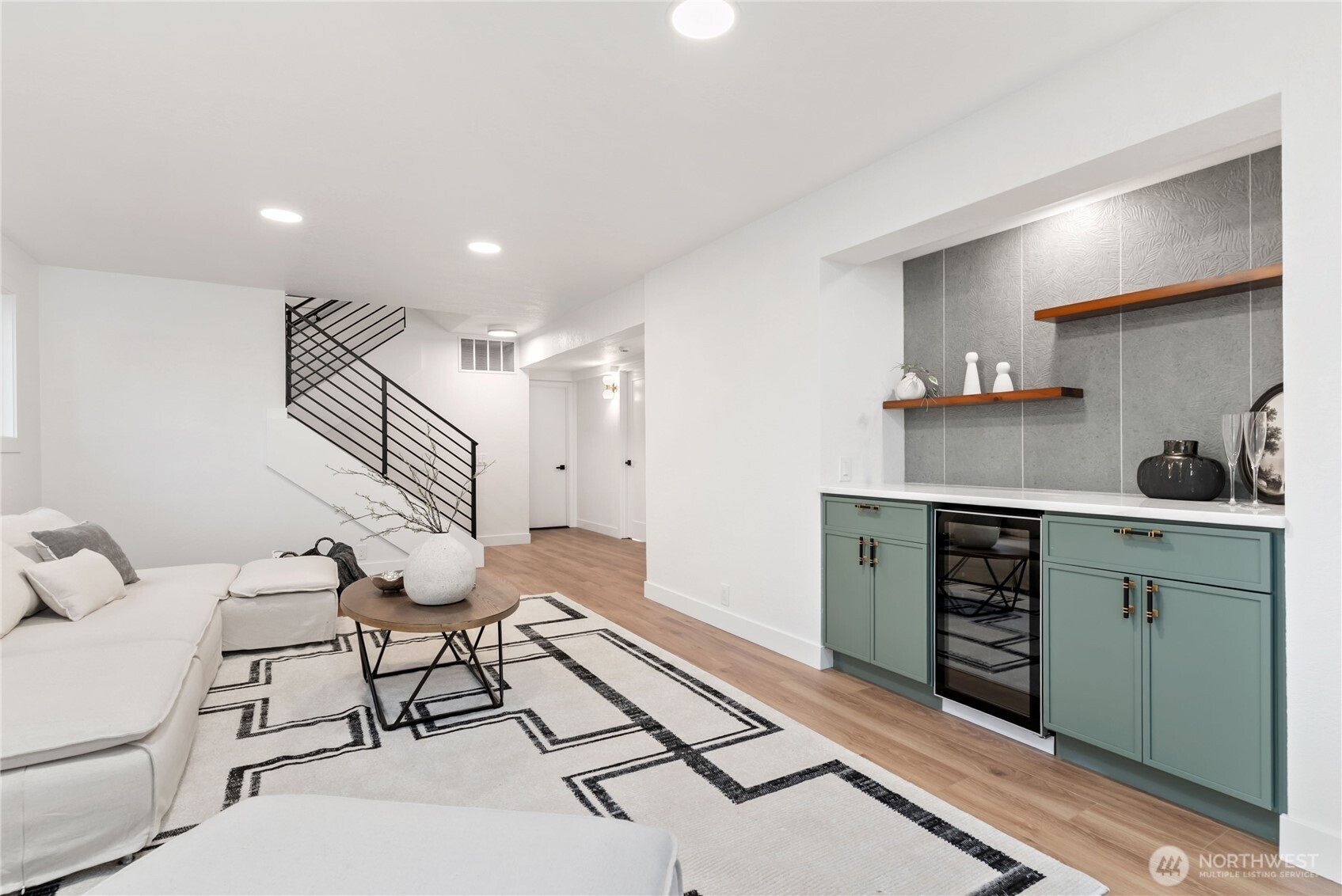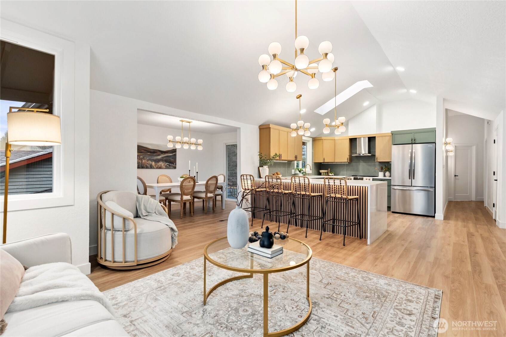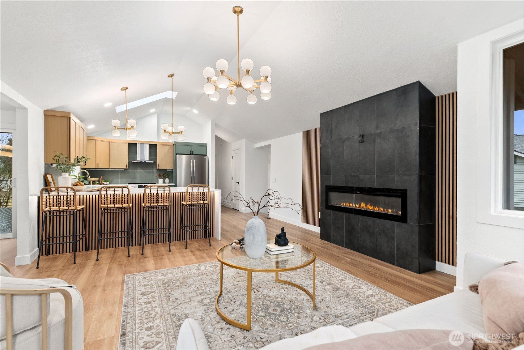 Absolutely stunning luxury residence in the heart of Lynnwood, designed to impress with elevated finishes and sophisticated modern style. A dramatic illuminated entry with custom wrought iron railing and cedar-accented covered porch sets the tone for the elegance within. The light-filled interior showcases soaring vaulted ceilings, curated designer lighting, and a seamless open-concept layout ideal for upscale living and entertaining. The chef’s kitchen is a showpiece, featuring sleek quartz countertops, a statement waterfall peninsula, two-tone custom cabinetry, and premium stainless steel appliances—blending beauty and function. The refined living room centers around a contemporary electric fireplace with custom accent wall, flowing effortlessly into the formal dining space and expansive Trex deck with designer railing, creating the perfect indoor-outdoor experience. Upstairs, the luxurious primary suite offers vaulted ceilings, skylight, and spa-inspired bath with custom shower and floating vanity. Additional bedrooms and a beautifully appointed bath with floating vanity and elegant finishes provide comfort and style.The lower level features a sophisticated media/family room with custom bar and beverage cooler, flexible bonus space, guest bedroom, full bath, and oversized laundry. Fully fenced yard. Minutes from Alderwood Mall, premier dining, and major tech commuter routes, this exceptional home delivers the lifestyle today’s luxury buyer demands. Must See TODAY!