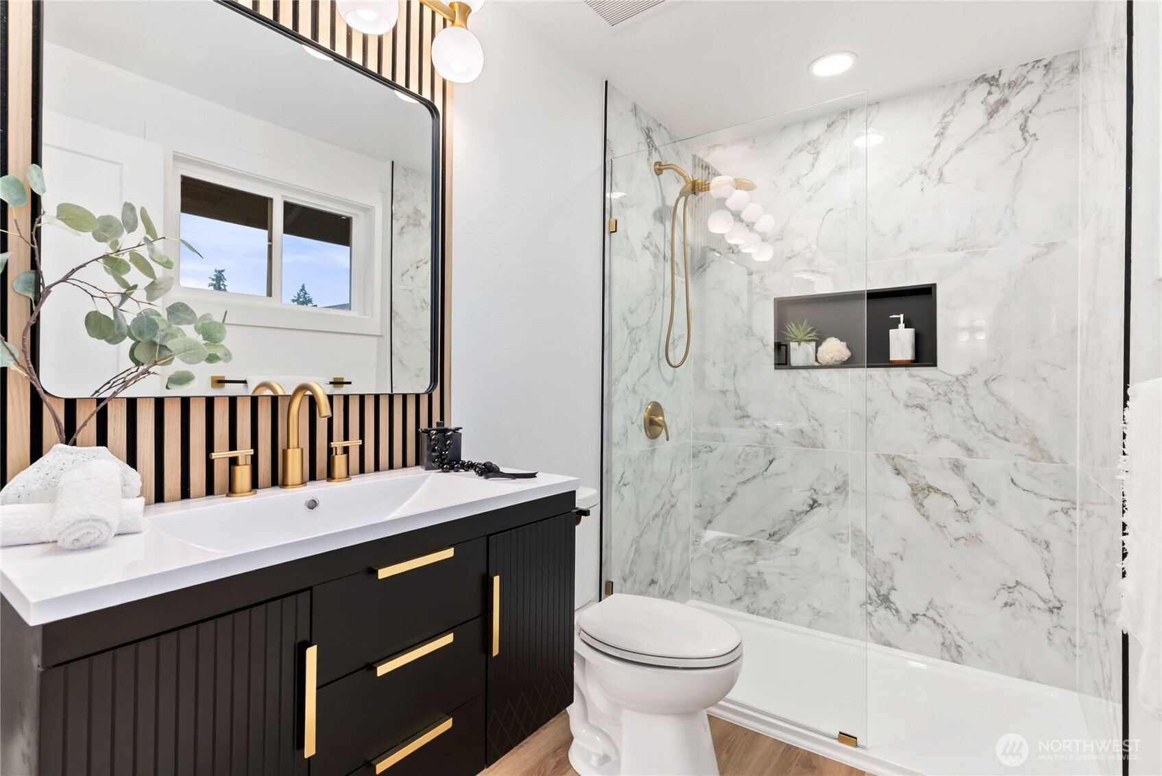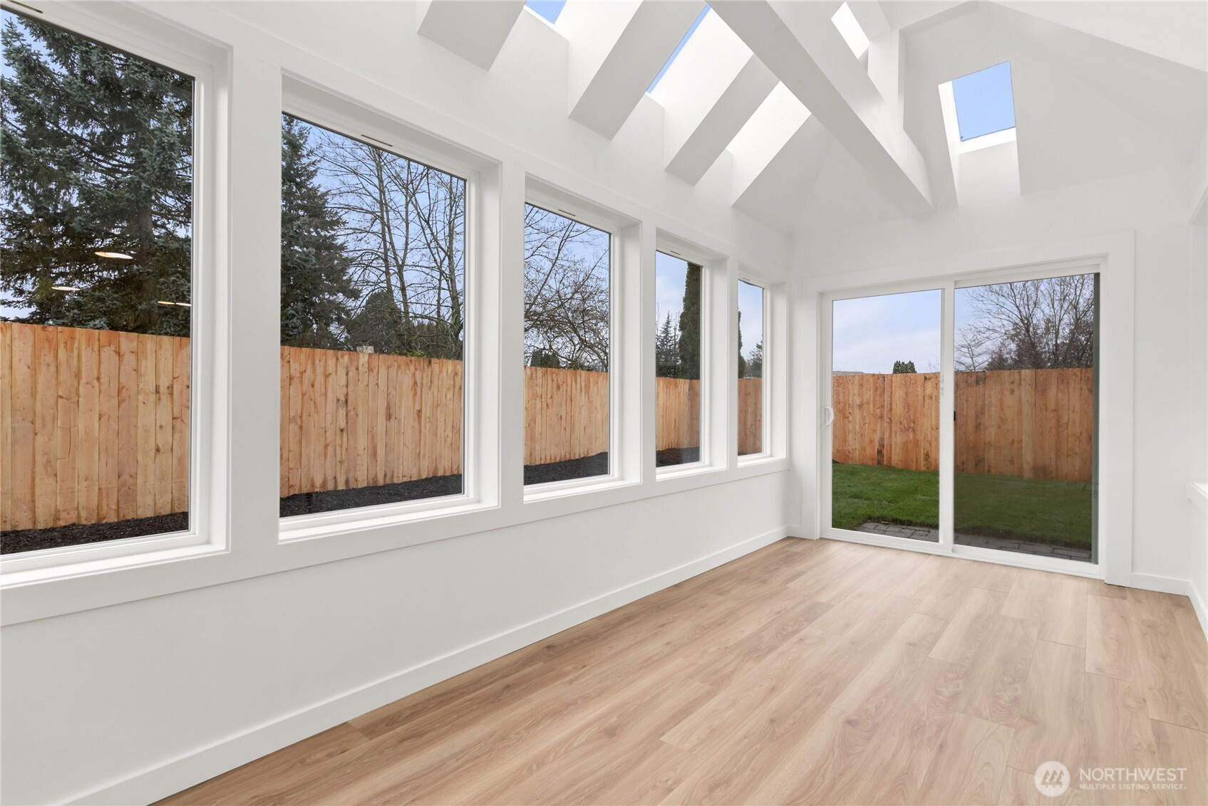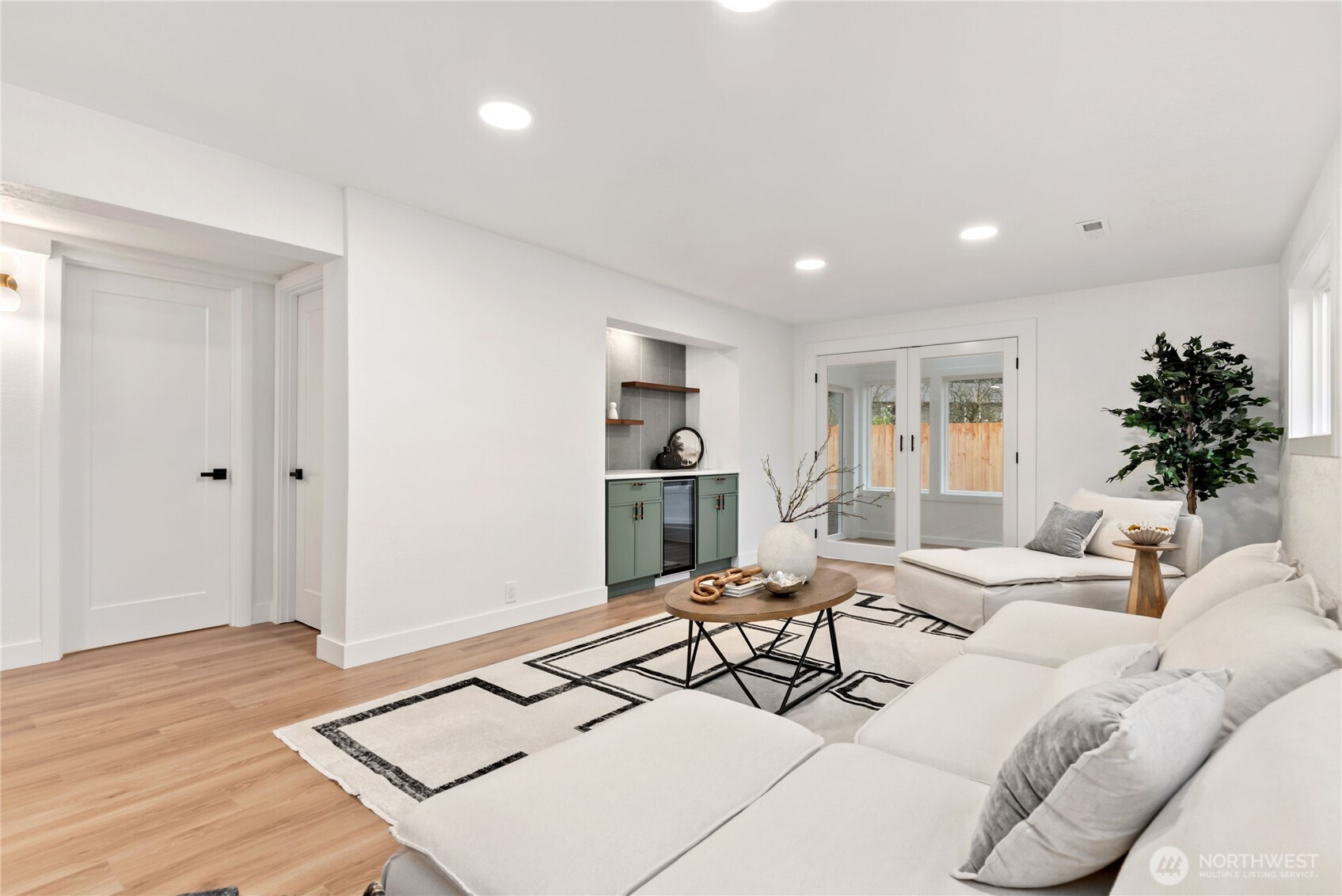 Absolutely stunning luxury residence in the heart of Lynnwood, designed to impress with elevated finishes and sophisticated modern style. A dramatic illuminated entry with custom wrought iron railing and cedar-accented covered porch sets the tone for the elegance within. The light-filled interior showcases soaring vaulted ceilings, curated designer lighting, and a seamless open-concept layout ideal for upscale living and entertaining. The chef’s kitchen is a showpiece, featuring sleek quartz countertops, a statement waterfall peninsula, two-tone custom cabinetry, and premium stainless steel appliances—blending beauty and function. The refined living room centers around a contemporary electric fireplace with custom accent wall, flowing effortlessly into the formal dining space and expansive Trex deck with designer railing, creating the perfect indoor-outdoor experience. Upstairs, the luxurious primary suite offers vaulted ceilings, skylight, and spa-inspired bath with custom shower and floating vanity. Additional bedrooms and a beautifully appointed bath with floating vanity and elegant finishes provide comfort and style.The lower level features a sophisticated media/family room with custom bar and beverage cooler, flexible bonus space, guest bedroom, full bath, and oversized laundry. Fully fenced yard. Minutes from Alderwood Mall, premier dining, and major tech commuter routes, this exceptional home delivers the lifestyle today’s luxury buyer demands. Must See TODAY!