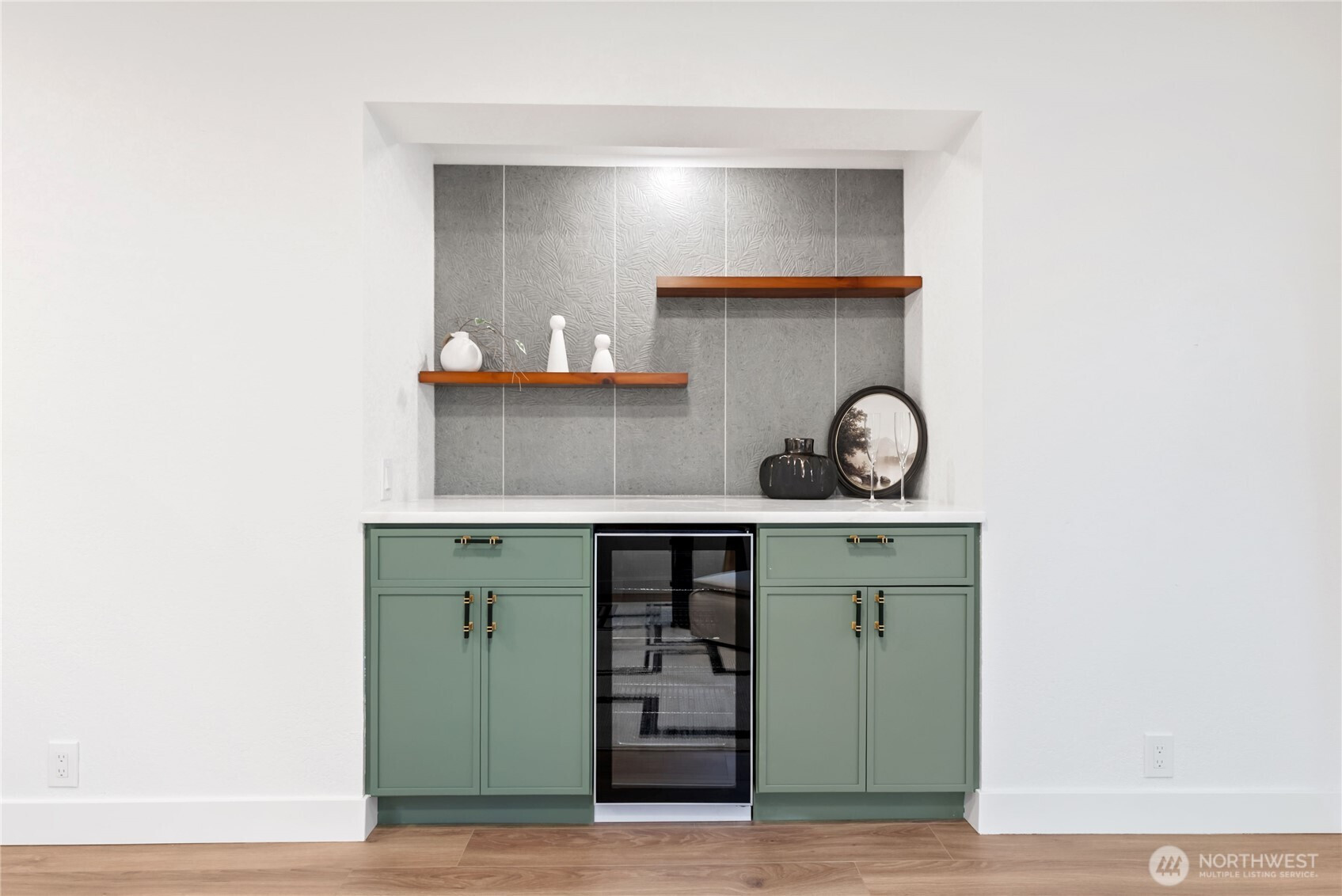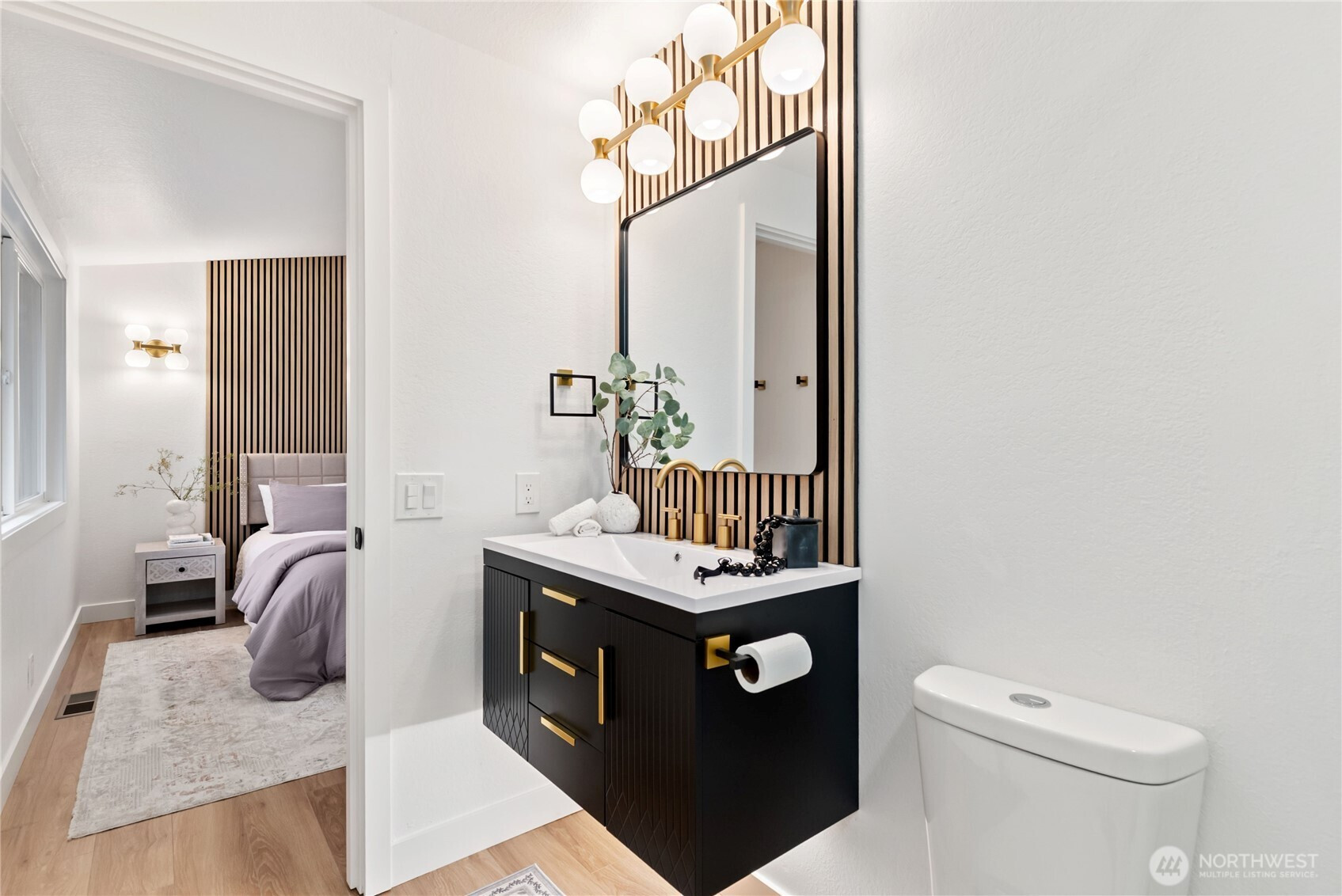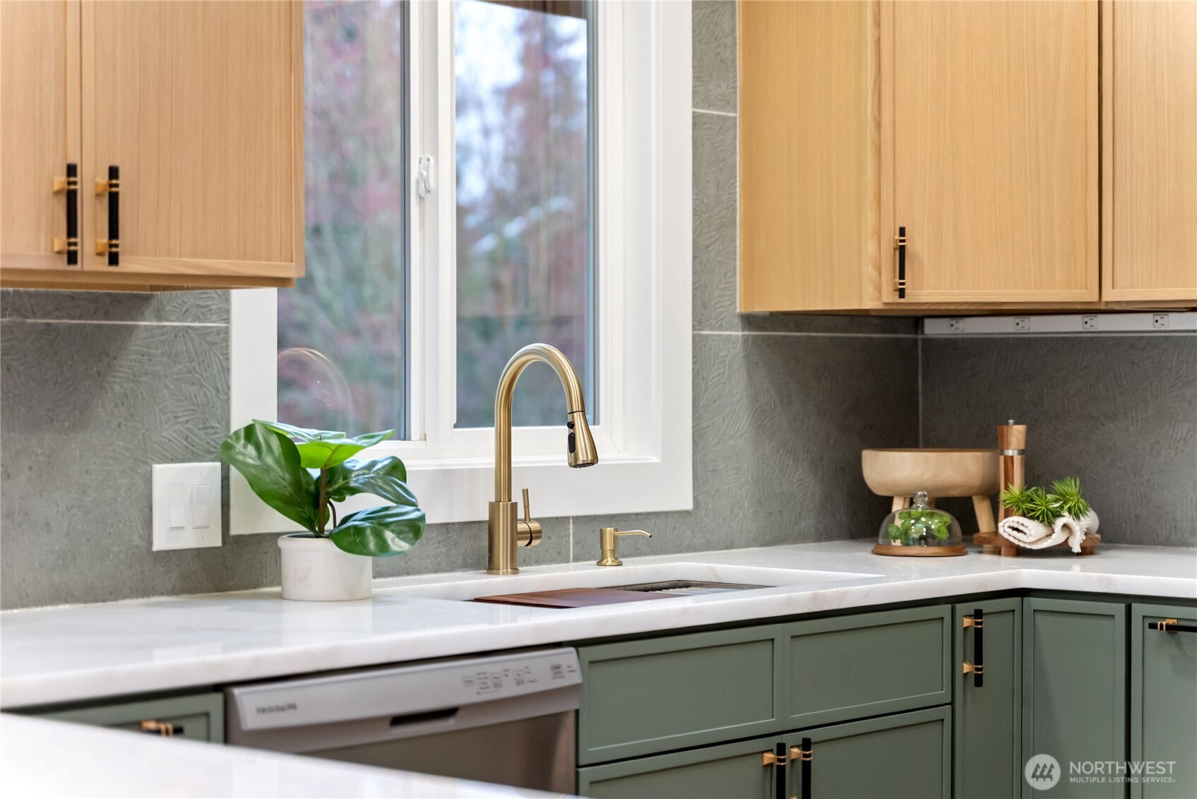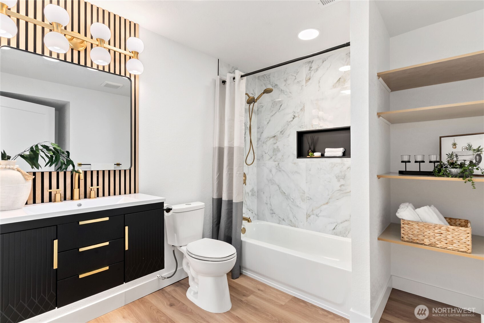 Absolutely stunning luxury residence in the heart of Lynnwood, designed to impress with elevated finishes and sophisticated modern style. A dramatic illuminated entry with custom wrought iron railing and cedar-accented covered porch sets the tone for the elegance within. The light-filled interior showcases soaring vaulted ceilings, curated designer lighting, and a seamless open-concept layout ideal for upscale living and entertaining. The chef’s kitchen is a showpiece, featuring sleek quartz countertops, a statement waterfall peninsula, two-tone custom cabinetry, and premium stainless steel appliances—blending beauty and function. The refined living room centers around a contemporary electric fireplace with custom accent wall, flowing effortlessly into the formal dining space and expansive Trex deck with designer railing, creating the perfect indoor-outdoor experience. Upstairs, the luxurious primary suite offers vaulted ceilings, skylight, and spa-inspired bath with custom shower and floating vanity. Additional bedrooms and a beautifully appointed bath with floating vanity and elegant finishes provide comfort and style.The lower level features a sophisticated media/family room with custom bar and beverage cooler, flexible bonus space, guest bedroom, full bath, and oversized laundry. Fully fenced yard. Minutes from Alderwood Mall, premier dining, and major tech commuter routes, this exceptional home delivers the lifestyle today’s luxury buyer demands. Must See TODAY!