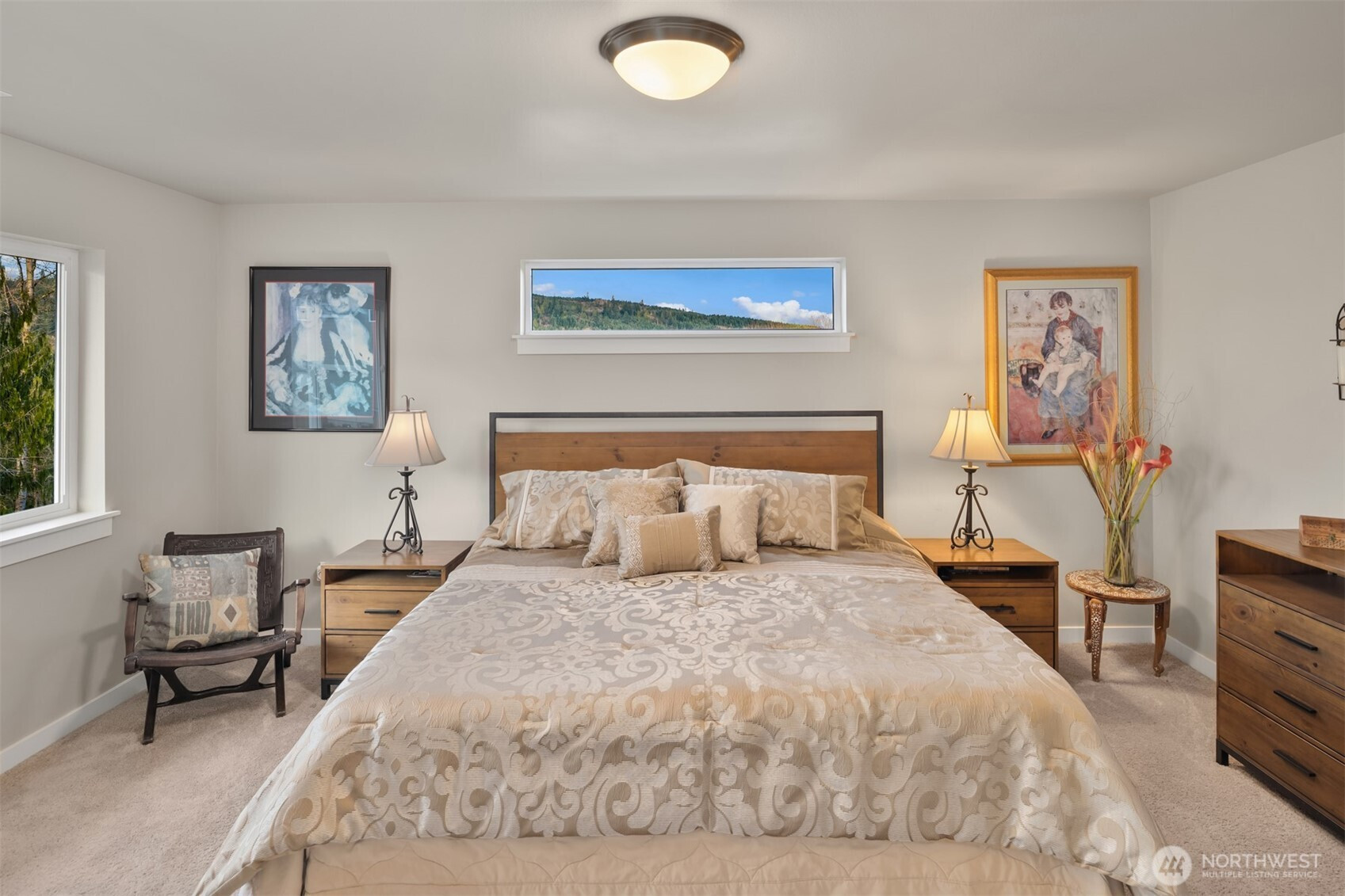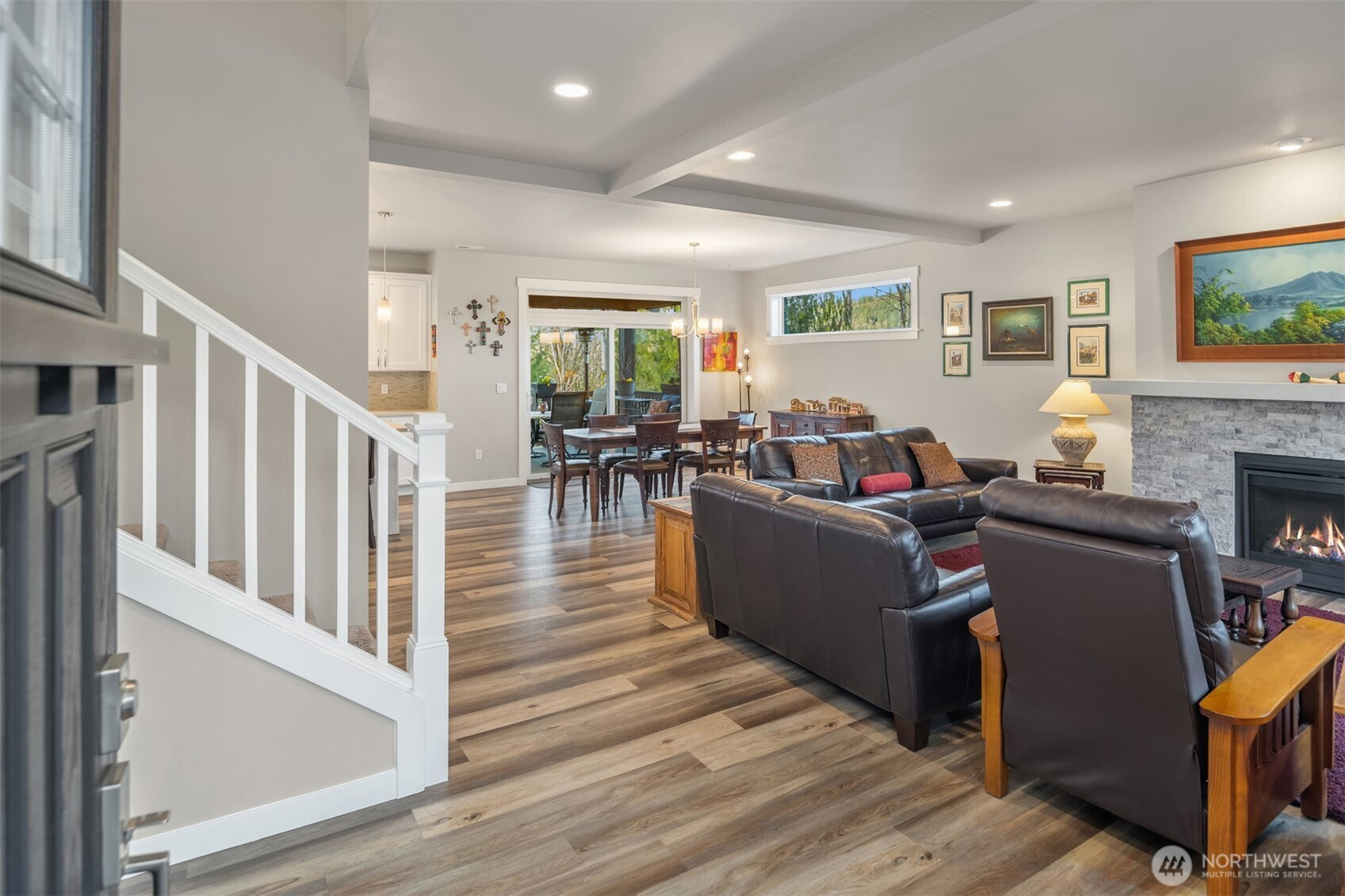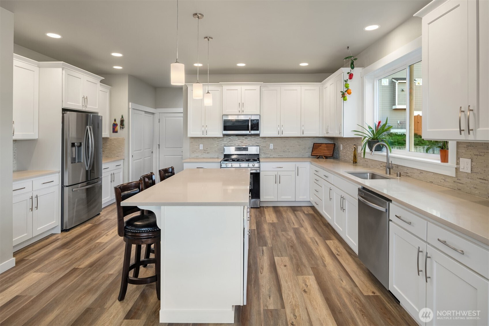 Scenically poised on a shy acre greenbelt oasis in esteemed Whisperwood Estates, this pristine 2,500sf 2020 two-story boasts stunning craftsman curb appeal with spectacular views of nearby rolling foothills & Cascade mountaintops! Dramatic open floor plan with spacious rooms, tall ceilings & oversized windows filled with abundant natural light. Foyer with open rail staircase leads to grand living room with custom textured stone gas fireplace, dining room with vaulted covered deck & elegantly appointed dream kitchen with quartz counters, full-height glass tile backsplash, center island bar & tons of storage space. French doors lead to main floor den/5th bedroom with walk-in closet. Lofted upper hall with office nook leads to double-door primary with sweeping views, walk-in closet & designer 5-piece ensuite with soaking tub & luxurious rainfall shower. Generously proportioned bedrooms + top floor laundry & hall bath with convenient dual-sink vanity. Sprawling backyard extends through the forest all the way to Woods Creek. Huge driveway & massive 3-car dream garage + extra tall crawlspace with bonus room upside potential, high-efficiency furnace with heat pump & central A/C!