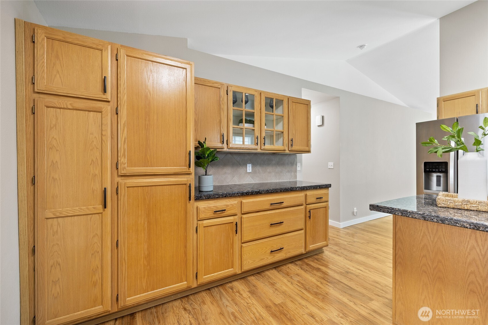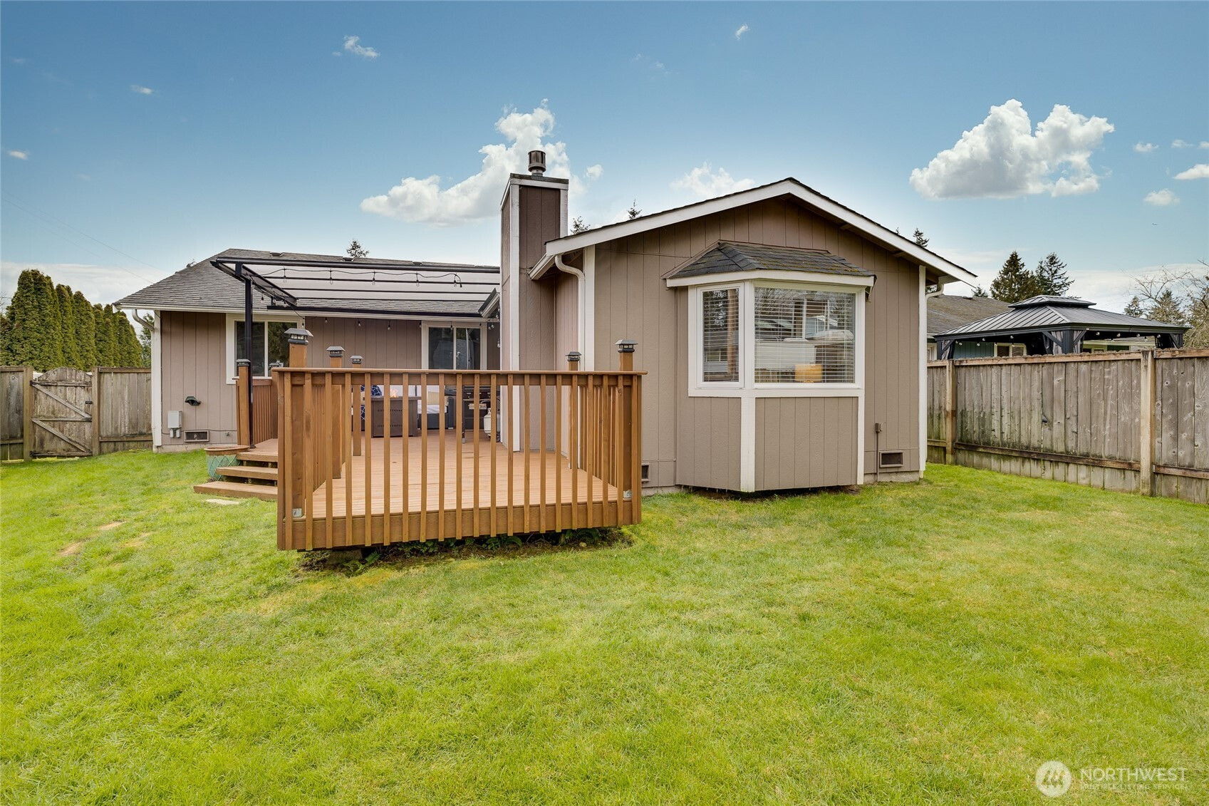 Welcome home to this beautifully updated corner-lot rambler, offering the perfect blend of modern finishes and easy single-level living. Step into a light-filled living room featuring a large bay window and soaring vaulted ceilings that create an open, airy feel. The kitchen offers abundant storage and a functional layout that makes meal prep effortless, whether you're cooking for a crowd or enjoying a quiet night in. Just off the kitchen, the spacious great room provides the perfect setting for gathering with friends, hosting a party, or simply relaxing by the cozy gas fireplace. When it’s time to entertain, head outside to the large covered deck...ideal for year-round enjoyment, summer barbecues, or peaceful mornings with coffee. The fully fenced backyard is a gardener’s delight, complete with raspberries, rhubarb, strawberries, and a charming water feature. The primary suite offers a private retreat with its own full bath, while two additional bedrooms provide flexibility for guests, a home office, or hobbies. RV parking and an attached two-car garage offer plenty of room for vehicles, storage, and recreational toys. Ideally located near shopping, schools, public transit, and freeway access, this home blends comfort, accessibility, and convenience.