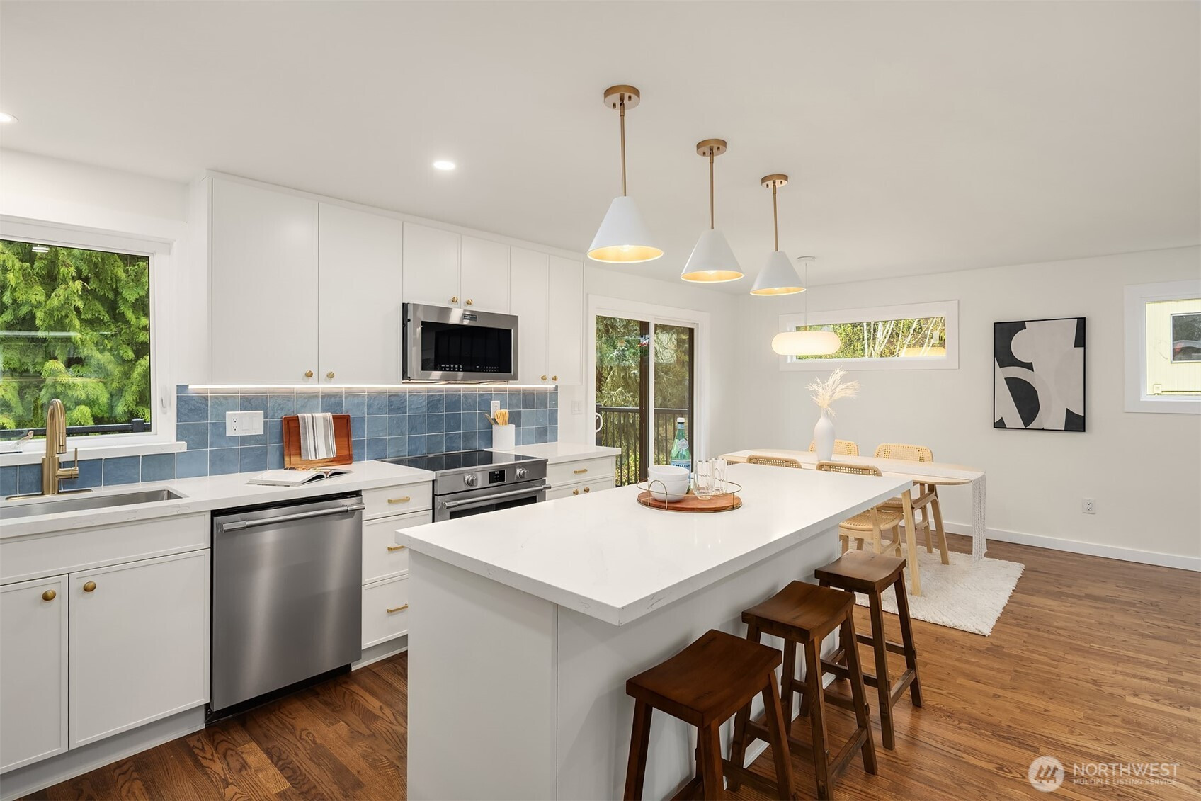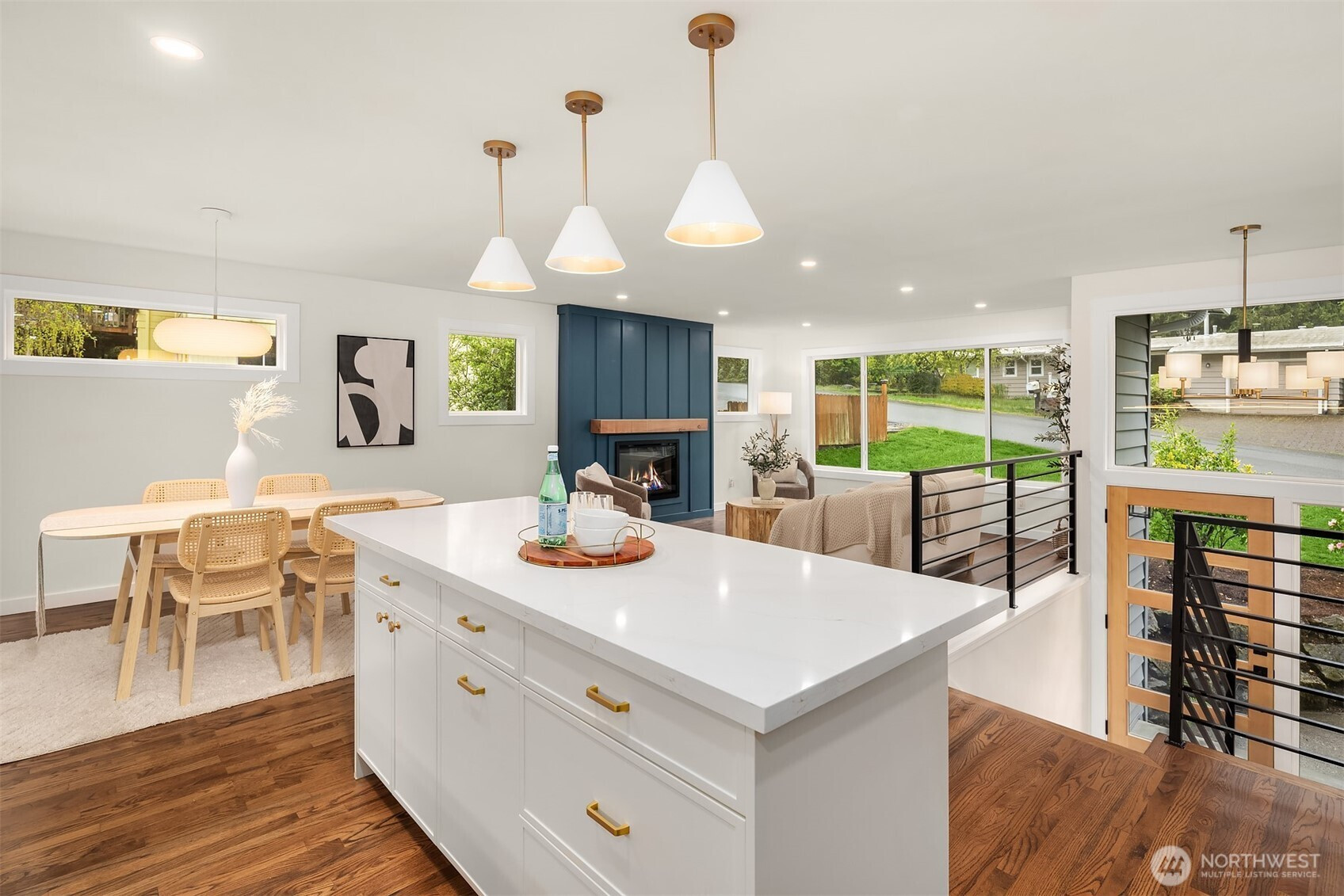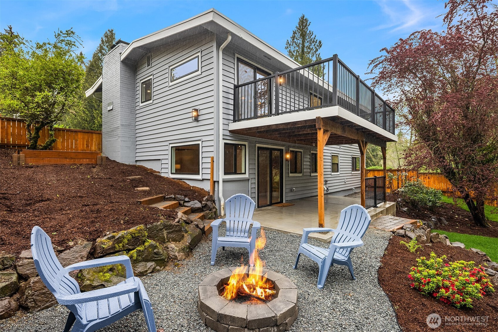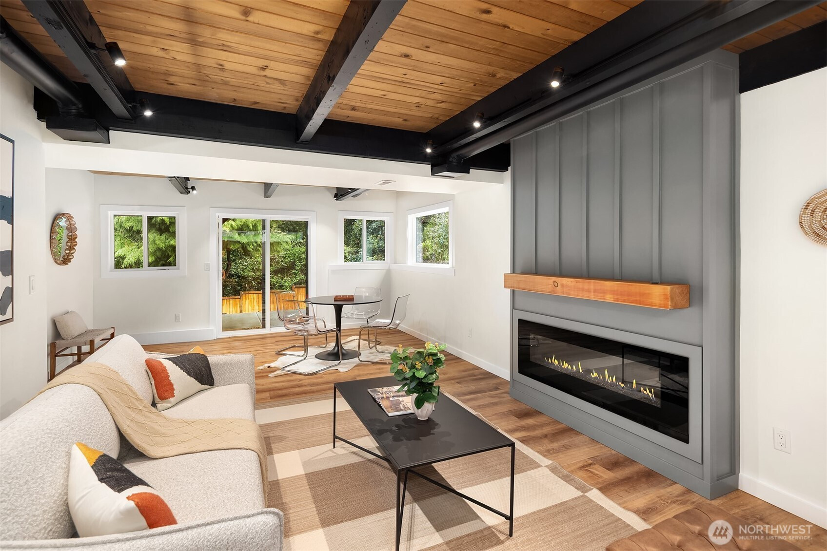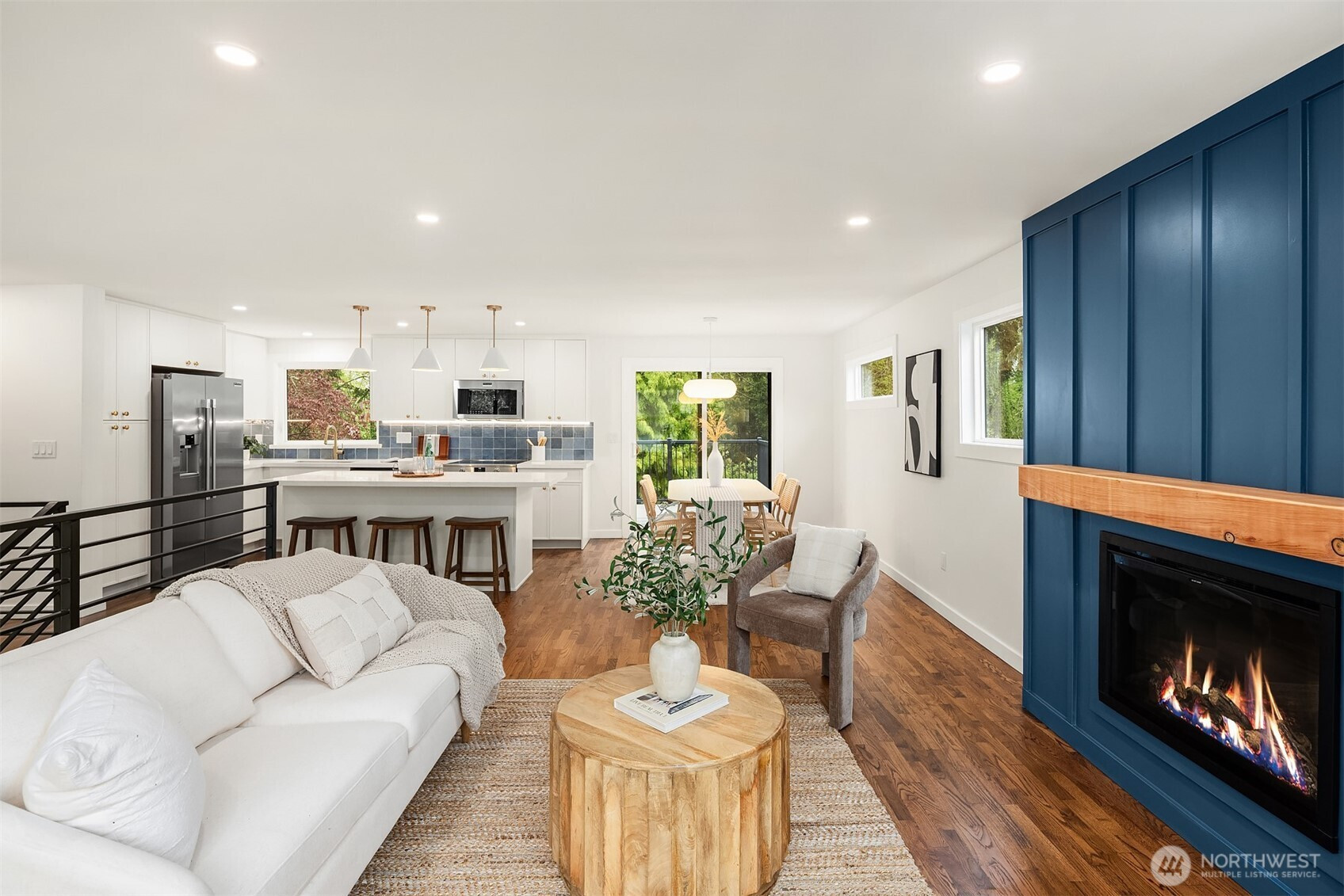 Fully renovated 3-bed, 2.5-bath split-entry in the heart of Brier — new from the roof to the floors. The updated kitchen features white cabinetry, quartz counters, stainless appliances, and a chef’s island with eating bar that opens to the dining area and upper deck for easy indoor-outdoor living. A blue-accented tile backsplash adds personality without overdoing it. The great room is the centerpiece — a wide-open, flexible space with exposed beams and wood plank ceilings that feel both cozy and spacious. Every bathroom has heated floors. The primary suite is a standout — walk-in closet, curbless shower, floor-to-ceiling tile, and a double vanity with quartz countertop. Downstairs, a second family room with its own fireplace plus a dedicated laundry room. Outside: upper deck off the kitchen, a covered concrete patio below, and a fully fenced backyard with fire pit, raised planter boxes, and lush lawn — all on a quiet cul-de-sac. New roof, new windows, new garage door, epoxy garage floors. Oversized lot with a creek along the back edge, minutes to downtown Bothell and easy access to both I-5 and 405. Quality renovation in a great neighborhood — nothing left to do but move in.