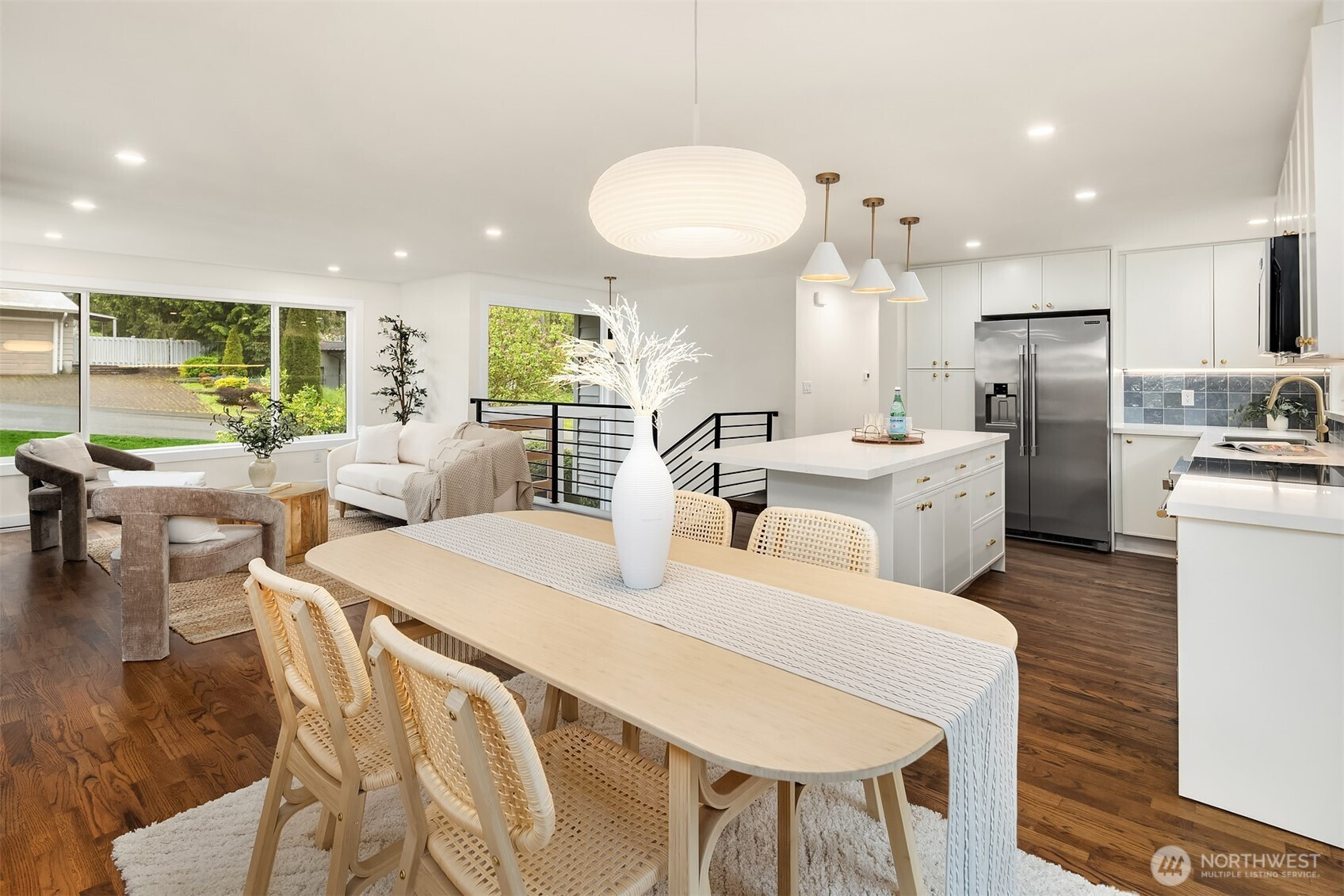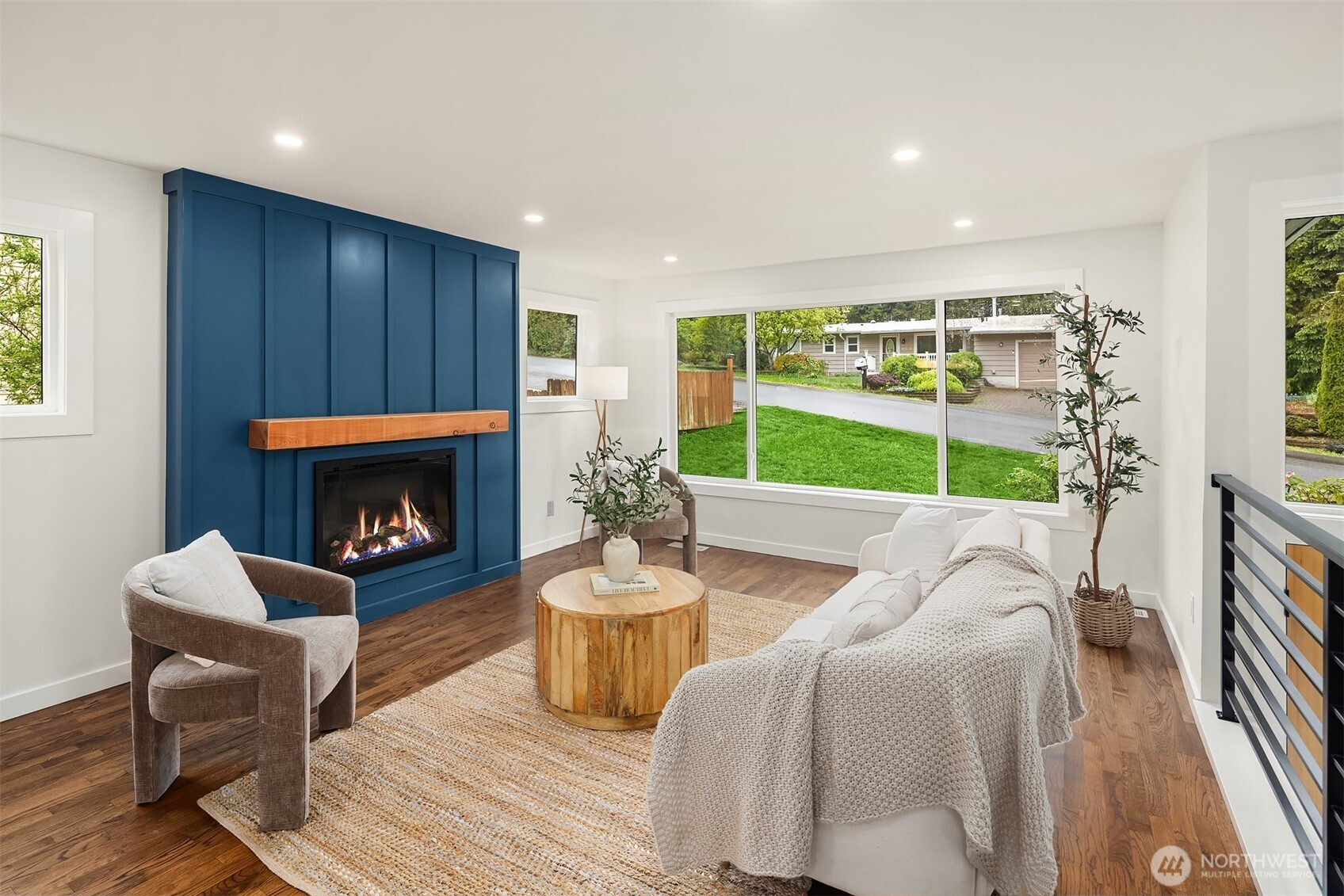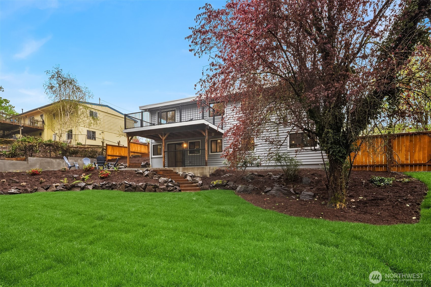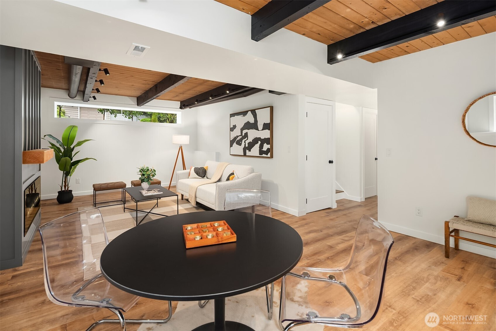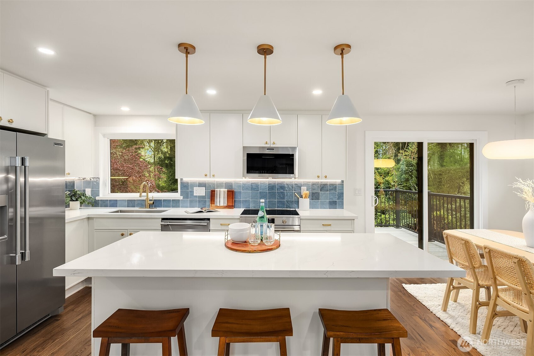 Fully renovated 3-bed, 2.5-bath split-entry in the heart of Brier — new from the roof to the floors. The updated kitchen features white cabinetry, quartz counters, stainless appliances, and a chef’s island with eating bar that opens to the dining area and upper deck for easy indoor-outdoor living. A blue-accented tile backsplash adds personality without overdoing it. The great room is the centerpiece — a wide-open, flexible space with exposed beams and wood plank ceilings that feel both cozy and spacious. Every bathroom has heated floors. The primary suite is a standout — walk-in closet, curbless shower, floor-to-ceiling tile, and a double vanity with quartz countertop. Downstairs, a second family room with its own fireplace plus a dedicated laundry room. Outside: upper deck off the kitchen, a covered concrete patio below, and a fully fenced backyard with fire pit, raised planter boxes, and lush lawn — all on a quiet cul-de-sac. New roof, new windows, new garage door, epoxy garage floors. Oversized lot with a creek along the back edge, minutes to downtown Bothell and easy access to both I-5 and 405. Quality renovation in a great neighborhood — nothing left to do but move in.