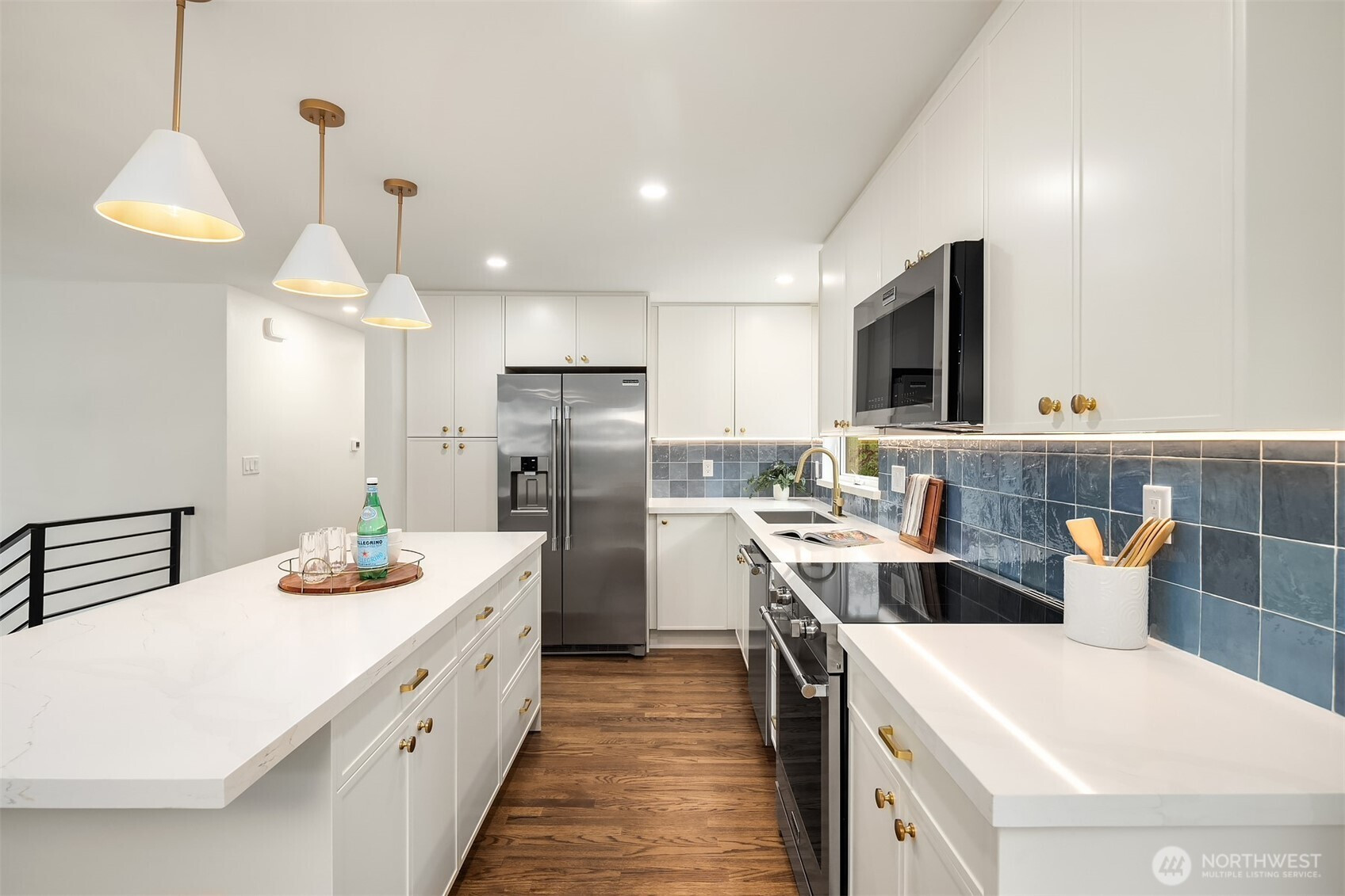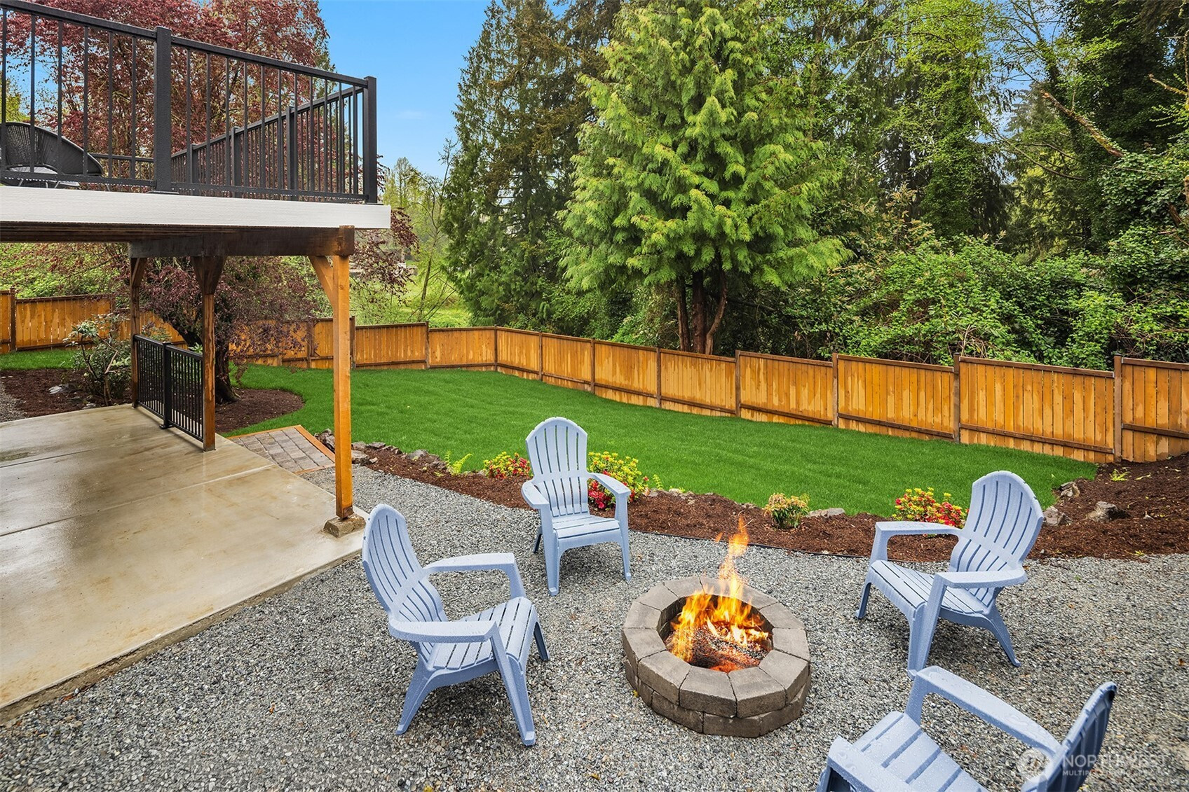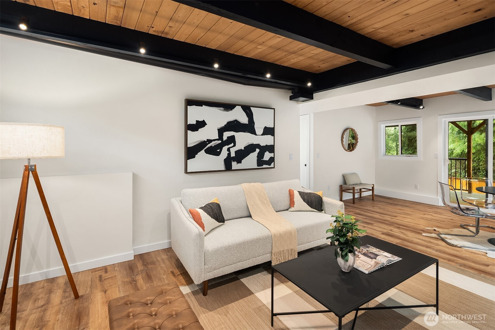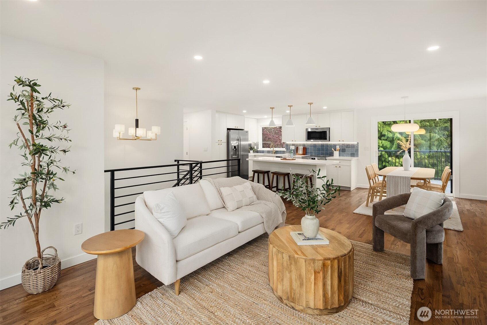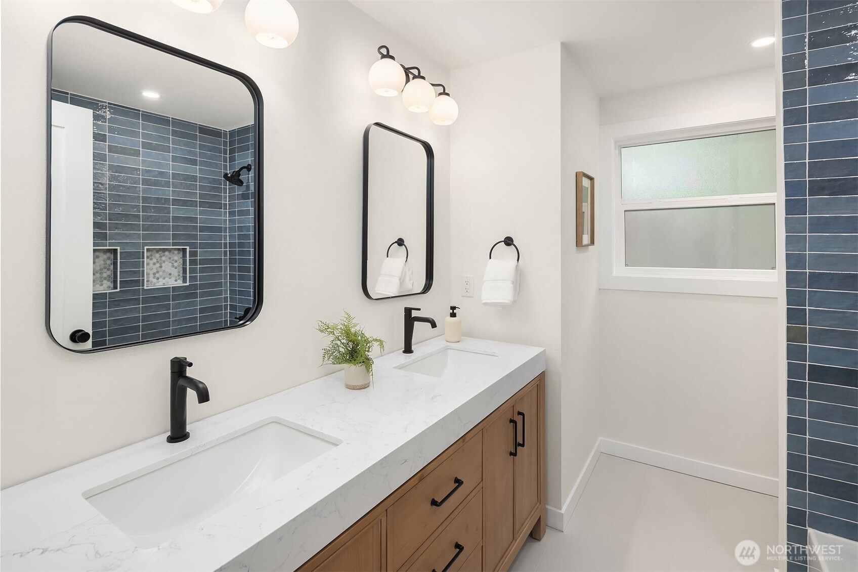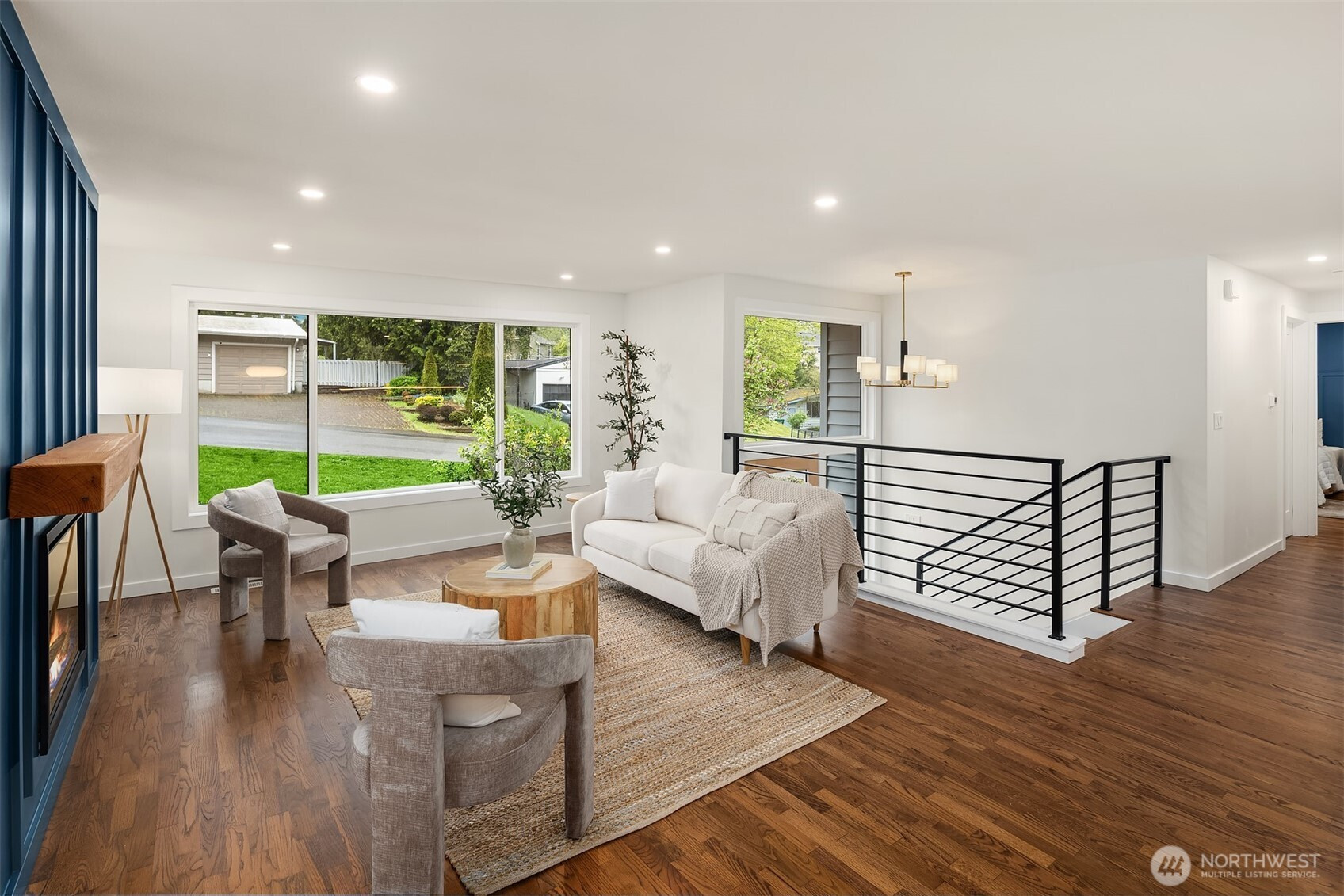 Fully renovated 3-bed, 2.5-bath split-entry in the heart of Brier — new from the roof to the floors. The updated kitchen features white cabinetry, quartz counters, stainless appliances, and a chef’s island with eating bar that opens to the dining area and upper deck for easy indoor-outdoor living. A blue-accented tile backsplash adds personality without overdoing it. The great room is the centerpiece — a wide-open, flexible space with exposed beams and wood plank ceilings that feel both cozy and spacious. Every bathroom has heated floors. The primary suite is a standout — walk-in closet, curbless shower, floor-to-ceiling tile, and a double vanity with quartz countertop. Downstairs, a second family room with its own fireplace plus a dedicated laundry room. Outside: upper deck off the kitchen, a covered concrete patio below, and a fully fenced backyard with fire pit, raised planter boxes, and lush lawn — all on a quiet cul-de-sac. New roof, new windows, new garage door, epoxy garage floors. Oversized lot with a creek along the back edge, minutes to downtown Bothell and easy access to both I-5 and 405. Quality renovation in a great neighborhood — nothing left to do but move in.