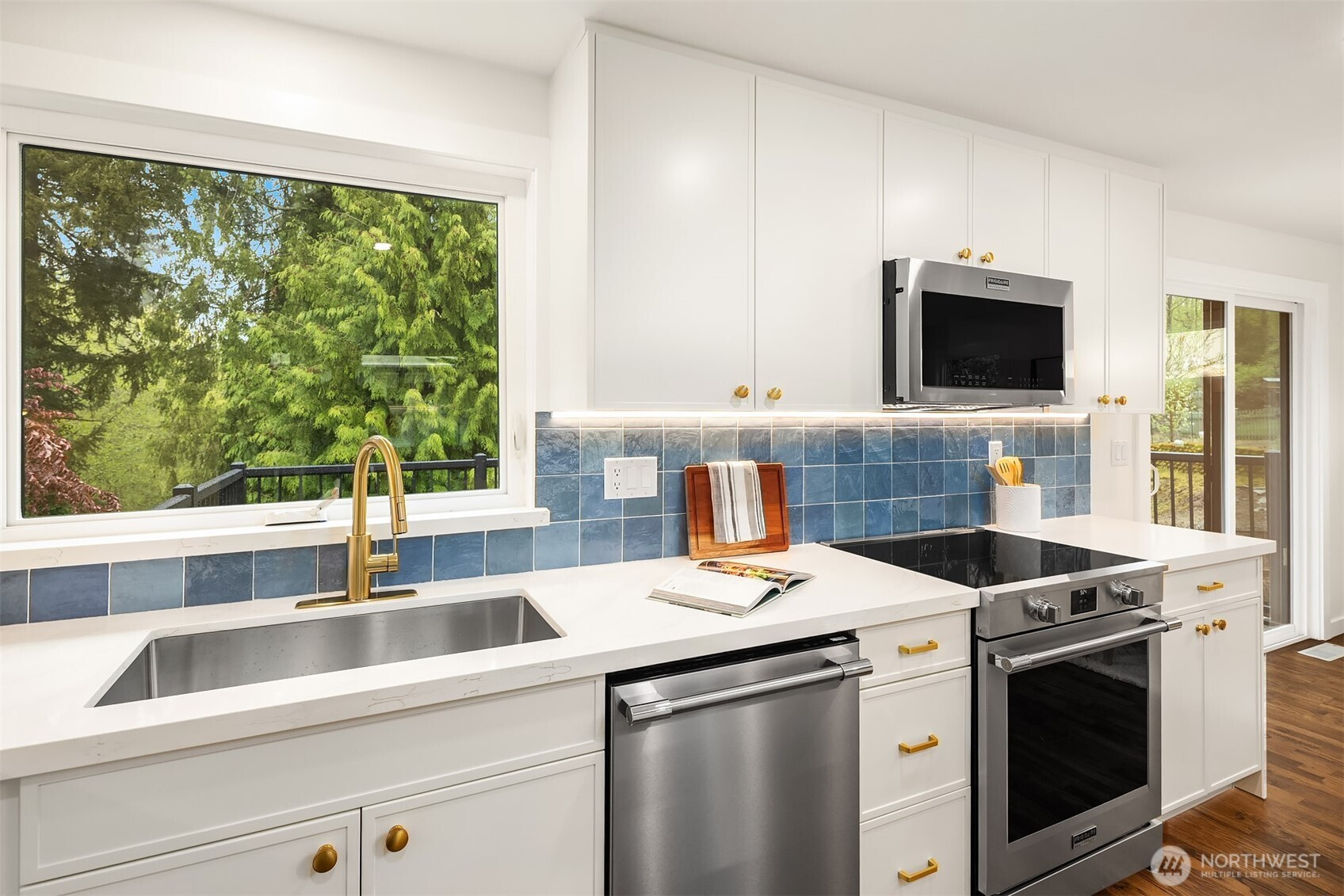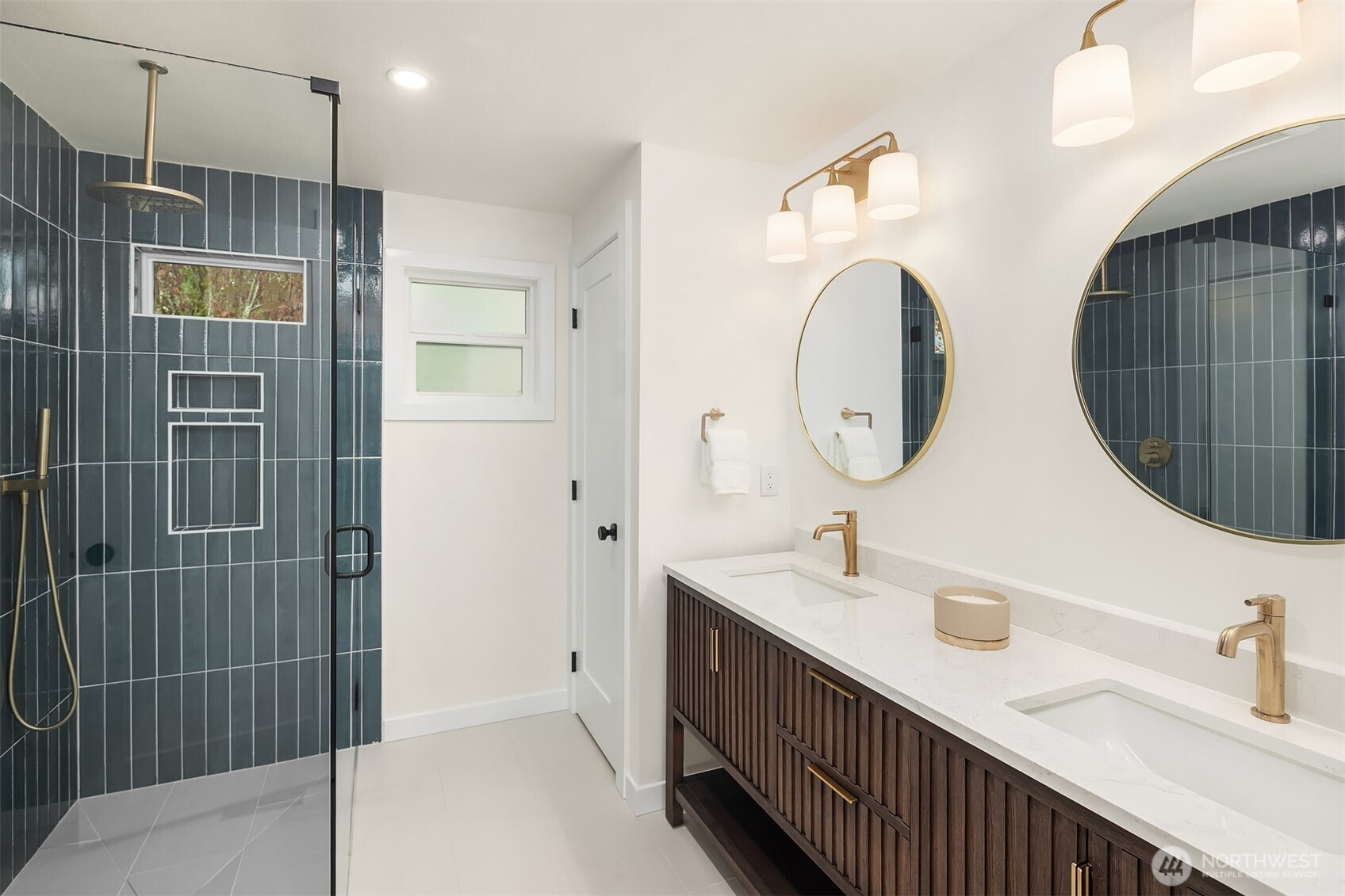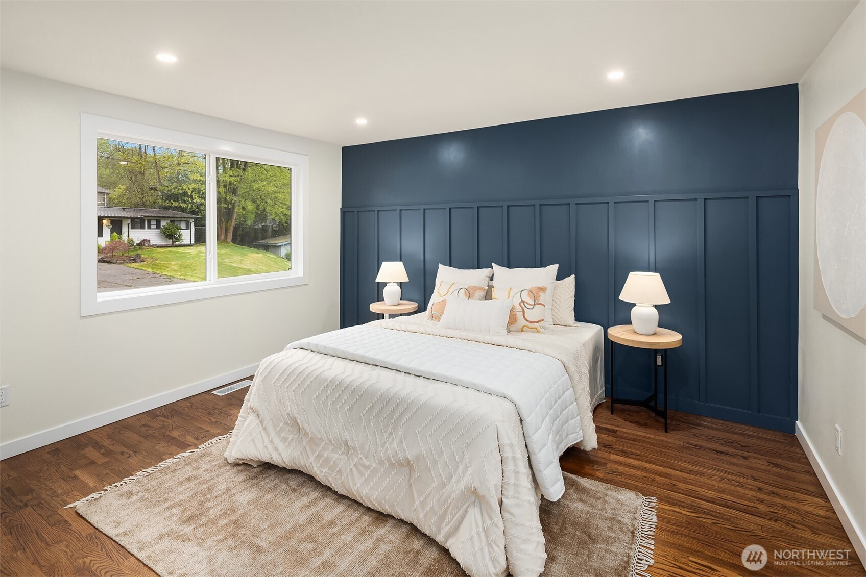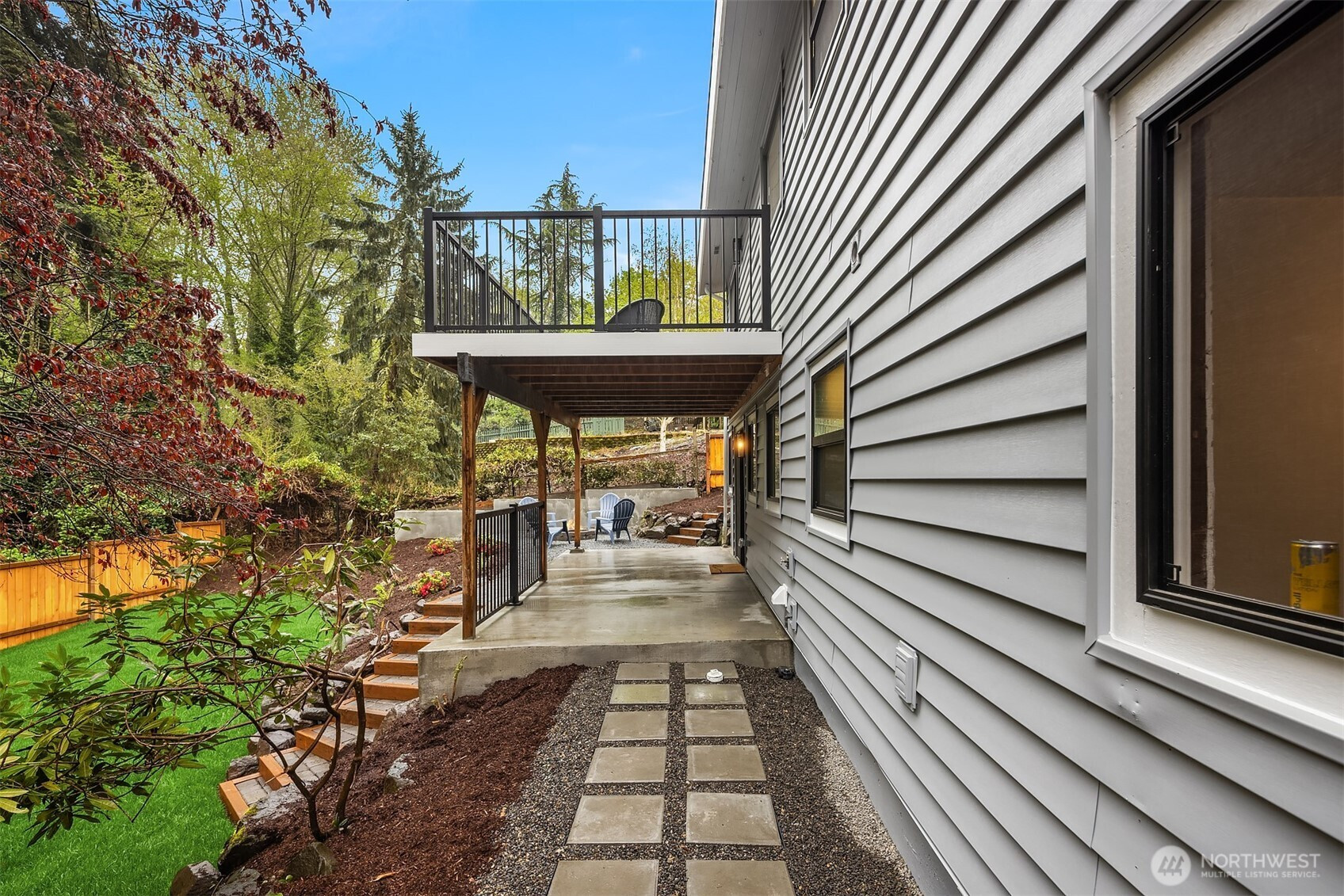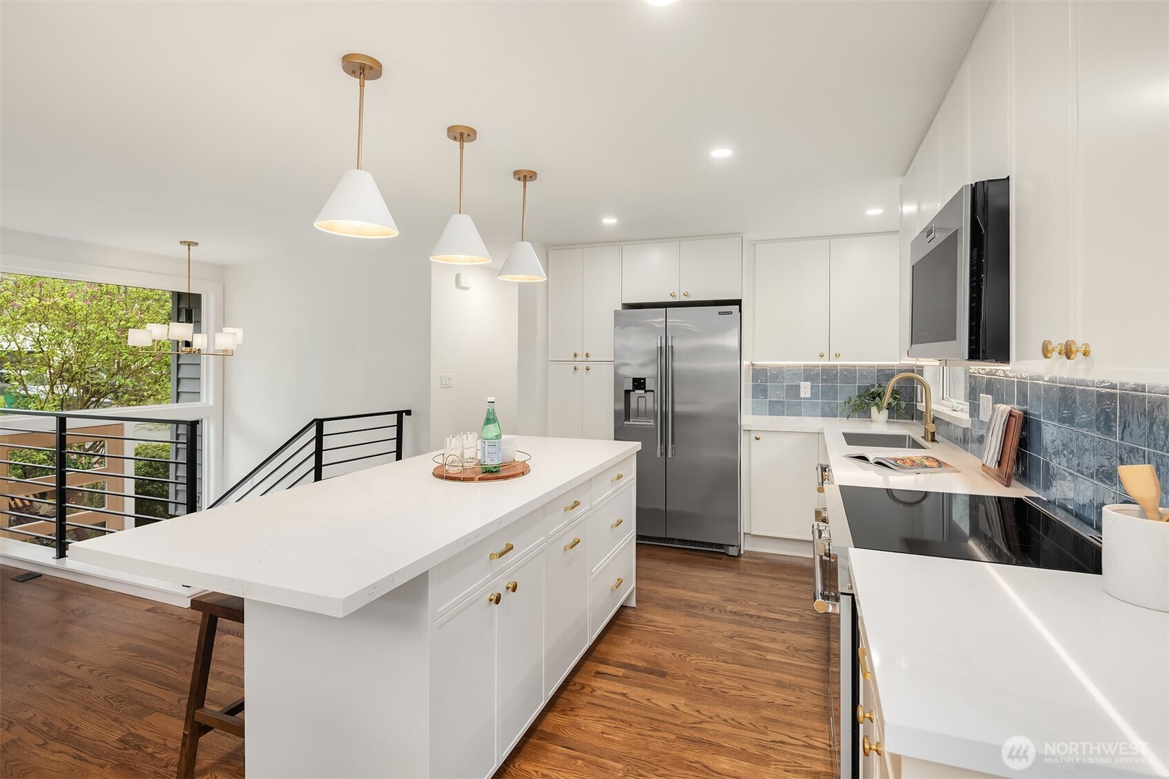 Fully renovated 3-bed, 2.5-bath split-entry in the heart of Brier — new from the roof to the floors. The updated kitchen features white cabinetry, quartz counters, stainless appliances, and a chef’s island with eating bar that opens to the dining area and upper deck for easy indoor-outdoor living. A blue-accented tile backsplash adds personality without overdoing it. The great room is the centerpiece — a wide-open, flexible space with exposed beams and wood plank ceilings that feel both cozy and spacious. Every bathroom has heated floors. The primary suite is a standout — walk-in closet, curbless shower, floor-to-ceiling tile, and a double vanity with quartz countertop. Downstairs, a second family room with its own fireplace plus a dedicated laundry room. Outside: upper deck off the kitchen, a covered concrete patio below, and a fully fenced backyard with fire pit, raised planter boxes, and lush lawn — all on a quiet cul-de-sac. New roof, new windows, new garage door, epoxy garage floors. Oversized lot with a creek along the back edge, minutes to downtown Bothell and easy access to both I-5 and 405. Quality renovation in a great neighborhood — nothing left to do but move in.