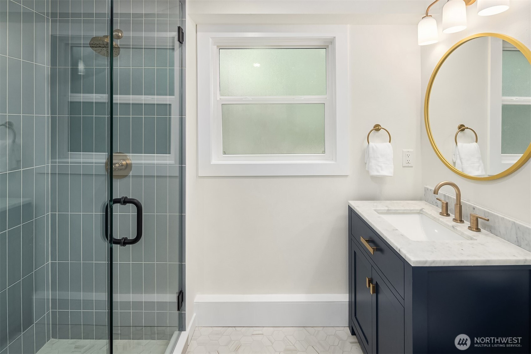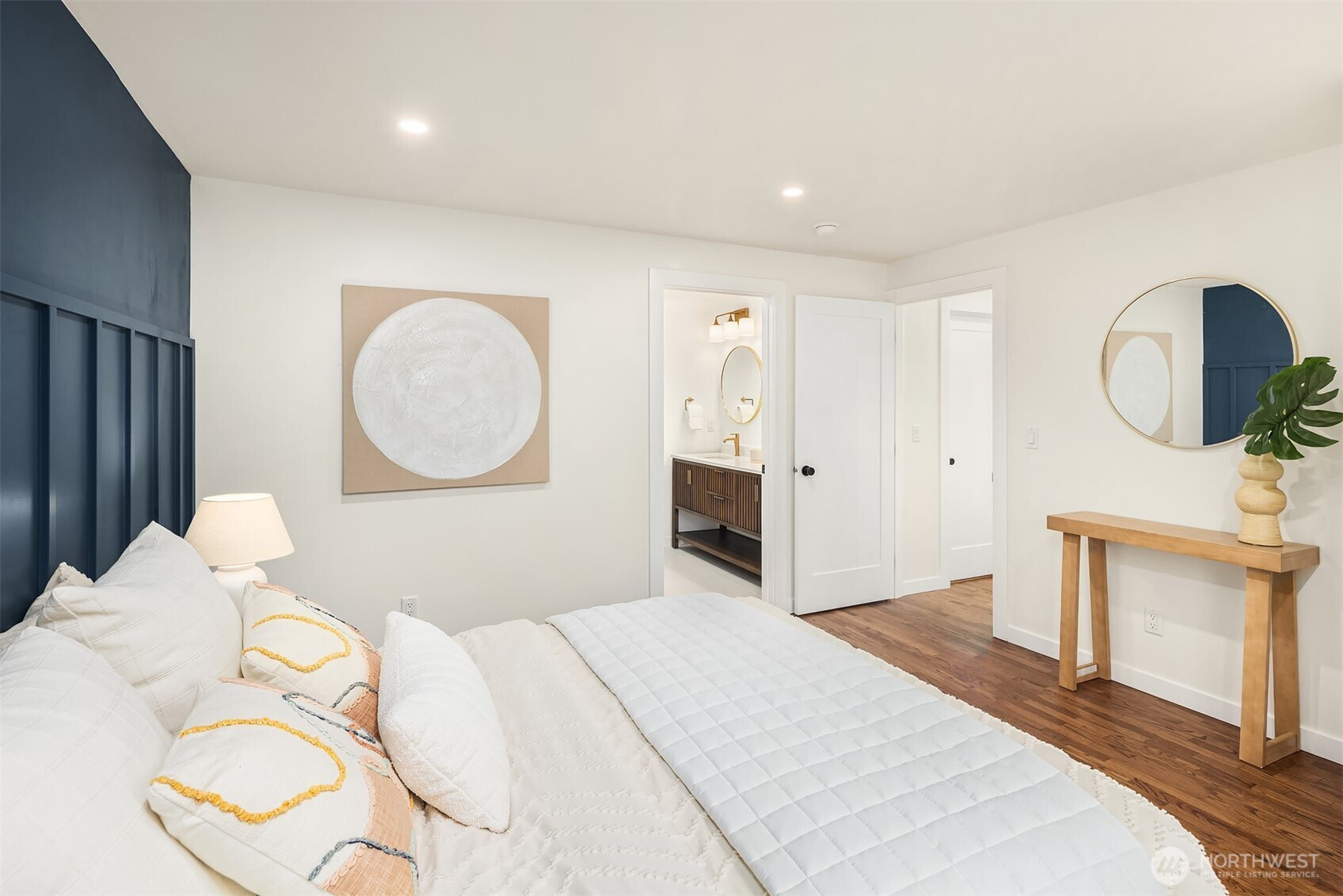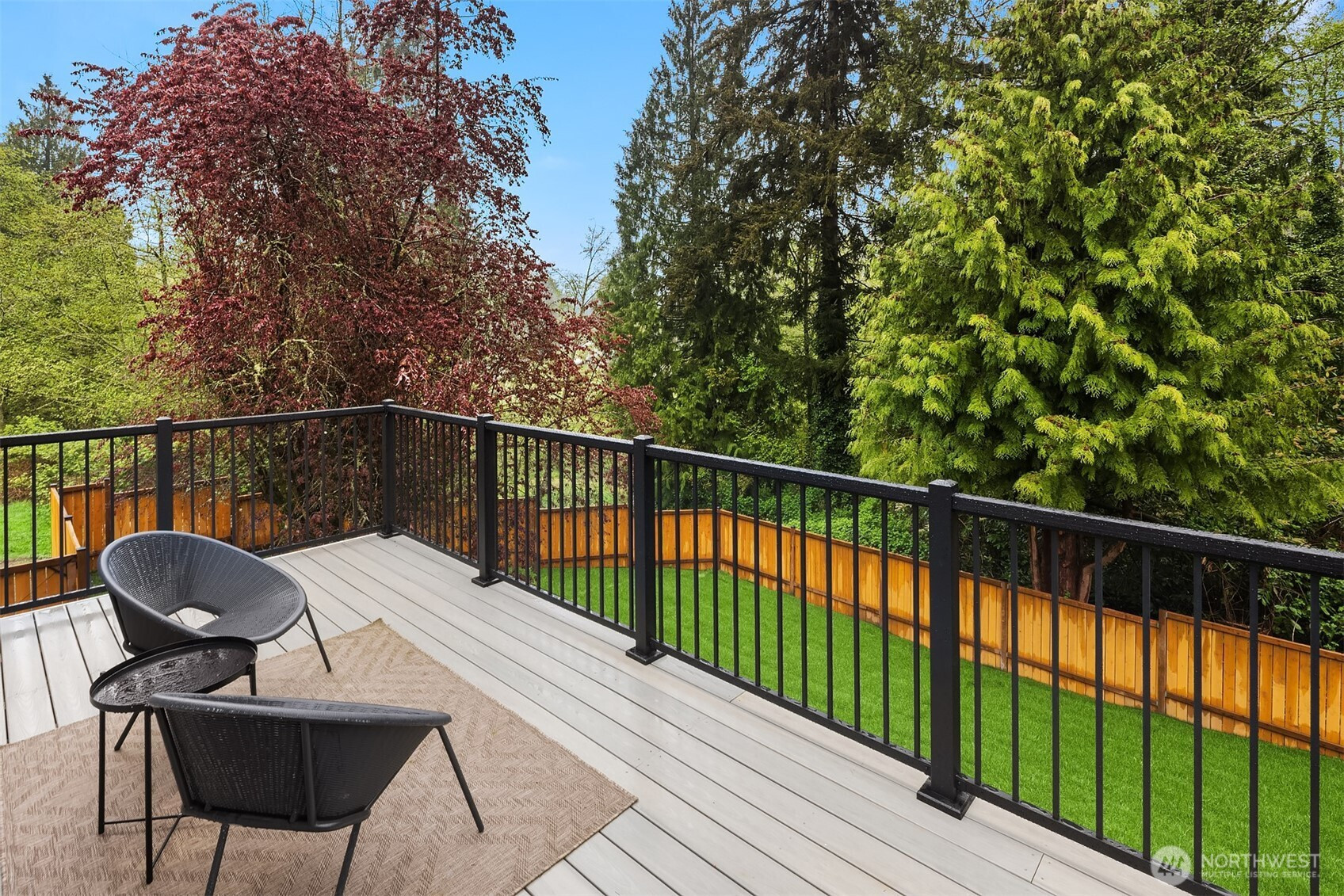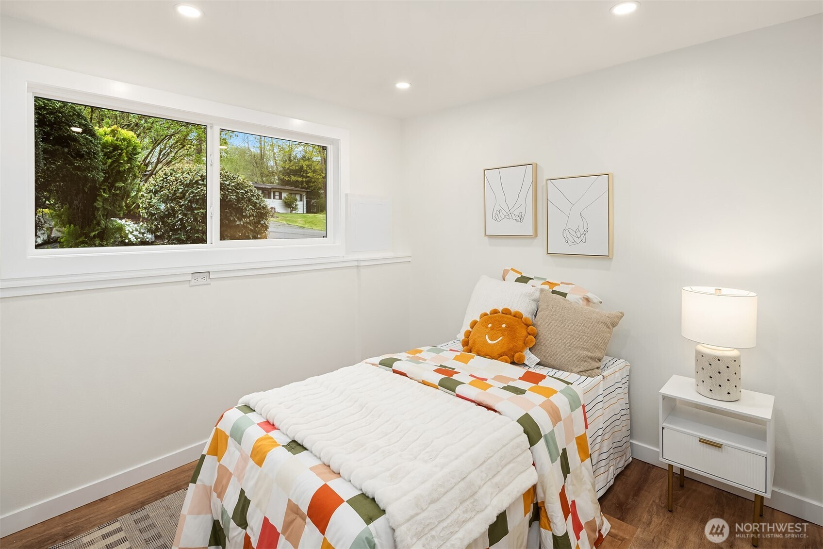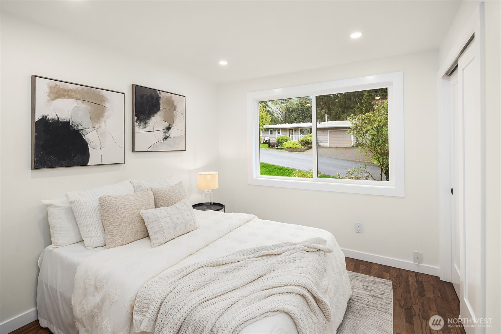 Fully renovated 3-bed, 2.5-bath split-entry in the heart of Brier — new from the roof to the floors. The updated kitchen features white cabinetry, quartz counters, stainless appliances, and a chef’s island with eating bar that opens to the dining area and upper deck for easy indoor-outdoor living. A blue-accented tile backsplash adds personality without overdoing it. The great room is the centerpiece — a wide-open, flexible space with exposed beams and wood plank ceilings that feel both cozy and spacious. Every bathroom has heated floors. The primary suite is a standout — walk-in closet, curbless shower, floor-to-ceiling tile, and a double vanity with quartz countertop. Downstairs, a second family room with its own fireplace plus a dedicated laundry room. Outside: upper deck off the kitchen, a covered concrete patio below, and a fully fenced backyard with fire pit, raised planter boxes, and lush lawn — all on a quiet cul-de-sac. New roof, new windows, new garage door, epoxy garage floors. Oversized lot with a creek along the back edge, minutes to downtown Bothell and easy access to both I-5 and 405. Quality renovation in a great neighborhood — nothing left to do but move in.