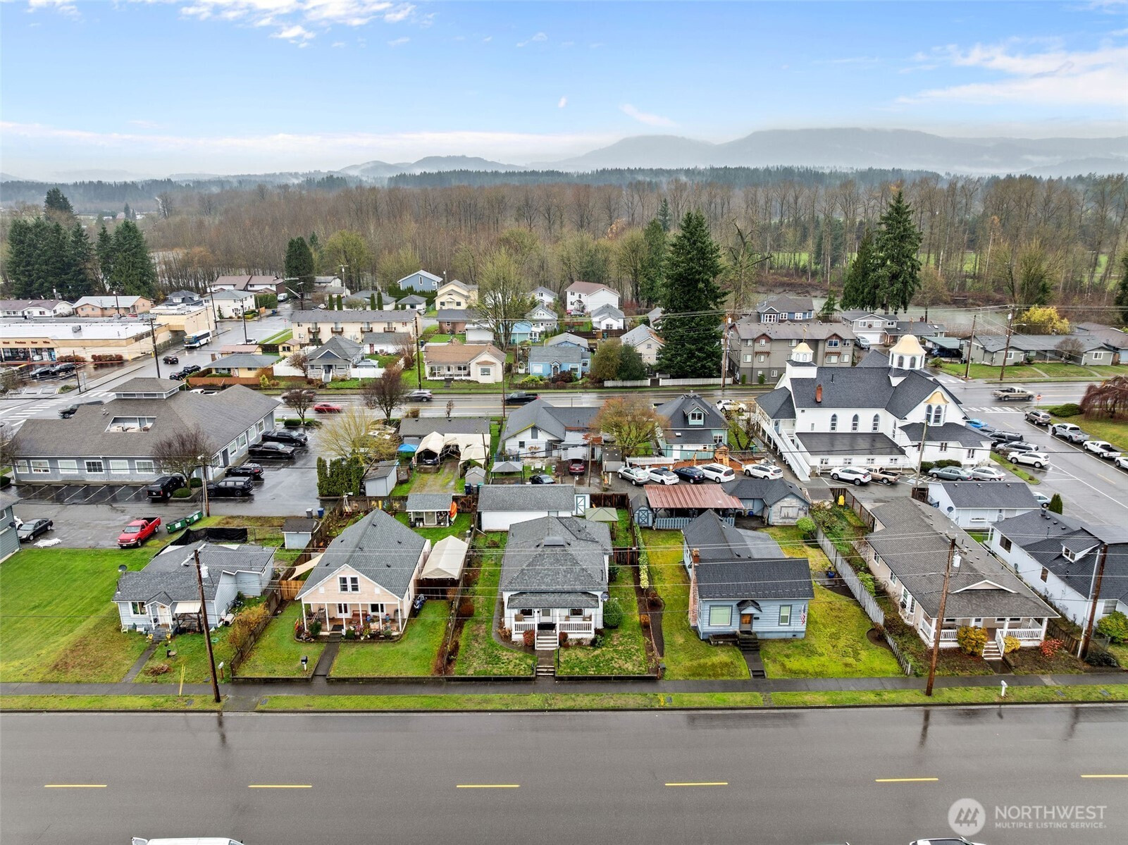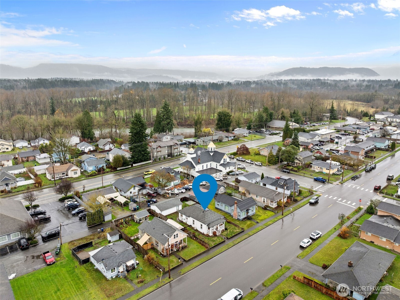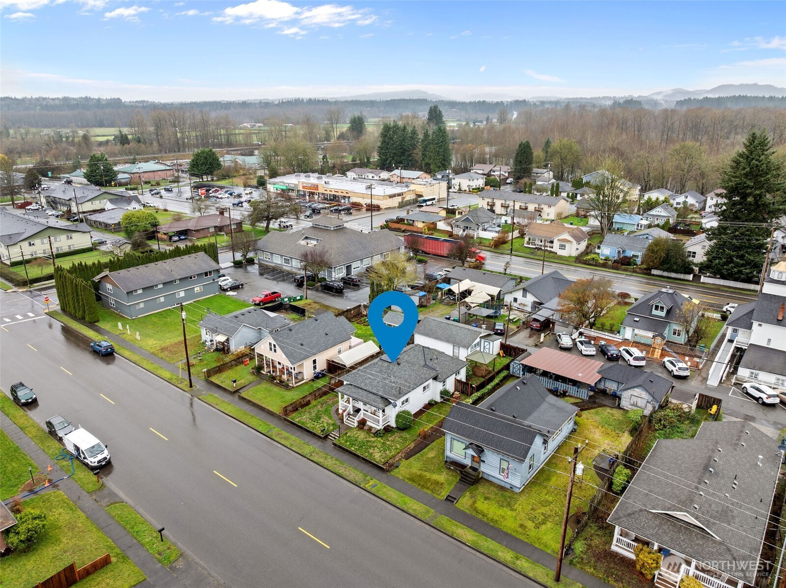 Adorable curb appeal with inviting front porch leads into this well-maintained 1910 home featuring original details, including panel doors with vintage hardware, hardwood floors, and built-in cupboards. The interior layout features a spacious living room, a large kitchen with an eating space, a full bath, and three generously sized bedrooms. Updates include electrical, a newer roof, double-pane windows, ductless mini-split for year-round comfort, a newer water heater, and exterior paint. Detached 2-car garage with shop space. Can't beat this location, close to downtown Arlington, Centennial Trail, parks, and area amenities!