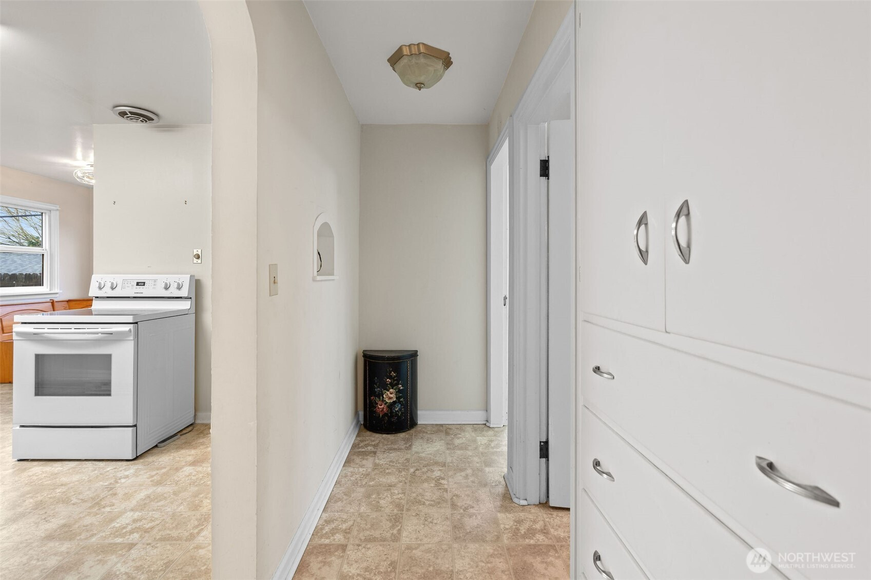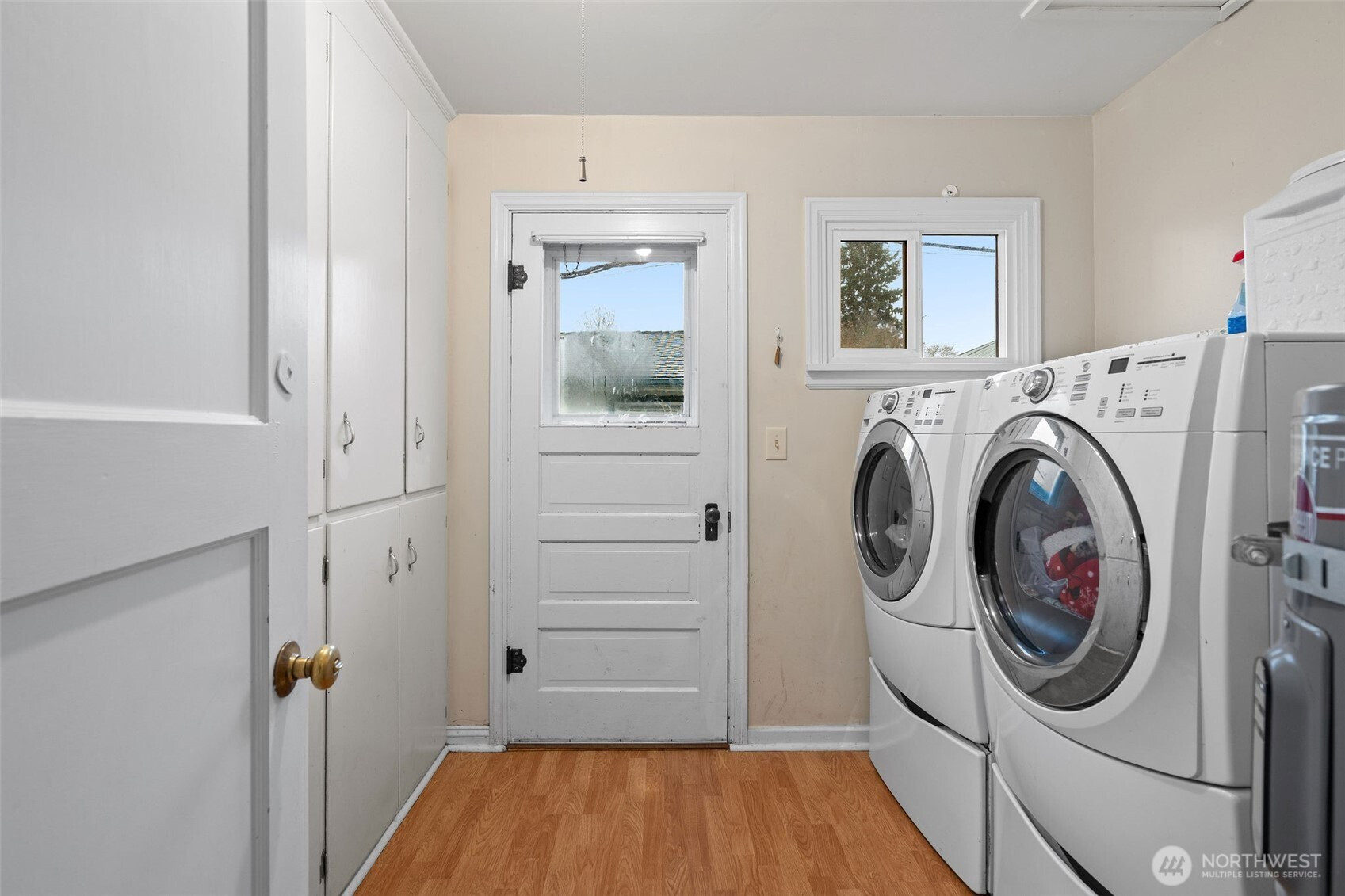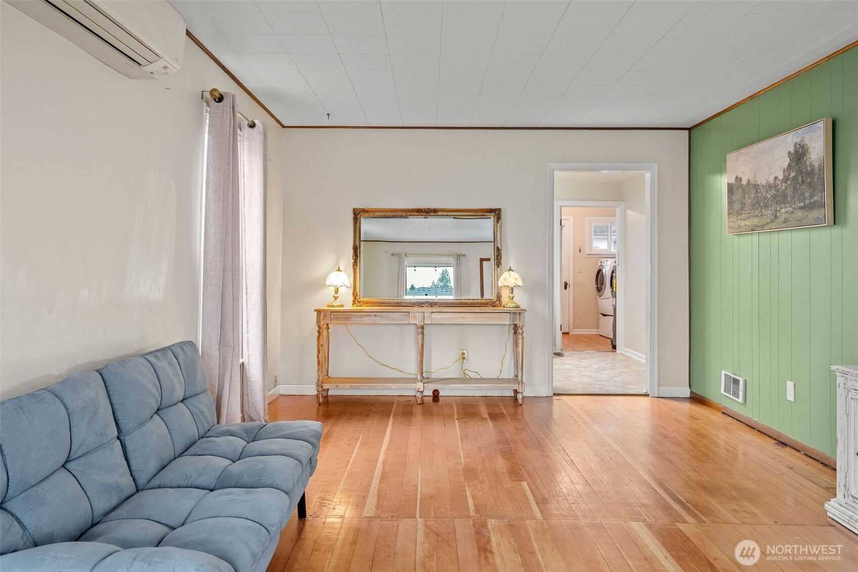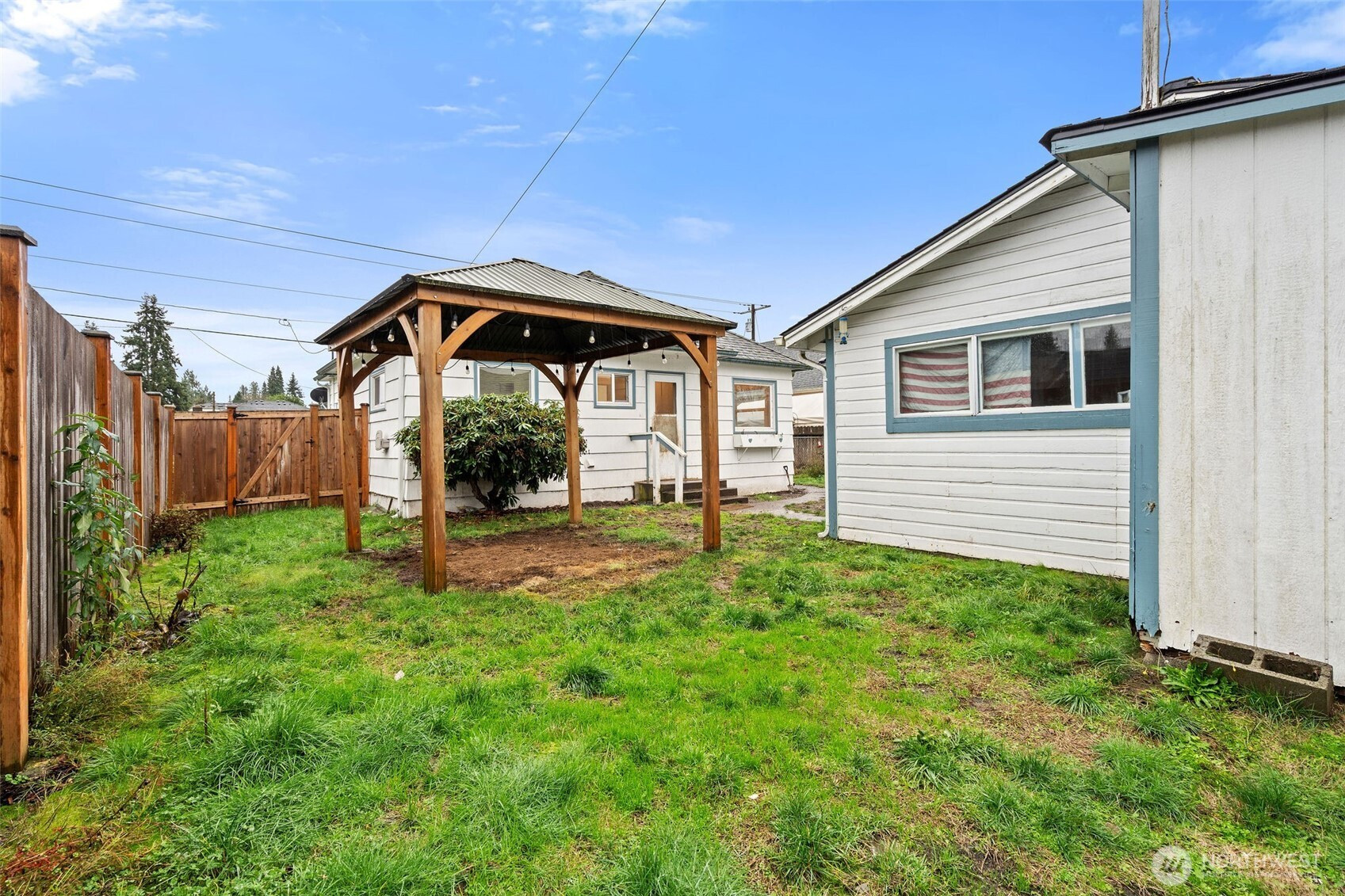 Adorable curb appeal with inviting front porch leads into this well-maintained 1910 home featuring original details, including panel doors with vintage hardware, hardwood floors, and built-in cupboards. The interior layout features a spacious living room, a large kitchen with an eating space, a full bath, and three generously sized bedrooms. Updates include electrical, a newer roof, double-pane windows, ductless mini-split for year-round comfort, a newer water heater, and exterior paint. Detached 2-car garage with shop space. Can't beat this location, close to downtown Arlington, Centennial Trail, parks, and area amenities!