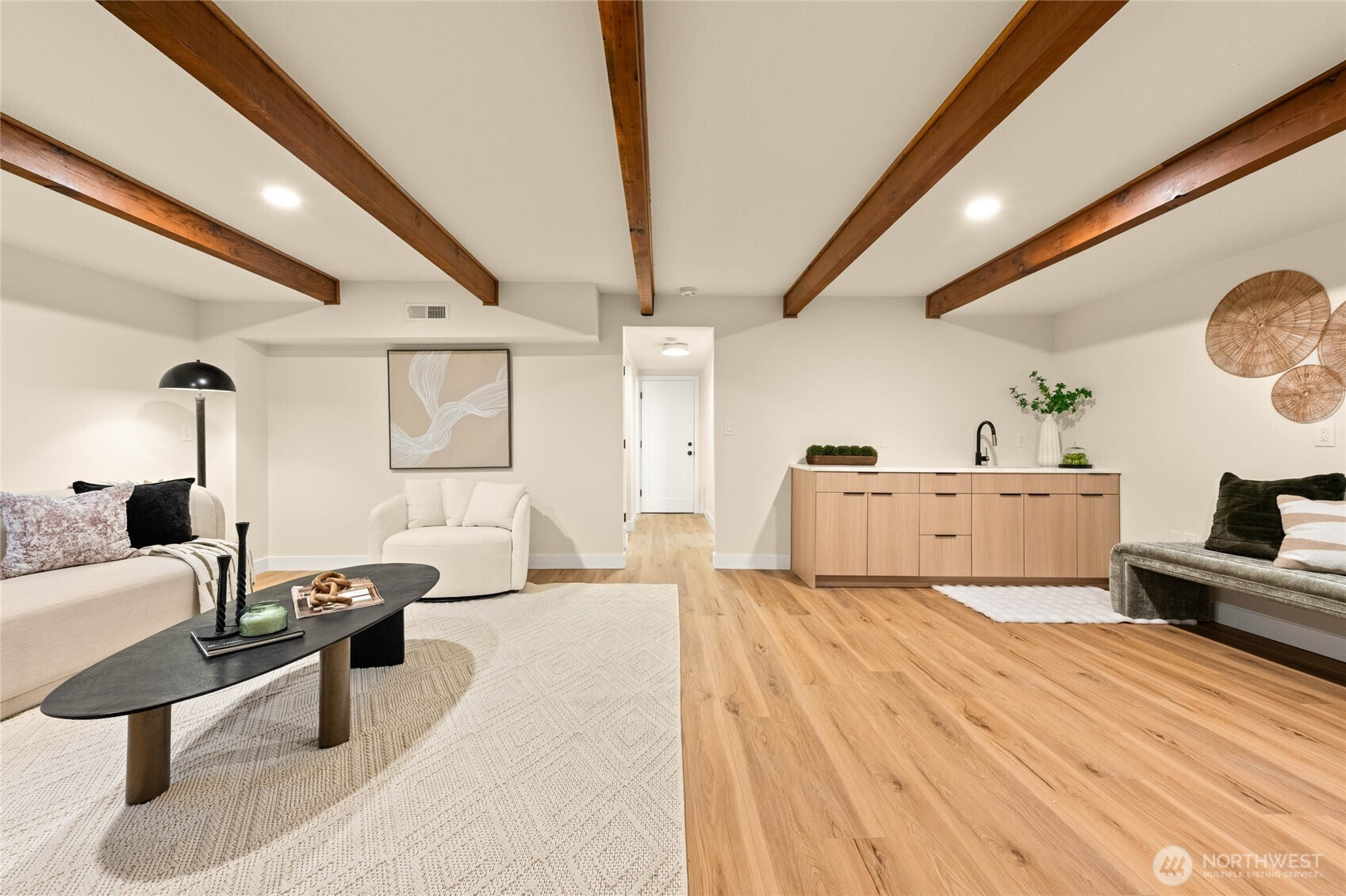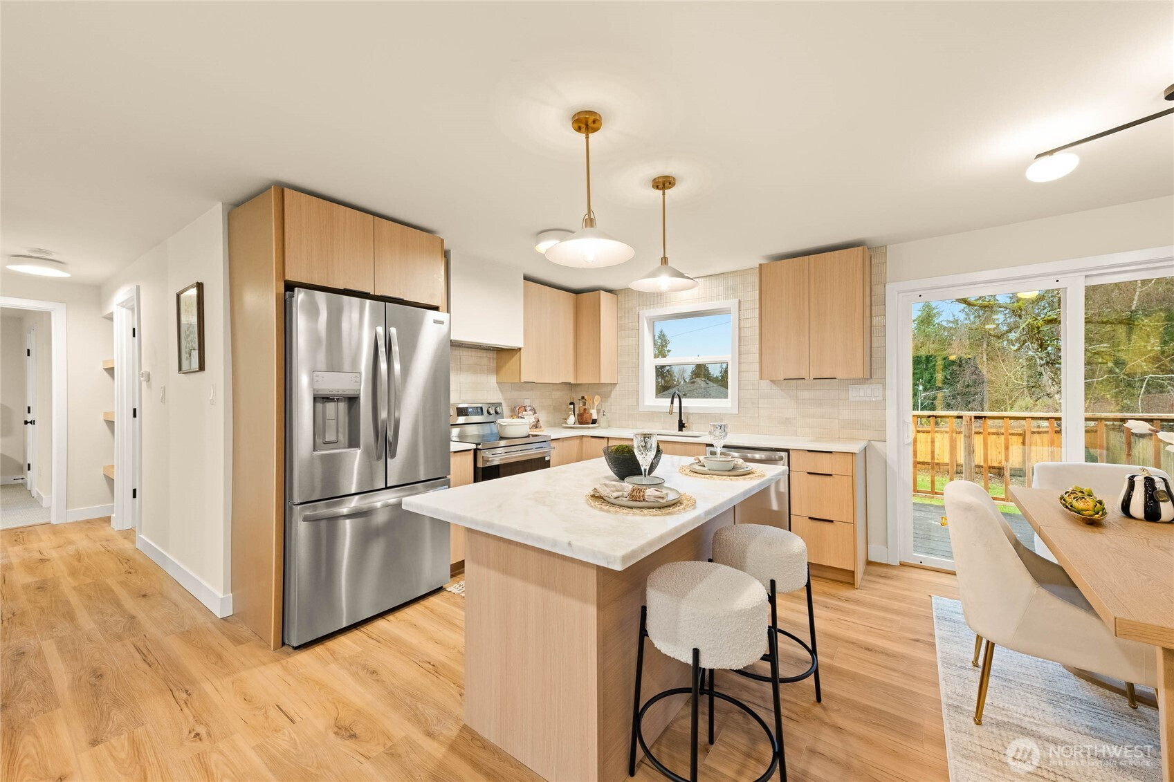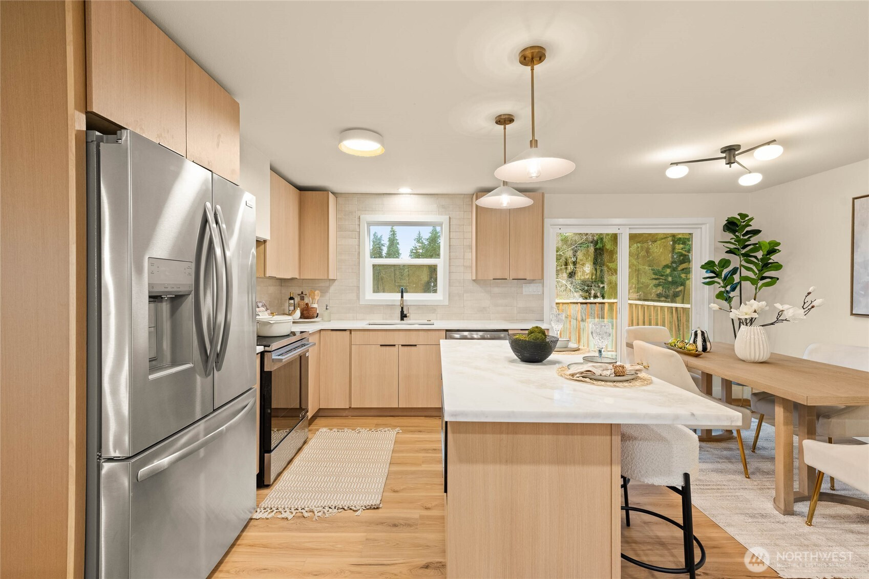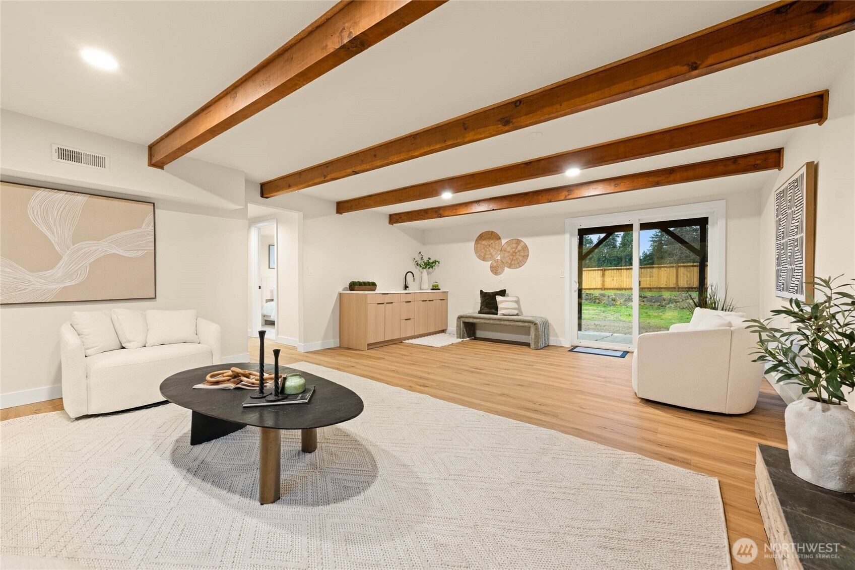 A thoughtfully remodeled home, with an organic modern aesthetic- this nearly 2,000 sq ft residence lives generously with well-balanced spaces and intentional design. The primary suite features an expansive walk-in closet and a beautifully finished ensuite w/ full tile, dual sinks, and an oversized walk-in shower. The lower level showcases the original brick fireplace, adding a subtle mid-century modern feel, paired with exposed wood beams and a custom dry bar with mini fridge & cabinetry—ideal for entertaining. Outdoor living is equally inviting, with a large deck overlooking an 8,276 sq ft lot, offering ample space for year-round enjoyment. RV parking, extensive driveway parking, & extra-deep attached one-car garage. A truly turnkey home!