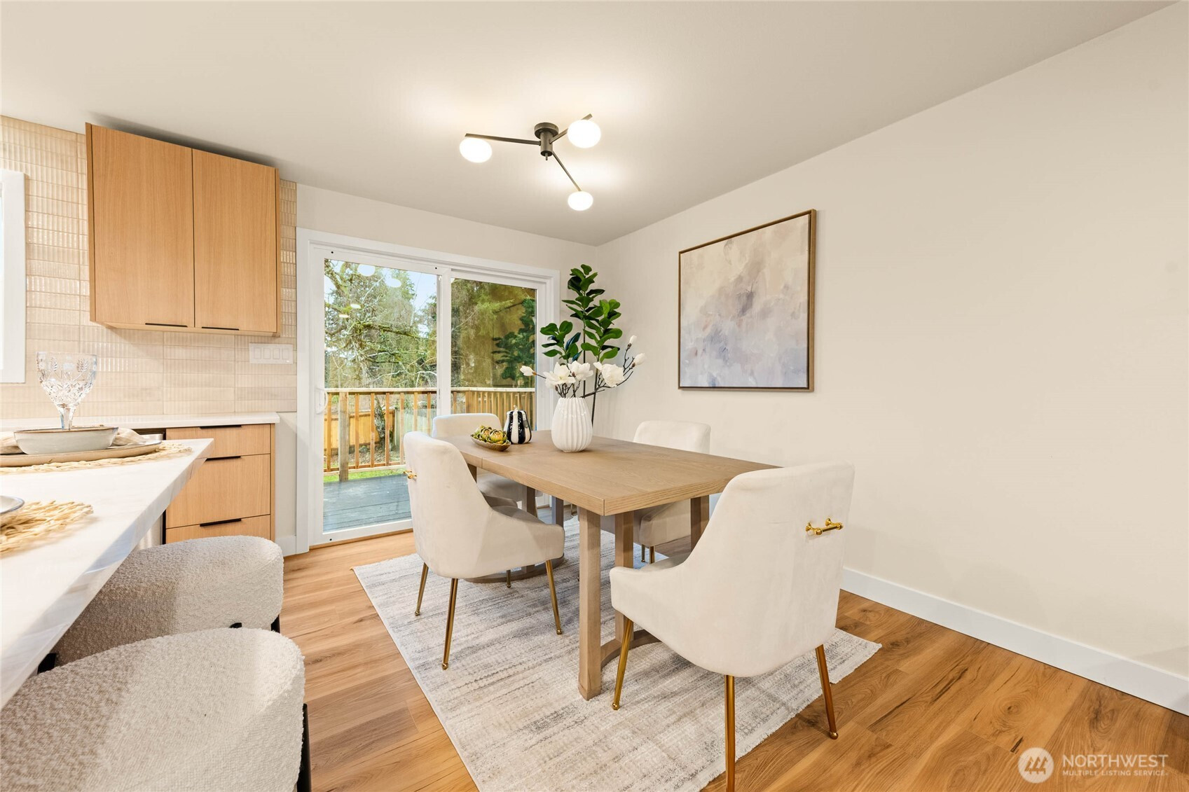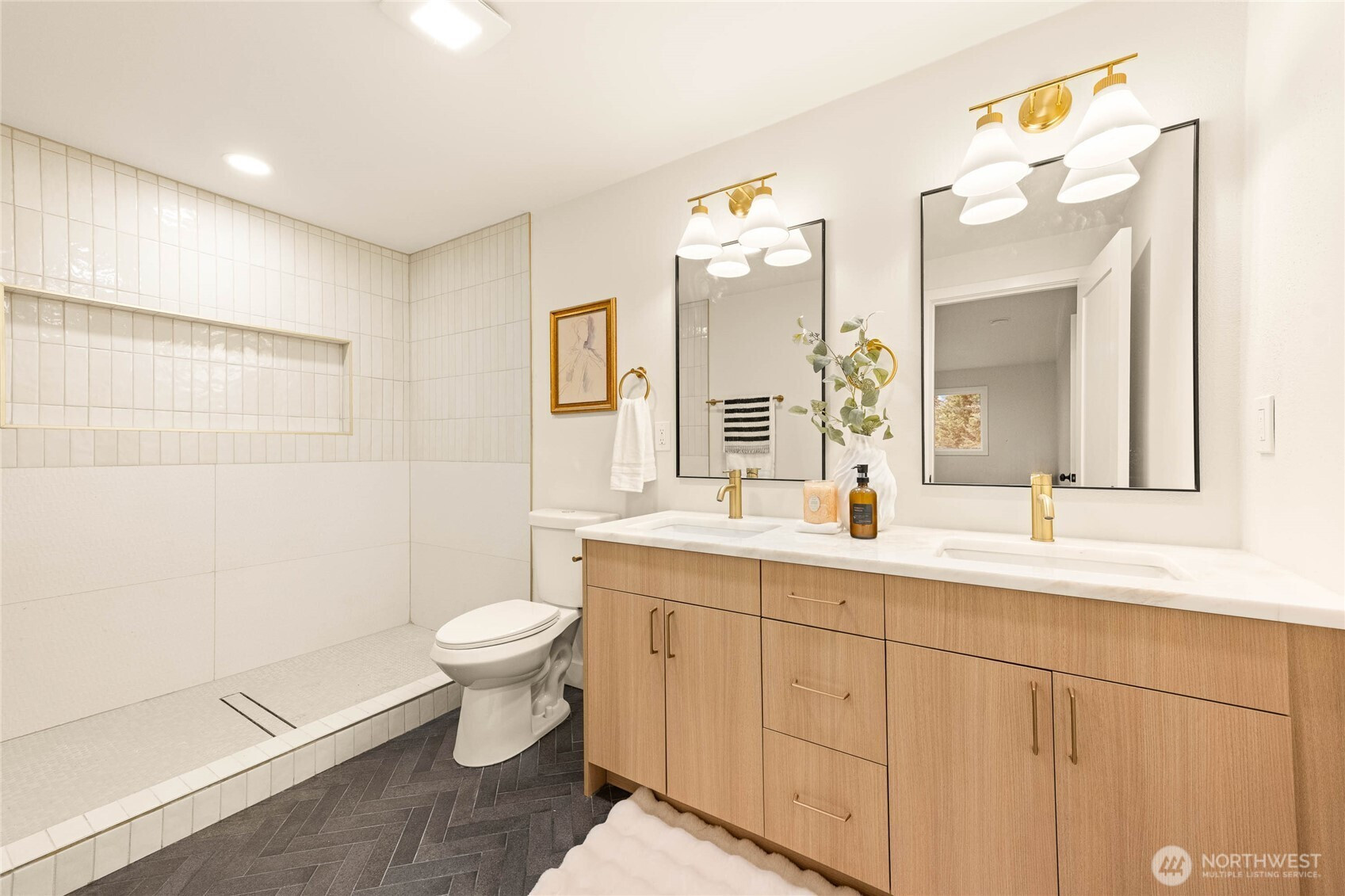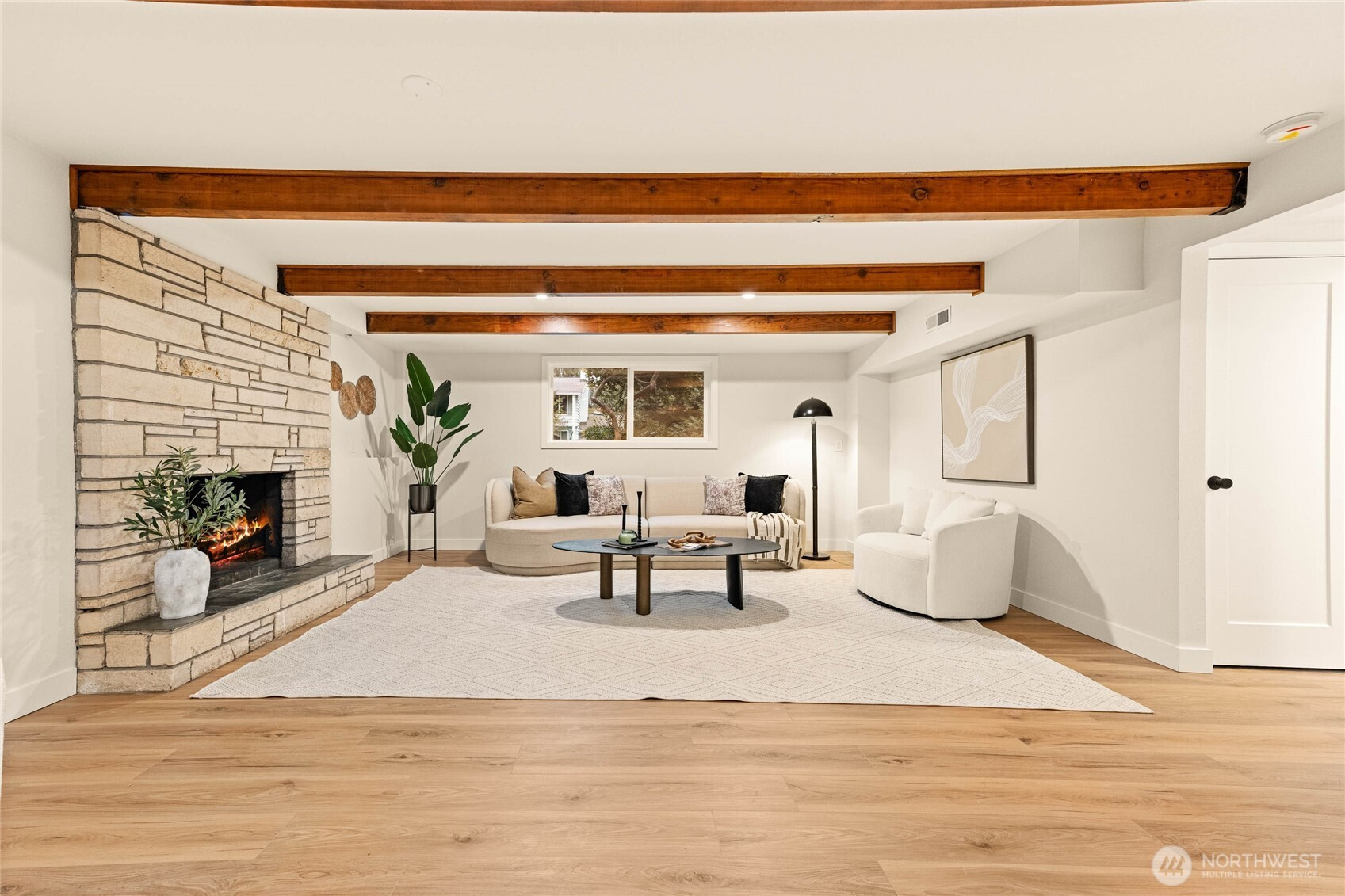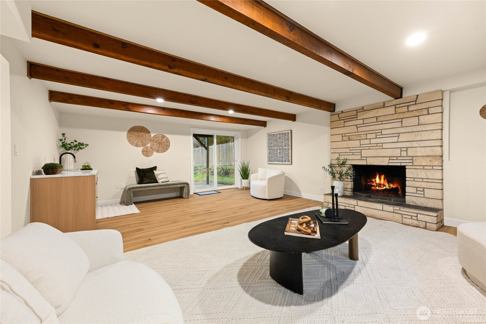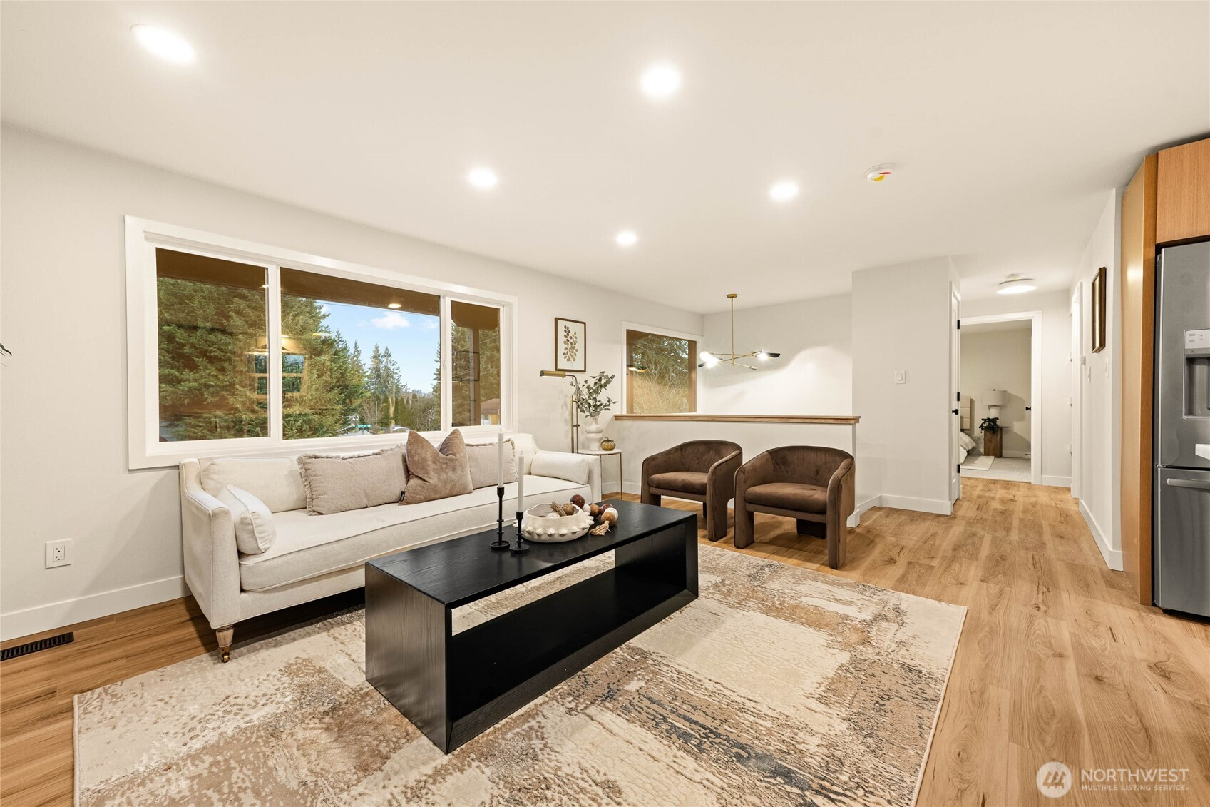 A thoughtfully remodeled home, with an organic modern aesthetic- this nearly 2,000 sq ft residence lives generously with well-balanced spaces and intentional design. The primary suite features an expansive walk-in closet and a beautifully finished ensuite w/ full tile, dual sinks, and an oversized walk-in shower. The lower level showcases the original brick fireplace, adding a subtle mid-century modern feel, paired with exposed wood beams and a custom dry bar with mini fridge & cabinetry—ideal for entertaining. Outdoor living is equally inviting, with a large deck overlooking an 8,276 sq ft lot, offering ample space for year-round enjoyment. RV parking, extensive driveway parking, & extra-deep attached one-car garage. A truly turnkey home!