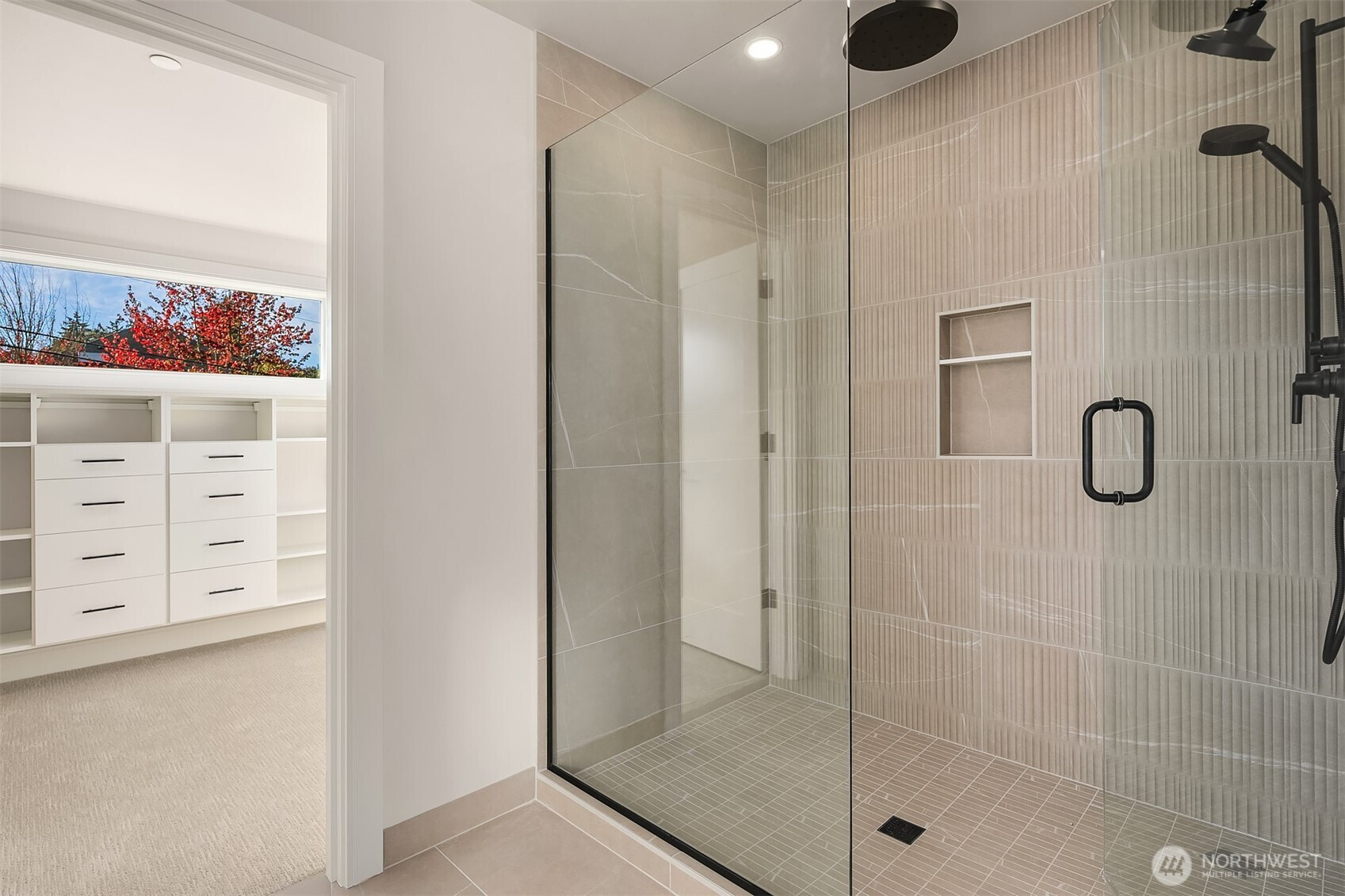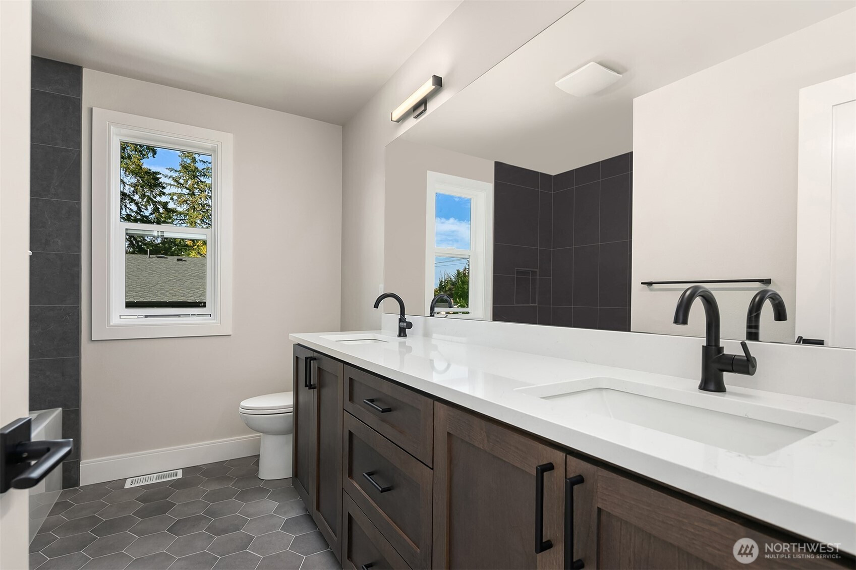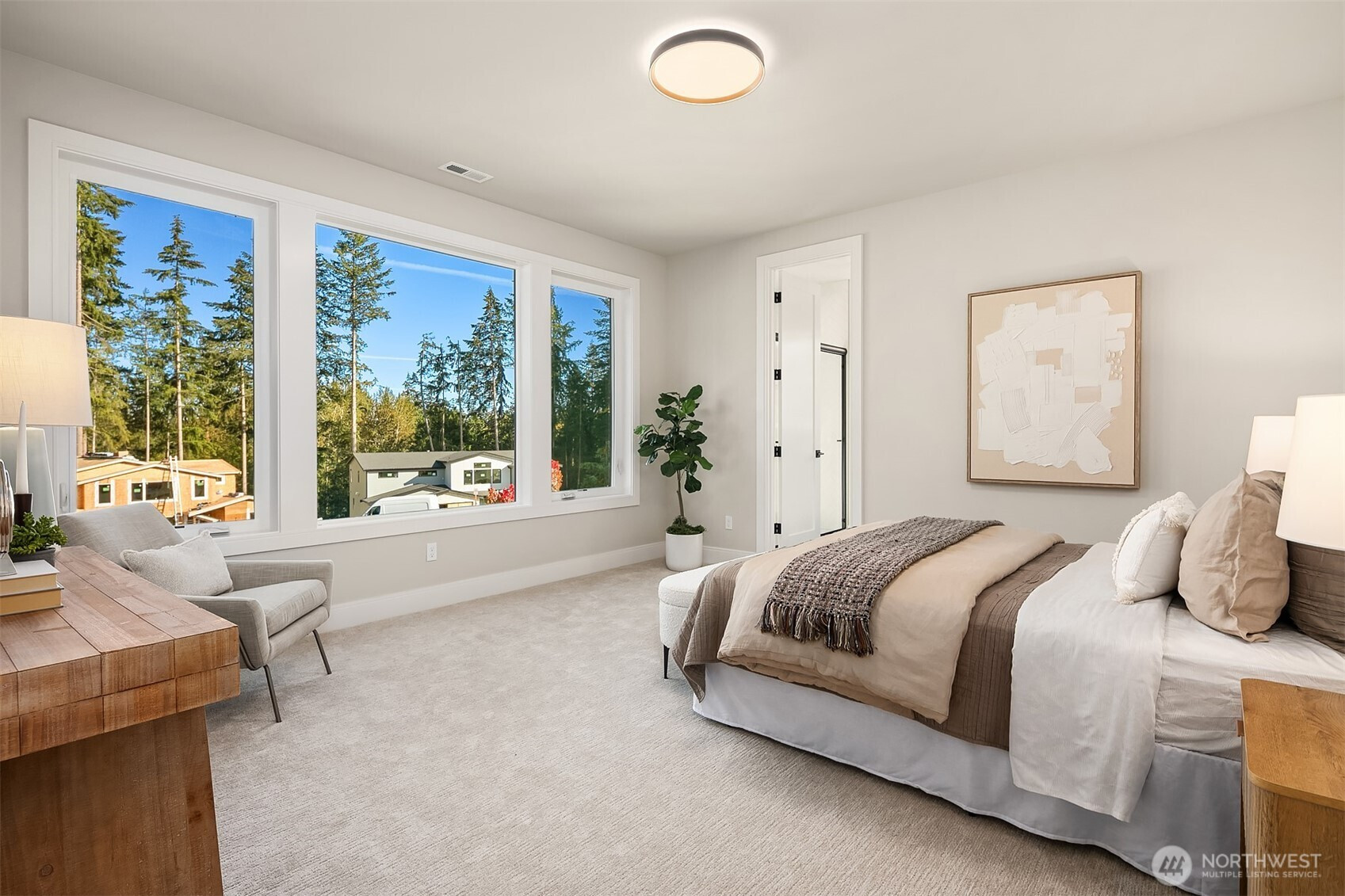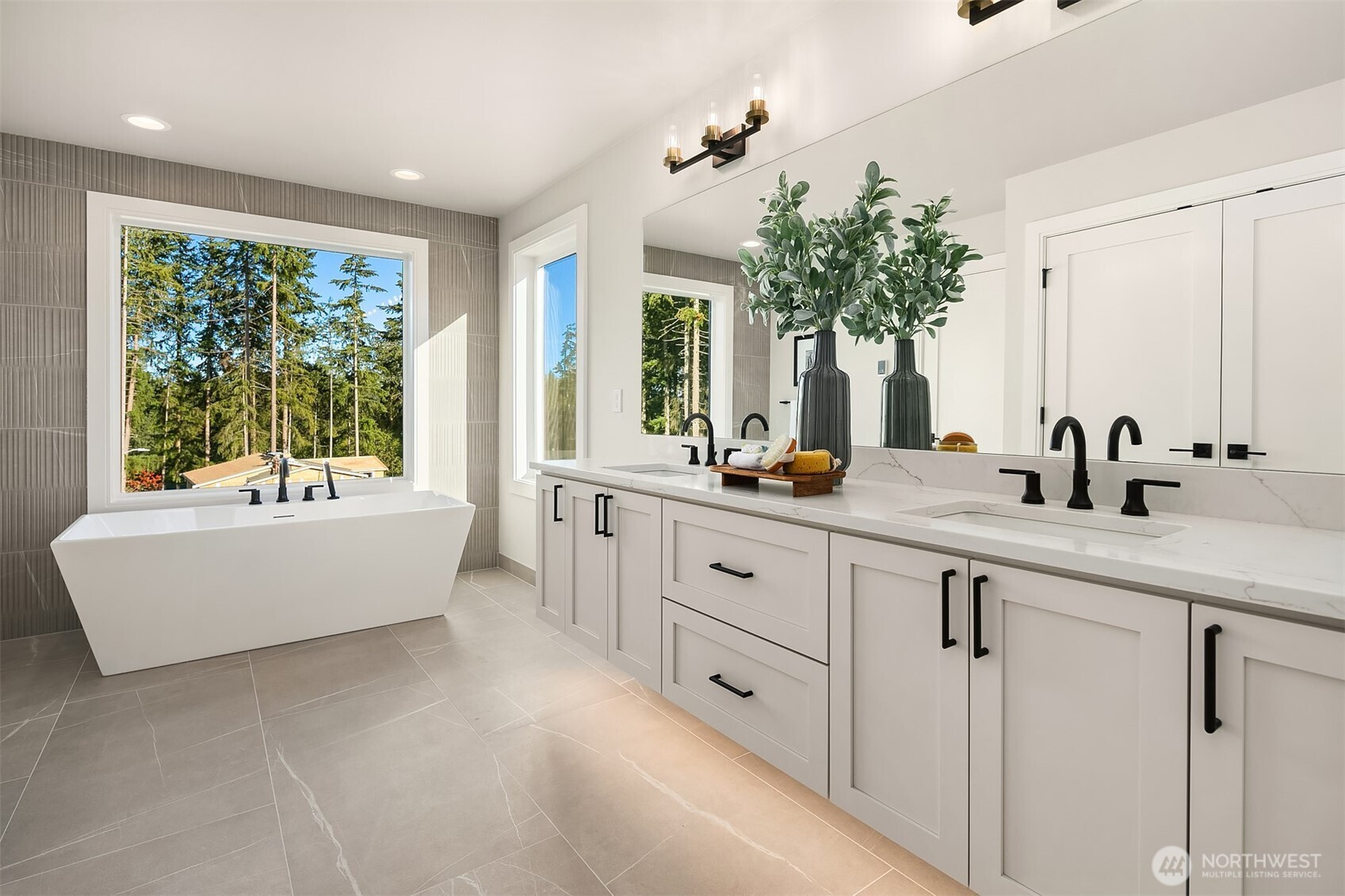 Phillips Ridge Phase 2 New Northwest Contemporary Luxury Homes on 1/4 Acre+ Homesites. OLYMPIC 3910: Covered porch, grand vaulted entry, main floor den, guest suite & 3/4 bath. Stunning two story great room with floor to ceiling ceramic tile fireplace, & covered outdoor living area. Full open rail custom staircase with hardwood staircase. Gourmet kitchen has high-end stainless steel appliances, grand quartz waterfall island, coffee bar & walk-in butlers pantry with second under mount sink. Primary suite boasts a freestanding soaking tub, frameless glass shower and heated floors. Includes an open bonus room, 4th bedroom w/ attached bath & large flat fenced backyard. Hot water recirculation system, A/C, heat pump. 17,410 sf greenbelt homesite