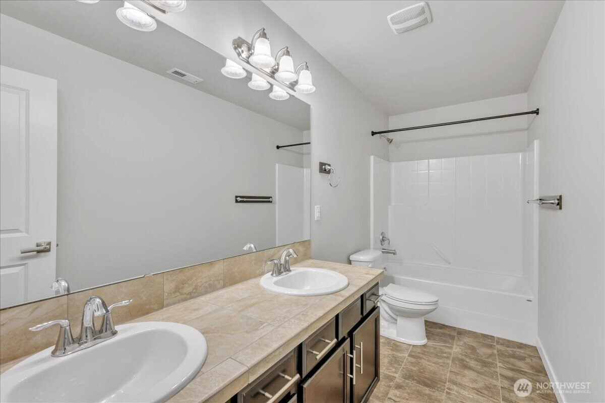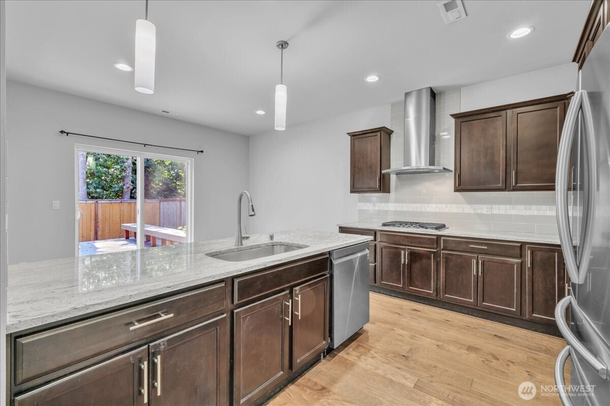 This beautiful home offers 5 bedrooms & a den, 2.5 baths, and 2,176 sq. ft. of thoughtfully designed living space. Enjoy hand-scraped style hardwood floors in the entry and kitchen, granite slab counters, and GE Profile appliances. Bathrooms showcase ceramic tile, while coffered ceilings in the primary suite and dining room bring refined detail. Architectural balusters and decora switches add style throughout. Abundant natural light highlights every space, and a brand-new deck provides the perfect spot to relax or entertain. The subdivision also features a neighborhood park. Conveniently located near Mill Creek Town Center with quick access to I-5 and Bothell Everett Hwy, this home blends comfort, style, and convenience.