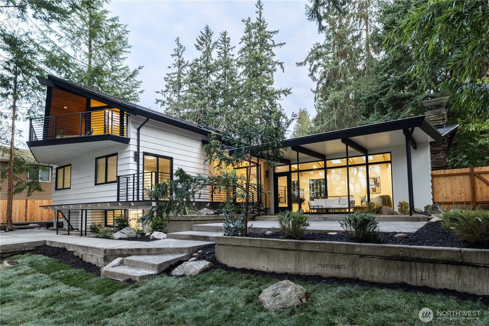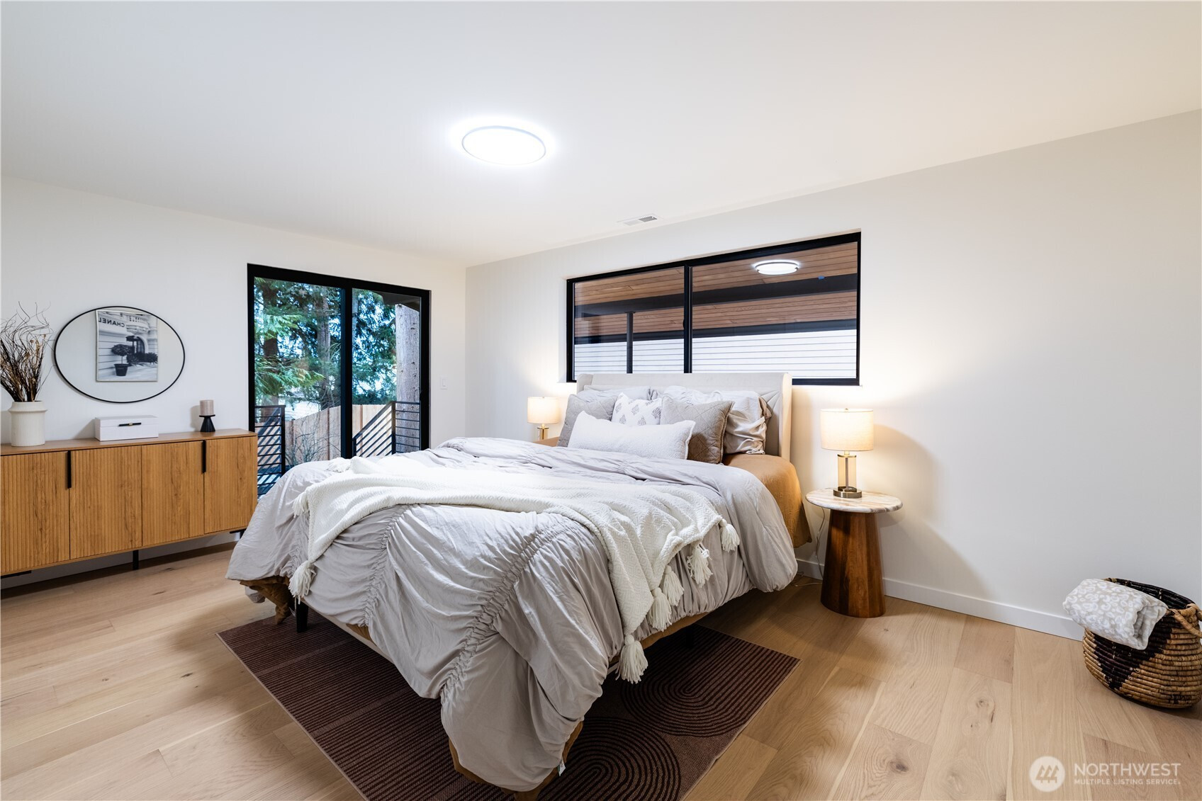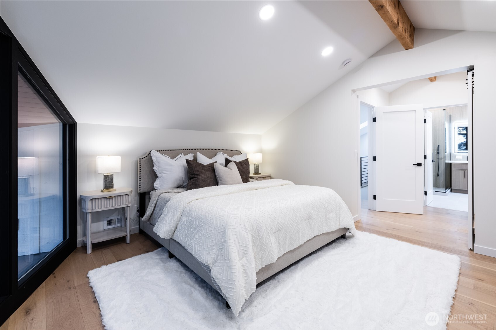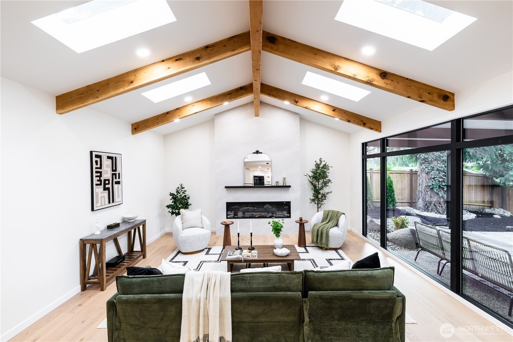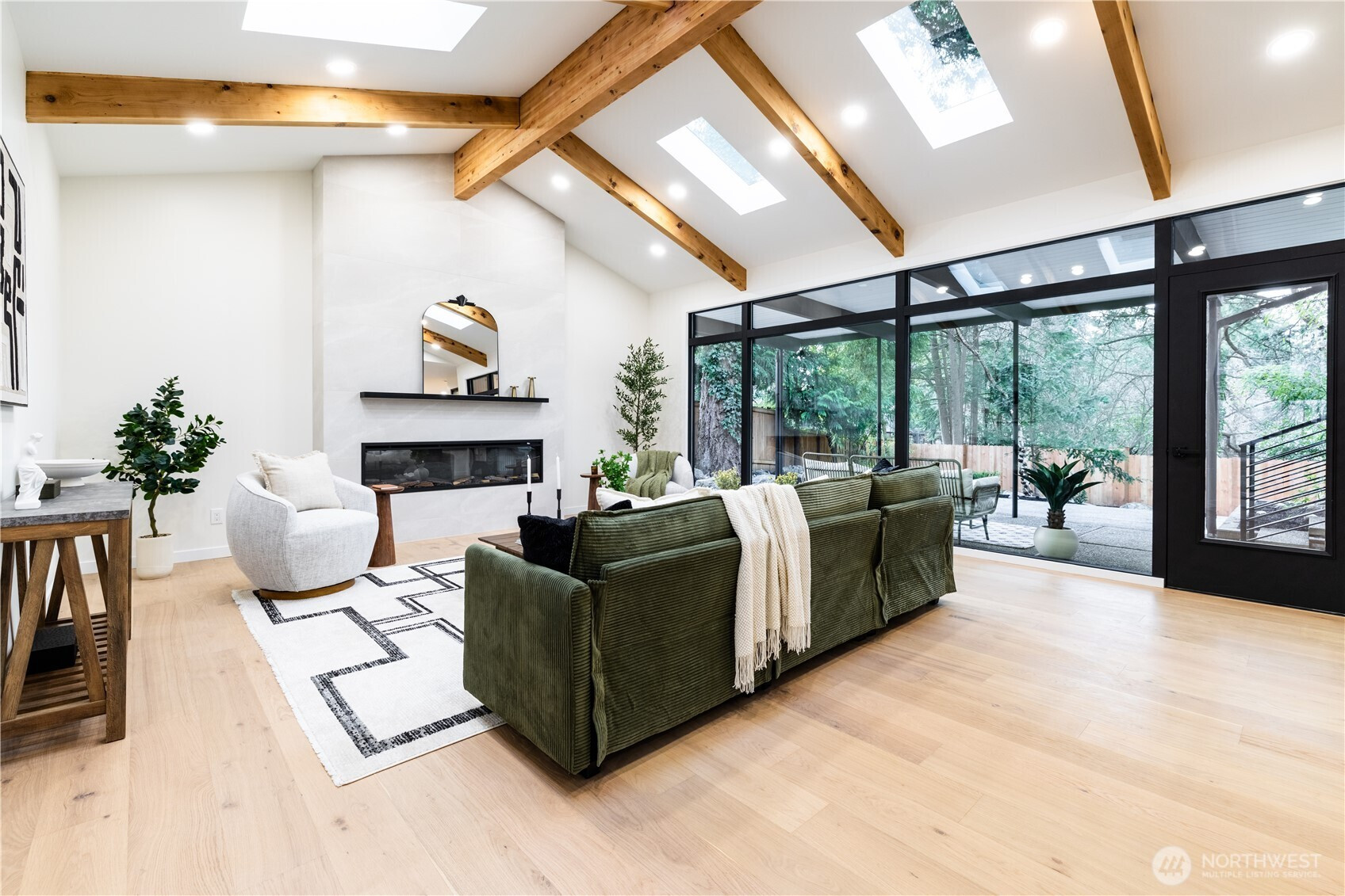 Architectural and rare: modern design meets Pacific Northwest beauty on a quiet dead-end street minutes from downtown. Vaulted ceilings with exposed wood beams, skylights, and expansive windows create a bright, refined atmosphere with forest views. Chef’s kitchen with sleek cabinetry, quartz counters, and a statement island flows into open-concept living. The entire upper level is a private primary retreat with a dramatic wall of glass, vaulted ceiling, balcony, and spa bath: freestanding tub, walk-in glass shower, double vanity. Large deck for indoor–outdoor living plus a fully fenced, landscaped yard. Updated electrical and plumbing. Fully separate lower-level living/office/guest suite offers flexibility and potential rental use.