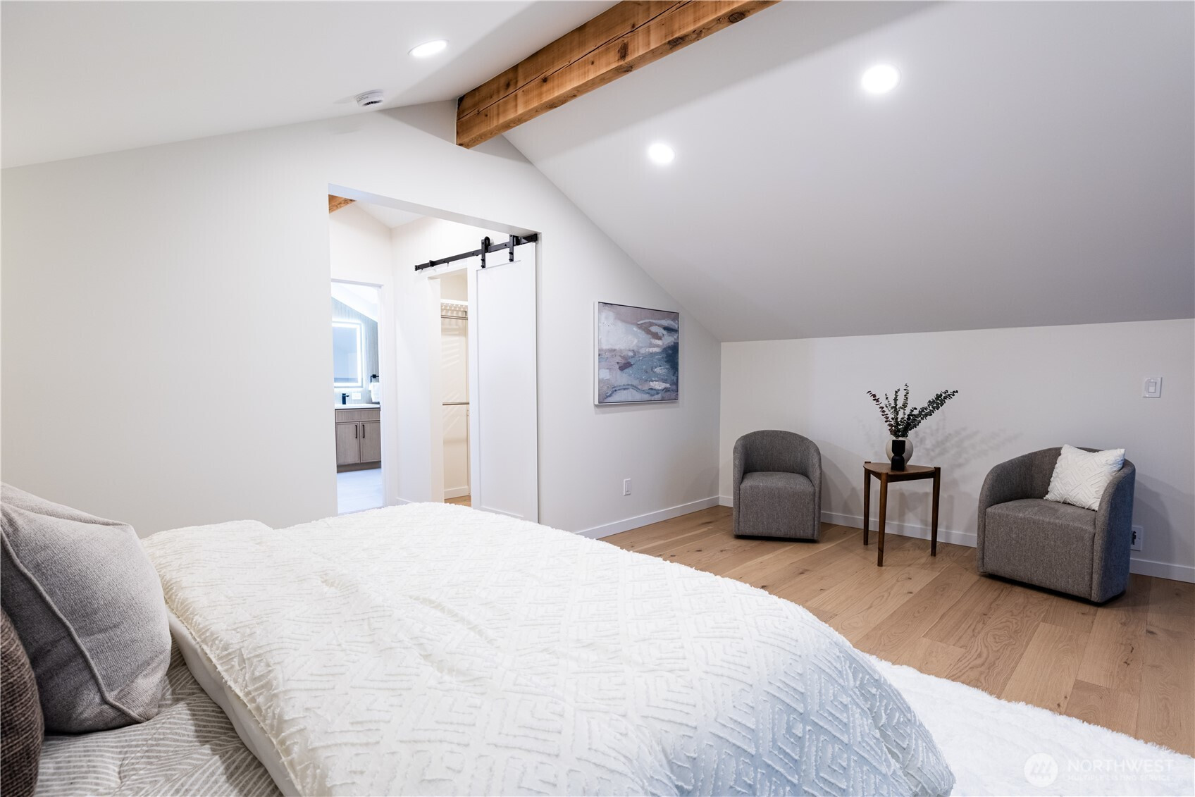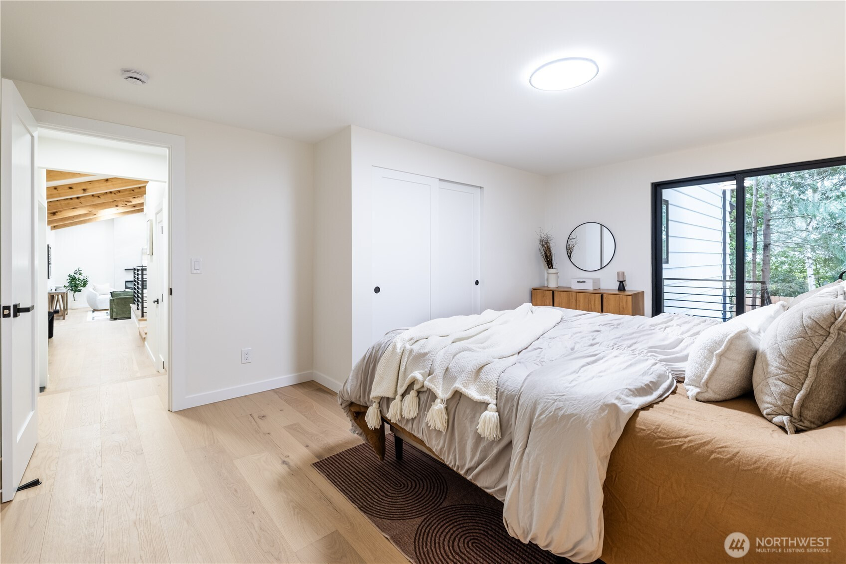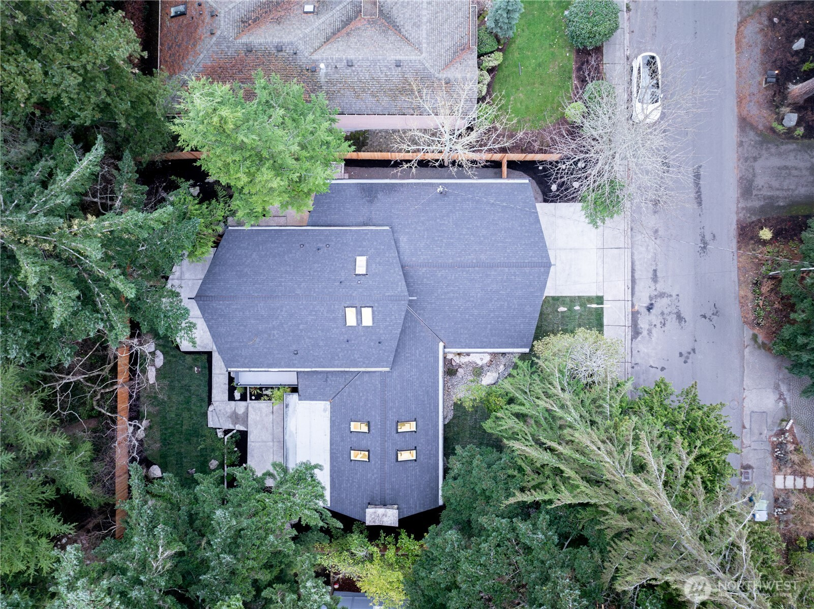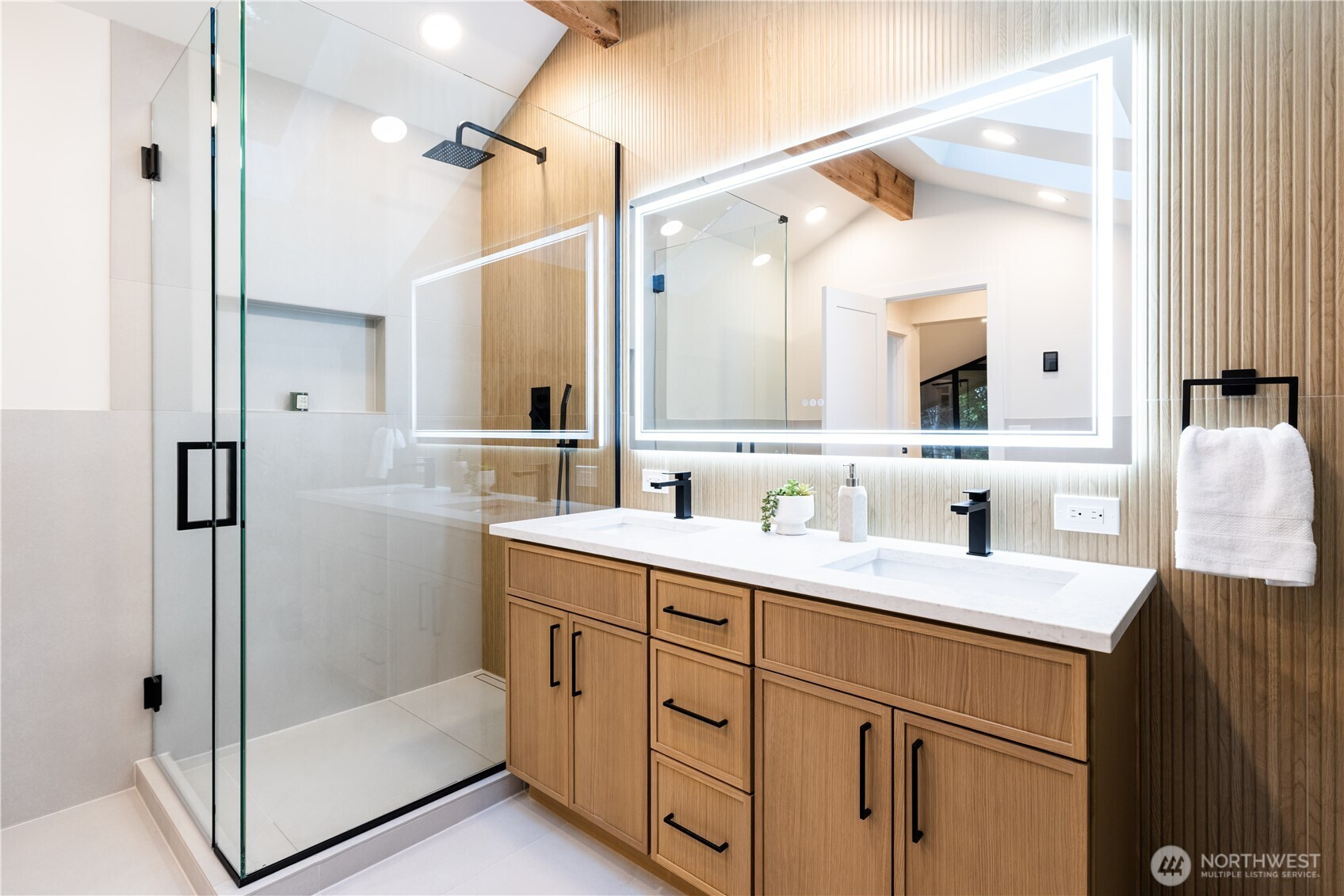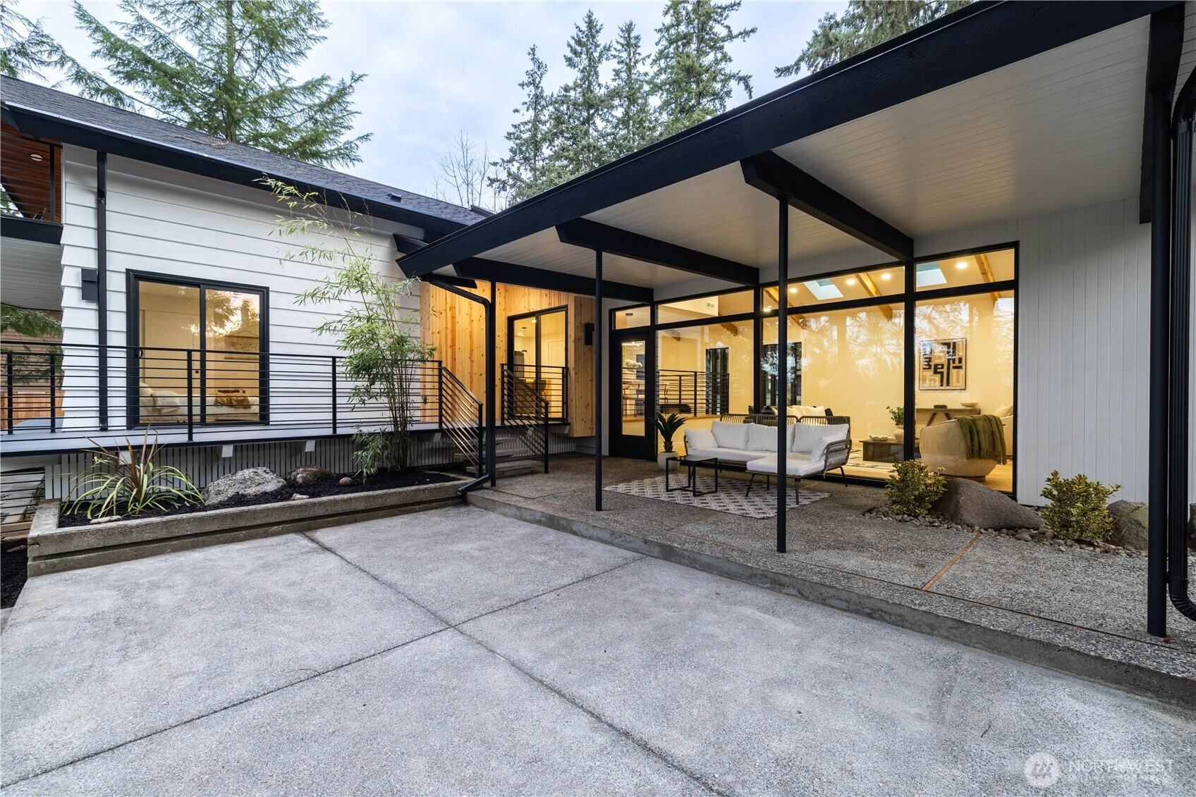 Architectural and rare: modern design meets Pacific Northwest beauty on a quiet dead-end street minutes from downtown. Vaulted ceilings with exposed wood beams, skylights, and expansive windows create a bright, refined atmosphere with forest views. Chef’s kitchen with sleek cabinetry, quartz counters, and a statement island flows into open-concept living. The entire upper level is a private primary retreat with a dramatic wall of glass, vaulted ceiling, balcony, and spa bath: freestanding tub, walk-in glass shower, double vanity. Large deck for indoor–outdoor living plus a fully fenced, landscaped yard. Updated electrical and plumbing. Fully separate lower-level living/office/guest suite offers flexibility and potential rental use.