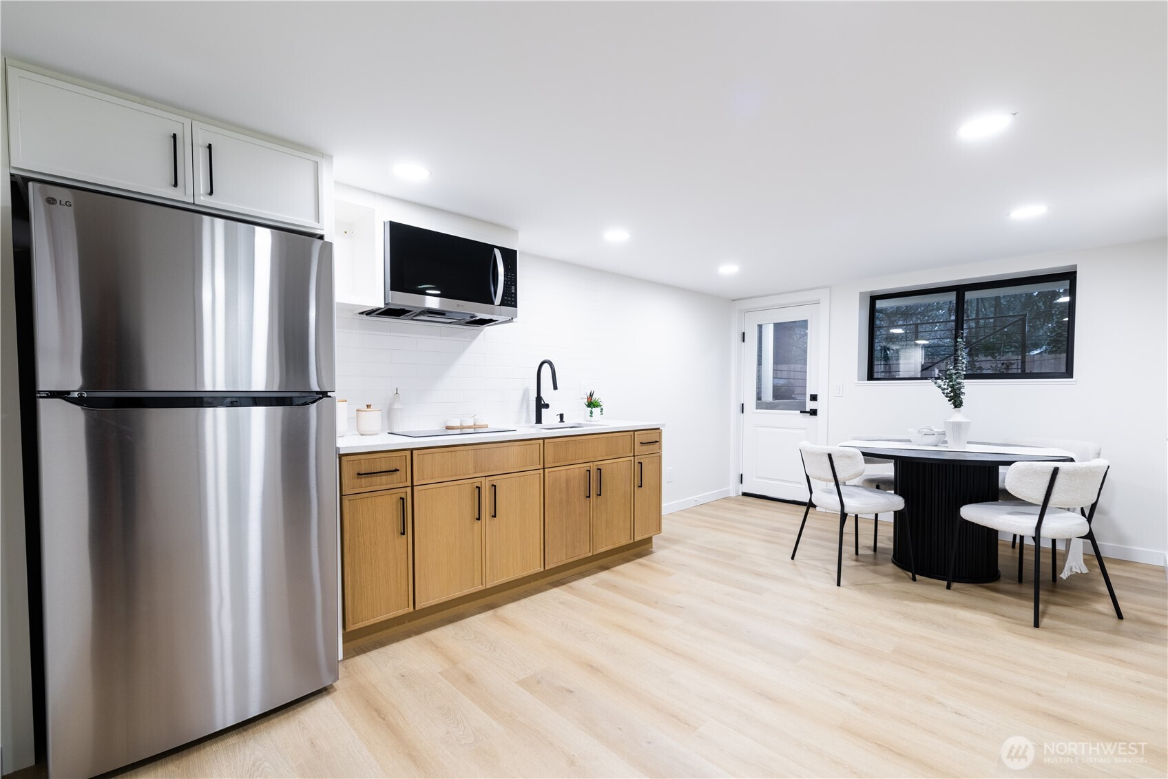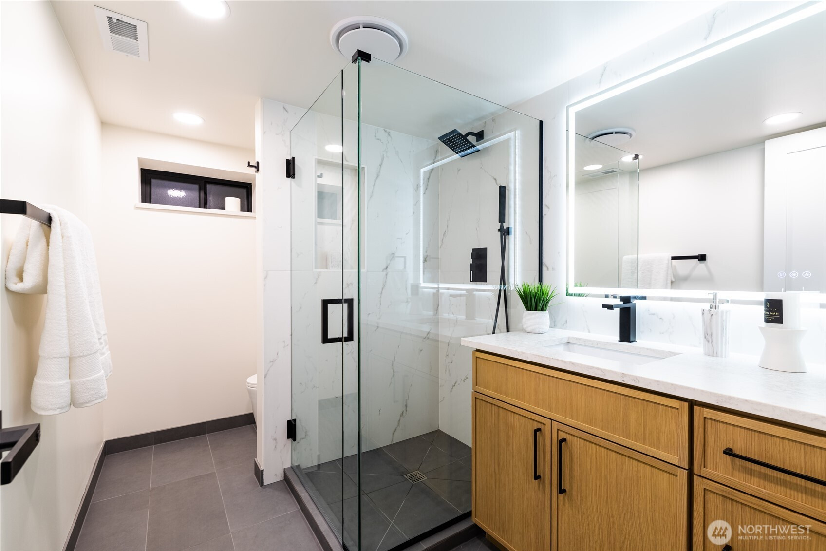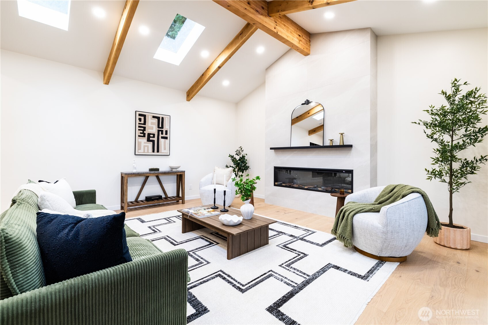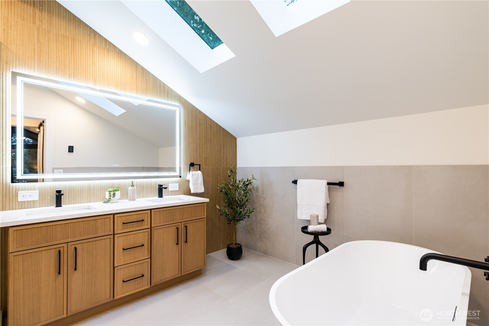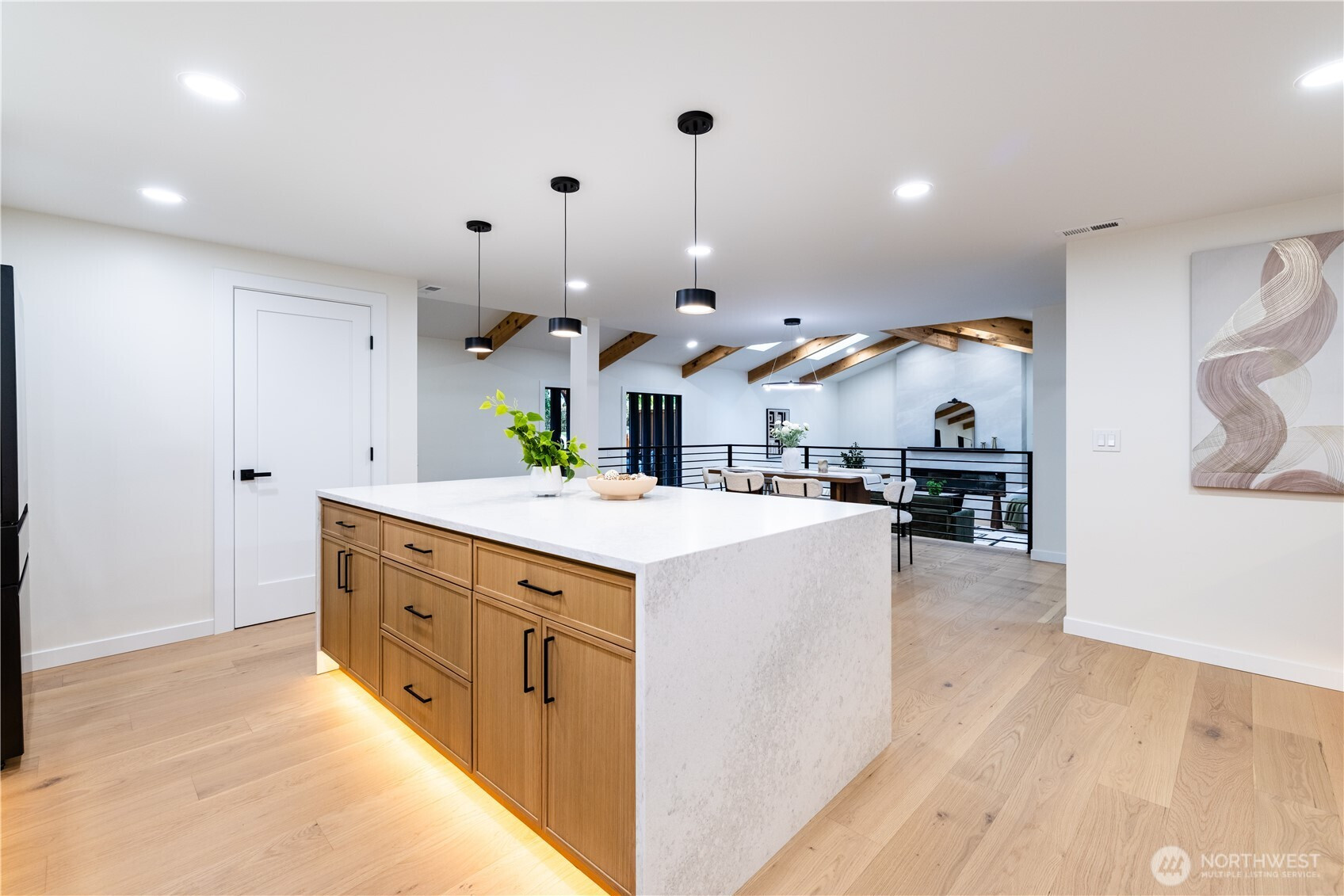 Architectural and rare: modern design meets Pacific Northwest beauty on a quiet dead-end street minutes from downtown. Vaulted ceilings with exposed wood beams, skylights, and expansive windows create a bright, refined atmosphere with forest views. Chef’s kitchen with sleek cabinetry, quartz counters, and a statement island flows into open-concept living. The entire upper level is a private primary retreat with a dramatic wall of glass, vaulted ceiling, balcony, and spa bath: freestanding tub, walk-in glass shower, double vanity. Large deck for indoor–outdoor living plus a fully fenced, landscaped yard. Updated electrical and plumbing. Fully separate lower-level living/office/guest suite offers flexibility and potential rental use.