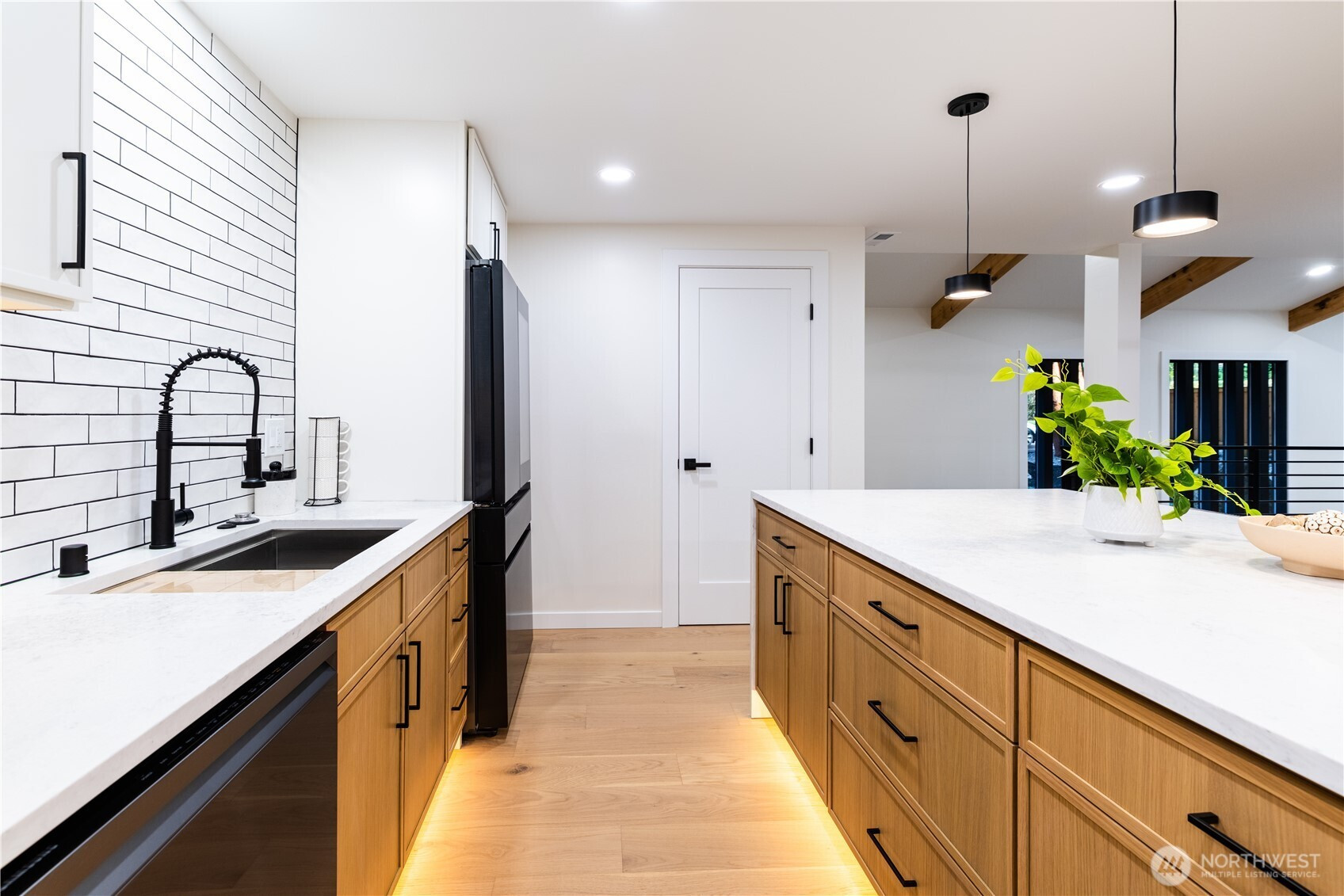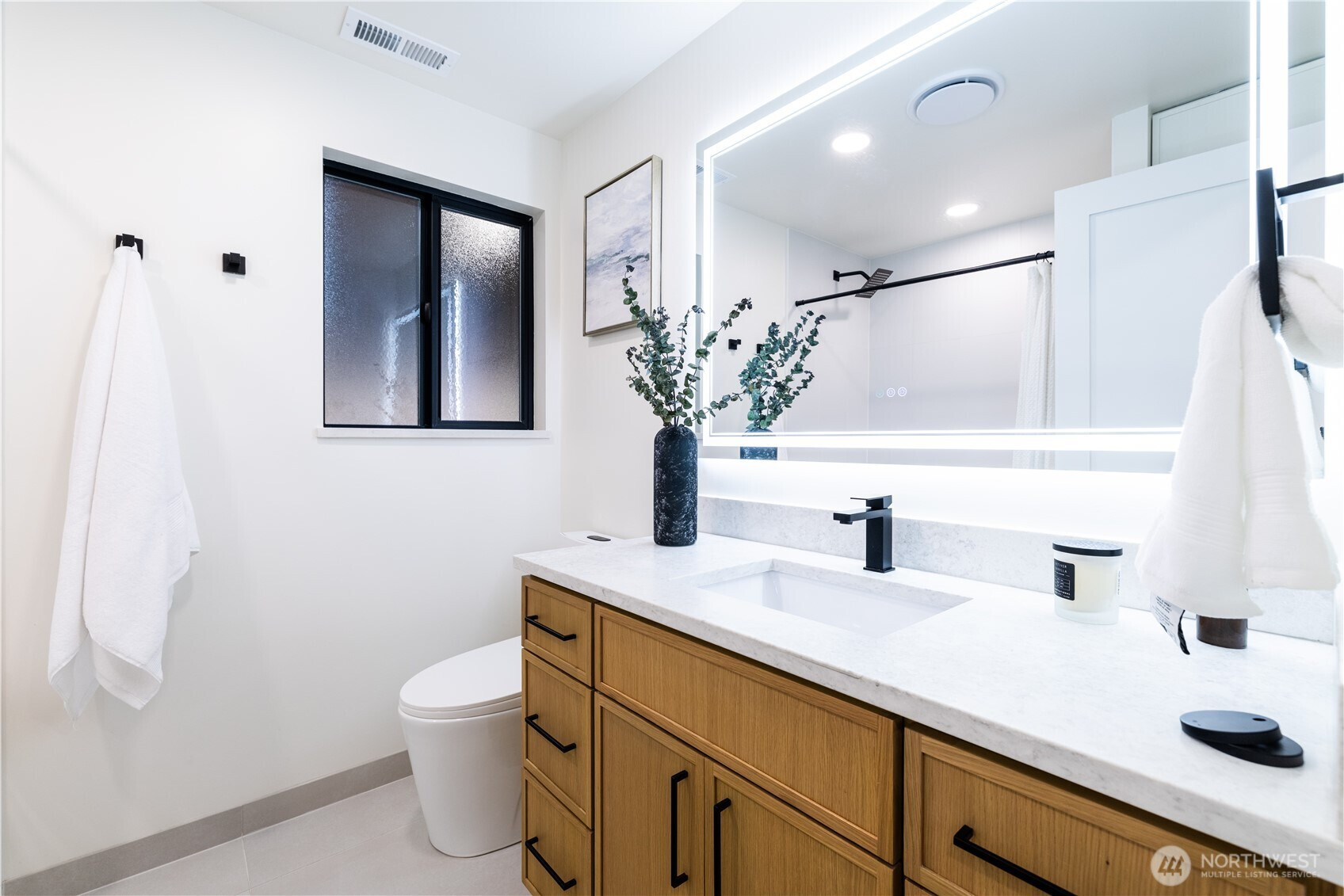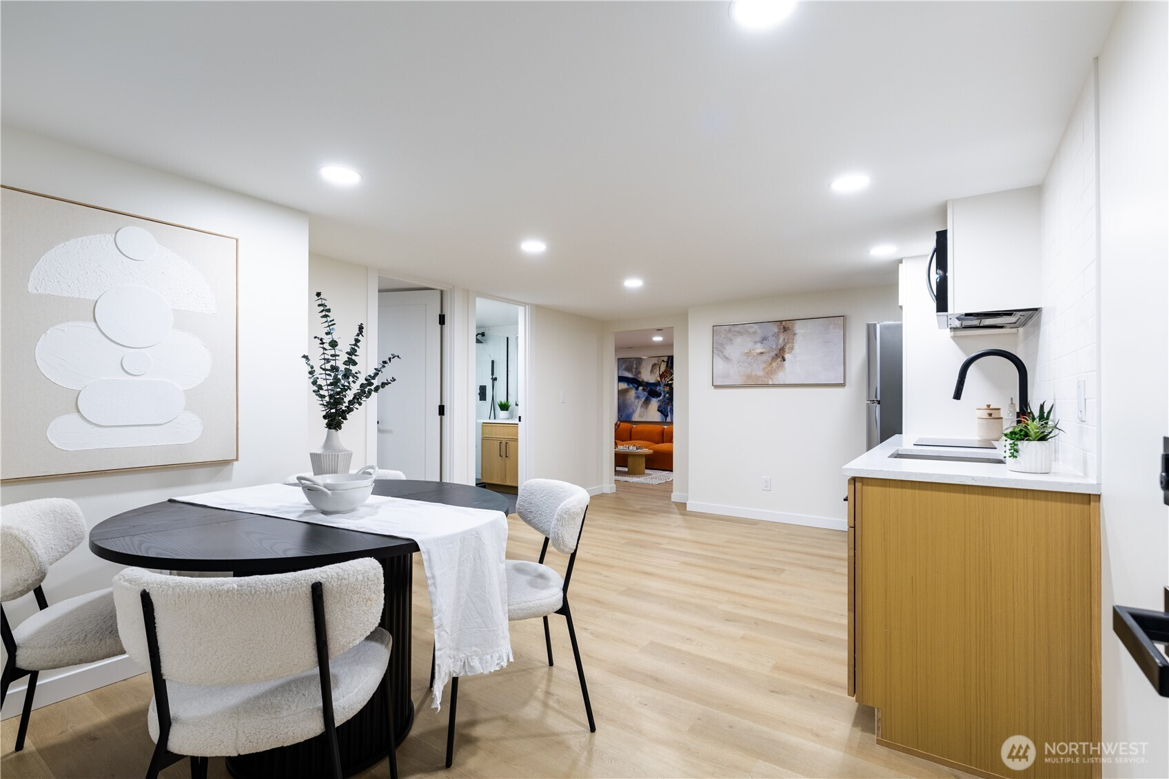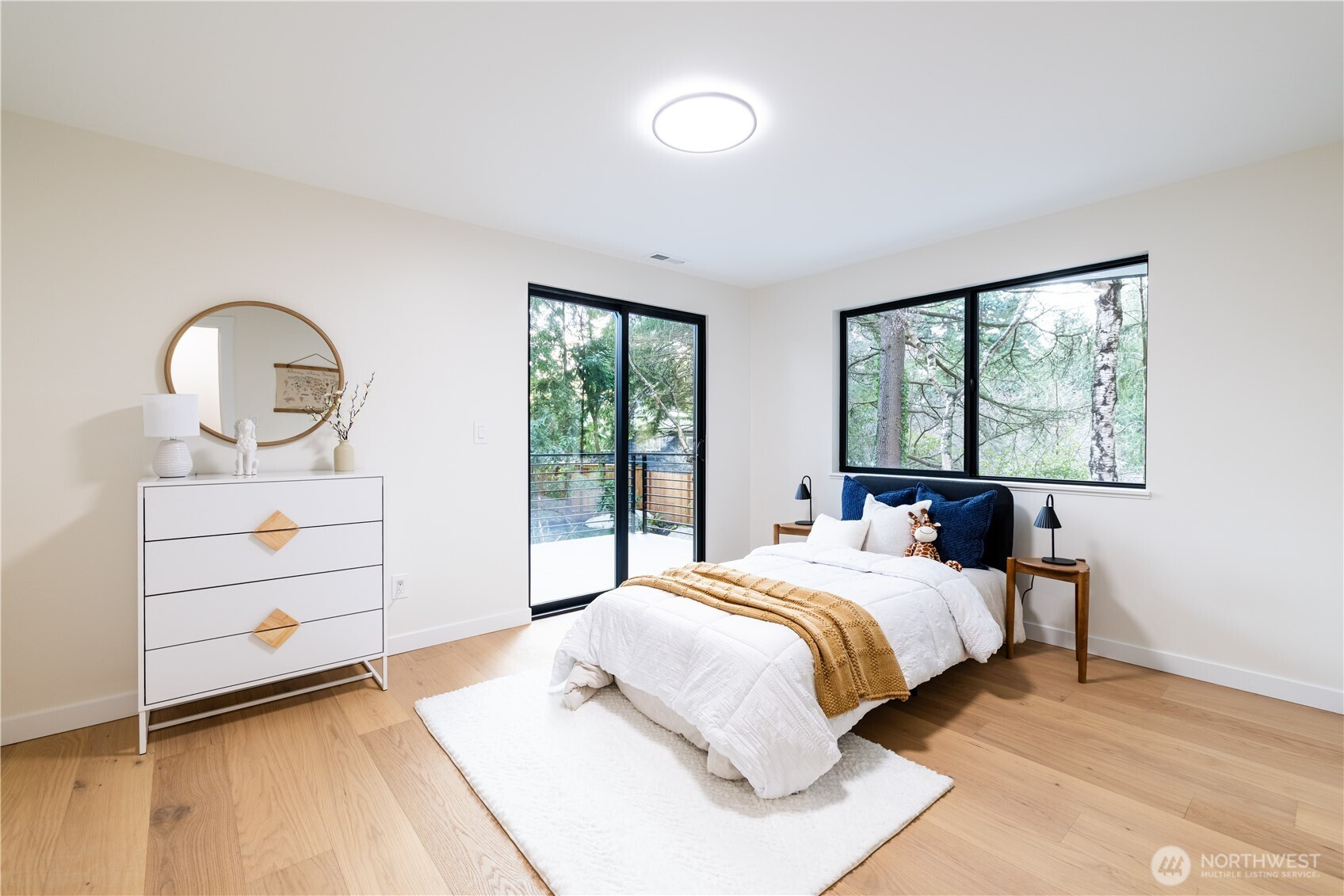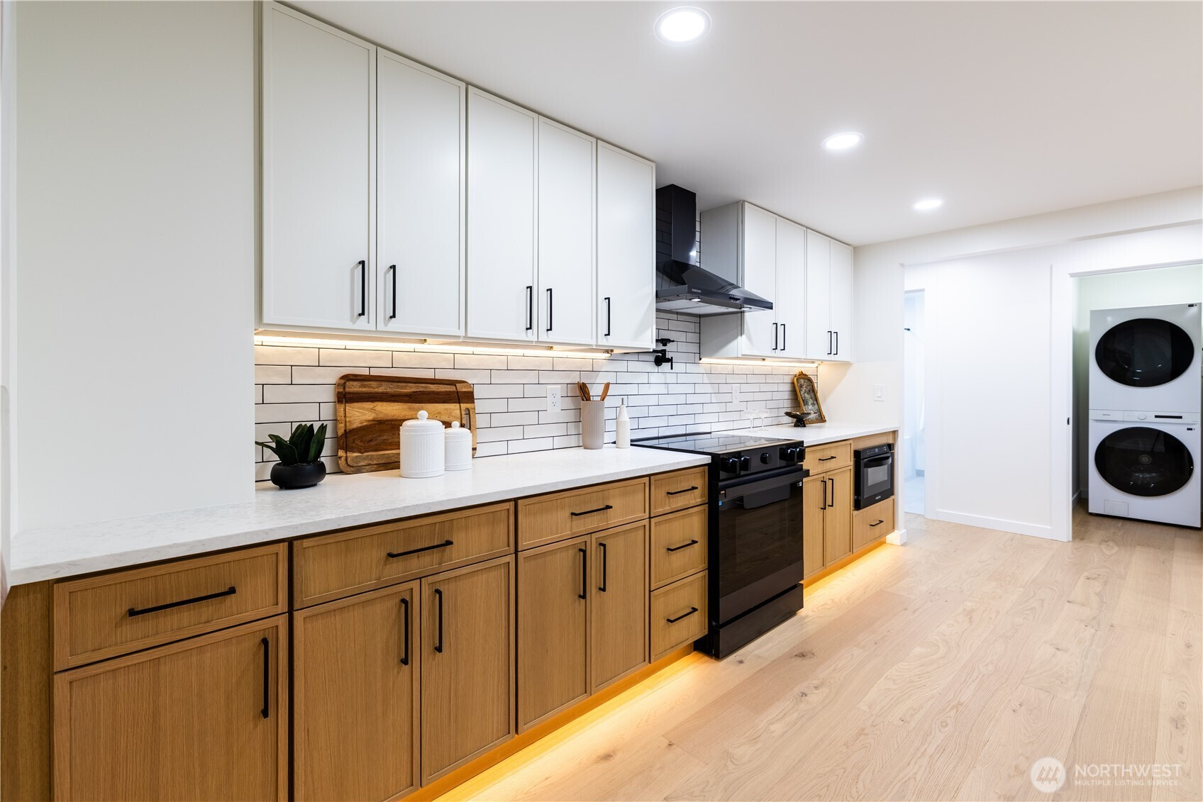 Architectural and rare: modern design meets Pacific Northwest beauty on a quiet dead-end street minutes from downtown. Vaulted ceilings with exposed wood beams, skylights, and expansive windows create a bright, refined atmosphere with forest views. Chef’s kitchen with sleek cabinetry, quartz counters, and a statement island flows into open-concept living. The entire upper level is a private primary retreat with a dramatic wall of glass, vaulted ceiling, balcony, and spa bath: freestanding tub, walk-in glass shower, double vanity. Large deck for indoor–outdoor living plus a fully fenced, landscaped yard. Updated electrical and plumbing. Fully separate lower-level living/office/guest suite offers flexibility and potential rental use.