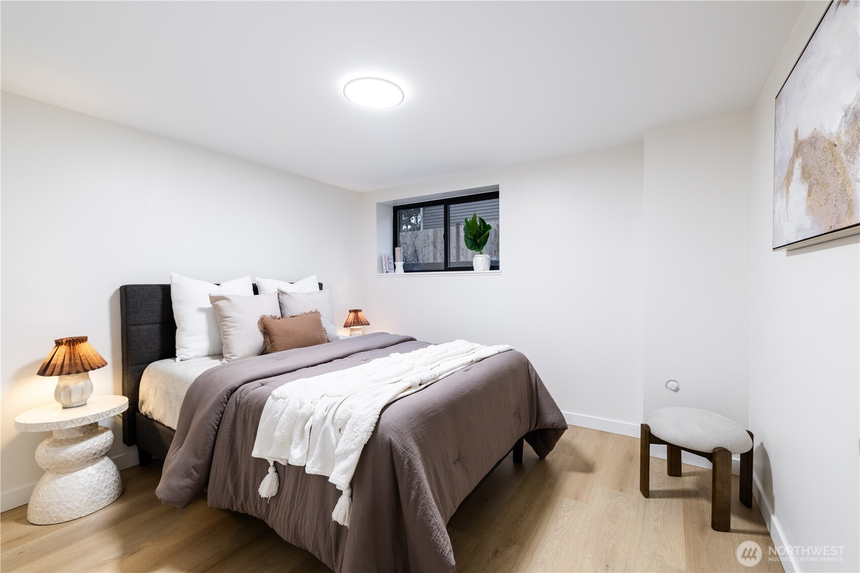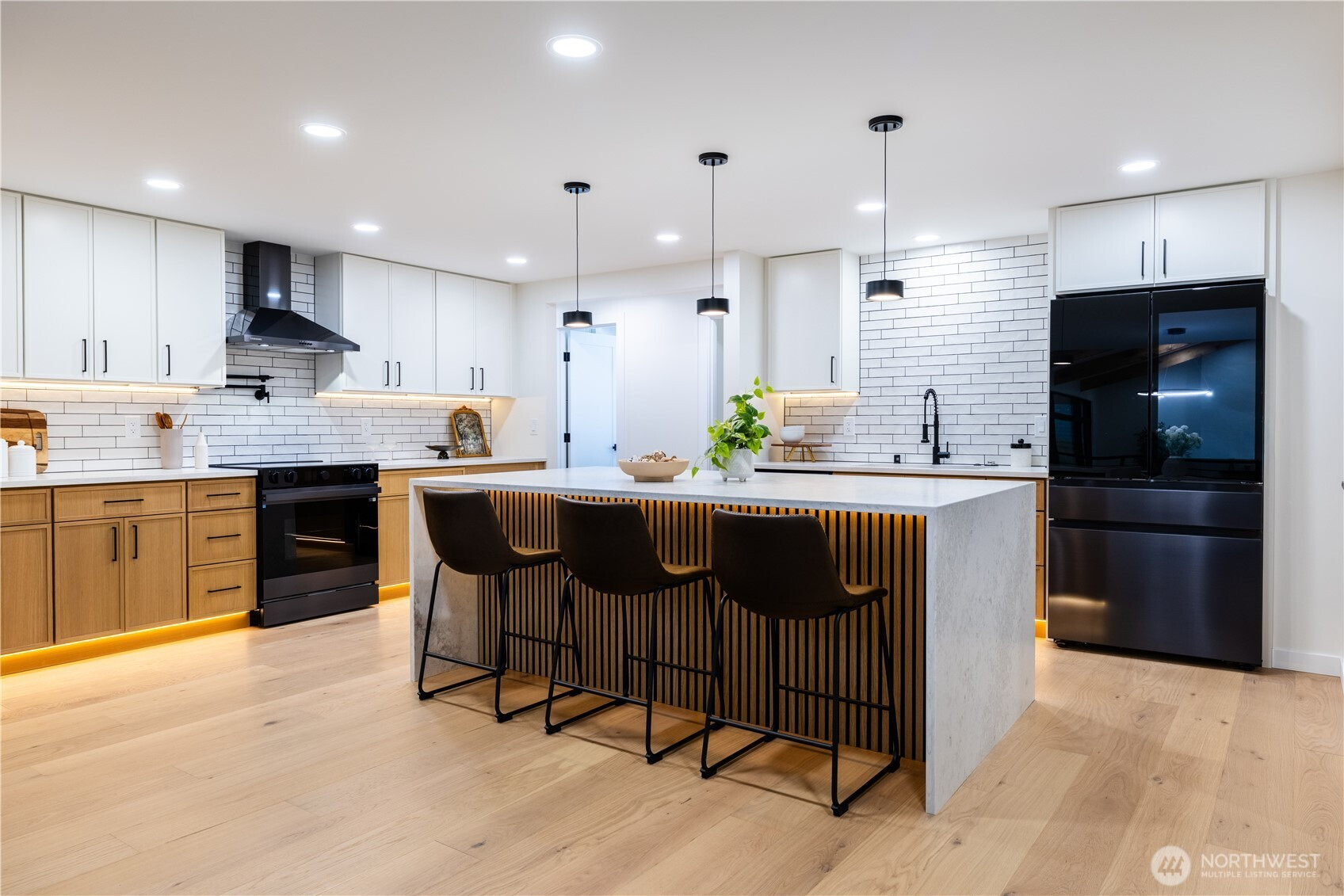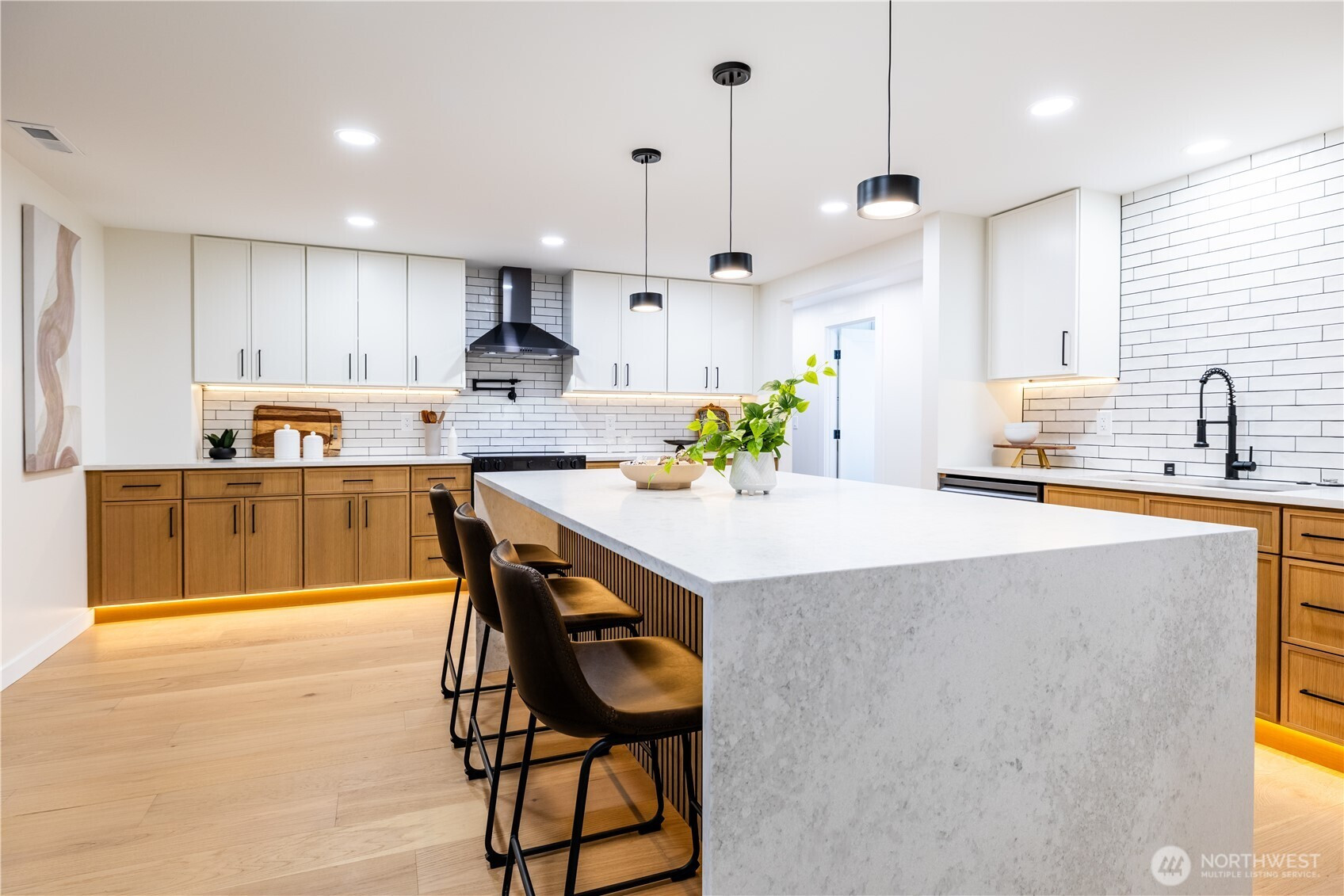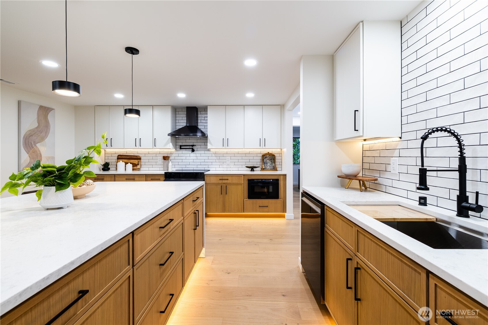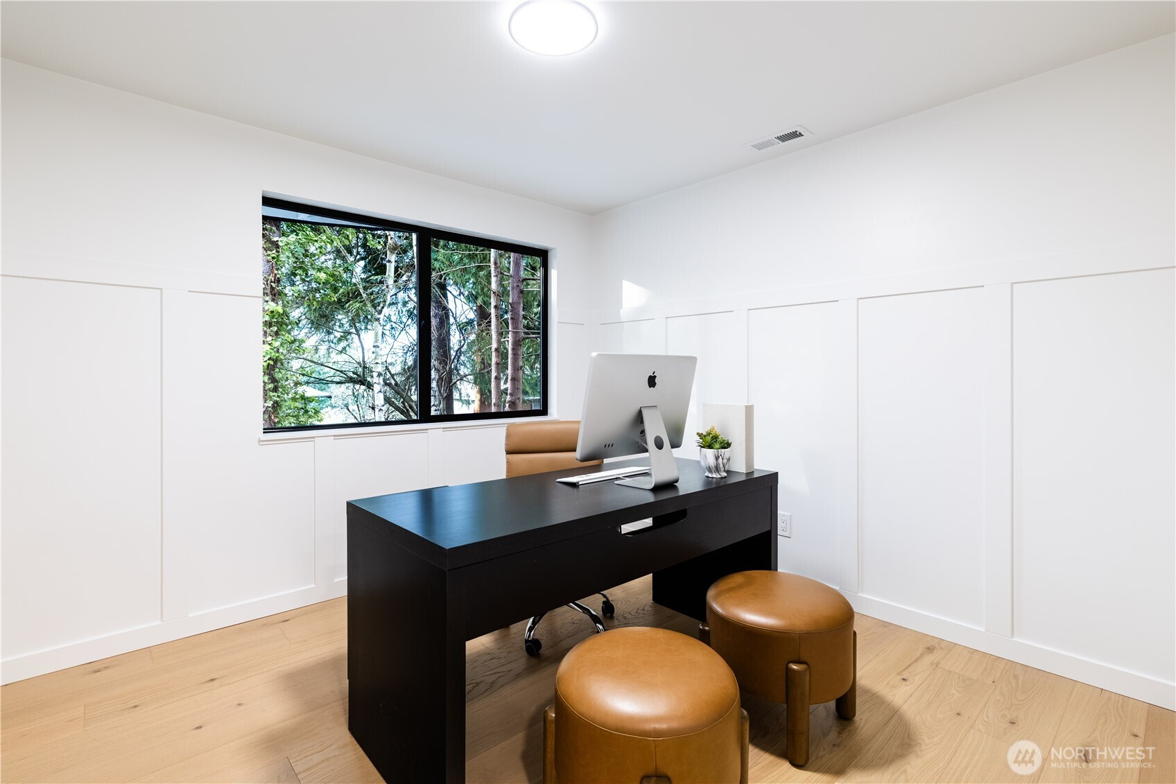 Architectural and rare: modern design meets Pacific Northwest beauty on a quiet dead-end street minutes from downtown. Vaulted ceilings with exposed wood beams, skylights, and expansive windows create a bright, refined atmosphere with forest views. Chef’s kitchen with sleek cabinetry, quartz counters, and a statement island flows into open-concept living. The entire upper level is a private primary retreat with a dramatic wall of glass, vaulted ceiling, balcony, and spa bath: freestanding tub, walk-in glass shower, double vanity. Large deck for indoor–outdoor living plus a fully fenced, landscaped yard. Updated electrical and plumbing. Fully separate lower-level living/office/guest suite offers flexibility and potential rental use.