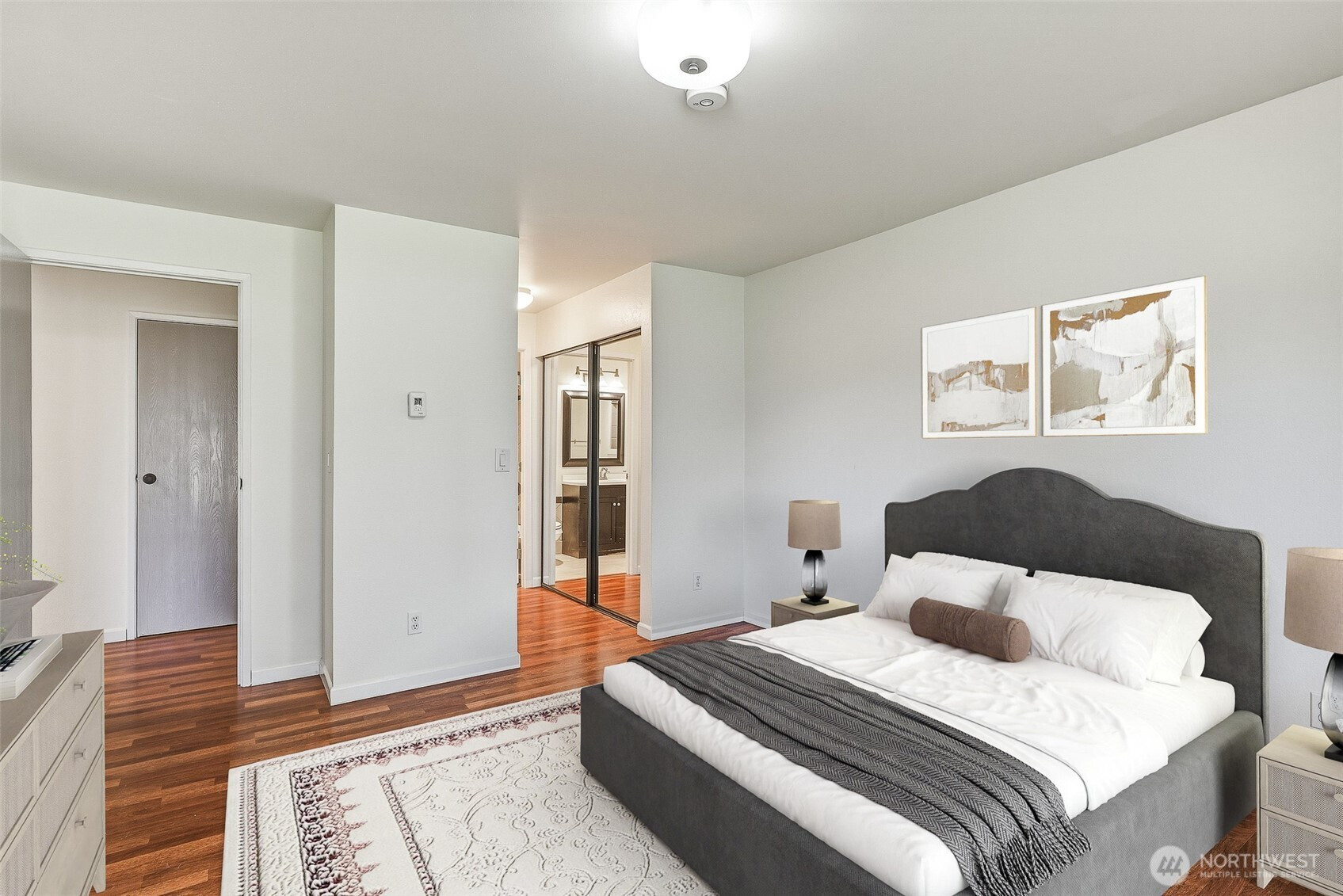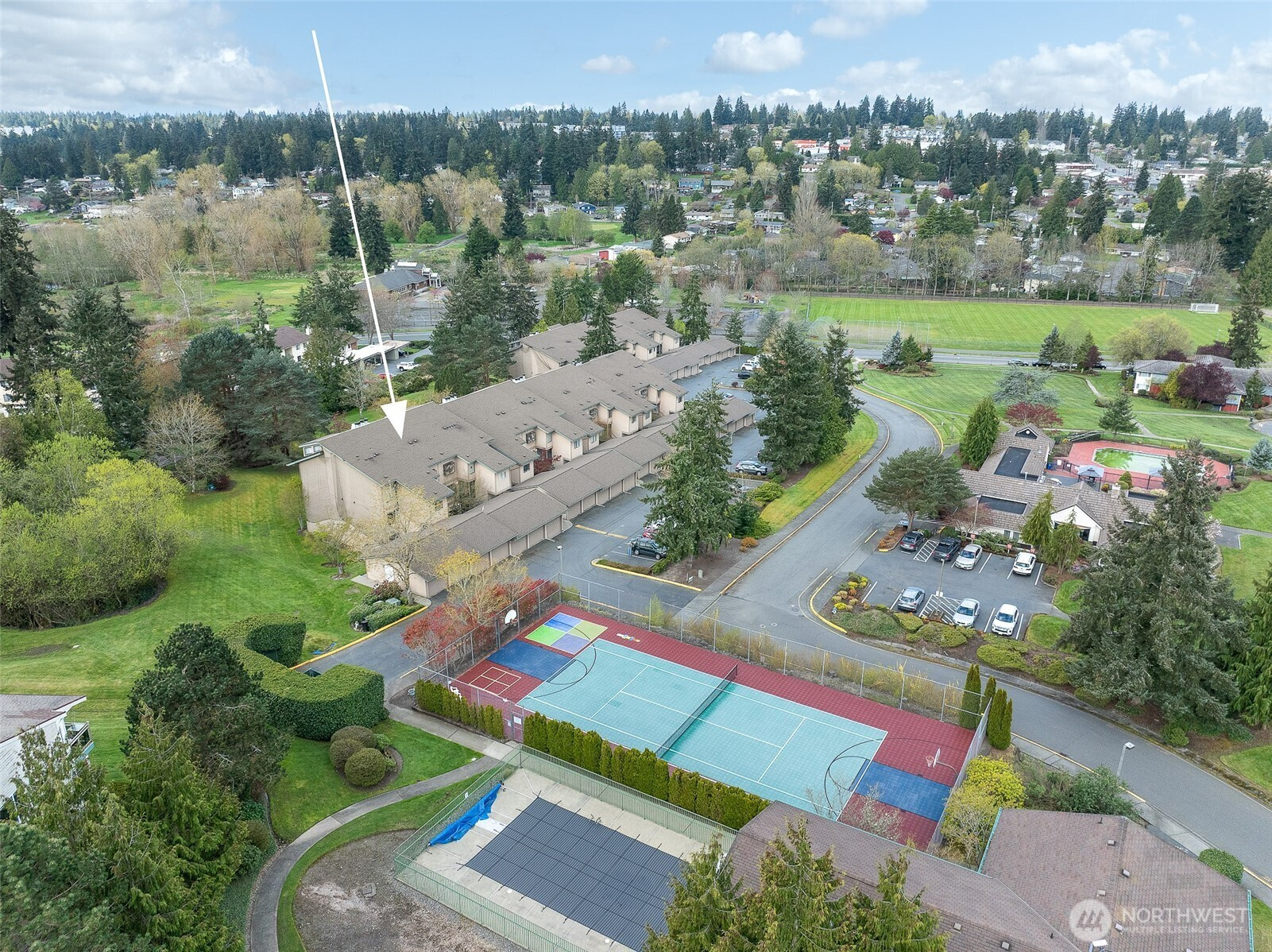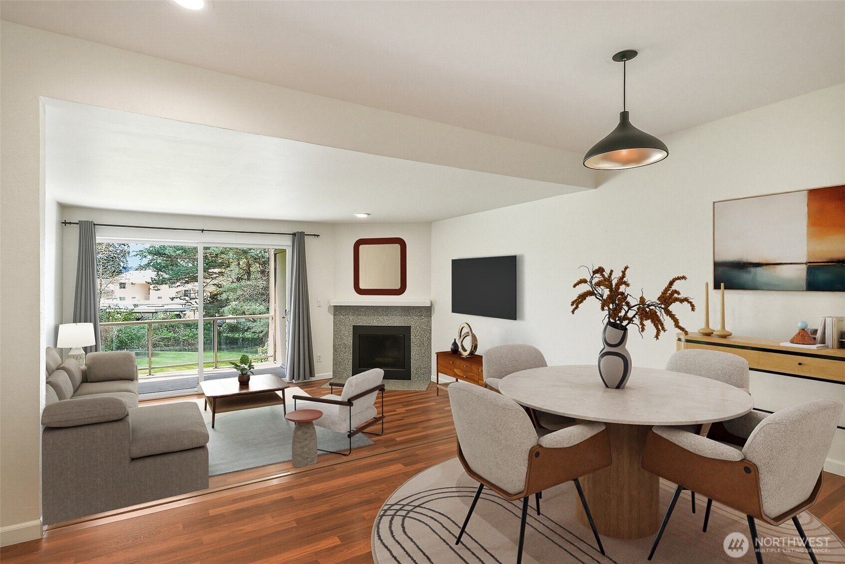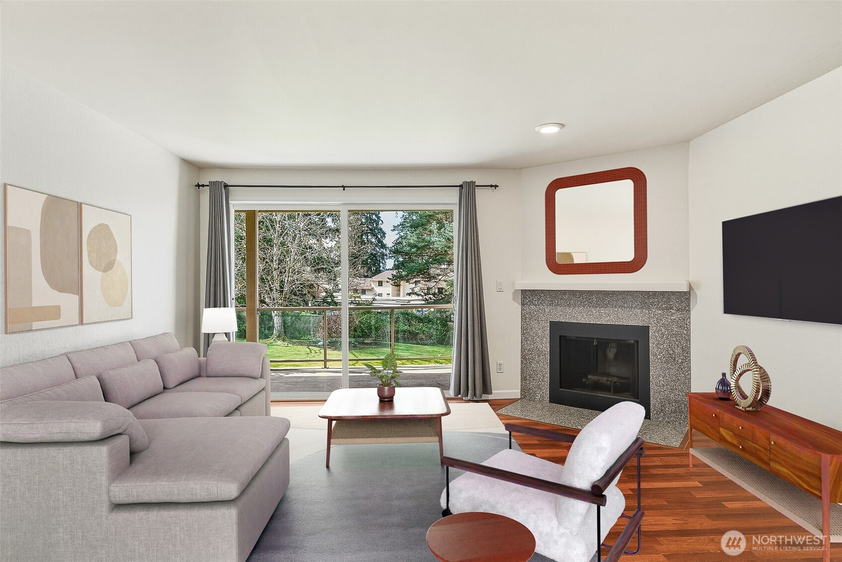Experience a park-like setting tucked away from the hustle, offering a seamless blend of comfort and convenience in this beautifully updated one-level residence. The open floor plan flows effortlessly, anchored by a real wood-burning fireplace that creates a warm, inviting atmosphere for relaxation or entertaining. A chef-friendly kitchen boasts expansive counter space perfect for hosting. Significant recent investments provide long-term peace of mind, including a full $25k renovation of the main bathroom and a complete update of all plumbing throughout the unit. Practicality meets style with updated digital thermostats dimmable lighting, and an abundance of storage. The thoughtful layout ensures maximum privacy between sleeping quarters making it an ideal retreat for residents and guests alike. Step outside to your private balcony to overlook lush green space or take advantage of the community features including a swimming pool clubhouse sport court and exercise room. You will appreciate the private individual garage plus an additional dedicated parking spot. The location is truly unbeatable for those seeking an active lifestyle you are just a short stroll from the scenic Interurban Trail and the shores of Lake Ballinger. Commuting is effortless with the Transit Center and the Light Rail just minutes away providing quick access to downtown Seattle and the airport. With 99 Ranch Market and Country Farms nearby this home represents a rare opportunity for ease and accessibility