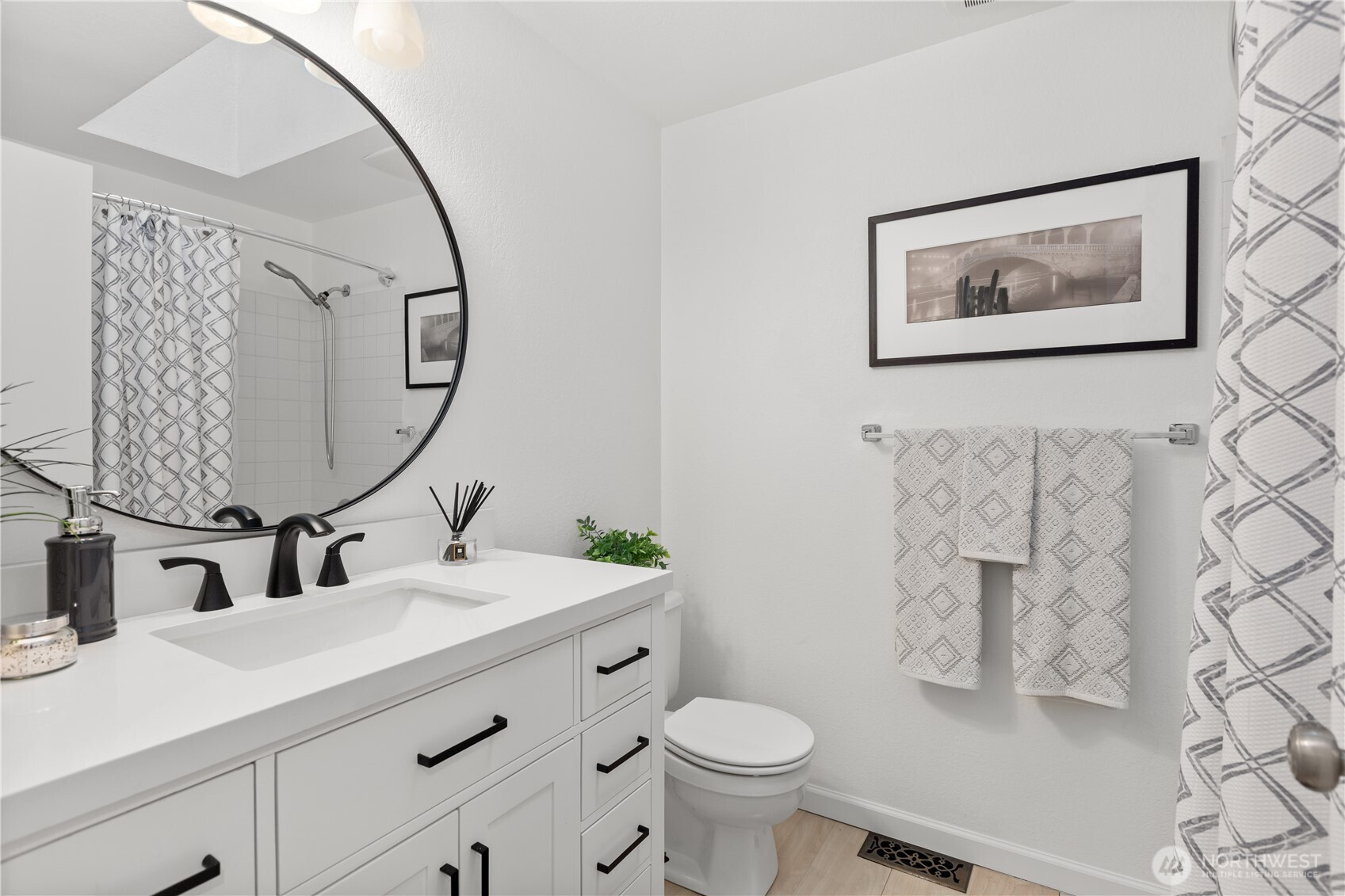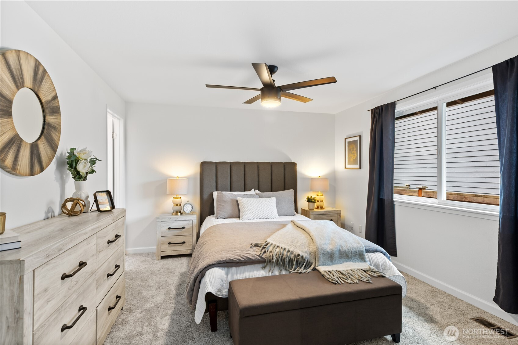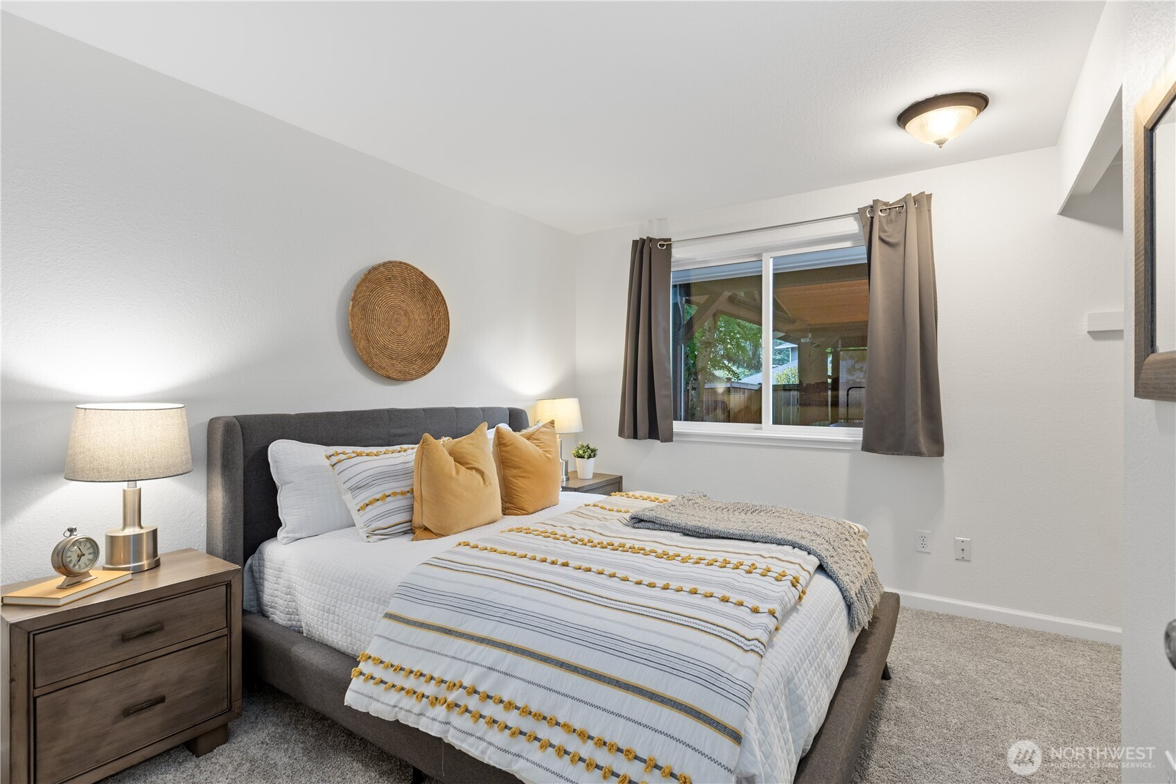Welcome home to this beautifully refreshed rambler in the coveted Meadow Creek Park neighborhood. New carpet and fresh paint create a bright, modern aesthetic. The spacious living area centers around a stunning brick gas fireplace. Stay cool in our warmer months with air conditioning.Kitchen with newer appliances & ample pantry. Entertain in style in the outdoor room featuring a private hot tub, projection screen and wood burning fireplace. Backyard garden shed and covered firewood storage, as well as lawn for yard games and fun for all ages! The exterior is freshly painted and the roof was replaced five years ago.Northshore School District. Conveniently located to I-5 and I-405, shopping, parks.