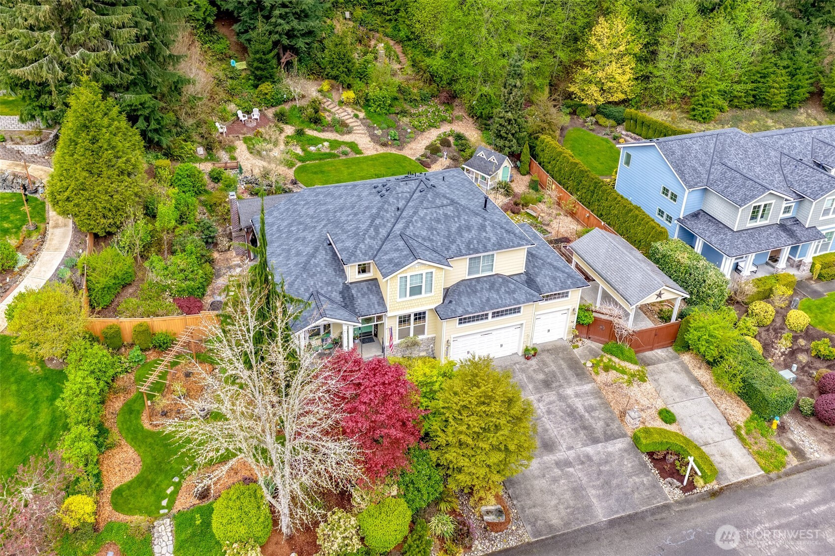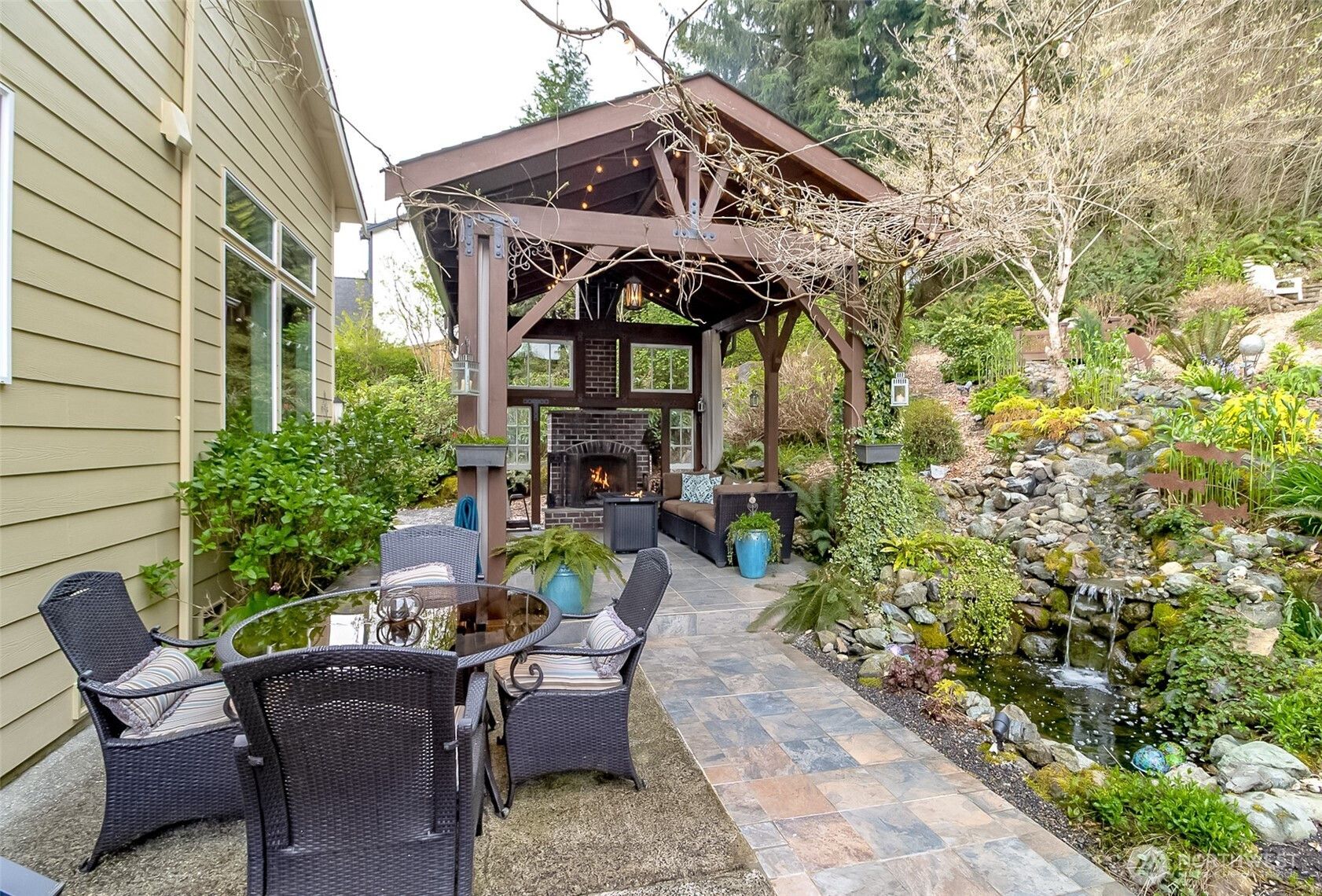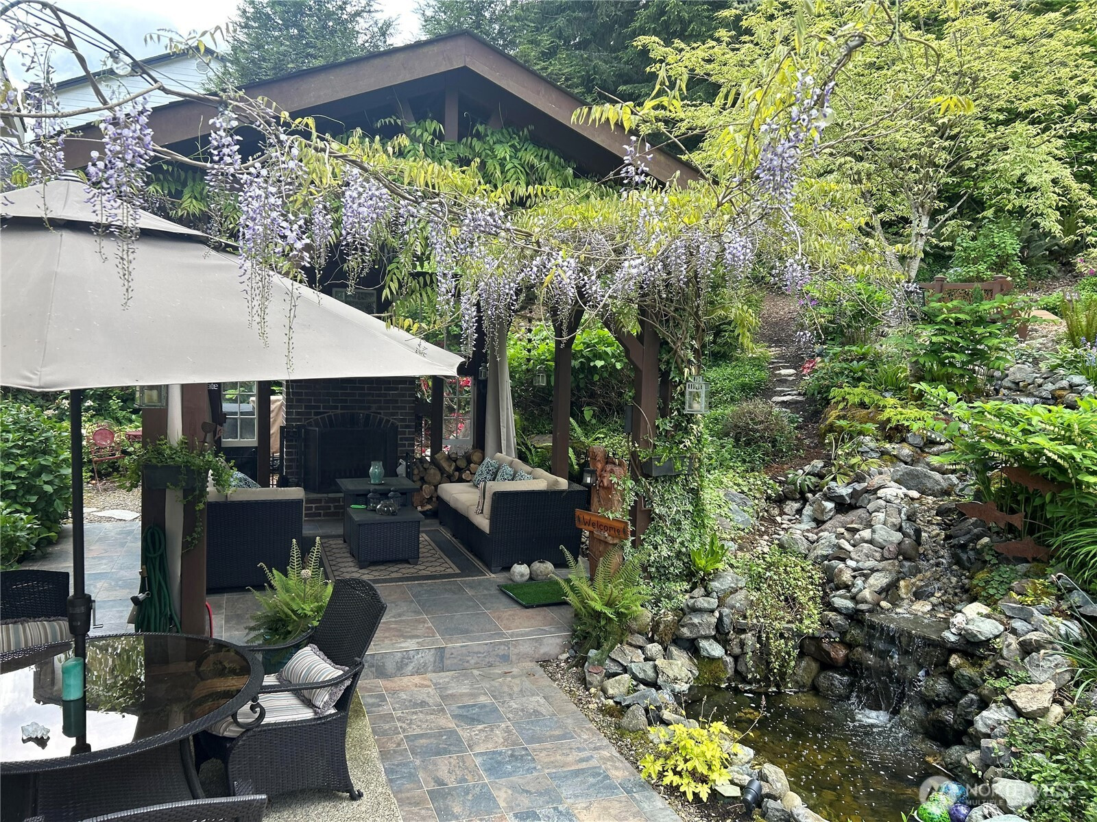 Rare opportunity to own a Snoho County Garden Show home! The home greets you with a private & cozy front porch for relaxing behind a hillside of colorful maples. Open the door to spacious vaulted ceilings throughout the entry, formal living and dining. The home interior boasts many upgrades, maple hardwoods, craftsman railings w maple steps carry thru the kitchen, upstairs hall & primary. Entertainment sized kitchen with a large open island and bright quartz counters-great for entertaining. All ss quality appliances to make life easy & trouble free. Large main floor walk-in shower w dressing room allows for main floor living. Entertain indoors & out in this private setting surrounded by lush landscaping & woodland hills. Enjoy the sound and sights of your private hillside waterfall and pond. Spend quiet evenings sitting by your cozy outdoor fireplace or soaking in the soothing hot tub. This property is a show stopper described by the garden club as 'takes your breath away'! The garden also provides produce from raised beds, raspberries, blueberries, apples, pears, plums, asparagus, sunchokes and more. New 50 year roof installed and house painted in fall 2024. AHS transferrable warranty is included! Seclusion coupled with close proximity to Woodinville Wine Country, I405, I522, Echo Lake Golf and restaurant. Working from home? Astound provides a great internet connection. Don't miss out on this one! Here is your chance to Live the Dream indoors and outdoors!