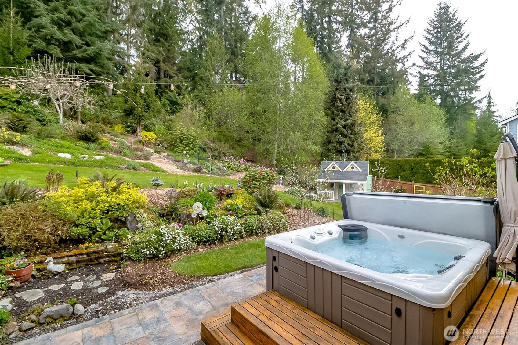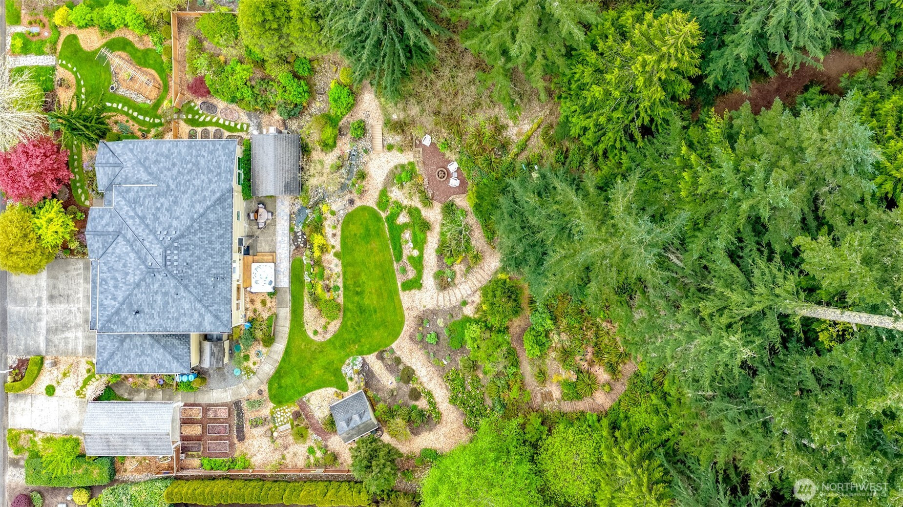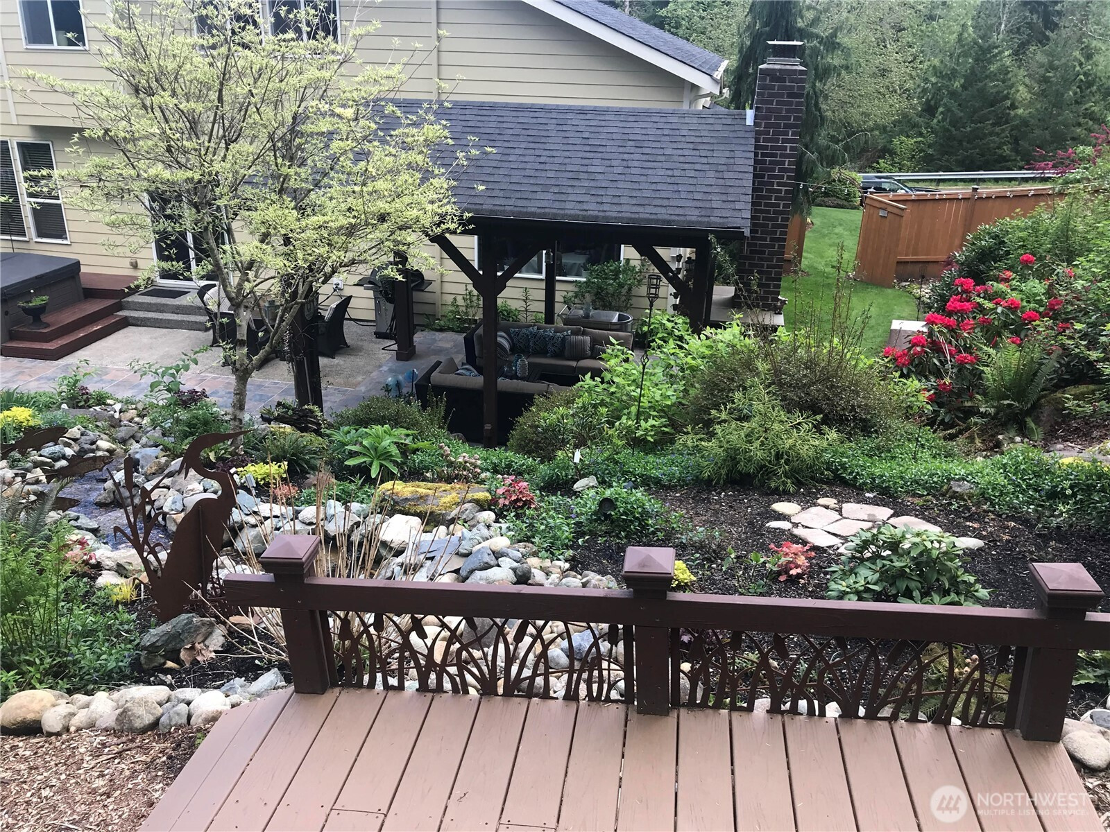 Rare opportunity to own a Snoho County Garden Show home! The home greets you with a private & cozy front porch for relaxing behind a hillside of colorful maples. Open the door to spacious vaulted ceilings throughout the entry, formal living and dining. The home interior boasts many upgrades, maple hardwoods, craftsman railings w maple steps carry thru the kitchen, upstairs hall & primary. Entertainment sized kitchen with a large open island and bright quartz counters-great for entertaining. All ss quality appliances to make life easy & trouble free. Large main floor walk-in shower w dressing room allows for main floor living. Entertain indoors & out in this private setting surrounded by lush landscaping & woodland hills. Enjoy the sound and sights of your private hillside waterfall and pond. Spend quiet evenings sitting by your cozy outdoor fireplace or soaking in the soothing hot tub. This property is a show stopper described by the garden club as 'takes your breath away'! The garden also provides produce from raised beds, raspberries, blueberries, apples, pears, plums, asparagus, sunchokes and more. New 50 year roof installed and house painted in fall 2024. AHS transferrable warranty is included! Seclusion coupled with close proximity to Woodinville Wine Country, I405, I522, Echo Lake Golf and restaurant. Working from home? Astound provides a great internet connection. Don't miss out on this one! Here is your chance to Live the Dream indoors and outdoors!
