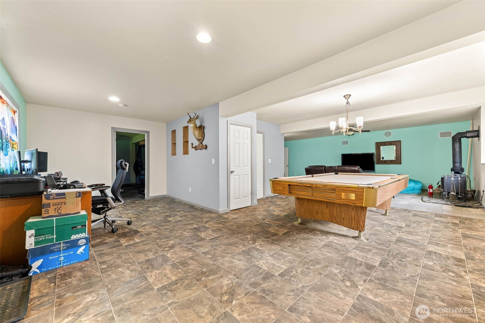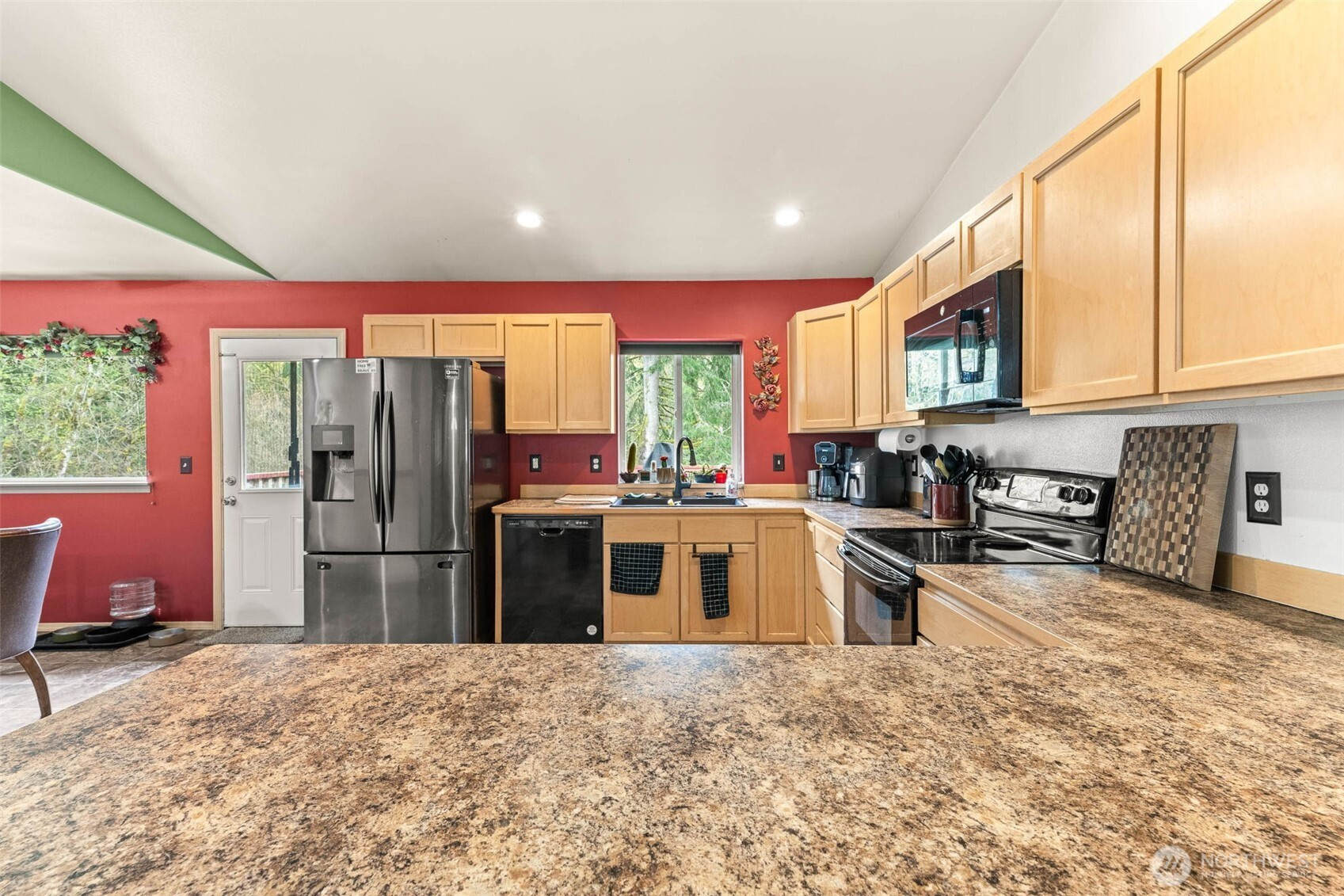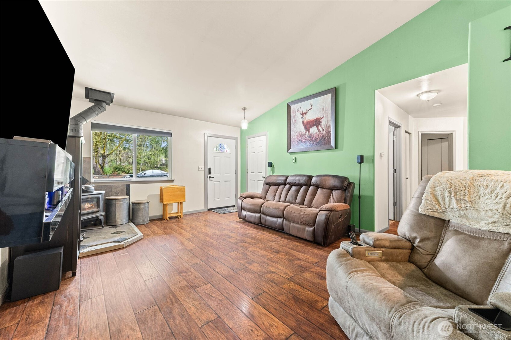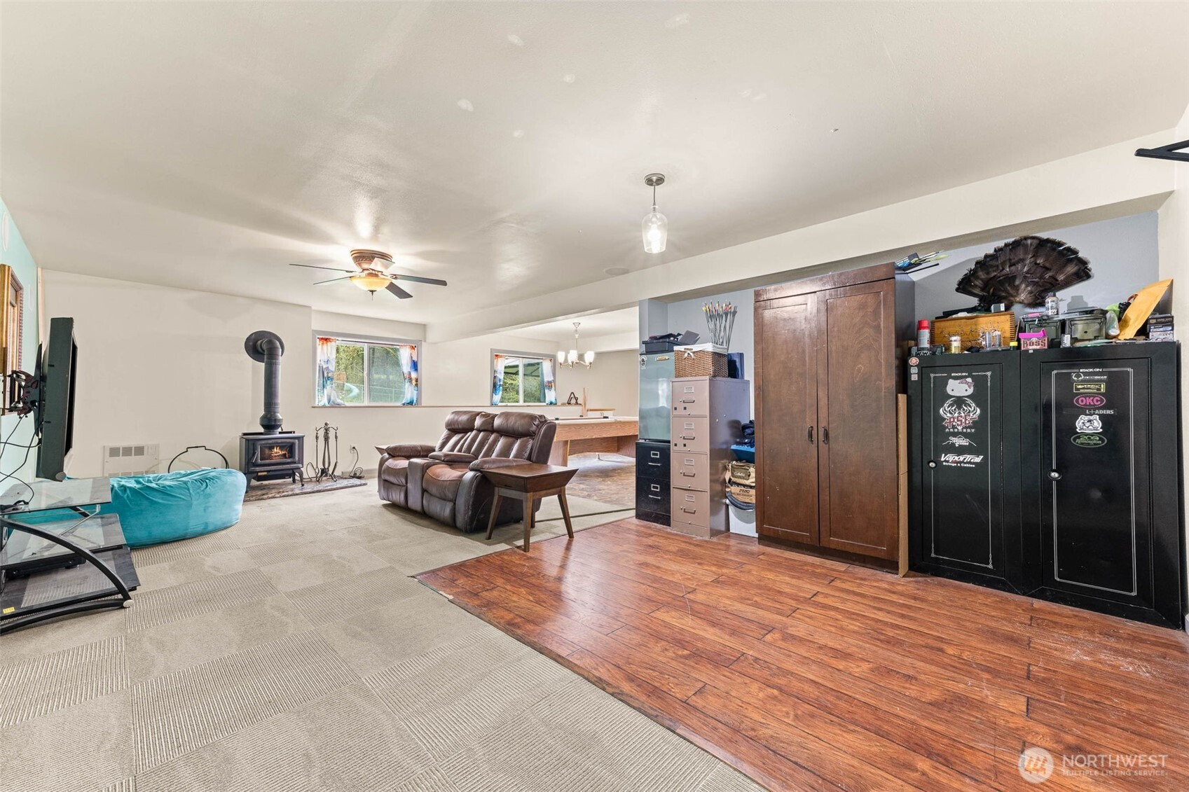 Step into a rare blend of space, style, and versatility with this expansive 2,880 sq ft daylight rambler tucked on a private acre at the end of a quiet cul-de-sac. Designed for the way you live today, this home delivers an open-concept flow anchored by a large, functional kitchen and dining space—perfect for hosting, gathering, and everyday living. Vaulted ceilings elevate the main level, while a cozy wood-burning stove adds warmth and character.The main floor features two spacious bedrooms plus a private primary suite with its own bath, creating a comfortable and intuitive layout. Downstairs unlocks a whole new level of opportunity with a massive rec room, second woodstove, dedicated office, fourth bedroom, and full bath—ideal for multi-generational living, work-from-home flexibility, or entertaining.Step outside and unwind on the elevated back deck overlooking your own secluded, tree-lined oasis complete with a fire pit and gazebo—your personal escape just steps from home. Additional highlights include a massive storage area under the garage with exterior access, RV parking, room for all your toys, and generator-ready wiring for peace of mind.With a newer roof (2021), newer water heater (2020), and extras like firewood and a pool table included, this home is dialed in and ready to impress. Space, privacy, and lifestyle—this one delivers it all.