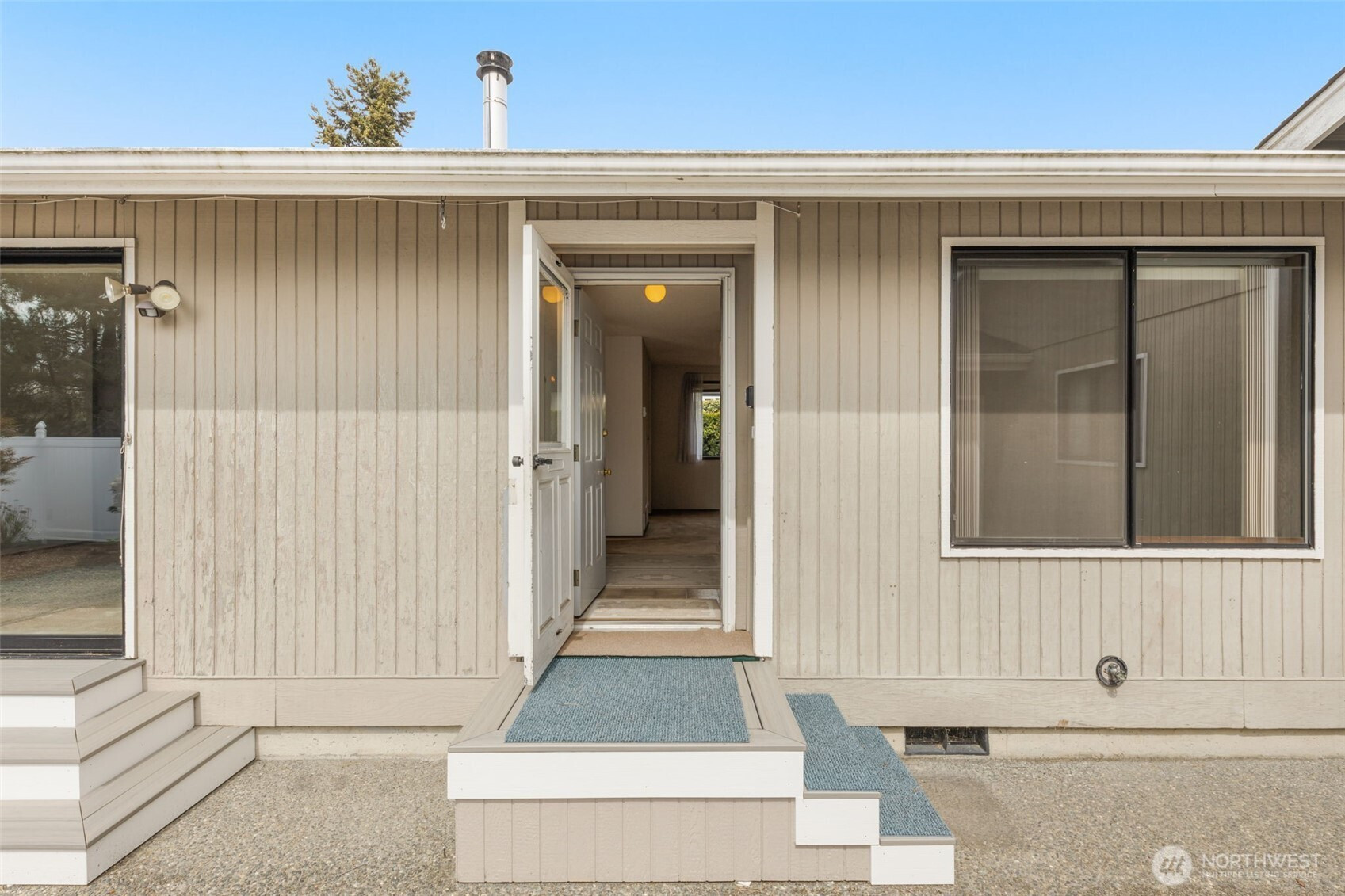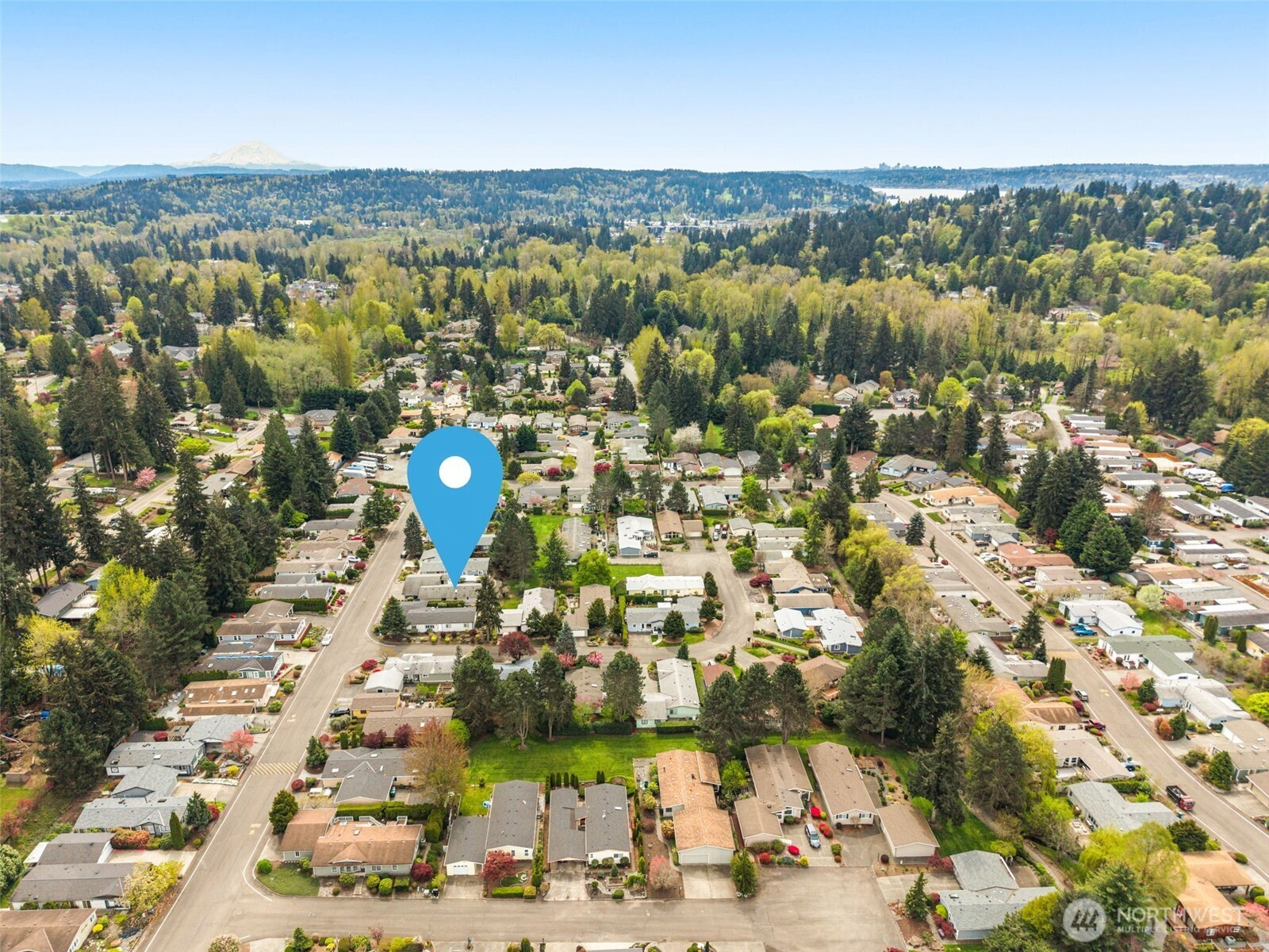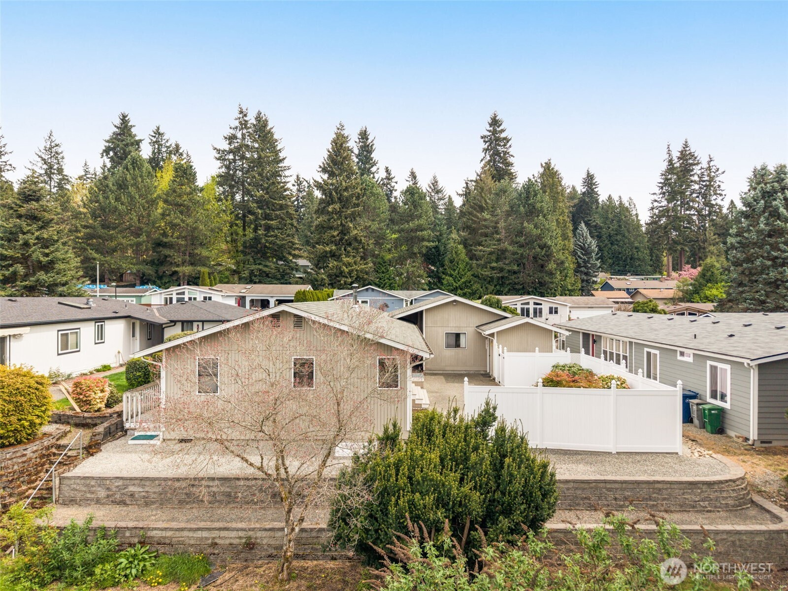 Welcome to Wandering Creek. A desirable gated 55+ community in Bothell. This well-cared-for 3-bedroom, 2-bath modular home offers 1,440 square feet of comfortable, one-level living with both a living room and family room. The kitchen features an eating bar, and the primary suite includes an ensuite bath. Outside, enjoy a spacious patio with new fencing, easy-maintenance landscaping, and views overlooking HOA green space. A tiered retaining wall offers gardening potential, while a fenced area discreetly stores grills and bins. A side ramp provides easy access now and flexibility for the future. The oversized garage accommodates two cars in tandem, a dedicated RV space with Sewer/water available in corner by window, workshop space, plus an attached carport. Community amenities include a clubhouse, lake, and walking trails — ideal for an active, low-maintenance lifestyle.